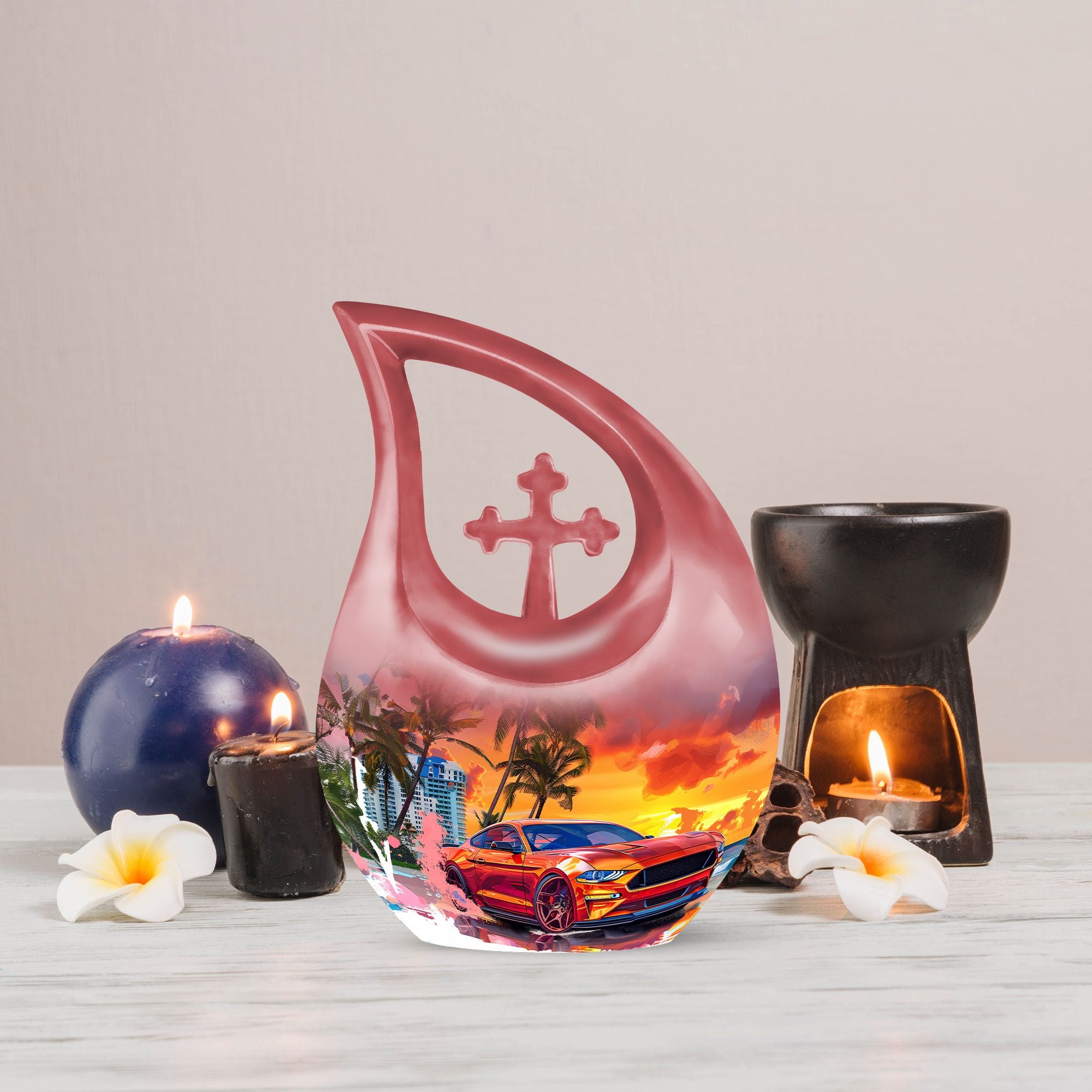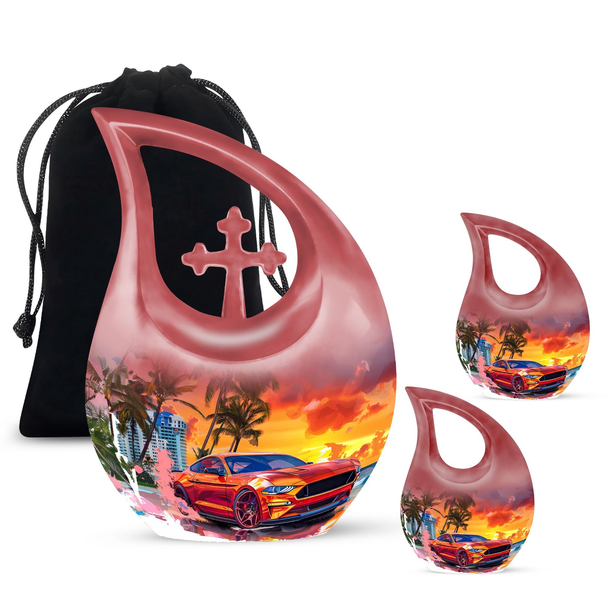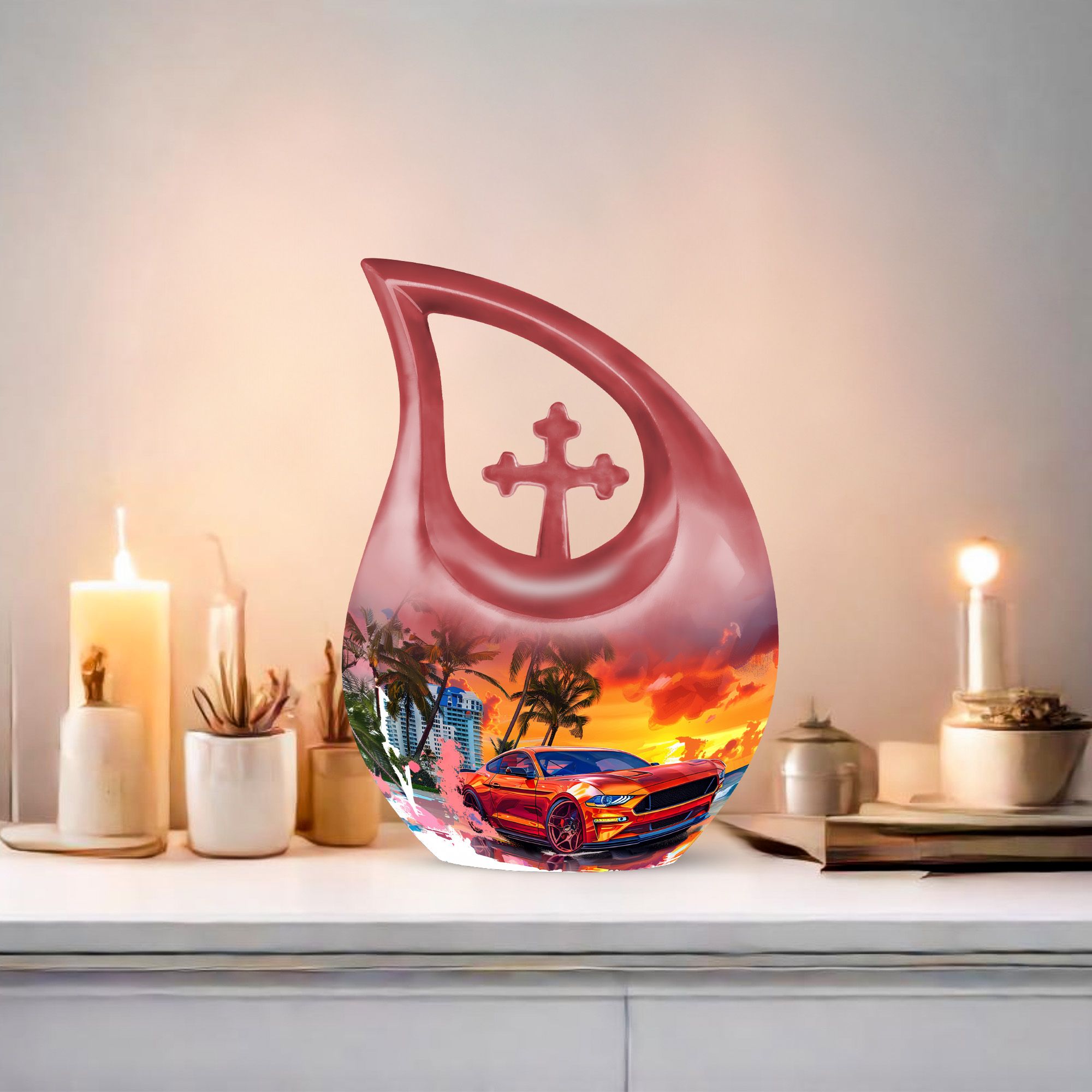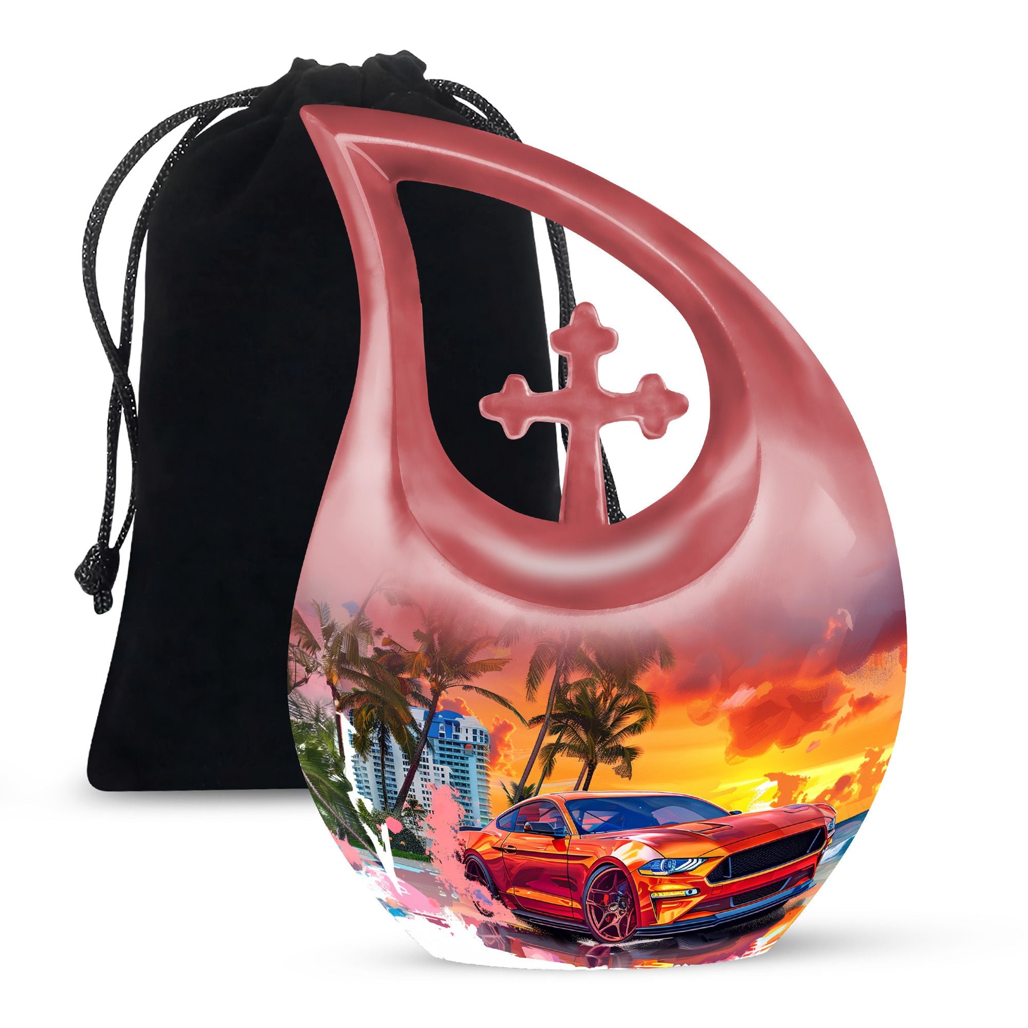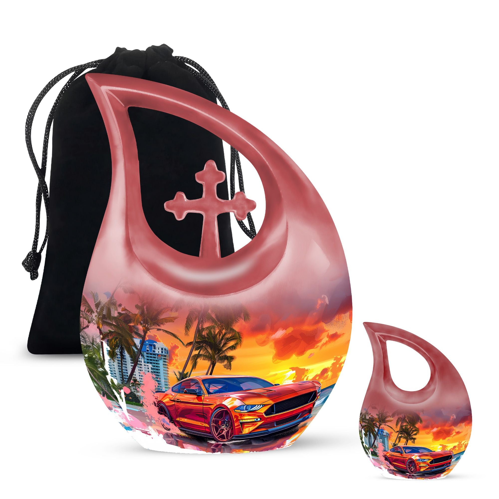 Celebrate and honor the memory of your loved one with this unique and heartfelt Car Urn. Crafted from solid Aluminium, this cremation urn stands 10 inches high, weighing 3.3 pounds while boasting a substantial capacity of 200 cubic inches. The 'Cross Drop' theme of this keepsake is thoughtfully designed to evoke memories of your beloved. This large urn is accompanied by a velvet pouch, providing careful containment of the precious ashes. Ideal for personalization, the urn can be engraved with your loved ones' names, making it a truly unique and special memorial. Finding the right urn can be challenging, but with this captivating car-themed urn, you can rest assured that it will serve as a fitting tribute to the dearly departed. While strongly resonating with the primary keywords like 'car urn', 'cremation urns for human ashes', the urn also aligns with secondary keywords such as 'cremation vaults', 'urn for mom', 'cheap urns', 'ashes container'. This keepsake is not only a poignant reminder of the strong bond shared but also a triumphant mark of your loved one's journey.