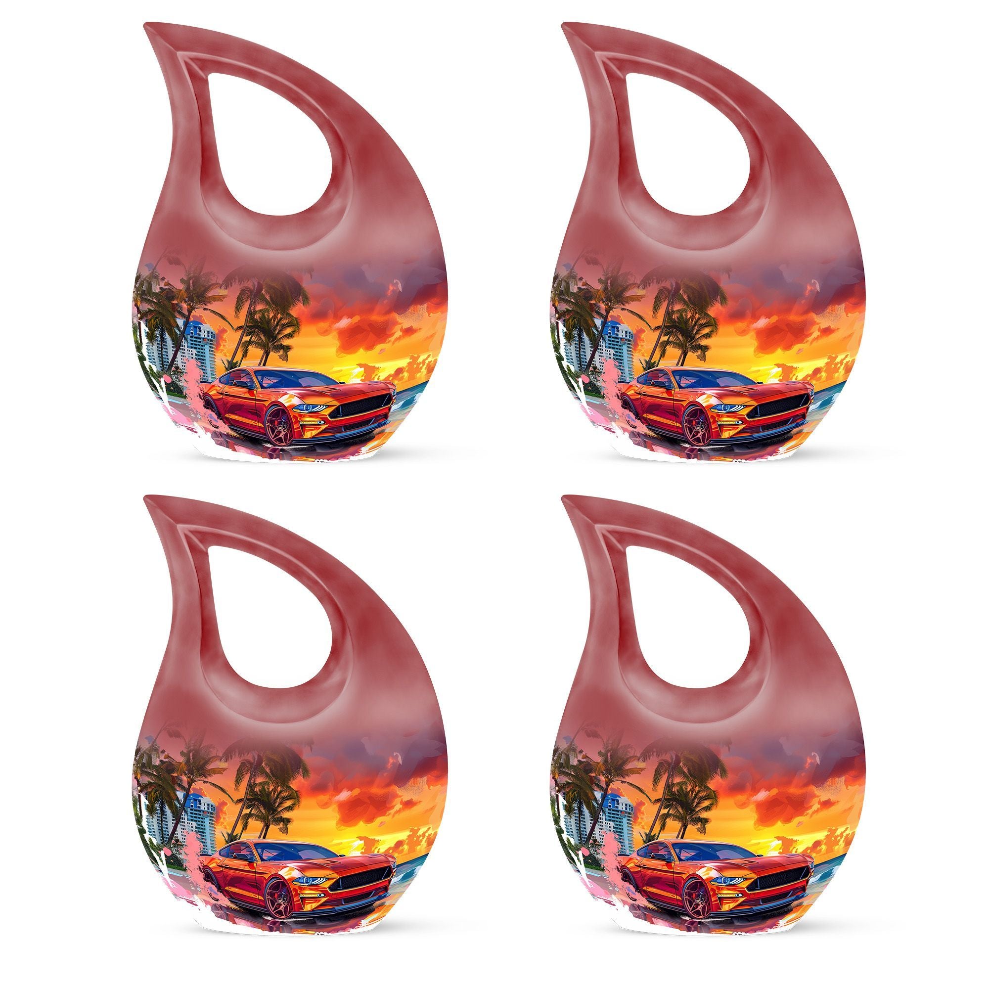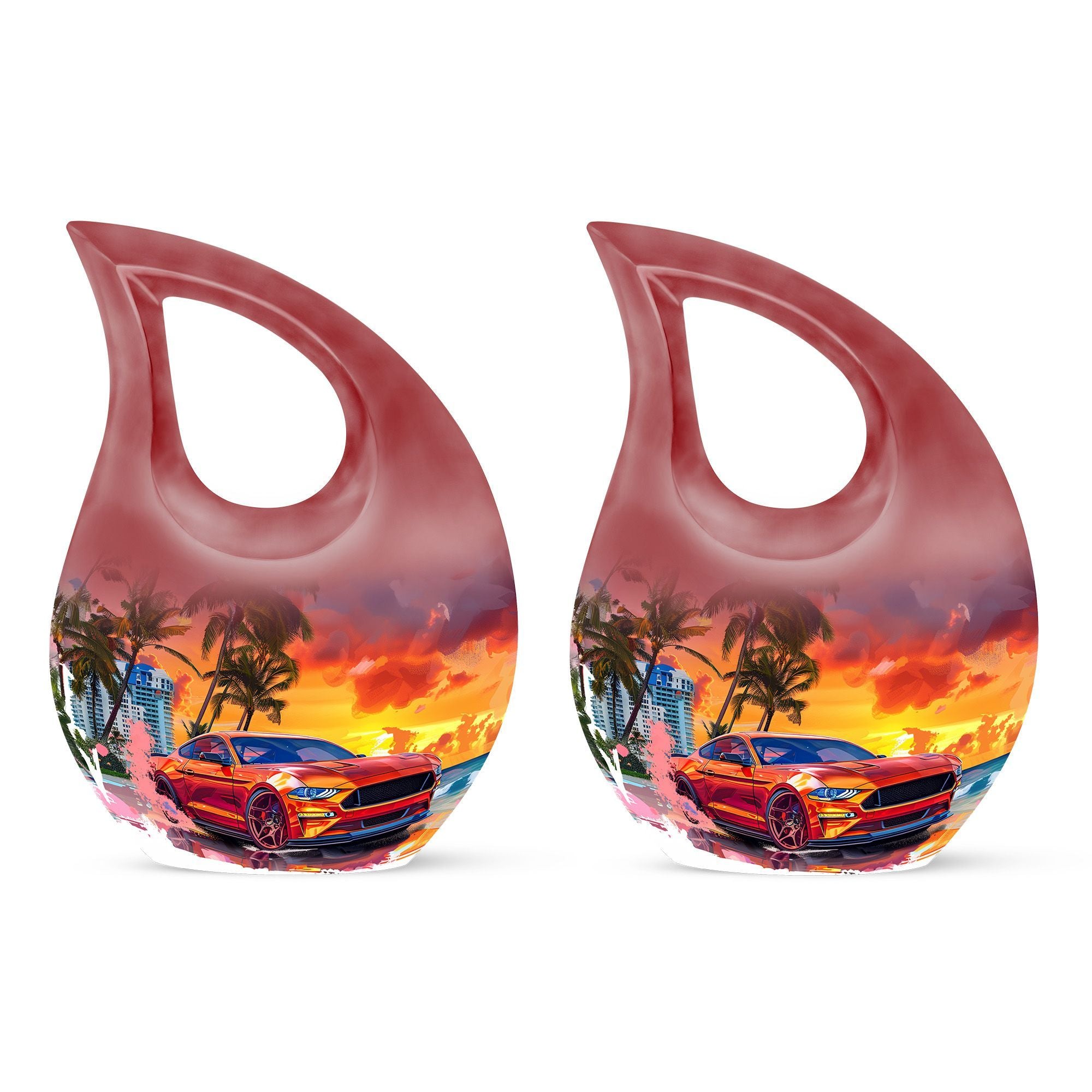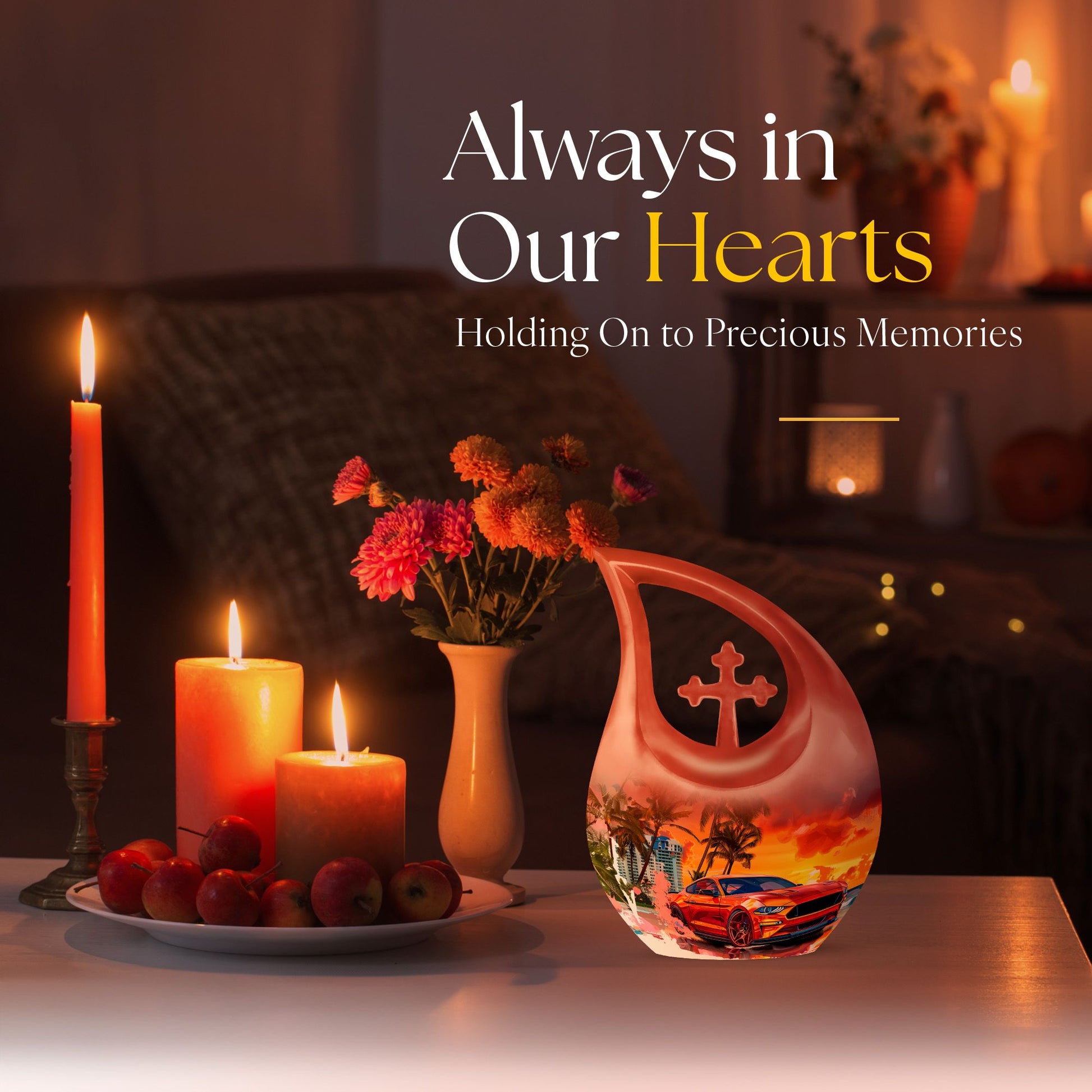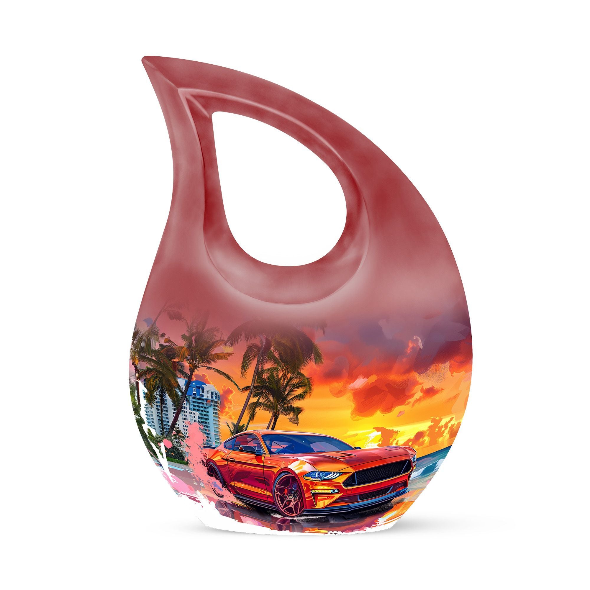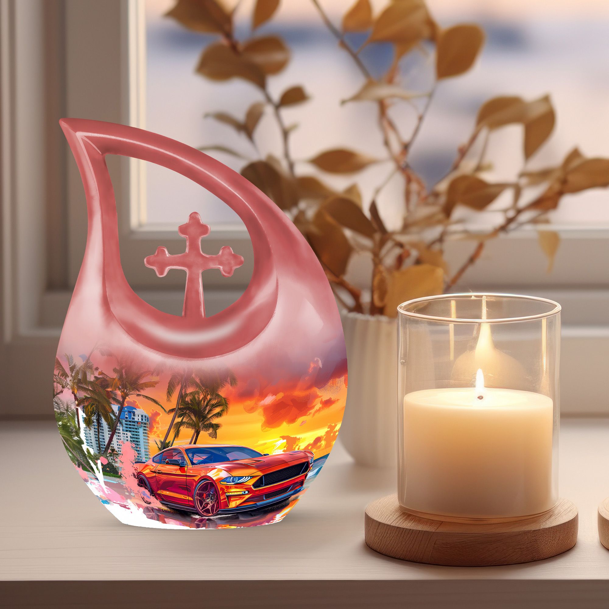 Celebrate and honor the memory of your loved one with this unique and heartfelt Car Urn. Crafted from solid Aluminium, this cremation urn stands 10 inches high, weighing 3.3 pounds while boasting a substantial capacity of 200 cubic inches. The 'Cross Drop' theme of this keepsake is thoughtfully designed to evoke memories of your beloved. This large urn is accompanied by a velvet pouch, providing careful containment of the precious ashes. Ideal for personalization, the urn can be engraved with your loved ones' names, making it a truly unique and special memorial. Finding the right urn can be challenging, but with this captivating car-themed urn, you can rest assured that it will serve as a fitting tribute to the dearly departed. While strongly resonating with the primary keywords like 'car urn', 'cremation urns for human ashes', the urn also aligns with secondary keywords such as 'cremation vaults', 'urn for mom', 'cheap urns', 'ashes container'. This keepsake is not only a poignant reminder of the strong bond shared but also a triumphant mark of your loved one's journey.