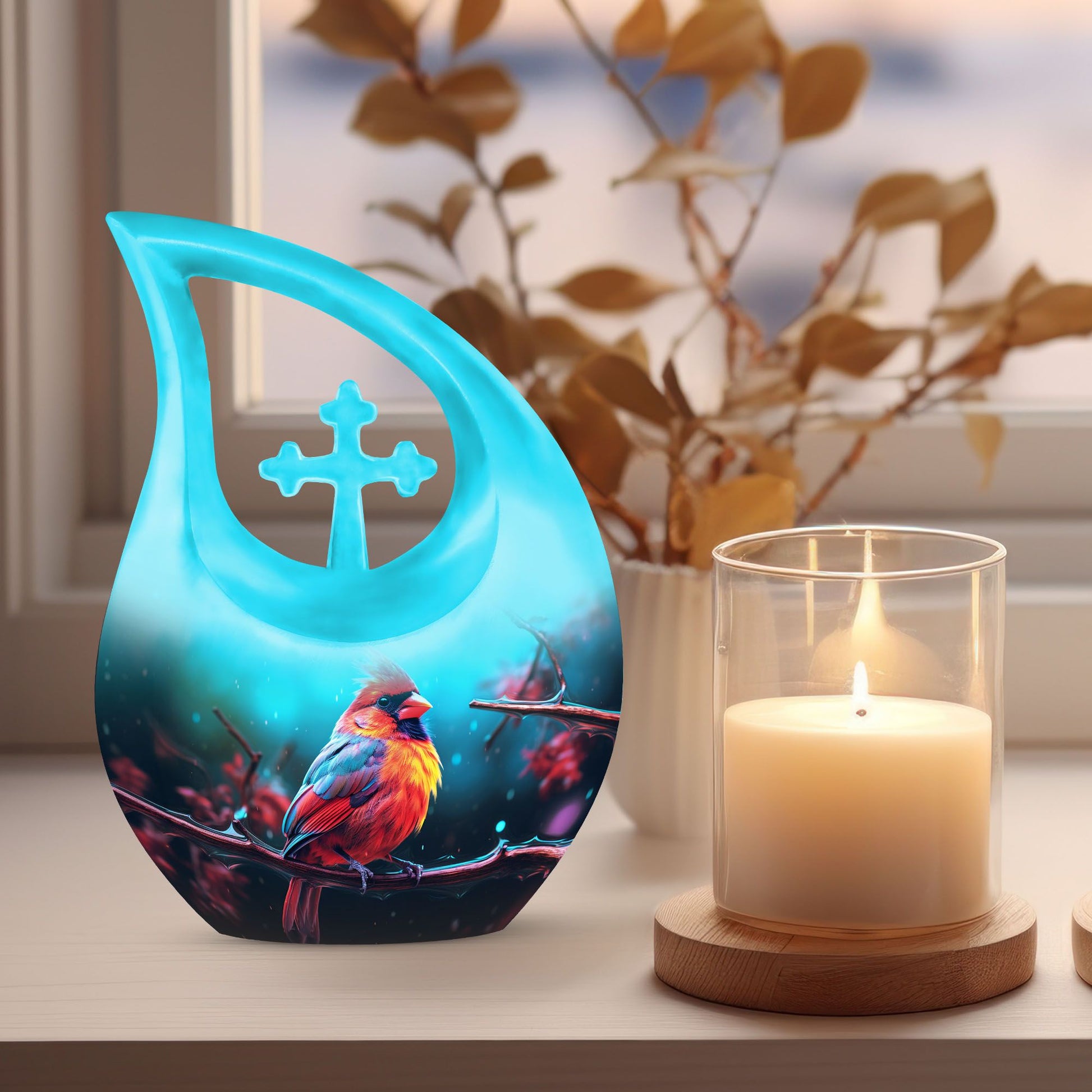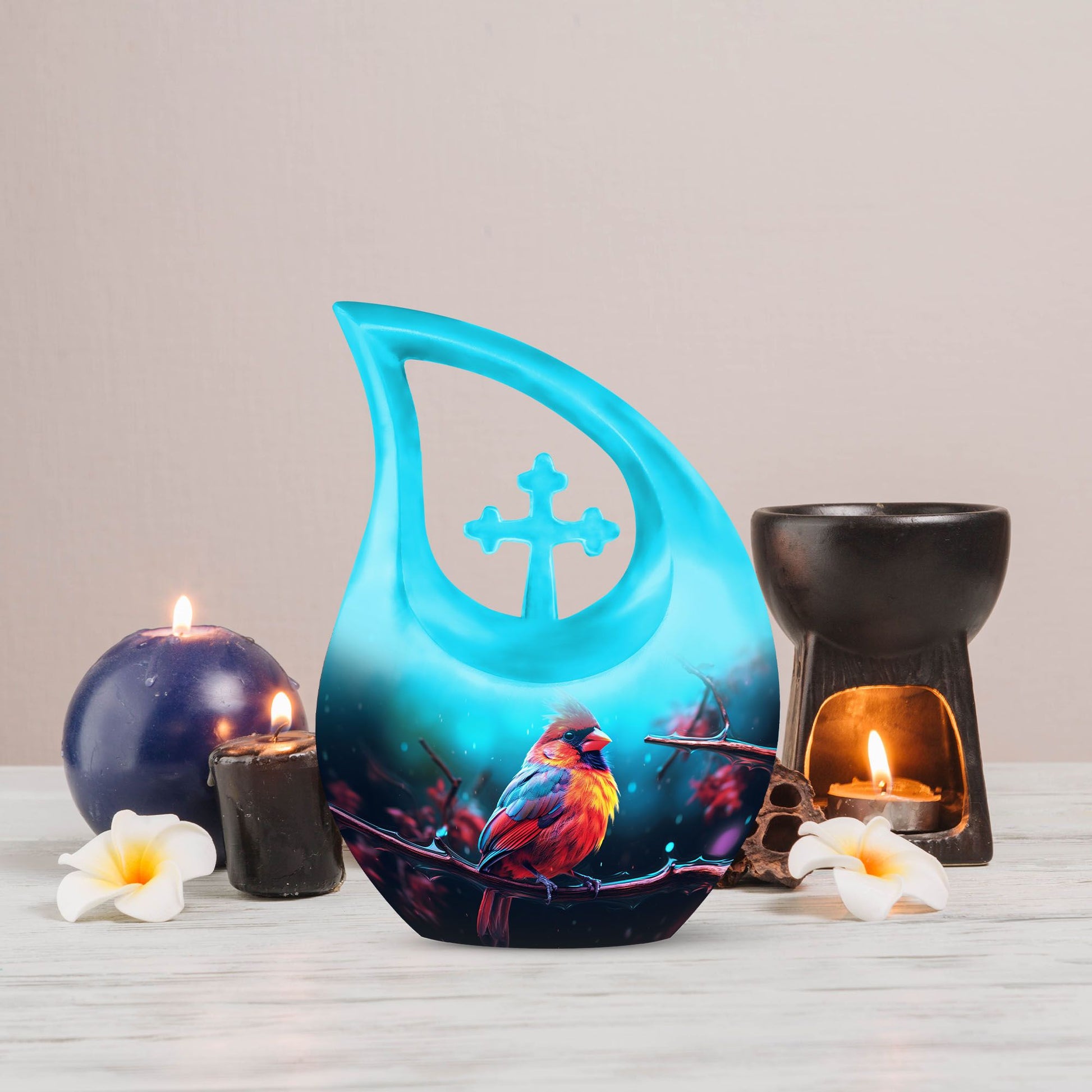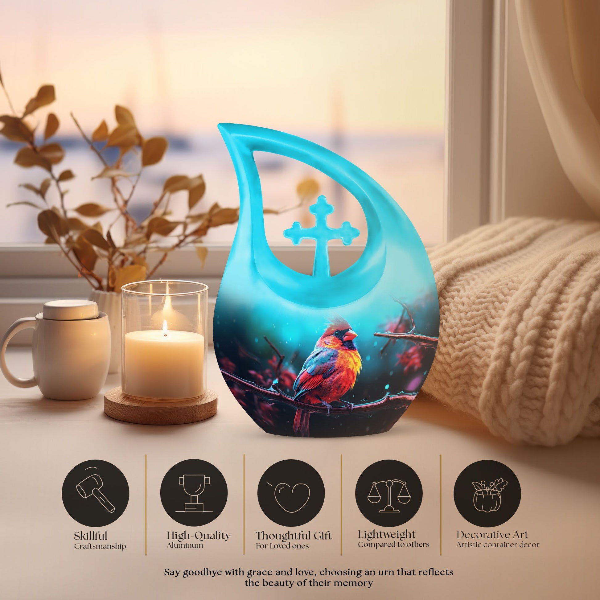 Handcrafted with care, this blue artistic memorial urn features a vivid red cardinal set against a peaceful blue background, representing the balance between earth and sky. Made from durable aluminium, it combines strength, artistry, and comfort. Its compact size makes it perfect as urns for ashes adult male small keepsake, for home memorials, or as part of burial urns for human ashes adult male arrangements. The secure screw-top lid ensures safe preservation, while the graceful design brings calm and beauty to any setting.