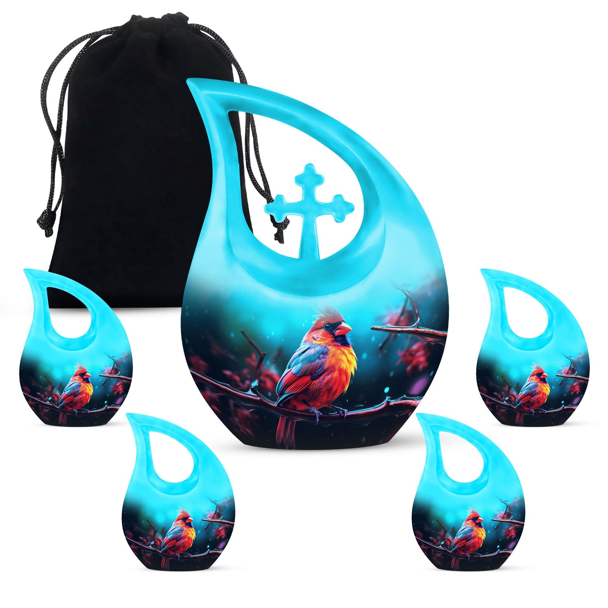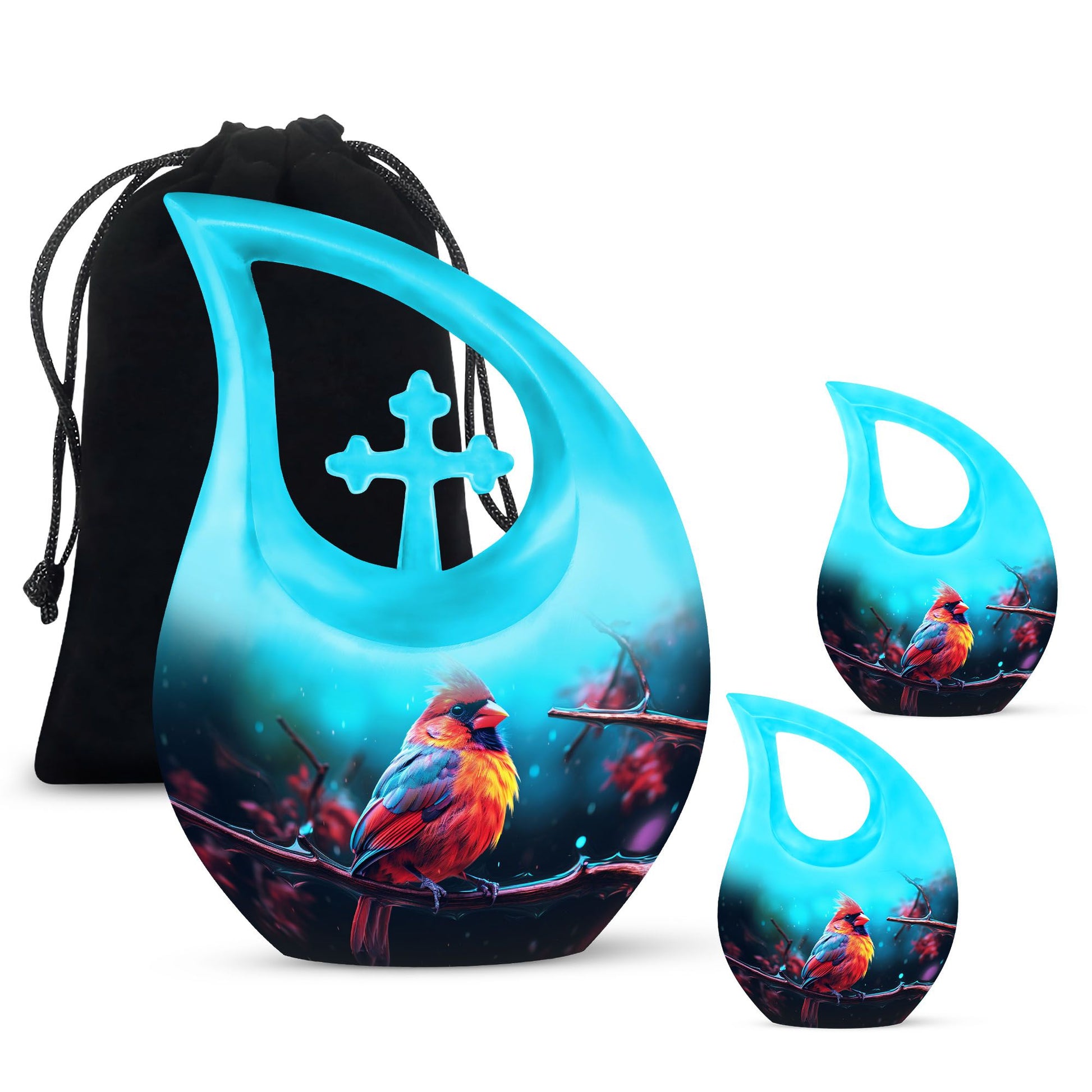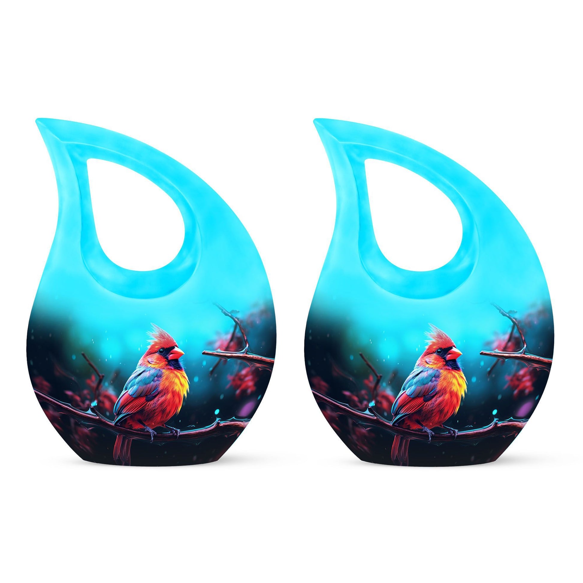 Handcrafted with care, this blue artistic memorial urn features a vivid red cardinal set against a peaceful blue background, representing the balance between earth and sky. Made from durable aluminium, it combines strength, artistry, and comfort. Its compact size makes it perfect as urns for ashes adult male small keepsake, for home memorials, or as part of burial urns for human ashes adult male arrangements. The secure screw-top lid ensures safe preservation, while the graceful design brings calm and beauty to any setting.