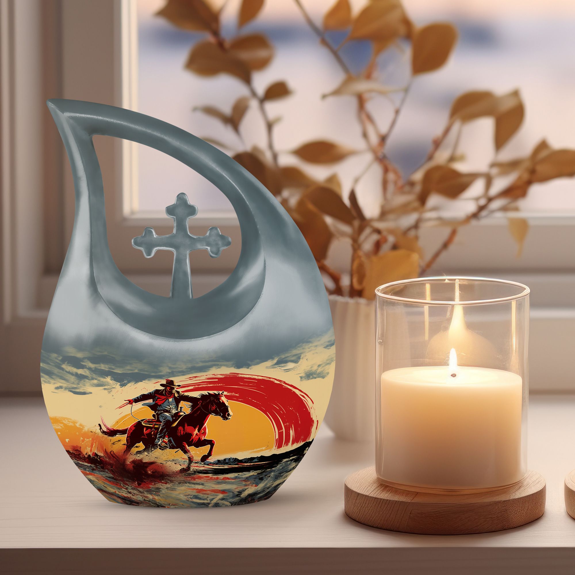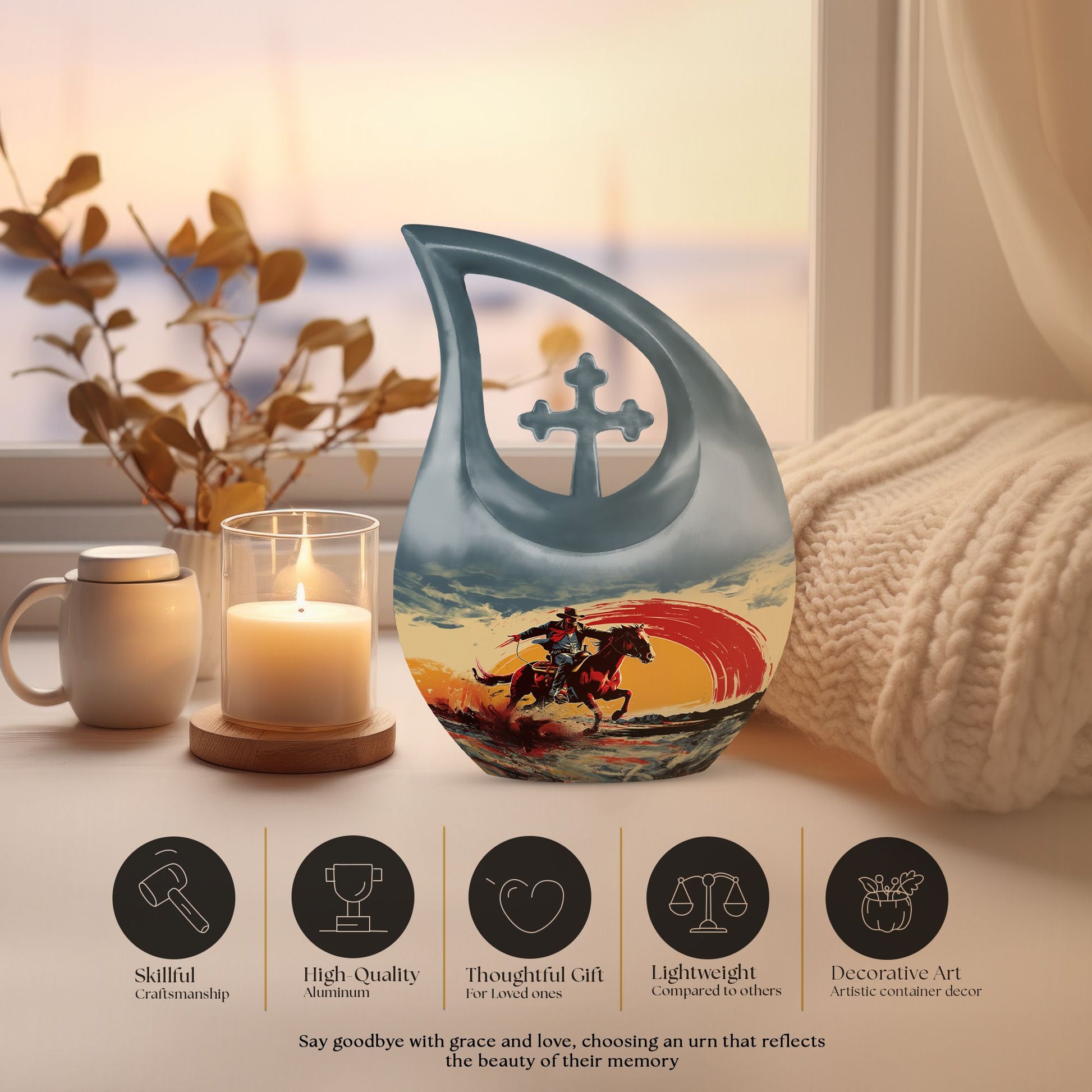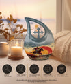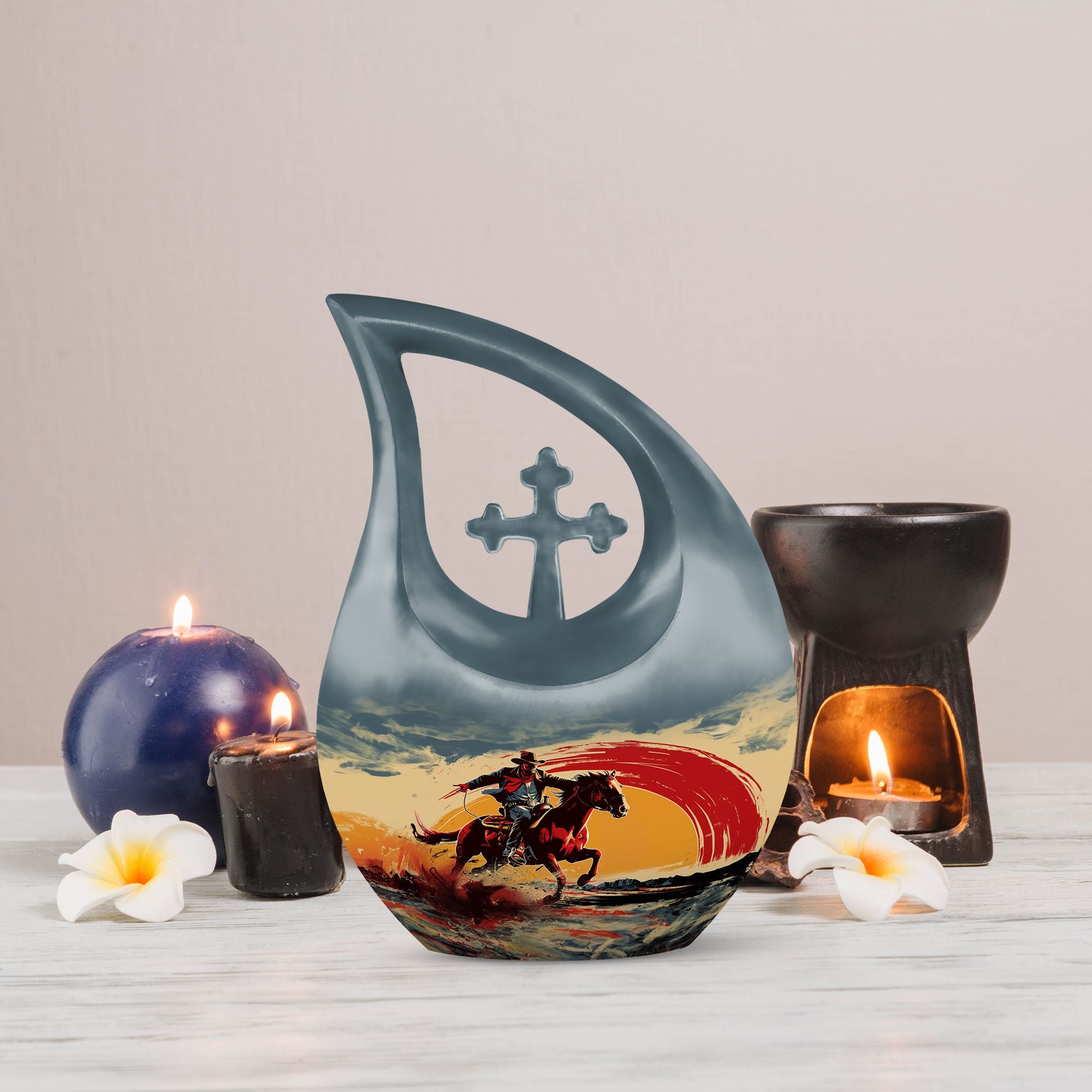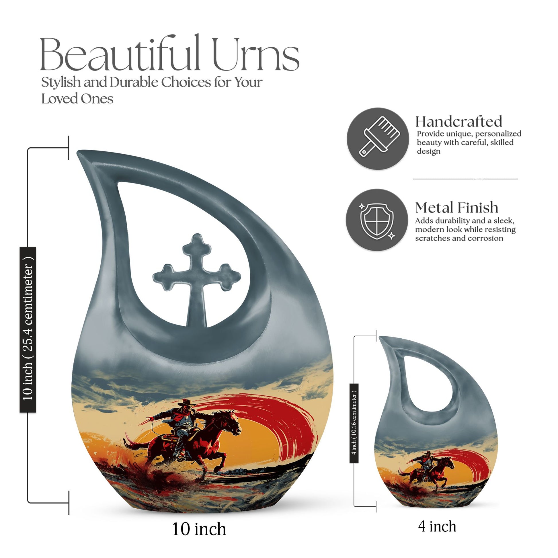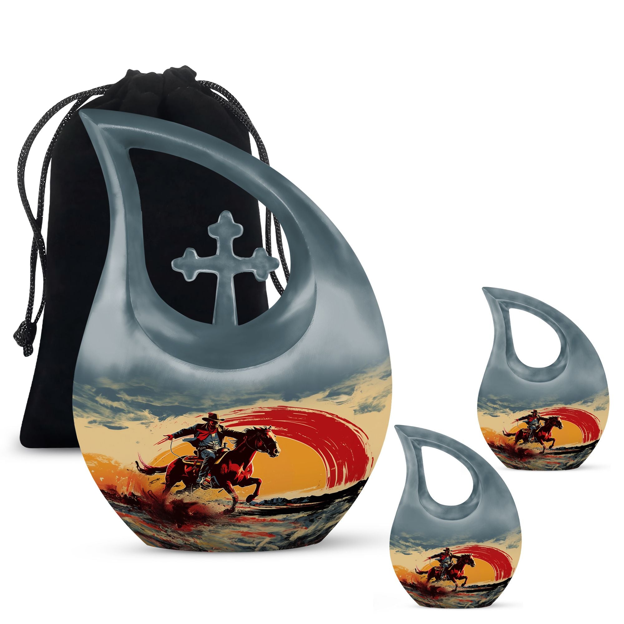 Encapsulate your treasured memories with our exquisitely crafted 'Cowboy Urn', a quintessential choice in our large urns' collection, purposefully designed for memorial ceremonies. Made from enduring aluminium, this urn exudes a sturdiness that is as perpetual as the memories it safeguards. Measuring 10 inches in height, it weighs 3.3 pounds and holds a capacity of 200 cubic inches - giving ample space while maintaining a compact form. It effectively serves as an expansive repository for cremation ashes, which can be easily contained in a plush velvet pouch included in the package for added security and style. Break away from the mundane with our 'Cross Drop' urn design, a symbol of belief and solace, invoking spiritual comfort at the times when you need it the most. For an extra touch of sentiment, utilize our customization option to engrave the names of your loved ones, personalizing your urn and providing a unique tribute. Embark on a journey of remembrance with our cowboy-themed urn, a perfect way to memorialize your loved ones' unique stories. Whether your search includes burial urns, urns for ashes,or urns for human ashes, our affordable urns are an excellent choice, blending superior quality with emotional significance.