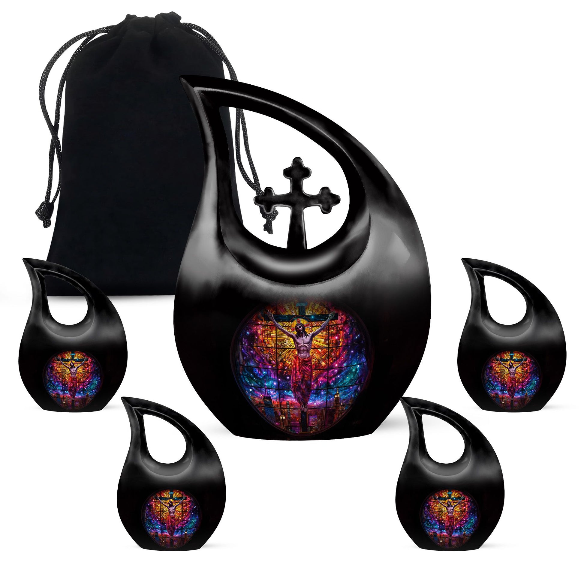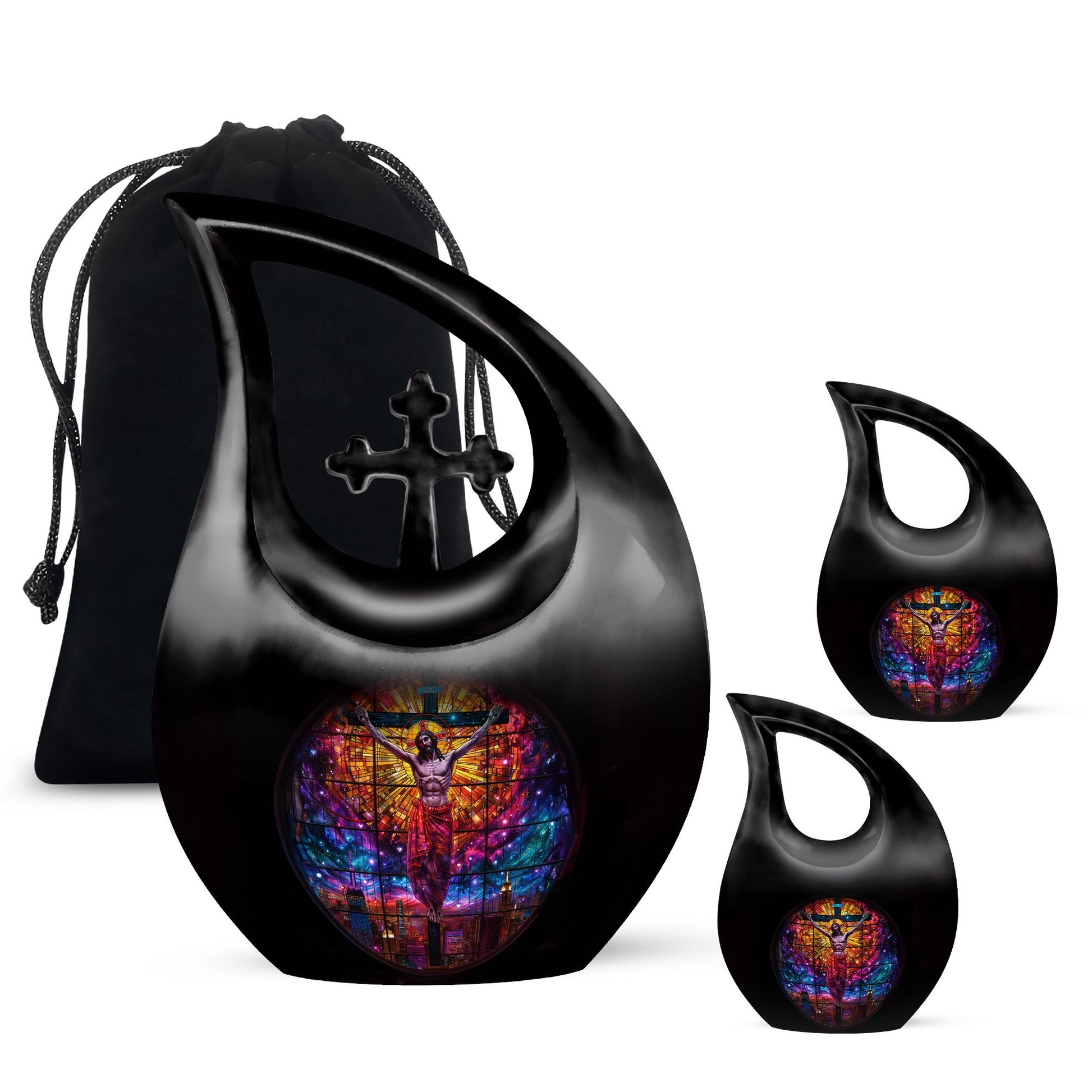 Experience a powerful yet personal memento with this Cross-Drop Large Urn. Skillfully crafted from durable aluminium, it weighs a sturdy 3.3 pounds and stands tall at 10 inches, accommodating up to 200 cubic inches of ash. Along with its distinctive size, this funeral urn offers a bespoke touch. Personalize it with engraved names to make it an individual and endearing representation of your loved ones. The urn's package contents include a velvet pouch for containment of ashes, enhancing the urn's look while providing a secure hold. Ideal for individuals seeking not only 'Cross Urns' but also 'memorial urns', this product extends its appeal to those searching for 'cheap cremation urns', 'keepsake urns', and 'custom urns'. Unparalleled in design and quality, this Cross Drop Urn is a heartwarming and affordable choice for remembering those dear to you.