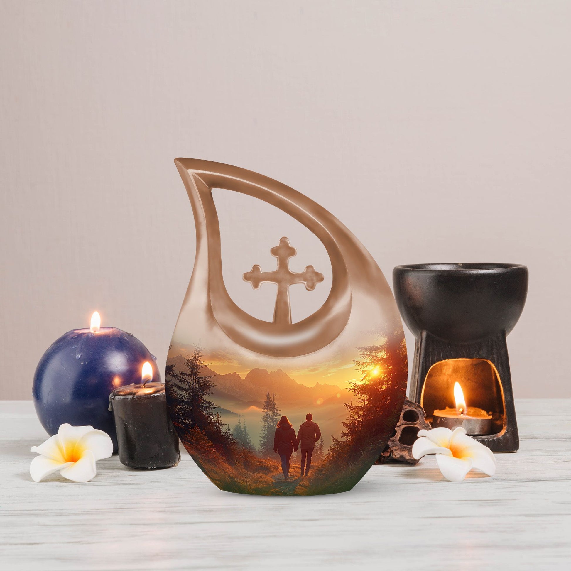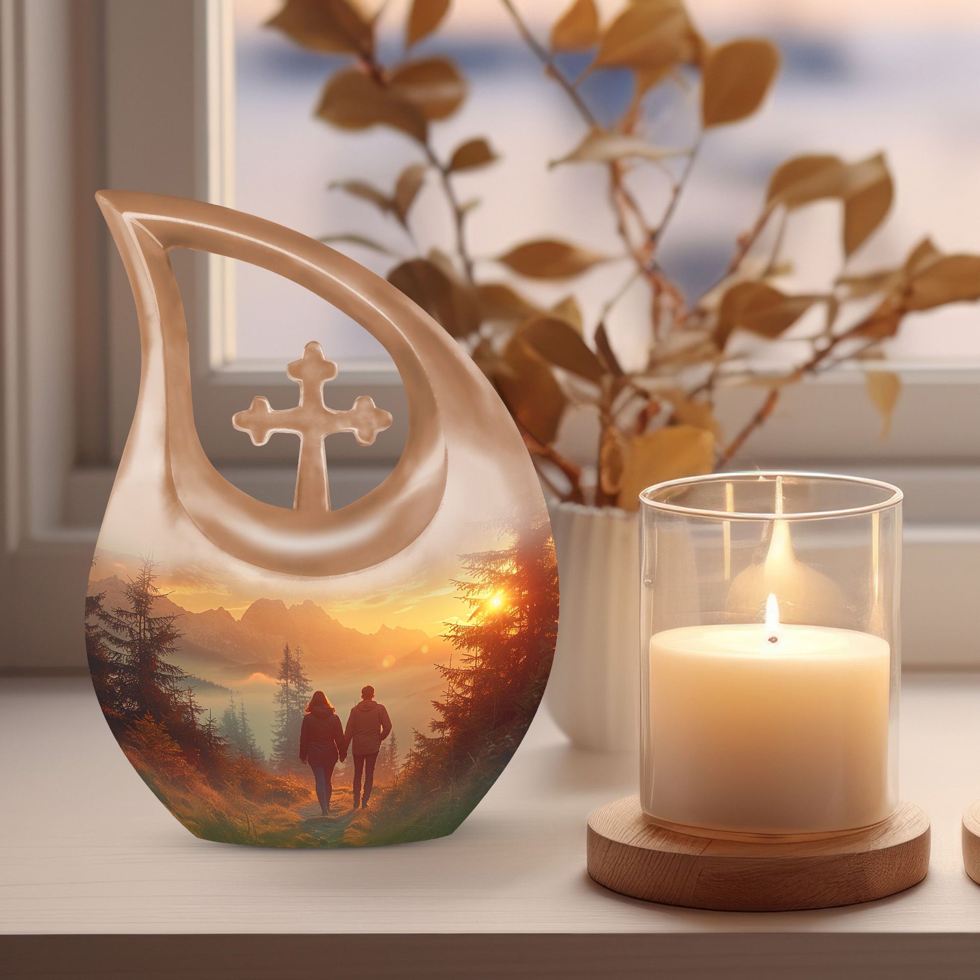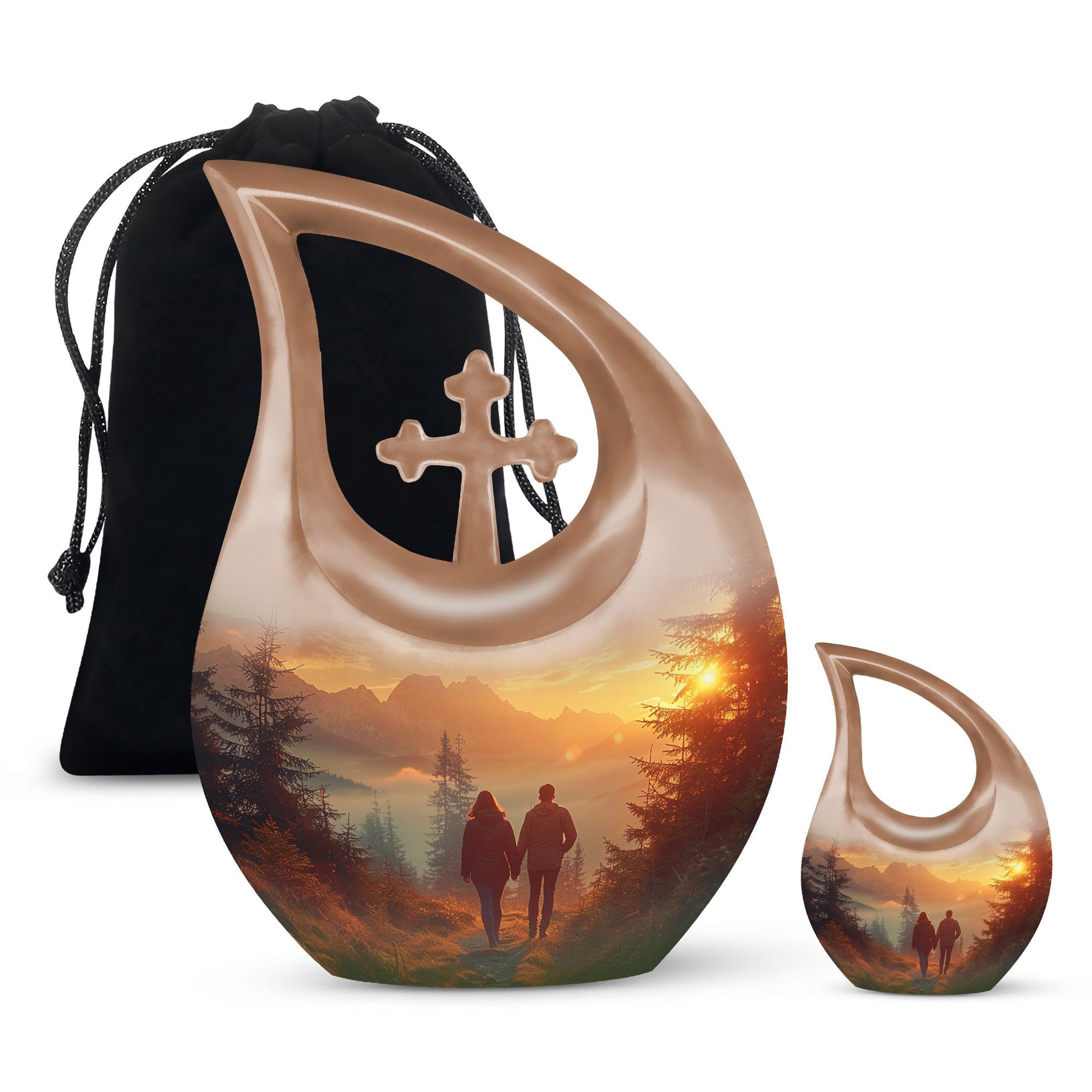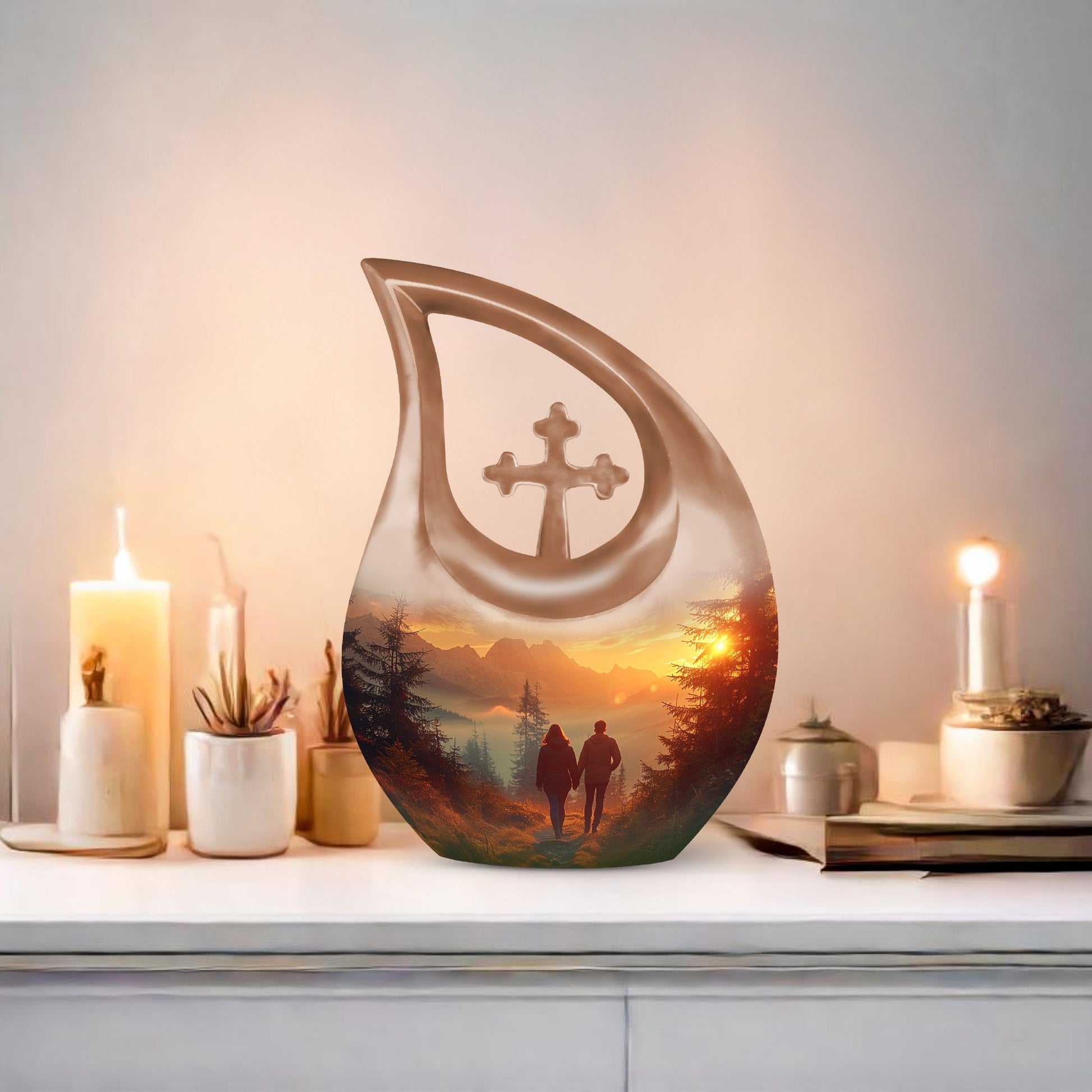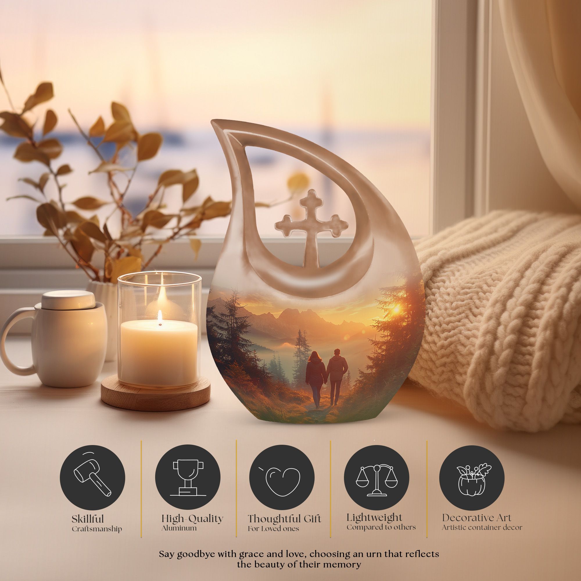 Introducing the 'Dawn's Gentle Embrace Urn', a loving tribute to your departed ones. Our unusually shaped, large urn delicately fuses the sanctity of the 'Cross Drop' theme with the enduring strength of high-quality aluminium making it an exquisite piece. It stands at 10 inches tall, possesses a substantial weight of 3.3 pounds, and offers an impressive capacity of 200 cubic inches, lending it an imposing yet comforting presence. Personalization options are available, allowing you to engrave names to add a touch of intimacy. This little urn for human ashes offers a serene journey into the afterlife, bringing immense consolation during grieving times. The urn also includes a tactile velvet pouch for containment of ashes, sealing the precious remnants safely within. Ideal for both men and women, this full size urn embodies a peaceful celestial dawn-themed embrace. Distinct from regular memorial urns, 'Dawn's Gentle Embrace Urn' offers a heartfelt tribute to your lost love.