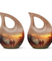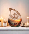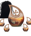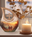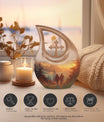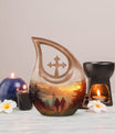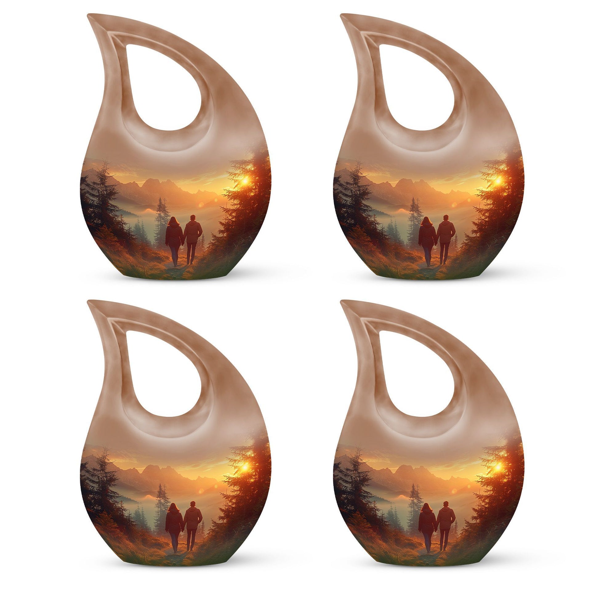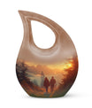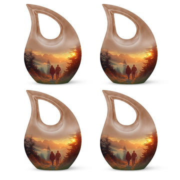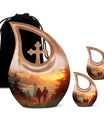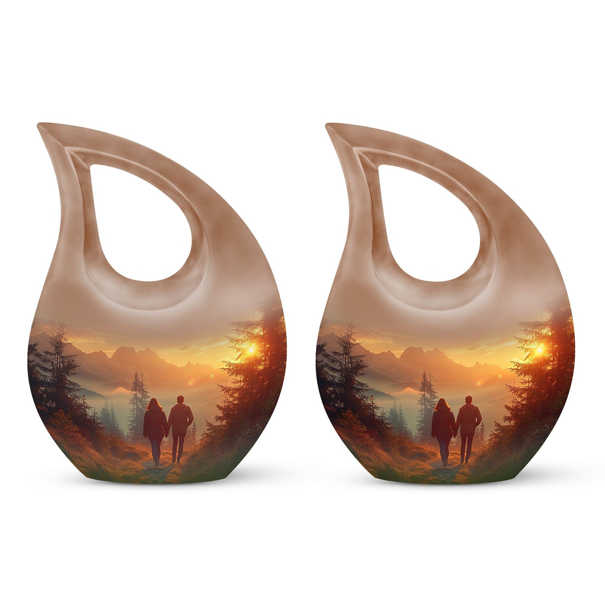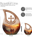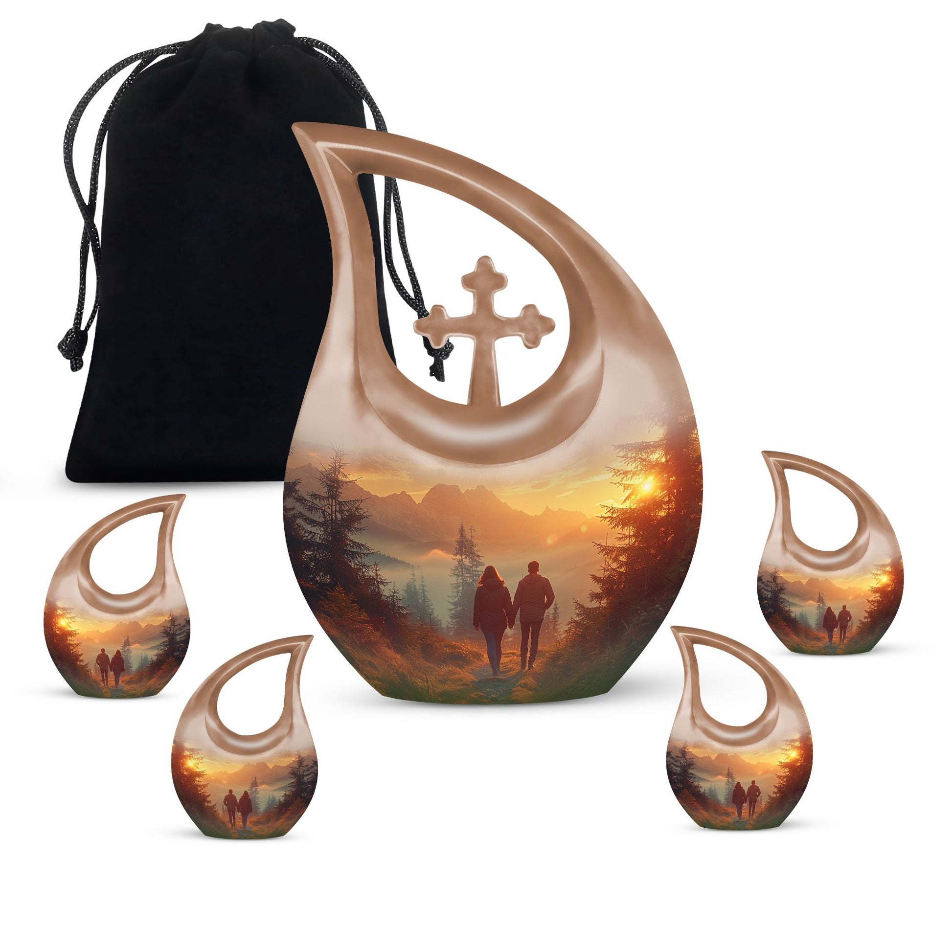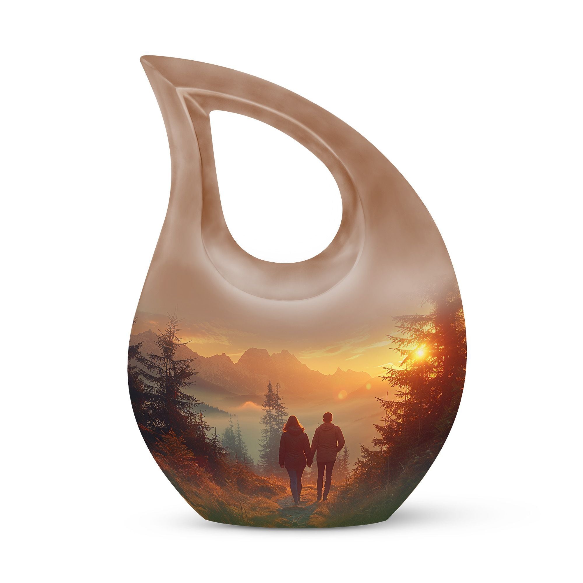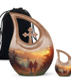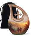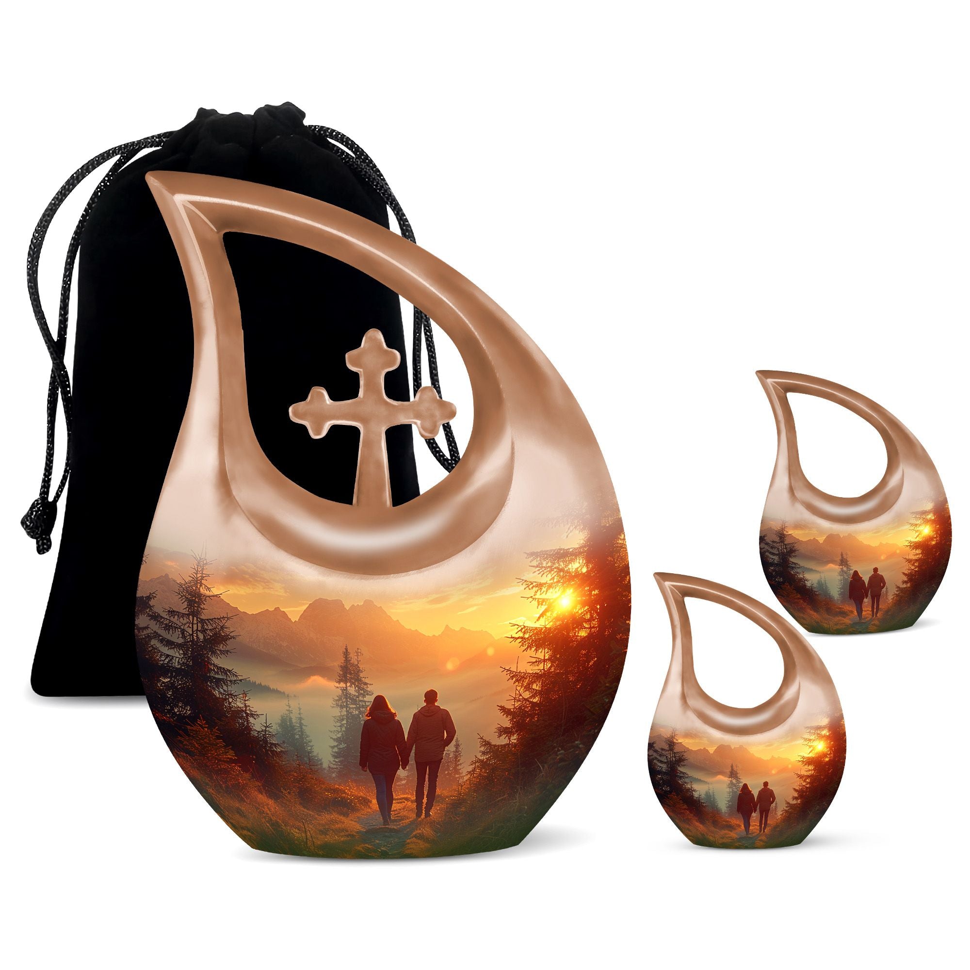 Introducing the 'Dawn's Gentle Embrace Urn', a loving tribute to your departed ones. Our unusually shaped, large urn delicately fuses the sanctity of the 'Cross Drop' theme with the enduring strength of high-quality aluminium making it an exquisite piece. It stands at 10 inches tall, possesses a substantial weight of 3.3 pounds, and offers an impressive capacity of 200 cubic inches, lending it an imposing yet comforting presence. Personalization options are available, allowing you to engrave names to add a touch of intimacy. This little urn for human ashes offers a serene journey into the afterlife, bringing immense consolation during grieving times. The urn also includes a tactile velvet pouch for containment of ashes, sealing the precious remnants safely within. Ideal for both men and women, this full size urn embodies a peaceful celestial dawn-themed embrace. Distinct from regular memorial urns, 'Dawn's Gentle Embrace Urn' offers a heartfelt tribute to your lost love.