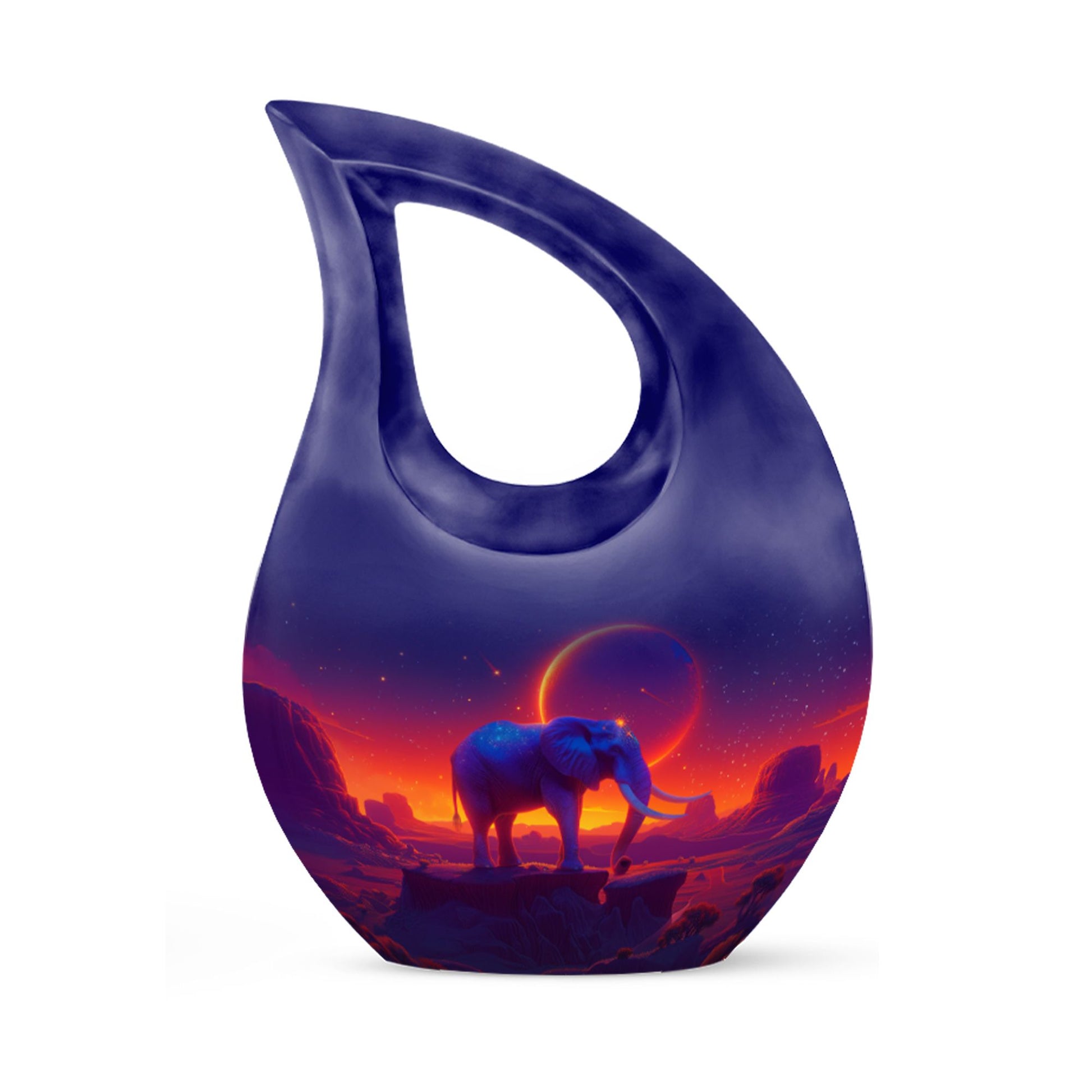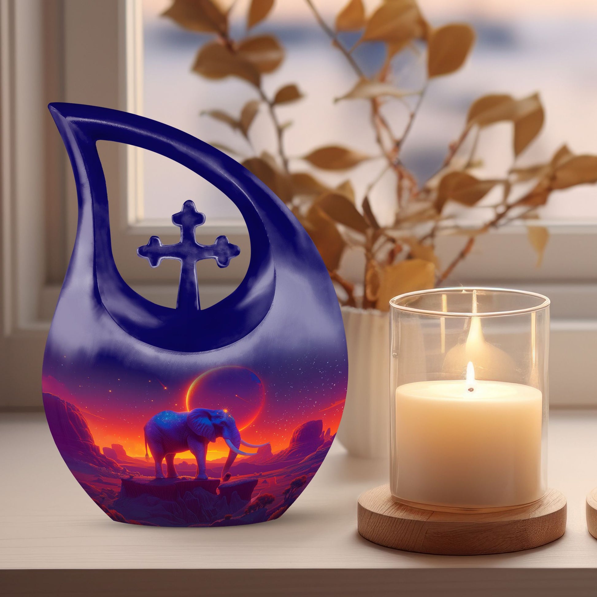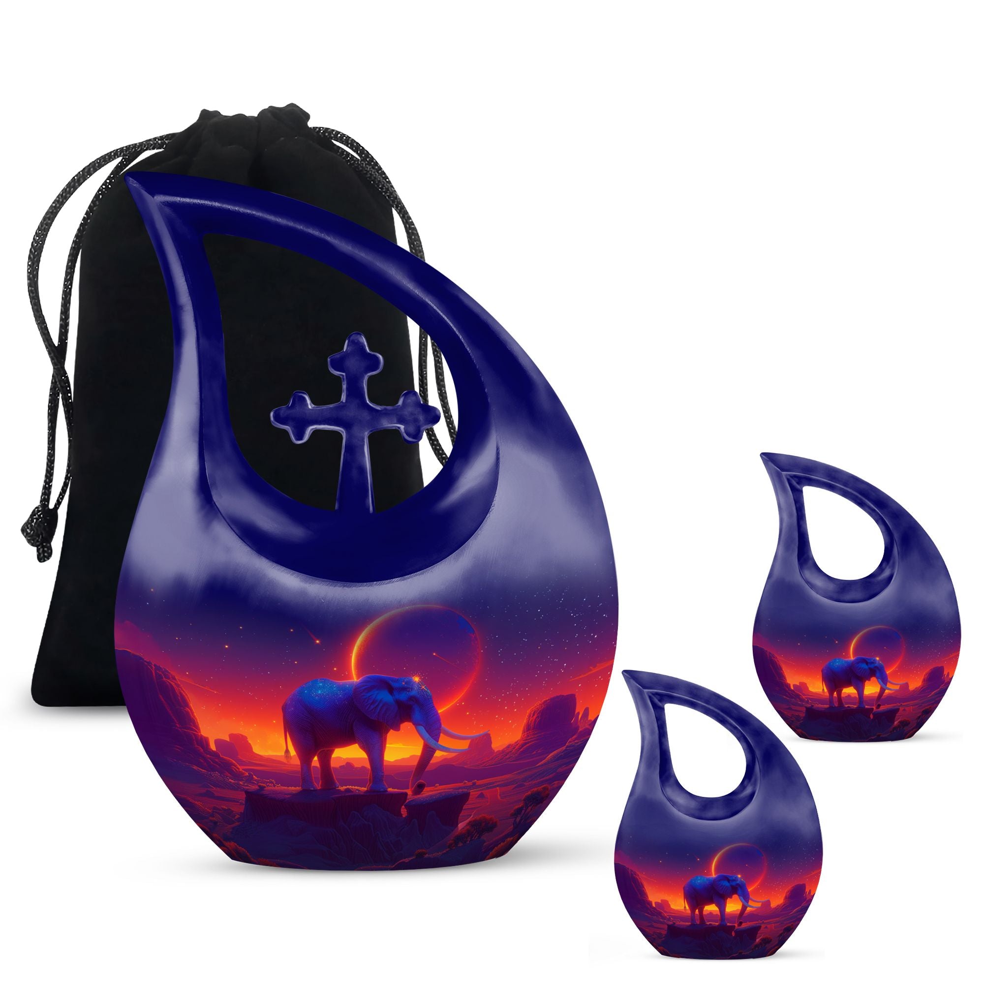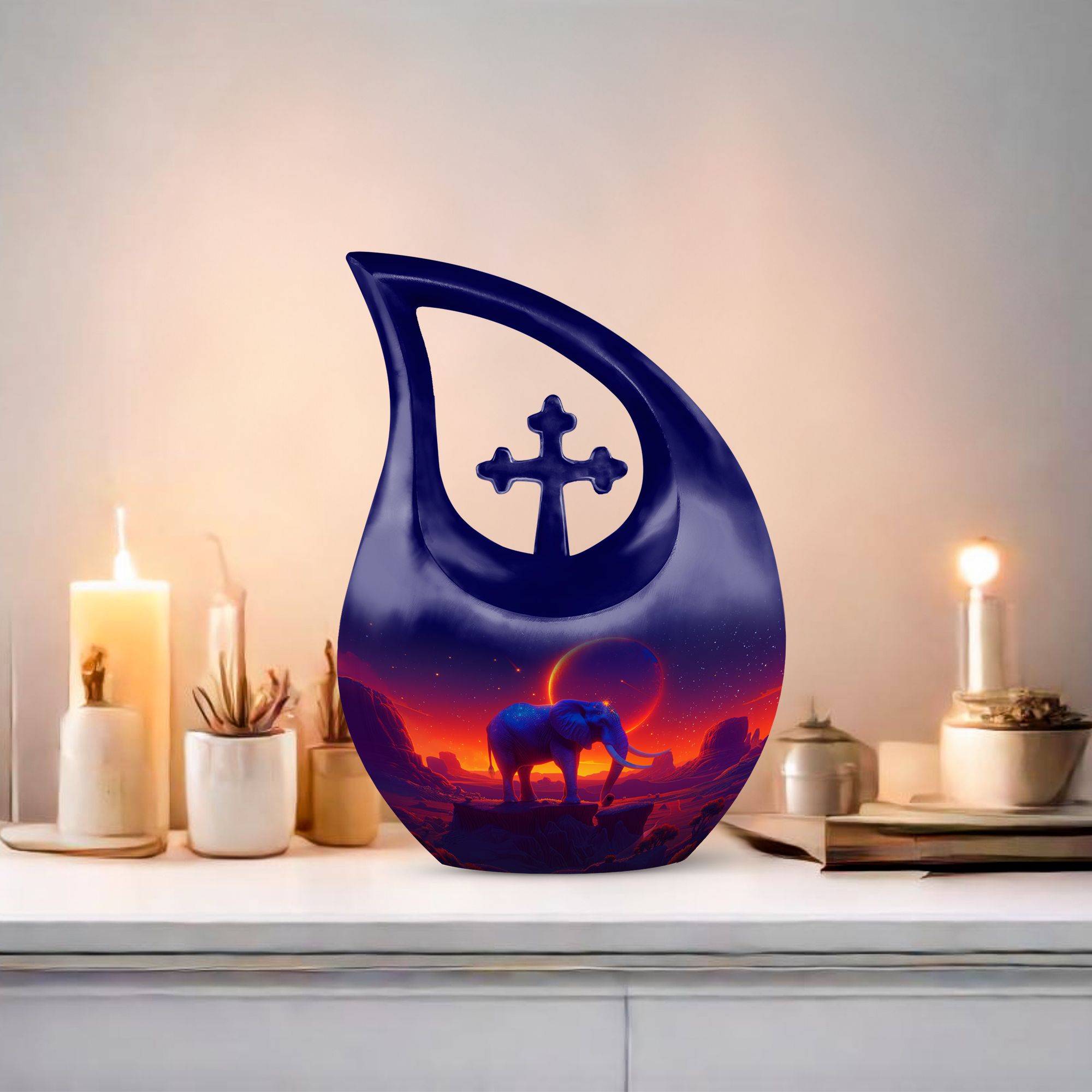 For those seeking a distinctive token of remembrance, our Elephant Urn is an exquisite choice. Crafted from high-quality aluminium, this urn ensures durability, longevity and provides a substantial weight of 3.3 pounds. This 10-inch memorial urn has a generous capacity of 200 cubic inches, capable of encompassing the ashes of your beloved ones. The theme resonates with the majestic aura of an elephant, symbolizing strength, wisdom and loyalty which complements the 'Cross Drop' motif to produce a serene harmony. To add a more intimate touch, it can be crafted to embody a personal touch with engraved names. The urn comes with a protective velvet pouch for safekeeping. As a unique ceremonial pick, it meets the demands for extra-large urns and is a compelling alternative to cremation monuments. For those in search of unique urns for dad or custom-made urns for ashes, this elegantly tailored artefact marks a fitting tribute. Feel the comfort and warmth in remembrance while honoring your loved ones.
