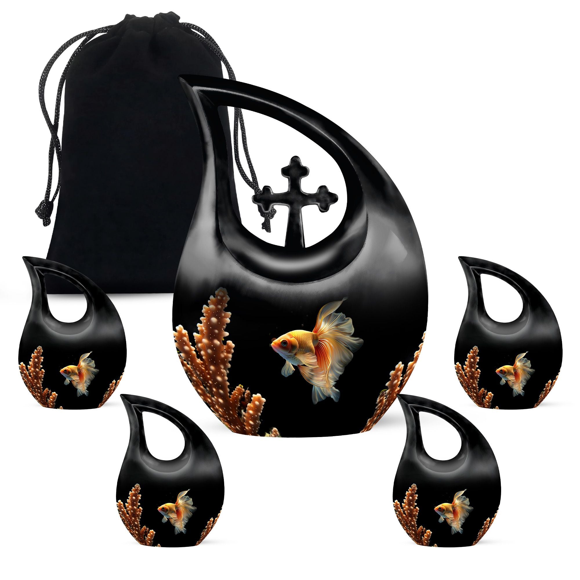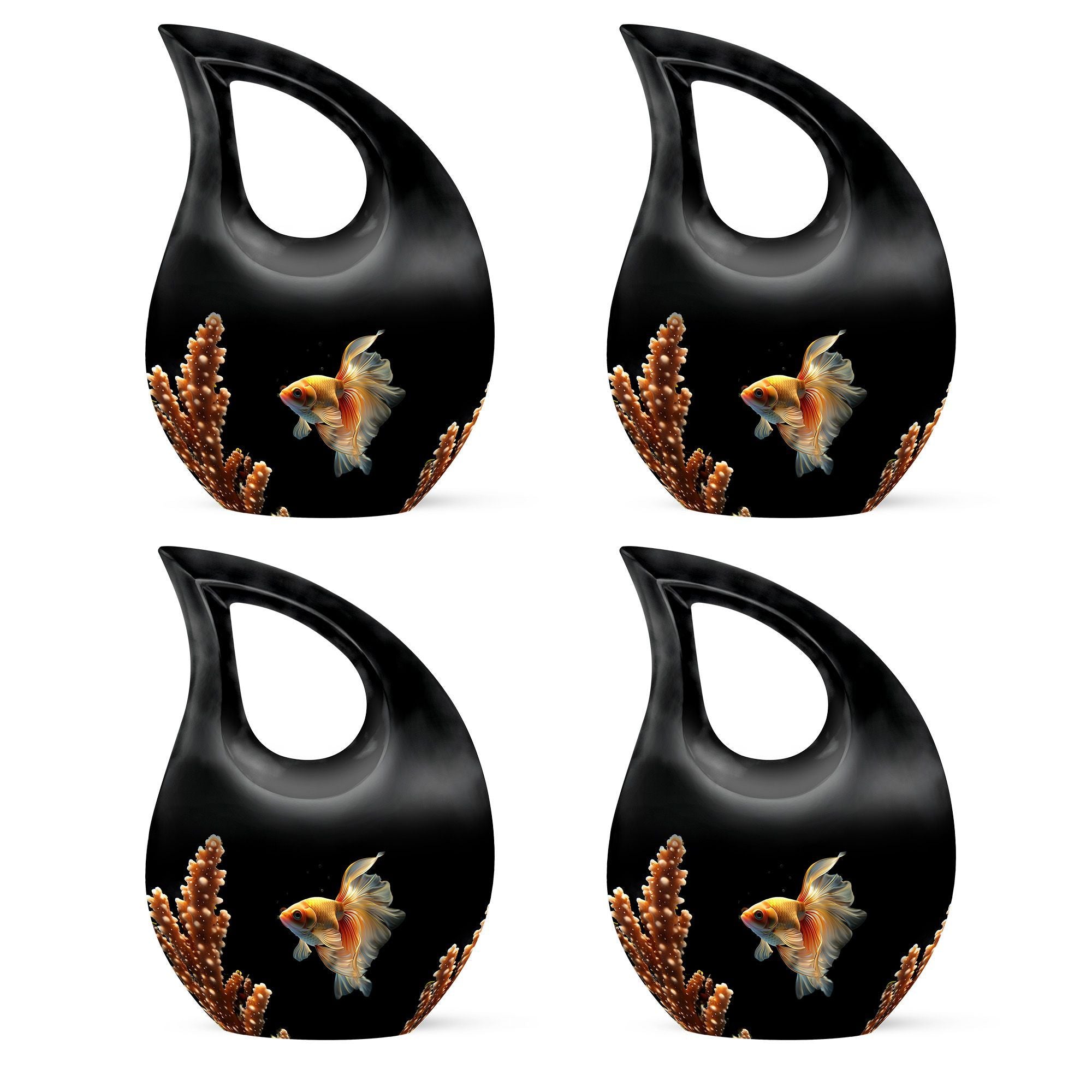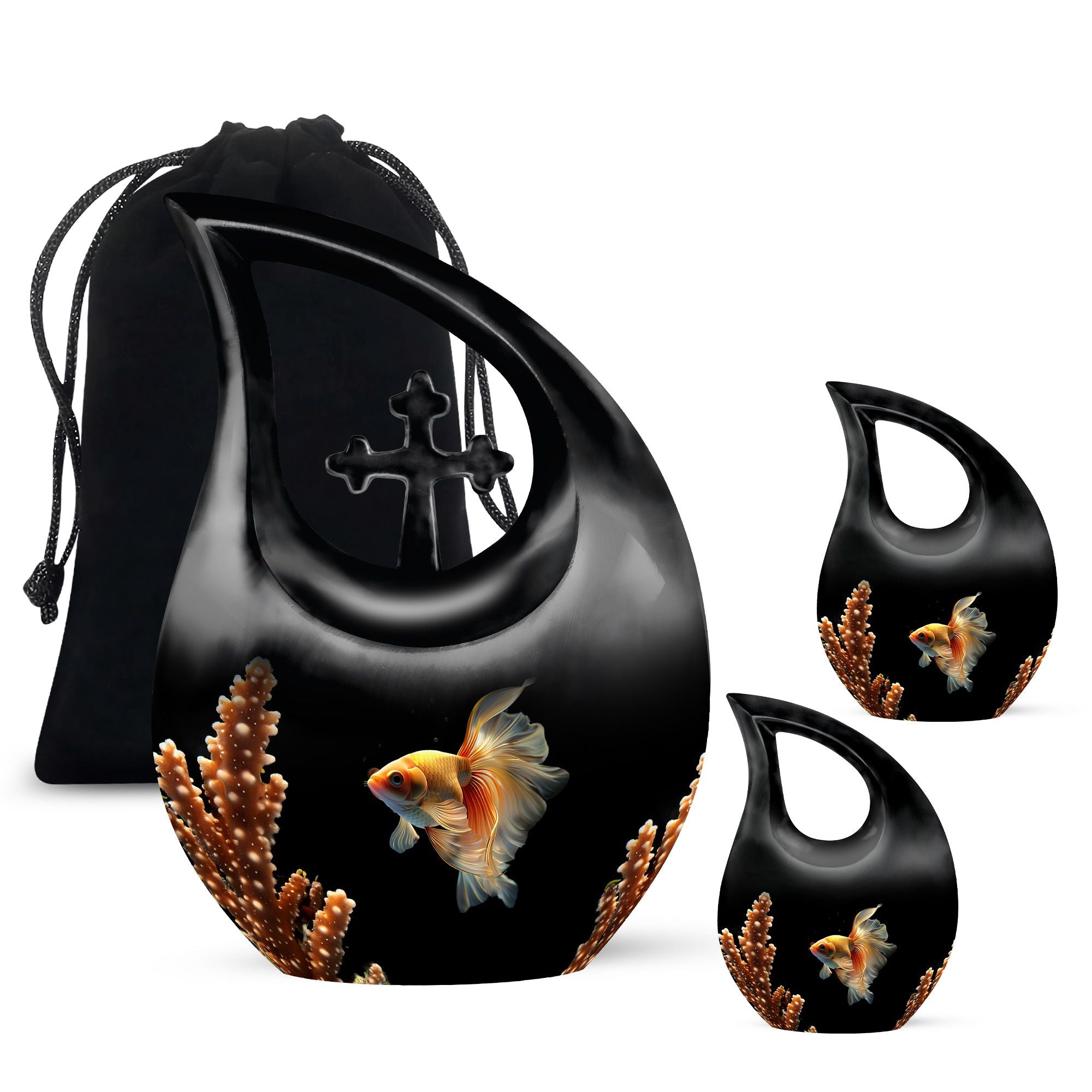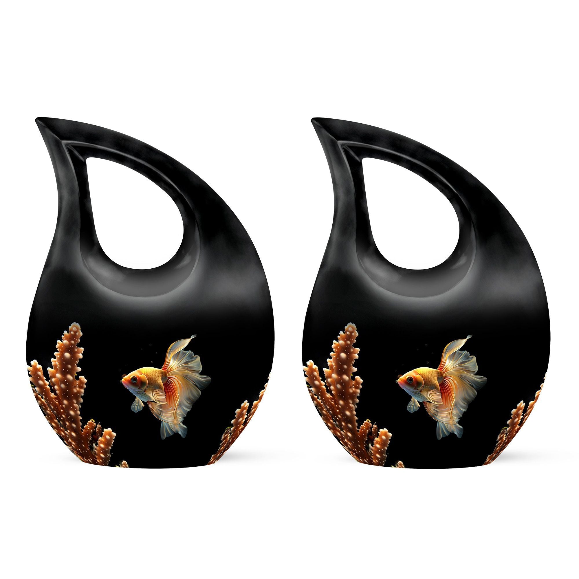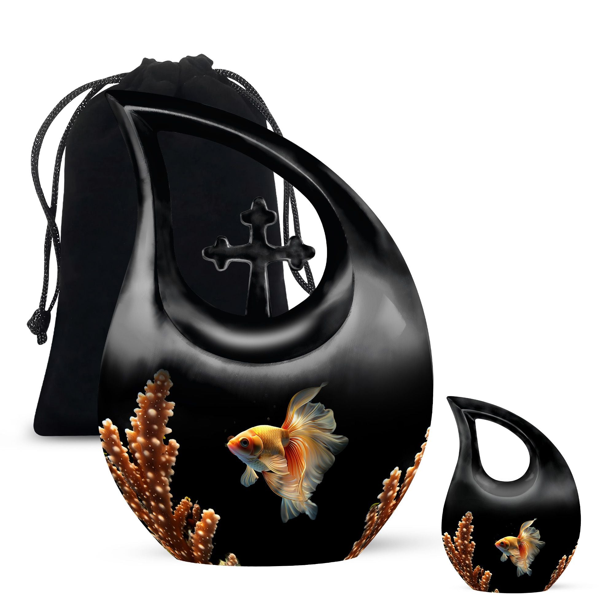 Crafted from durable aluminum, this black urn showcases vibrant goldfish and coral reef artwork, representing harmony, renewal, and the enduring flow of life. With its full 200-cu-in capacity, it serves beautifully as a large decorative urn for human ashes, urn for ashes for women, or an elegant option for families needing funeral urns for adult ashes men. The secure screw-top lid ensures ashes remain protected, while its thoughtful design pairs well with keepsake urns for women, mini small urns for men, or a small urn for ashes for women for shared remembrance.