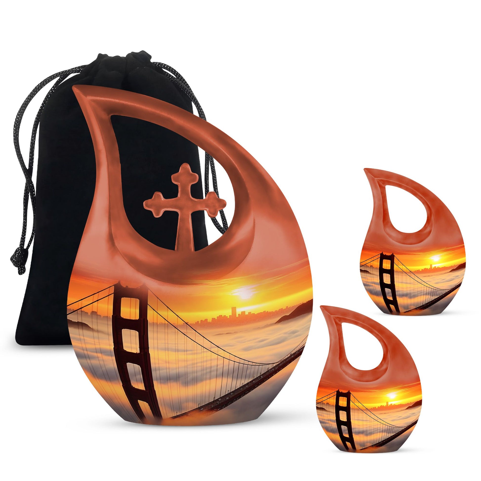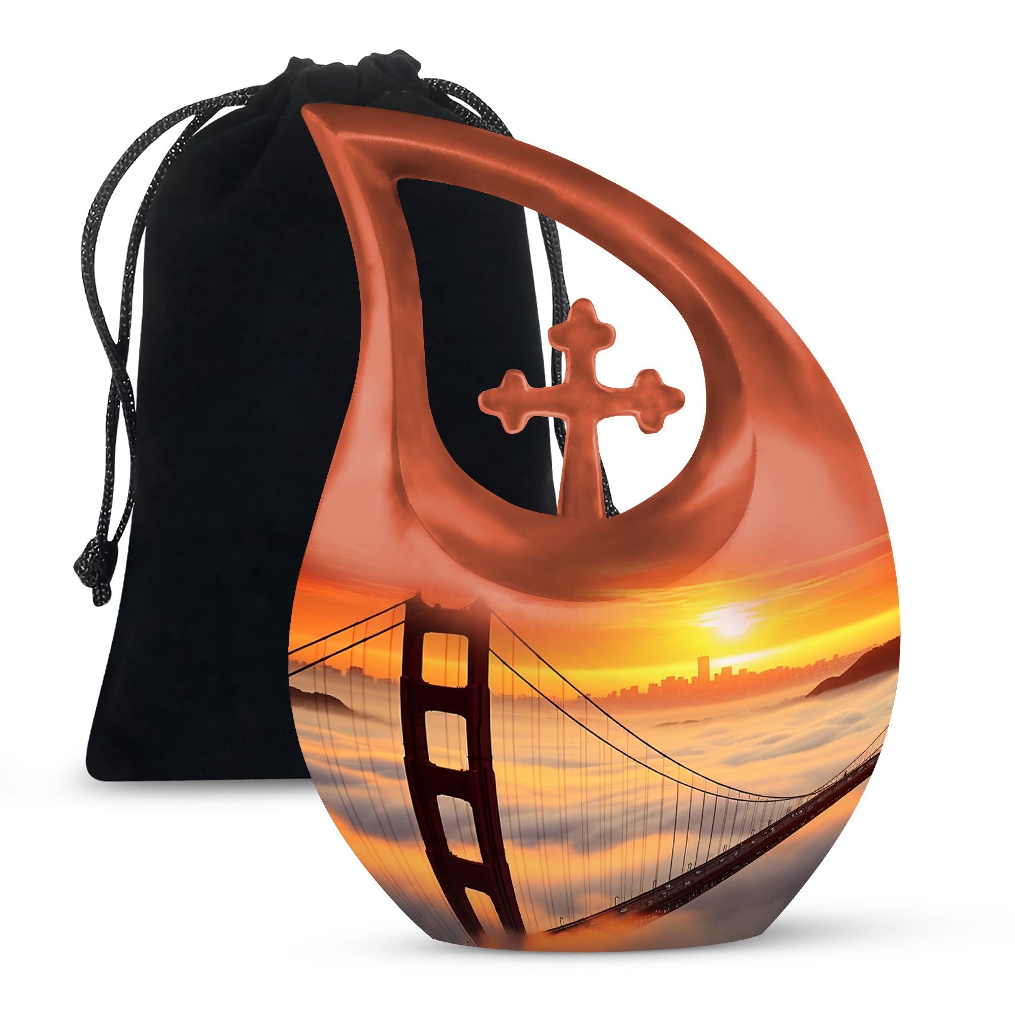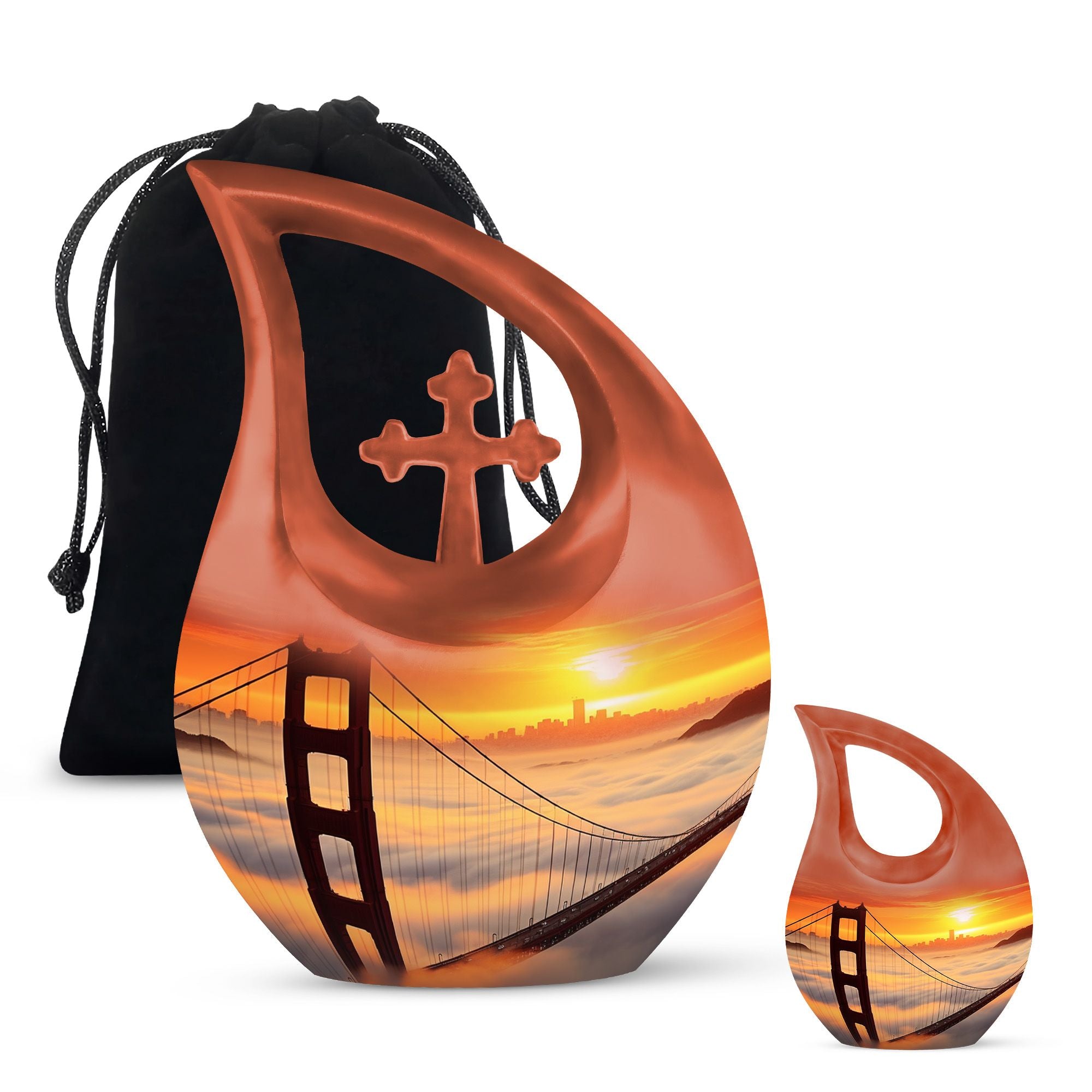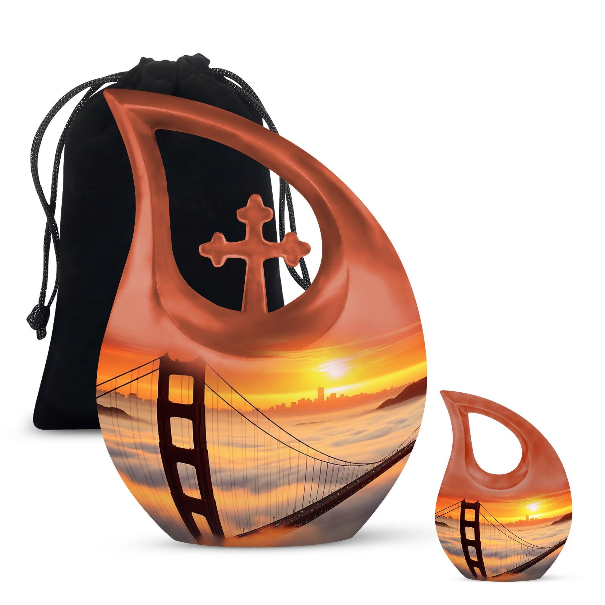 Honor the cherished memory of your loved ones with the Golden Gate Bridge Urn, an exquisite piece from our Small Cremation Urns collection. Crafted from high-quality aluminium, it ensures durability and longevity, while the stunning Cross Drop design adds a touch of elegant simplicity. This Large Urn measures 10 inches in height and has a weight of 3.3 pounds, offering a capacity of 200 cubic inches that comfortably holds the ashes. Enhance the sentiment with our customization option - personalize the urn with your loved one's engraved names, adding a unique, intimate touch to the memorial. Along with the urn, the package includes a soft velvet pouch designed for secure containment of ashes. Whether you're searching for affordable funeral urns or unique personalized urns, the Golden Gate Bridge Urn meets your needs with its premium build, thoughtful functionality, and delicate aesthetic. Ideal for those seeking small urns for human ashes or funeral urns for ashes, this piece serves as an enduring tribute to your loved one's life.