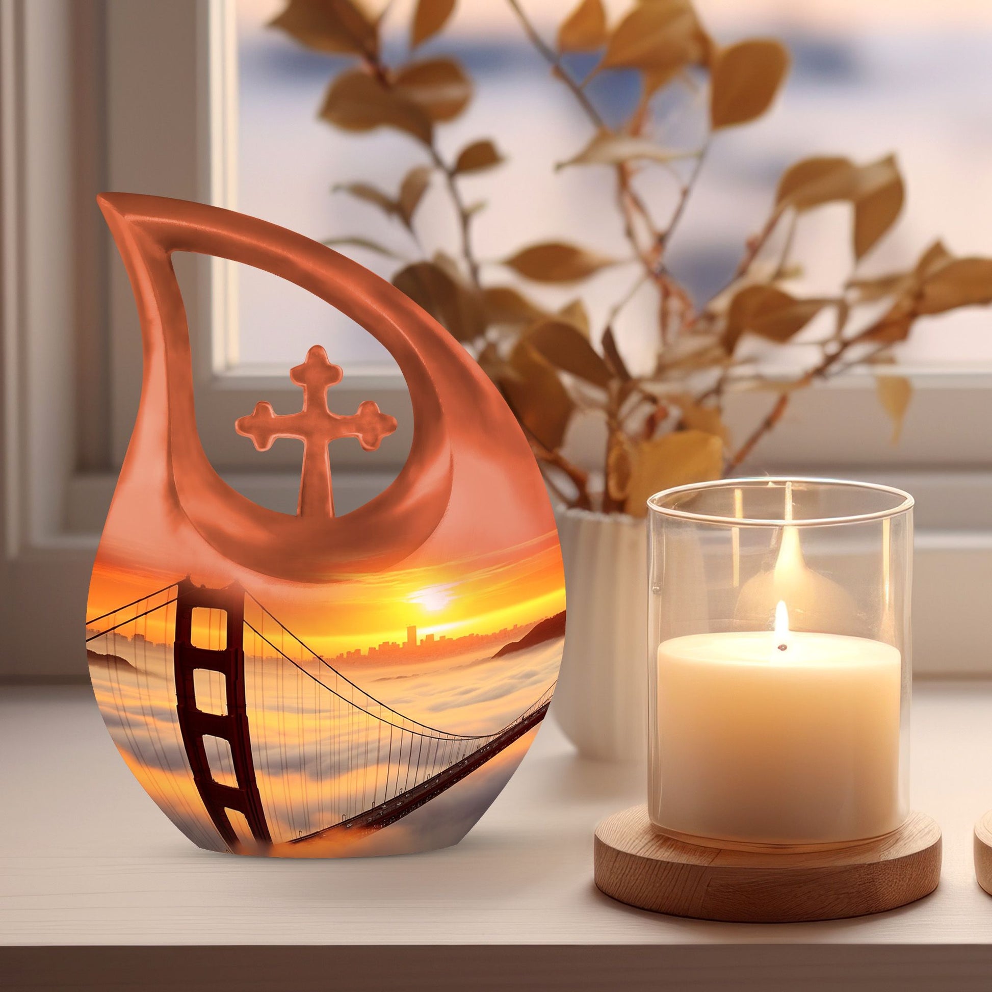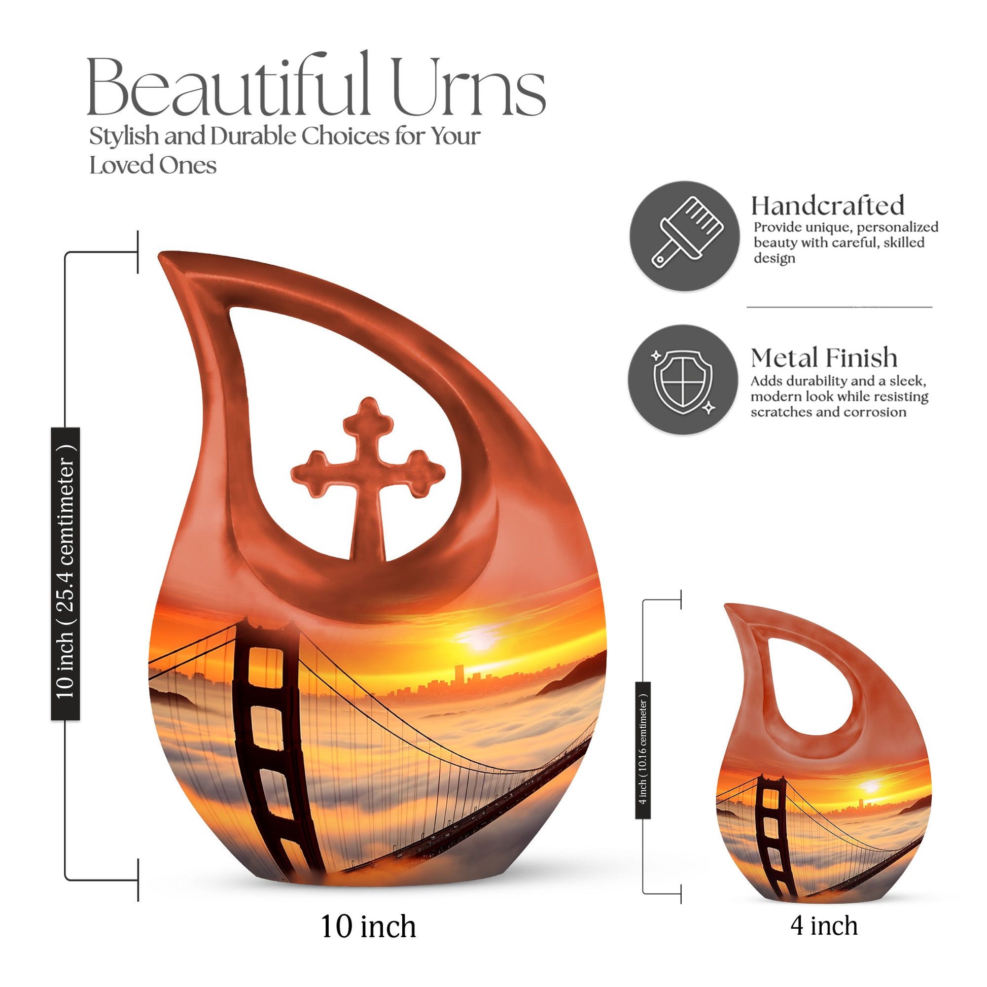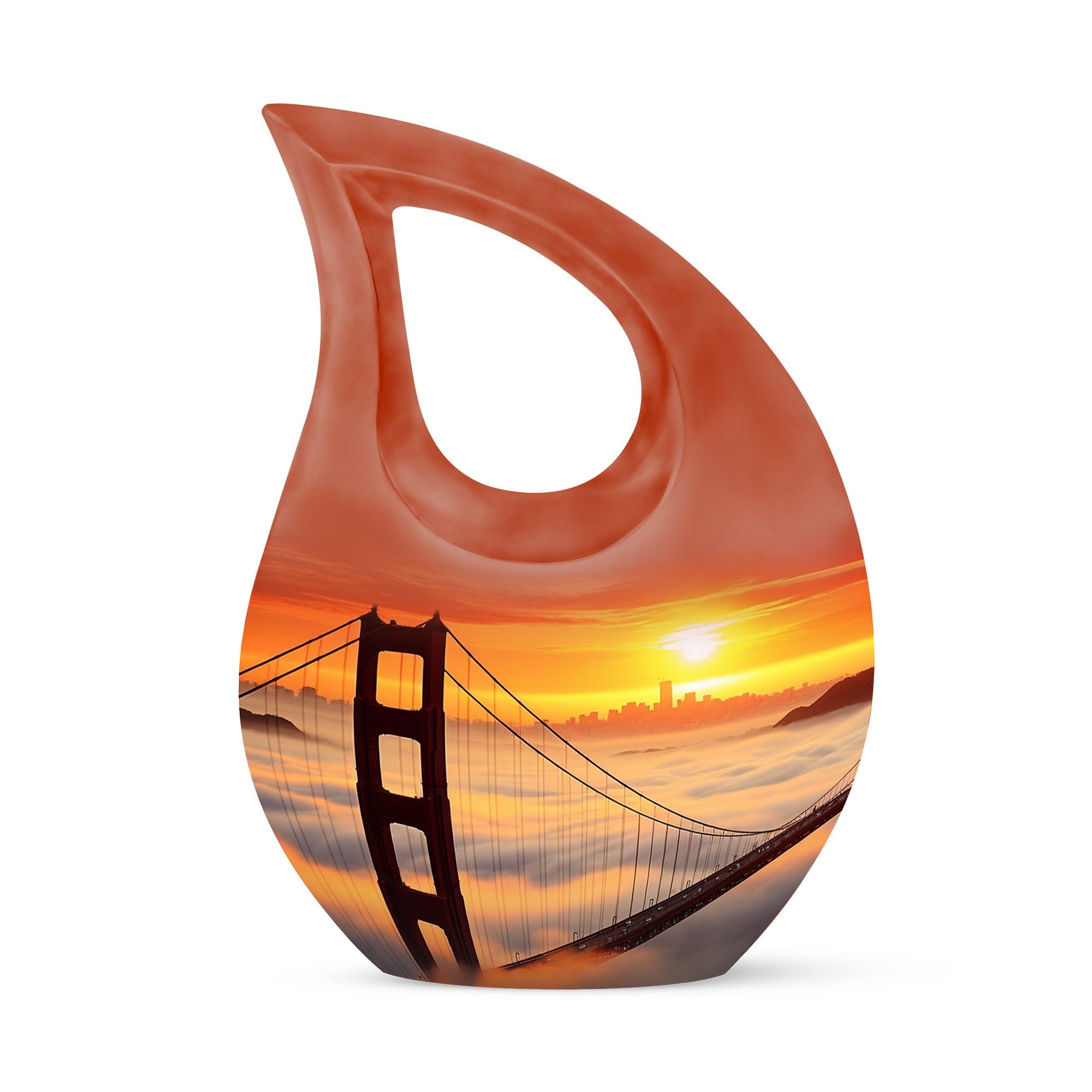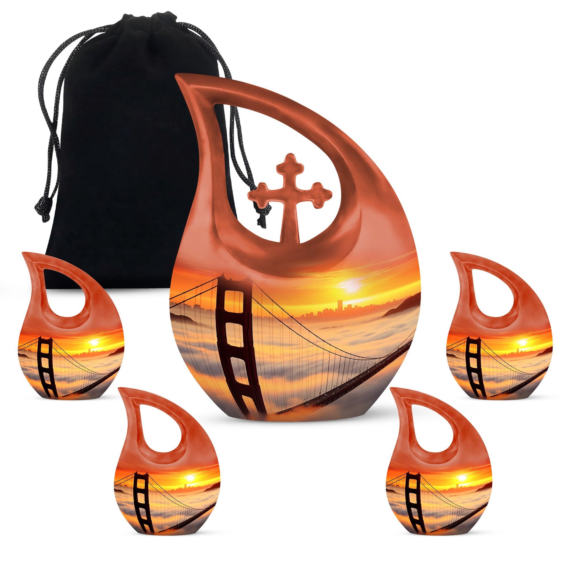 Honor the cherished memory of your loved ones with the Golden Gate Bridge Urn, an exquisite piece from our Small Cremation Urns collection. Crafted from high-quality aluminium, it ensures durability and longevity, while the stunning Cross Drop design adds a touch of elegant simplicity. This Large Urn measures 10 inches in height and has a weight of 3.3 pounds, offering a capacity of 200 cubic inches that comfortably holds the ashes. Enhance the sentiment with our customization option - personalize the urn with your loved one's engraved names, adding a unique, intimate touch to the memorial. Along with the urn, the package includes a soft velvet pouch designed for secure containment of ashes. Whether you're searching for affordable funeral urns or unique personalized urns, the Golden Gate Bridge Urn meets your needs with its premium build, thoughtful functionality, and delicate aesthetic. Ideal for those seeking small urns for human ashes or funeral urns for ashes, this piece serves as an enduring tribute to your loved one's life.