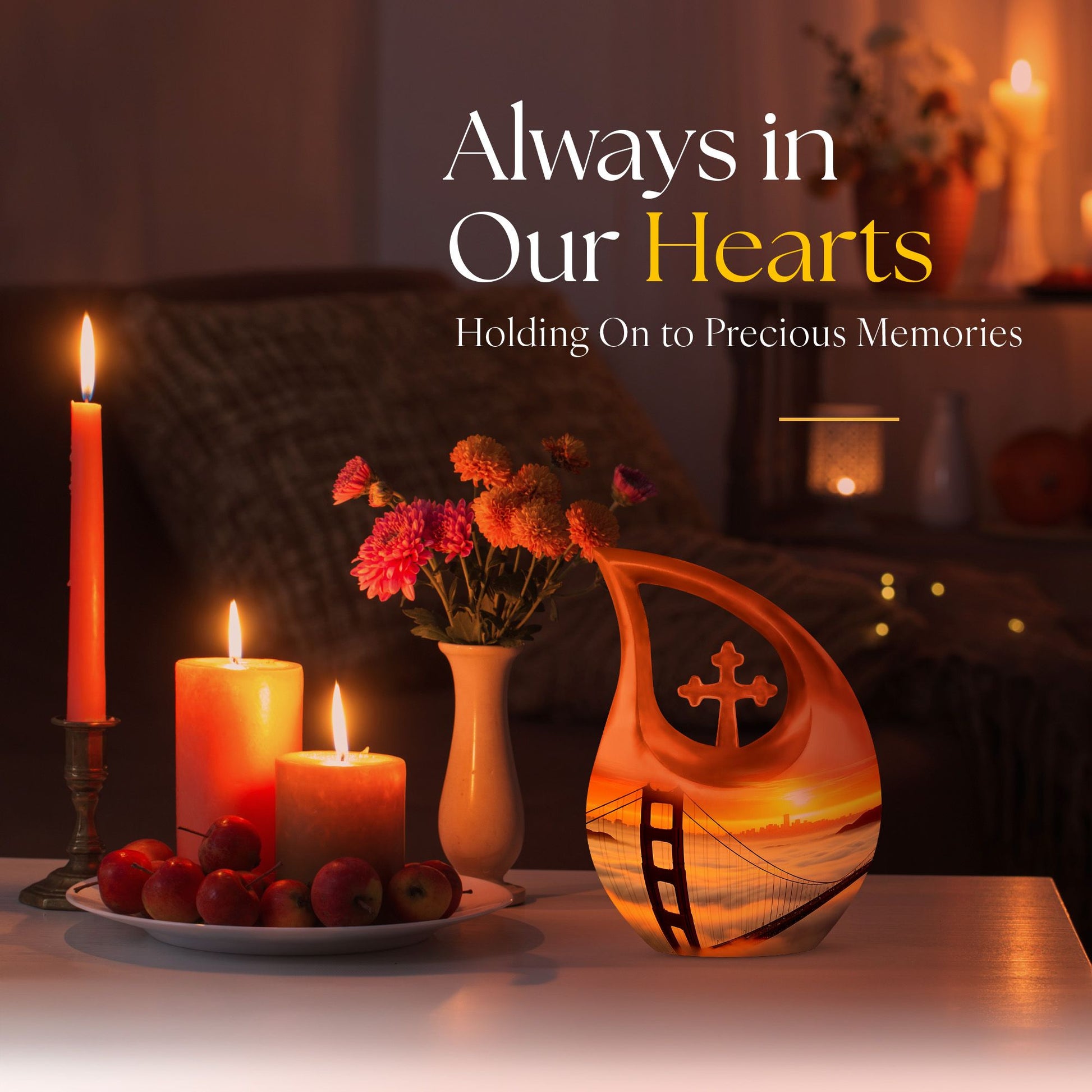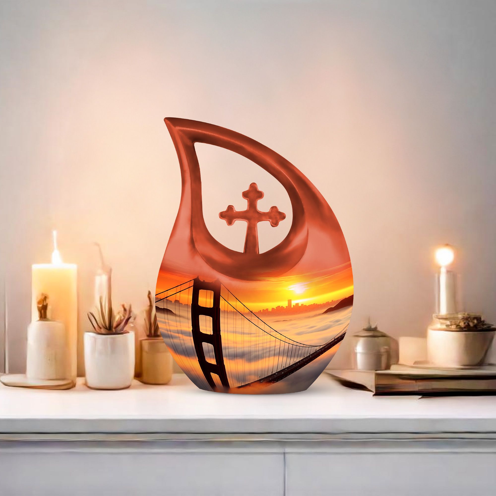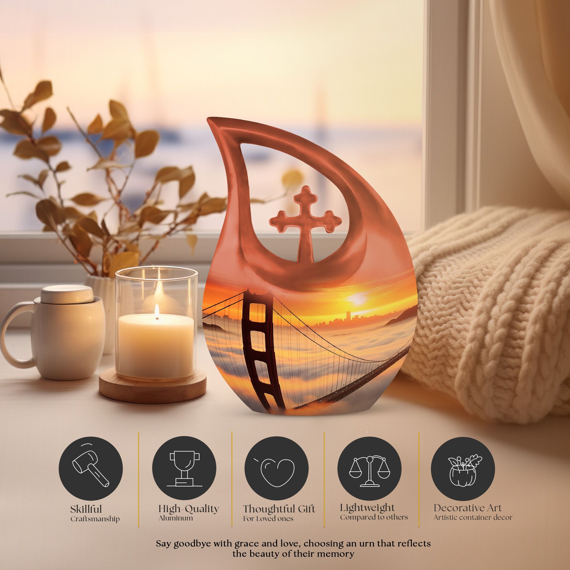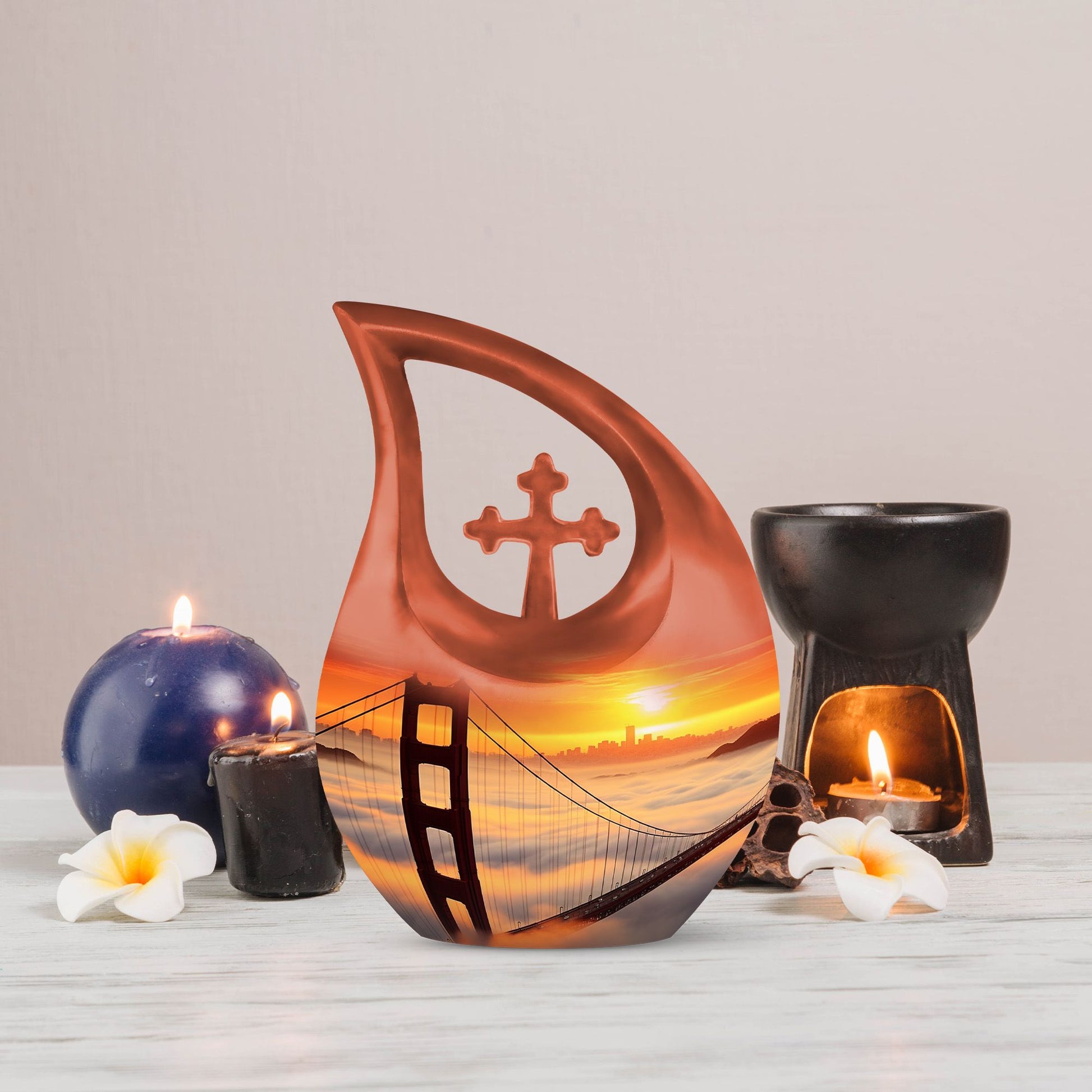 Honor the cherished memory of your loved ones with the Golden Gate Bridge Urn, an exquisite piece from our Small Cremation Urns collection. Crafted from high-quality aluminium, it ensures durability and longevity, while the stunning Cross Drop design adds a touch of elegant simplicity. This Large Urn measures 10 inches in height and has a weight of 3.3 pounds, offering a capacity of 200 cubic inches that comfortably holds the ashes. Enhance the sentiment with our customization option - personalize the urn with your loved one's engraved names, adding a unique, intimate touch to the memorial. Along with the urn, the package includes a soft velvet pouch designed for secure containment of ashes. Whether you're searching for affordable funeral urns or unique personalized urns, the Golden Gate Bridge Urn meets your needs with its premium build, thoughtful functionality, and delicate aesthetic. Ideal for those seeking small urns for human ashes or funeral urns for ashes, this piece serves as an enduring tribute to your loved one's life.
