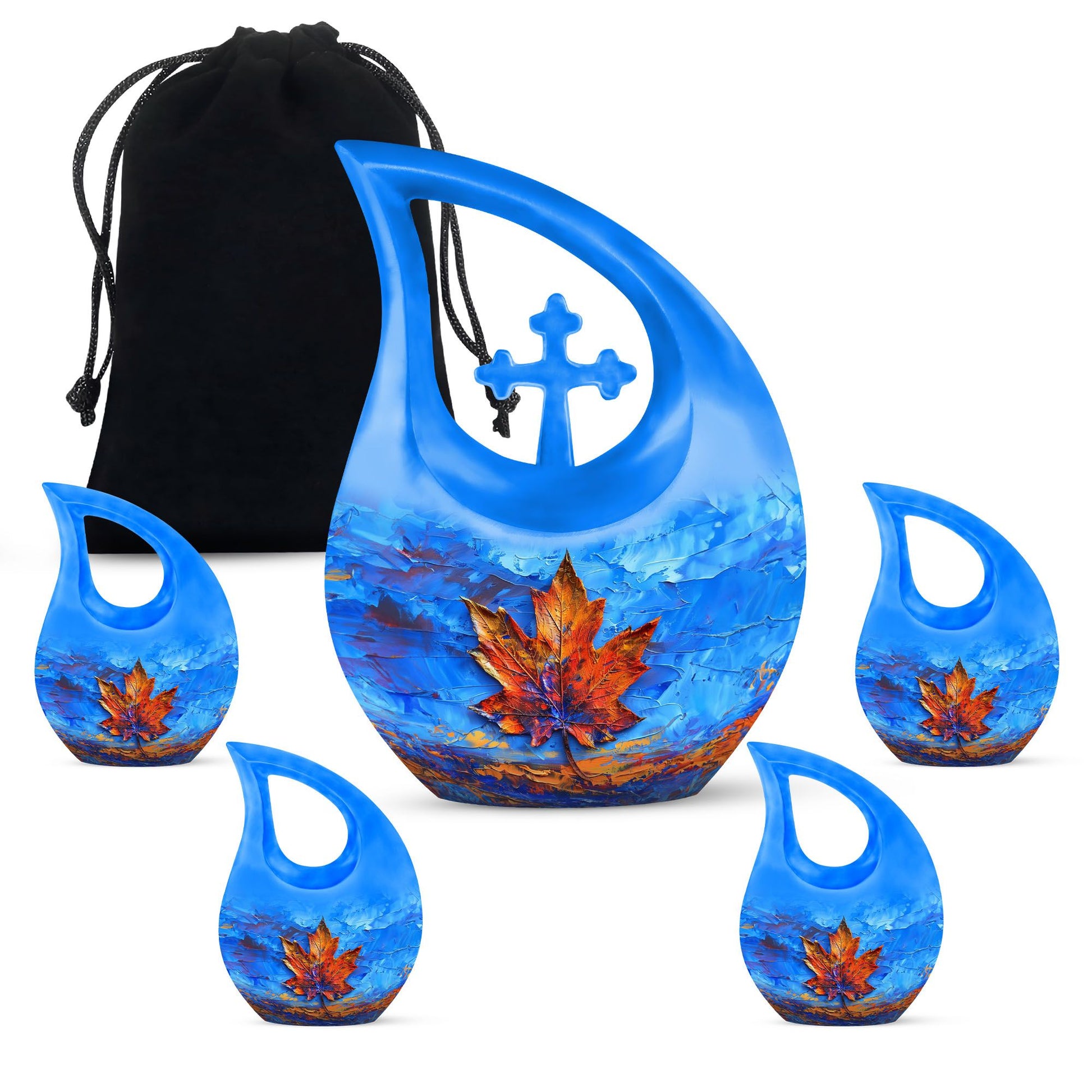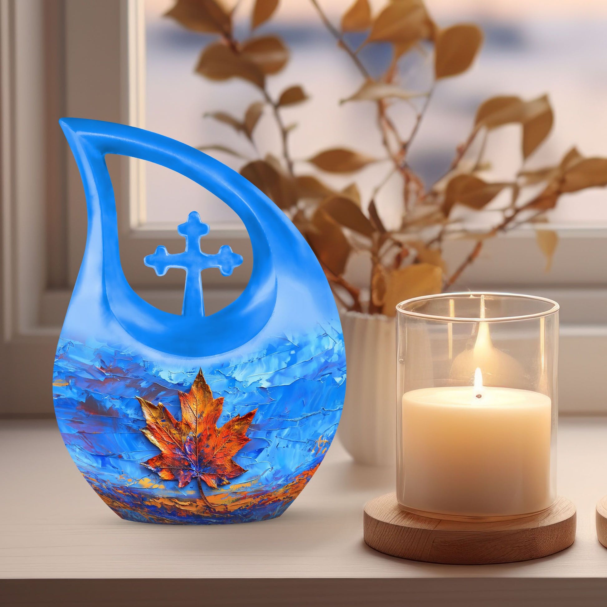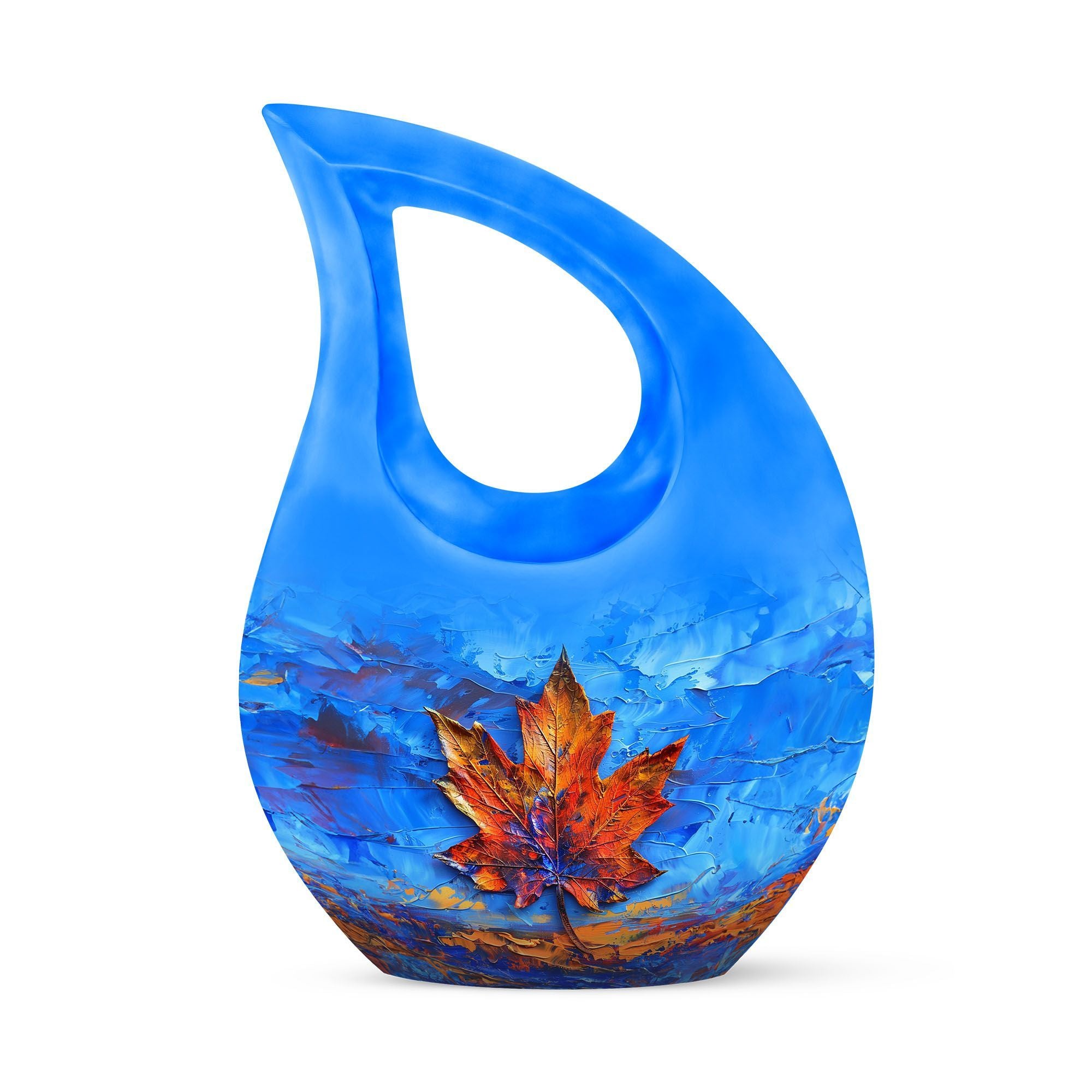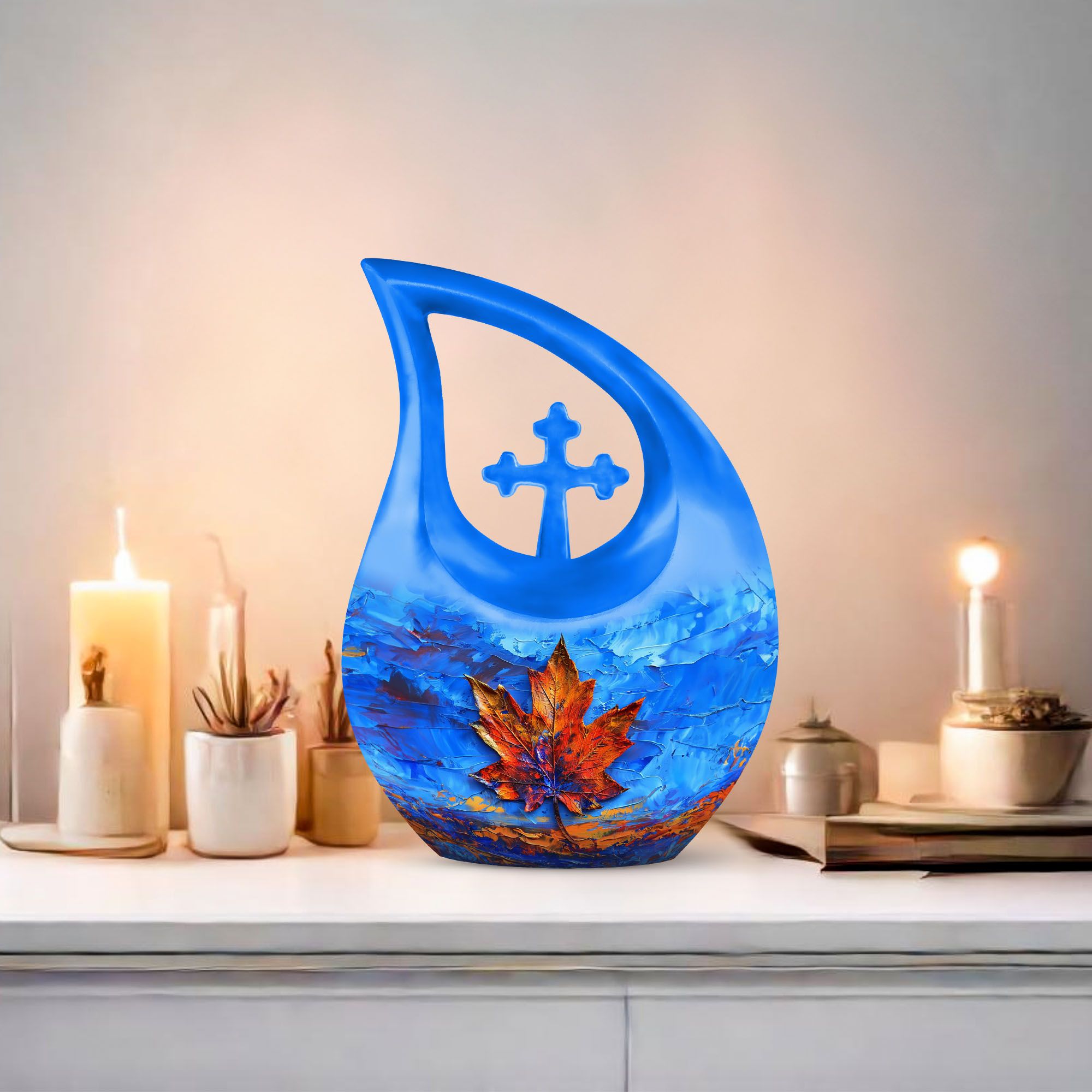 Preserve the memory of your loved one in a dignified way with our elegantly designed Mapple Leaf Urn. This large-sized urn, crafted from enduring aluminium, sports the symbolic cross drop model on a mapple leaf theme. It stands majestically tall at 10 inches and has a set weight of 3.3 pounds. Intelligently shaped, it comfortably accommodates upto 200 cubic inches of ashes. Equipping this memorial urn with your personal touch, it permits customization with engraved names, converting it into a heartfelt monument. The package furnishes a classy velvet pouch for the containment of ashes, further enhancing its value. Whether you're seeking personalized urns for adults or medium urns for human ashes, this Mapple Leaf Urn unites sumptuousness and sentiment, perfect to pay tribute to a cherished life. Note: This product comfortably fits into most common garden urn spaces, making it versatile for both indoor and outdoor commemorations.
