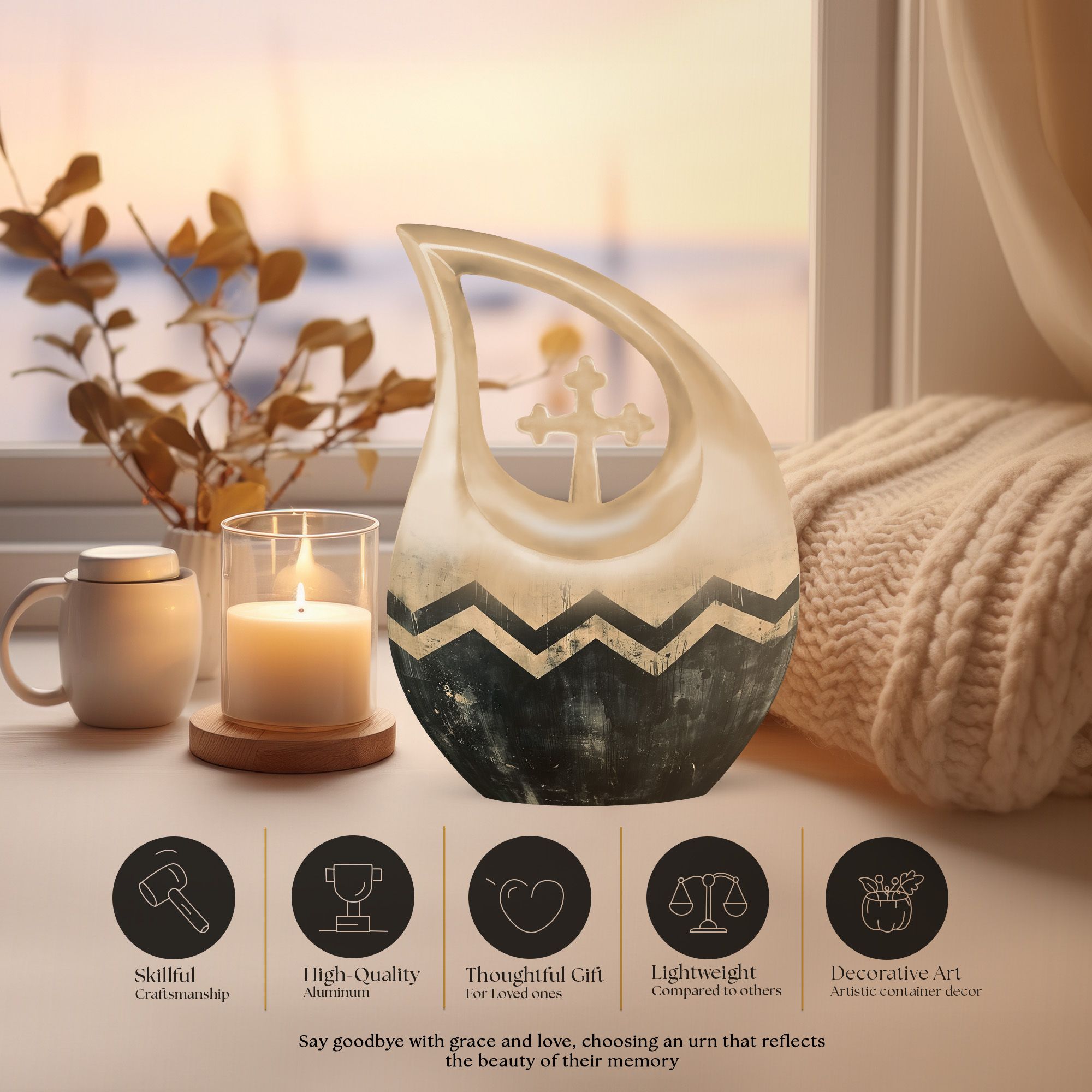 Crafted from durable aluminium, this urn features a refined pattern that reflects peace and continuity. Its sturdy construction and polished finish make it an excellent choice for those needing a large urn for ashes for women or a large urn for human ashes that complements any memorial setting. The generous capacity and secure lid ensure long-lasting protection, making it ideal for home display, burial, or niche placement.