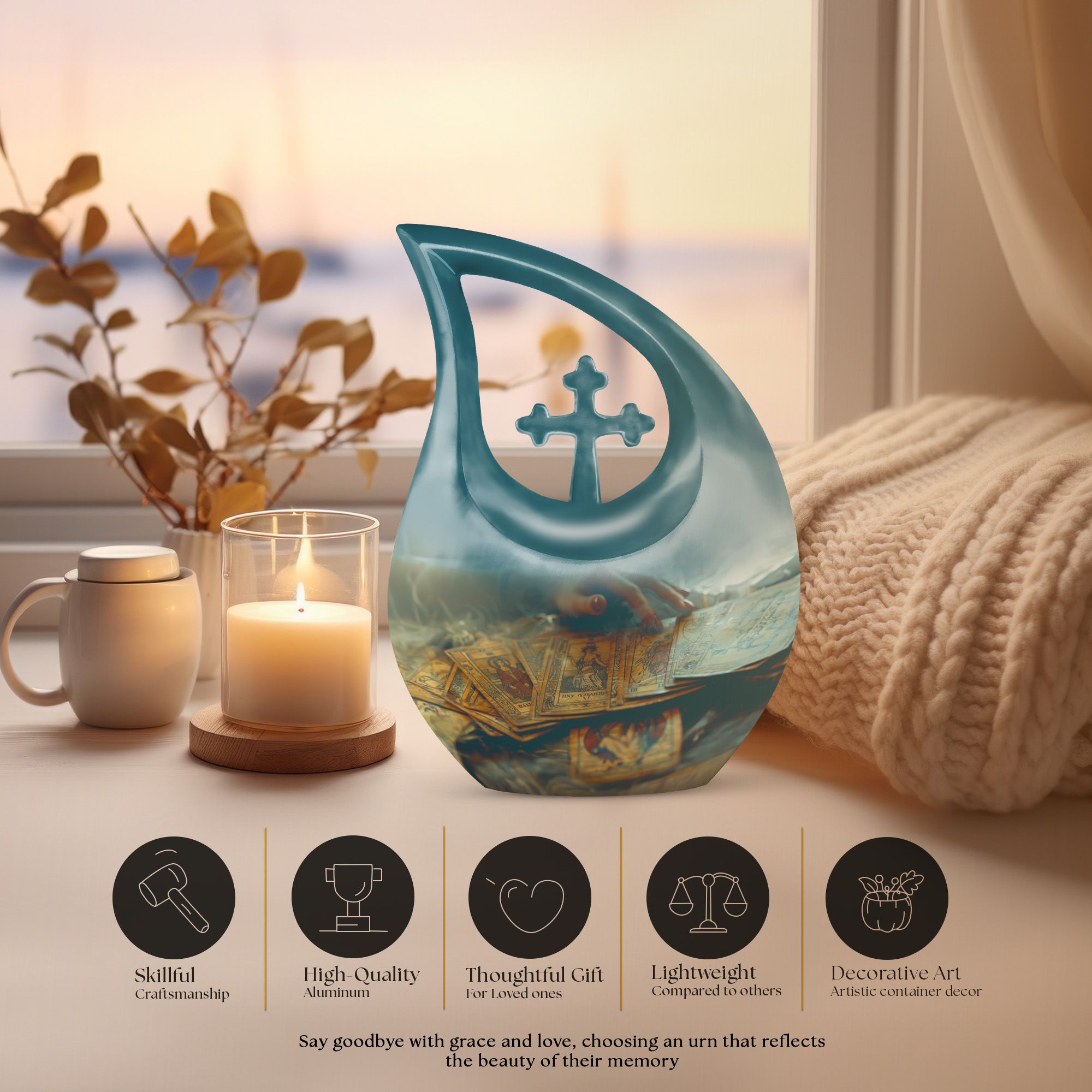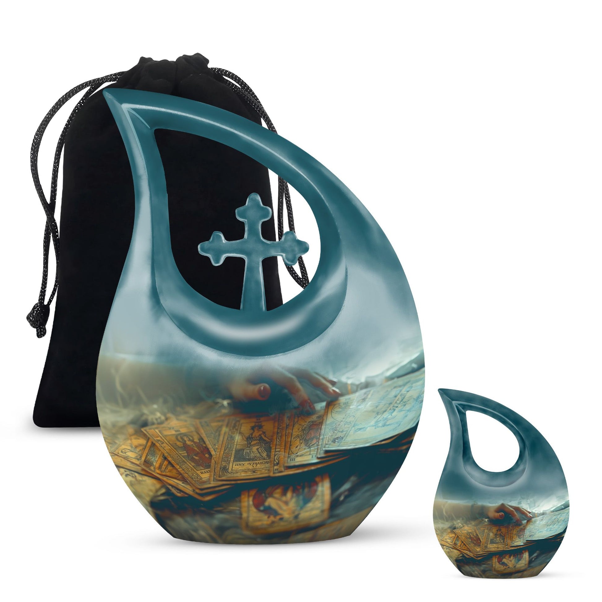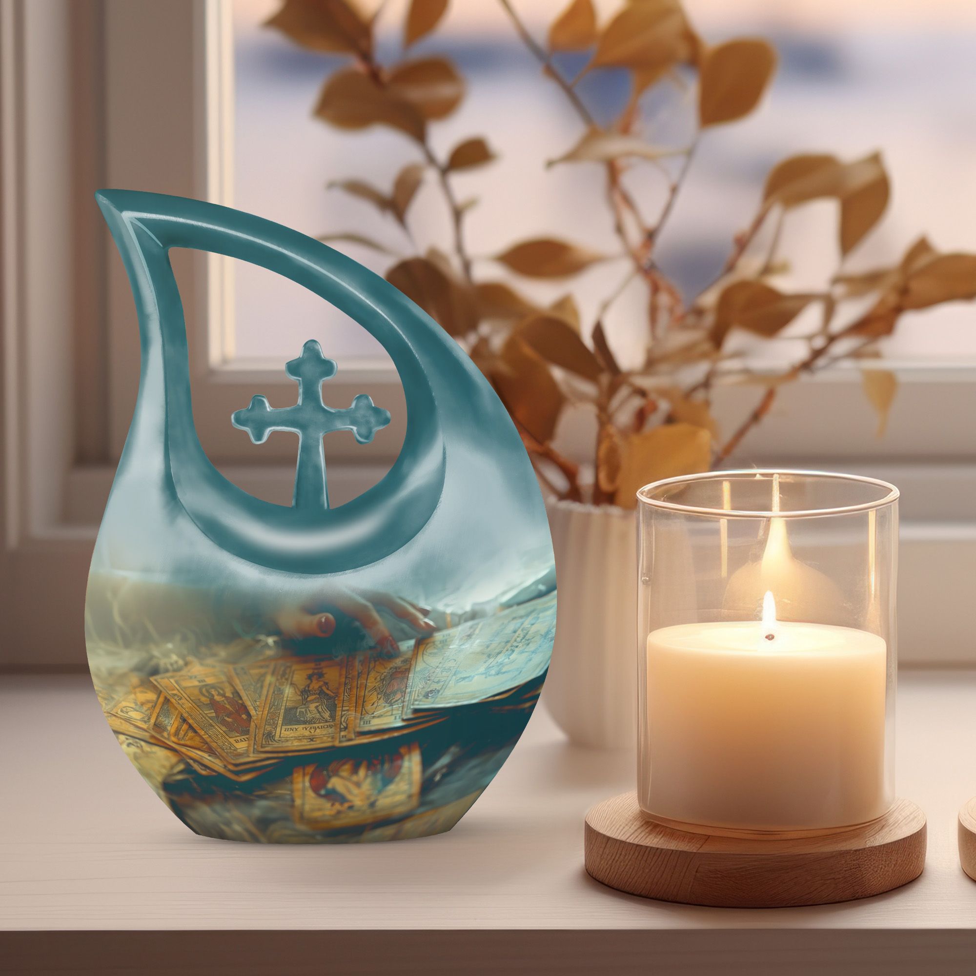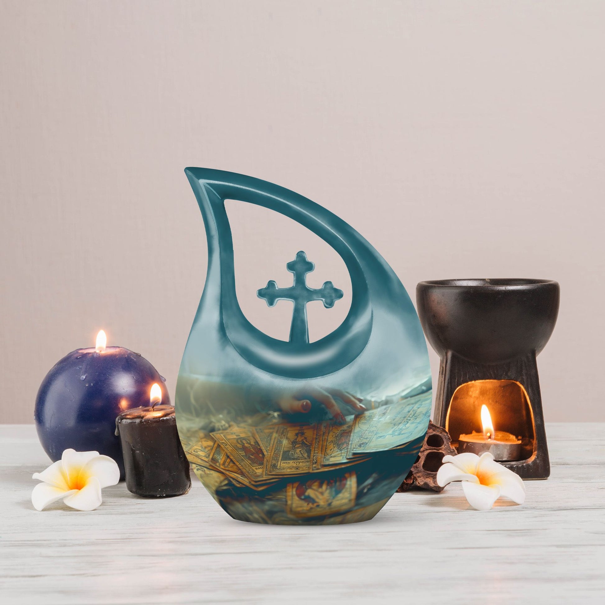 Exude tranquility and serenity with this Tarot urn, a perfect choice for memorial urns. Crafted from durable aluminium, this 10-inch large urn weighing 3.3 pounds, boasts a unique Cross Drop design that adds a spiritual undertone to its appearance. It has a capacity of 200 cubic inches, ample enough to secure the ashes of your loved ones. Customization is a beautiful touch that we offer. Personalize your Tarot Urn by engraving the names as a timeless tribute to the departed soul. This purchase also includes a soft velvet pouch for tasteful containment of the ashes, adding to the respectful handling of the said remains. Whether you're searching for 'Best Cremation Urn,' 'Companion Urns For 2 Adults,' or 'Burial Urns For Sale,' this Tarot Urn ticks all boxes, offering a tasteful blend of modern aesthetics and tradition.