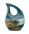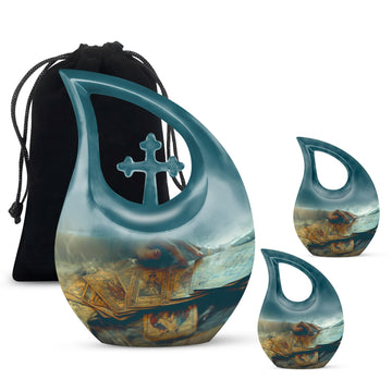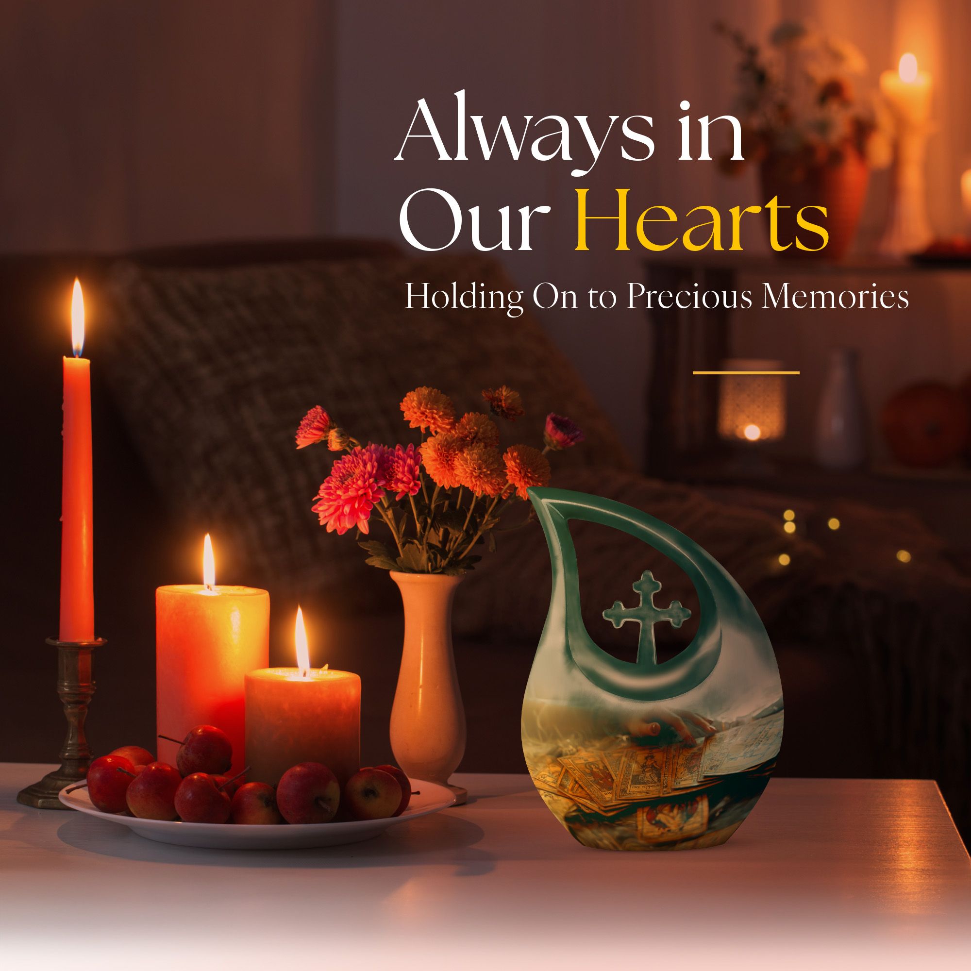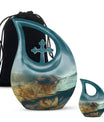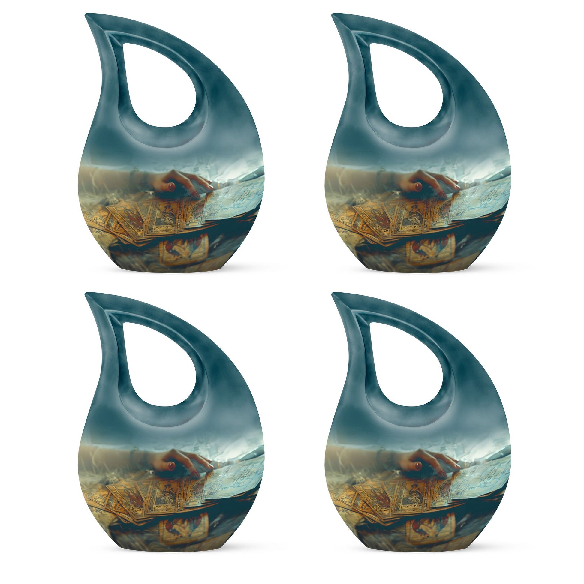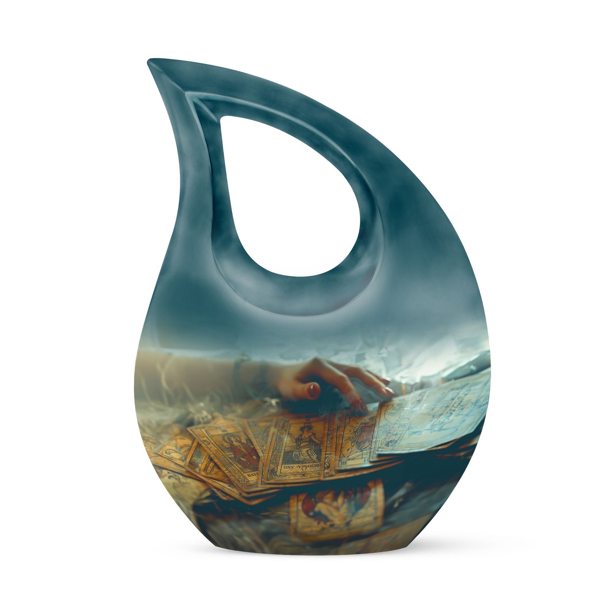 Exude tranquility and serenity with this Tarot urn, a perfect choice for memorial urns. Crafted from durable aluminium, this 10-inch large urn weighing 3.3 pounds, boasts a unique Cross Drop design that adds a spiritual undertone to its appearance. It has a capacity of 200 cubic inches, ample enough to secure the ashes of your loved ones. Customization is a beautiful touch that we offer. Personalize your Tarot Urn by engraving the names as a timeless tribute to the departed soul. This purchase also includes a soft velvet pouch for tasteful containment of the ashes, adding to the respectful handling of the said remains. Whether you're searching for 'Best Cremation Urn,' 'Companion Urns For 2 Adults,' or 'Burial Urns For Sale,' this Tarot Urn ticks all boxes, offering a tasteful blend of modern aesthetics and tradition.