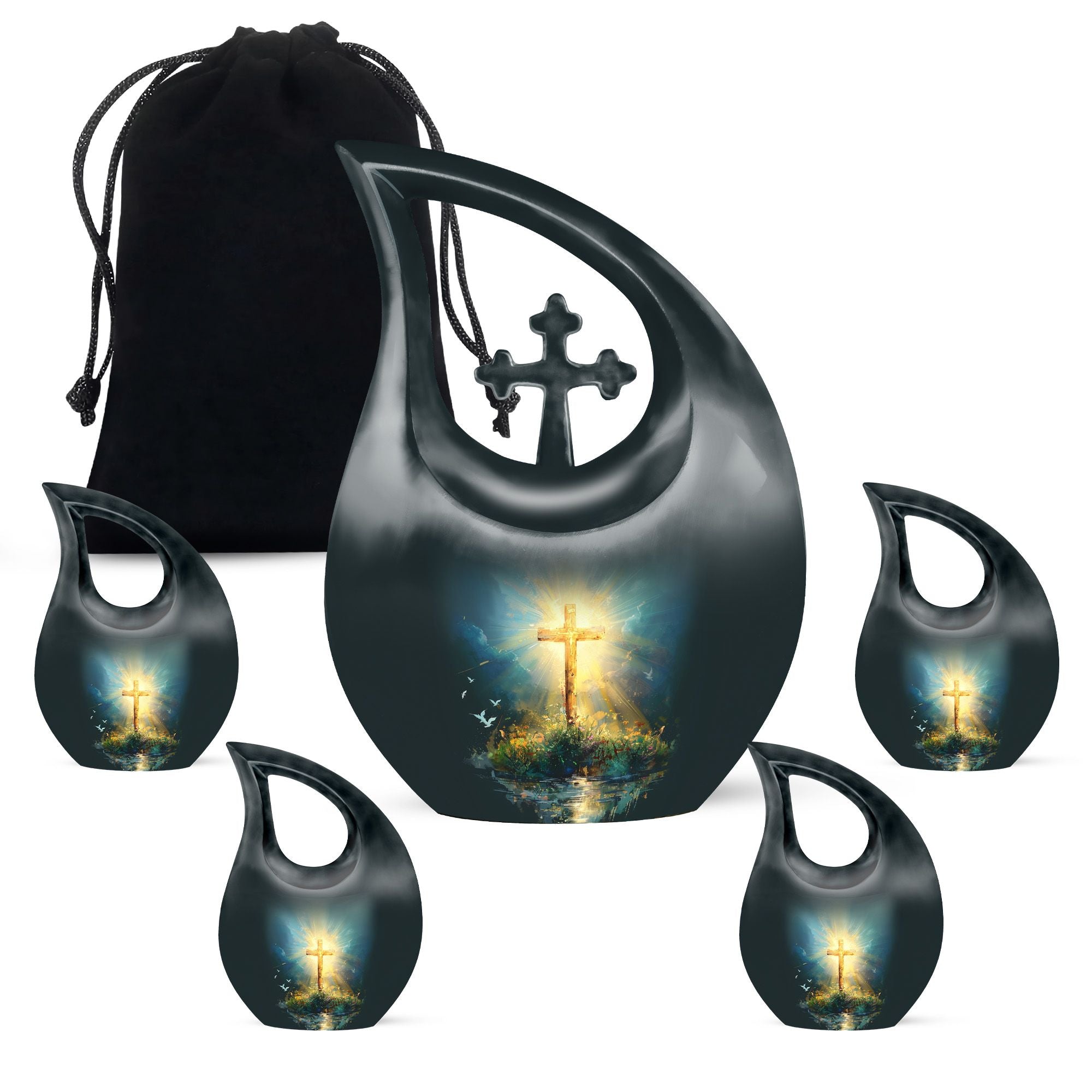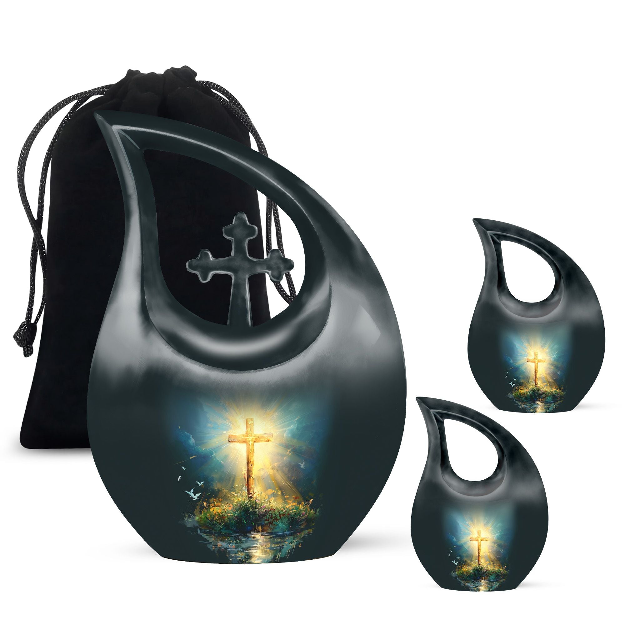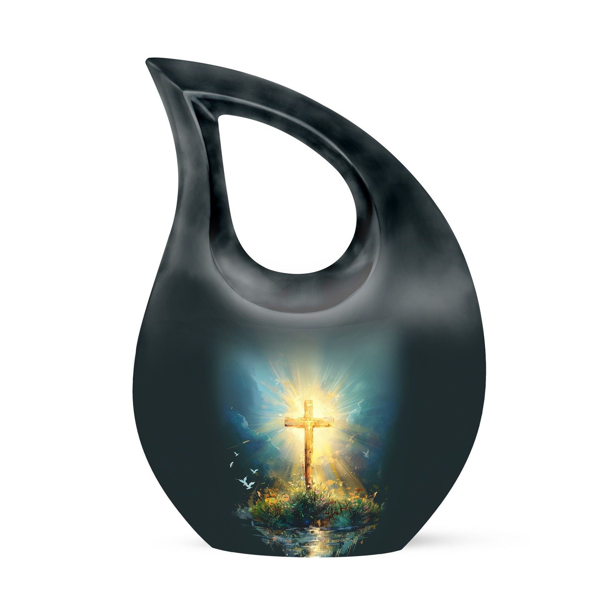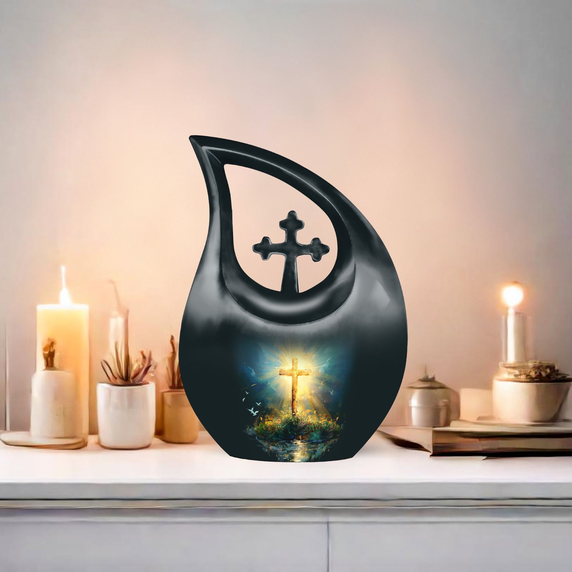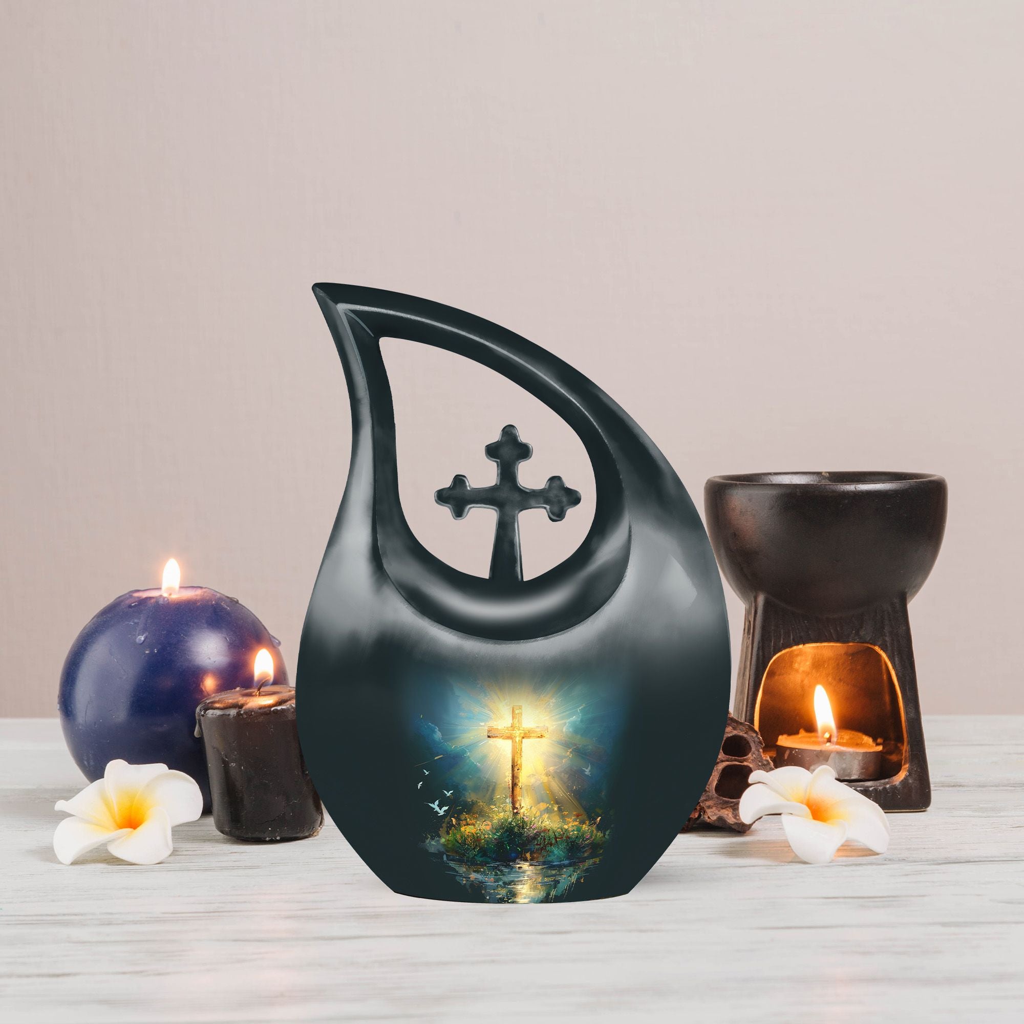 Seize the opportunity to honor the life of your loved one with our 10-inch Large Cross Urn. This unique, aluminium built urn showcases a symbolic theme with its classy 'Cross Drop' pattern. With a substantial capacity of 200 cubic inches, this urn facilitates secure containment and preservation of ashes. We want to ensure that your memories stay forever, so every urn comes with a delicate, velvet pouch for the safekeeping of these precious ashes. Sturdy, weighing at 3.3 pounds, and acing the quality standards, it appeals to adults and seniors looking for 'memorial urns'. It proudly stands at an imposing 10 inches height adding to its noticeable presence. Made to stand the test of time, this 'Garden Urn For Ashes' even allows personalization where you can immortalize the names of your beloved. Enter the realm of 'Personalized Urns For Ashes' and pick the 'Best Urn For Ashes'. When words feel inadequate, honor your dear ones with these serene 'cremation urns' and 'burial urns'.