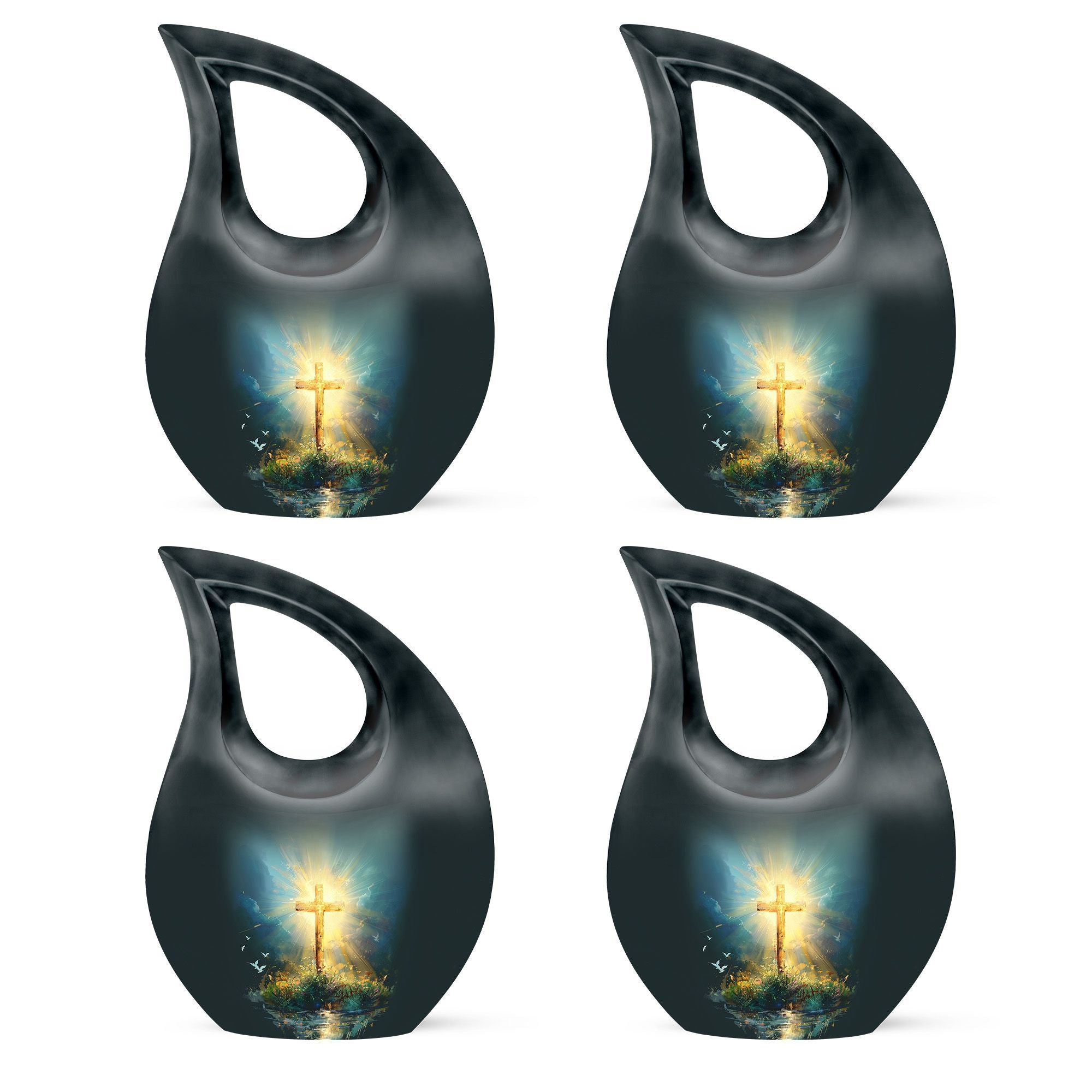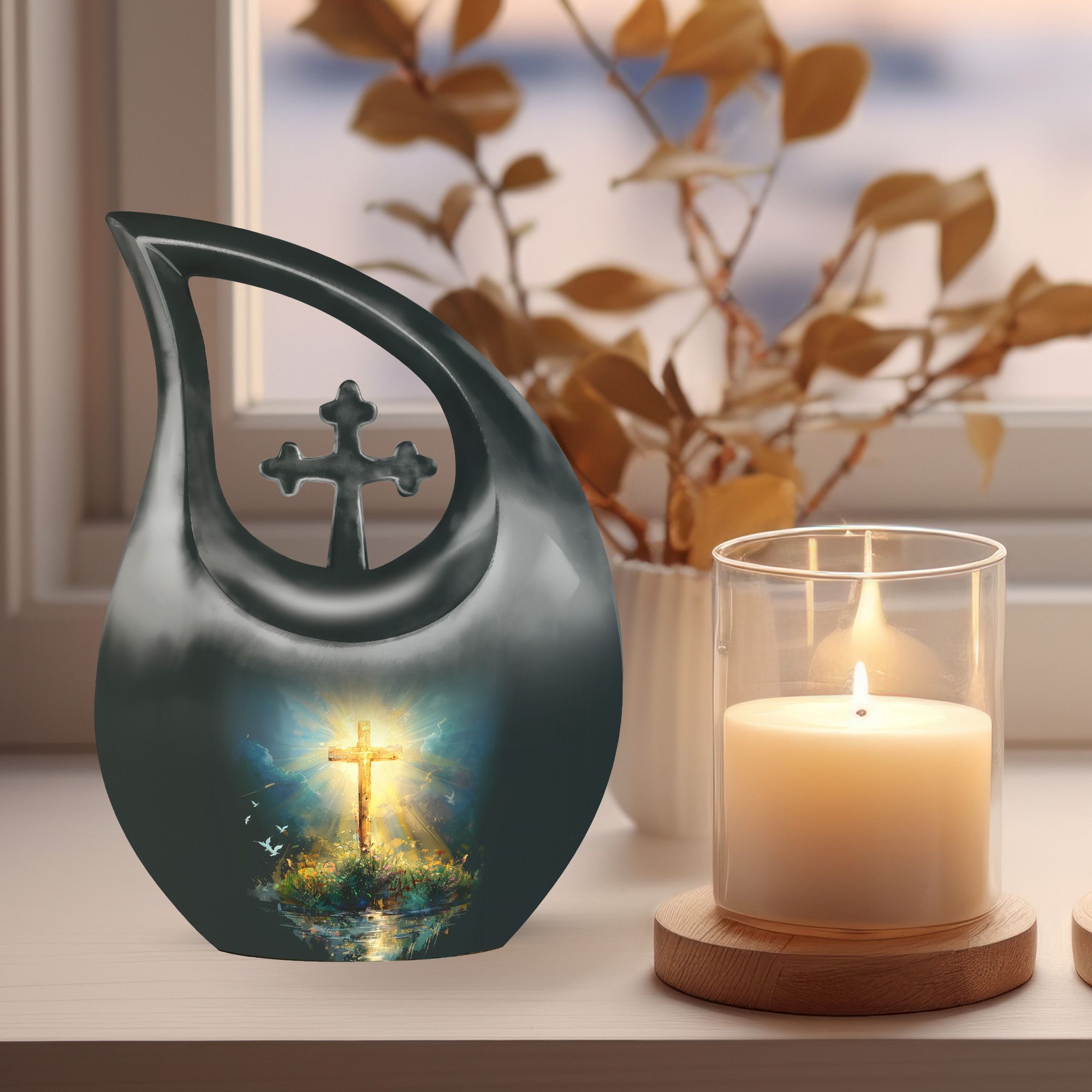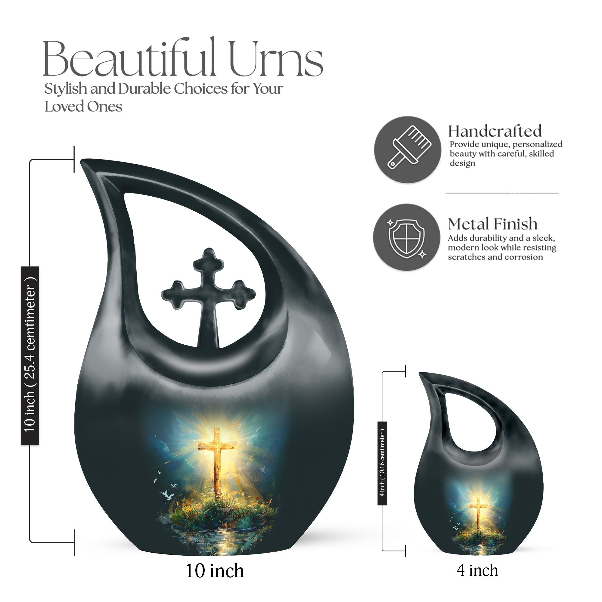 Seize the opportunity to honor the life of your loved one with our 10-inch Large Cross Urn. This unique, aluminium built urn showcases a symbolic theme with its classy 'Cross Drop' pattern. With a substantial capacity of 200 cubic inches, this urn facilitates secure containment and preservation of ashes. We want to ensure that your memories stay forever, so every urn comes with a delicate, velvet pouch for the safekeeping of these precious ashes. Sturdy, weighing at 3.3 pounds, and acing the quality standards, it appeals to adults and seniors looking for 'memorial urns'. It proudly stands at an imposing 10 inches height adding to its noticeable presence. Made to stand the test of time, this 'Garden Urn For Ashes' even allows personalization where you can immortalize the names of your beloved. Enter the realm of 'Personalized Urns For Ashes' and pick the 'Best Urn For Ashes'. When words feel inadequate, honor your dear ones with these serene 'cremation urns' and 'burial urns'.