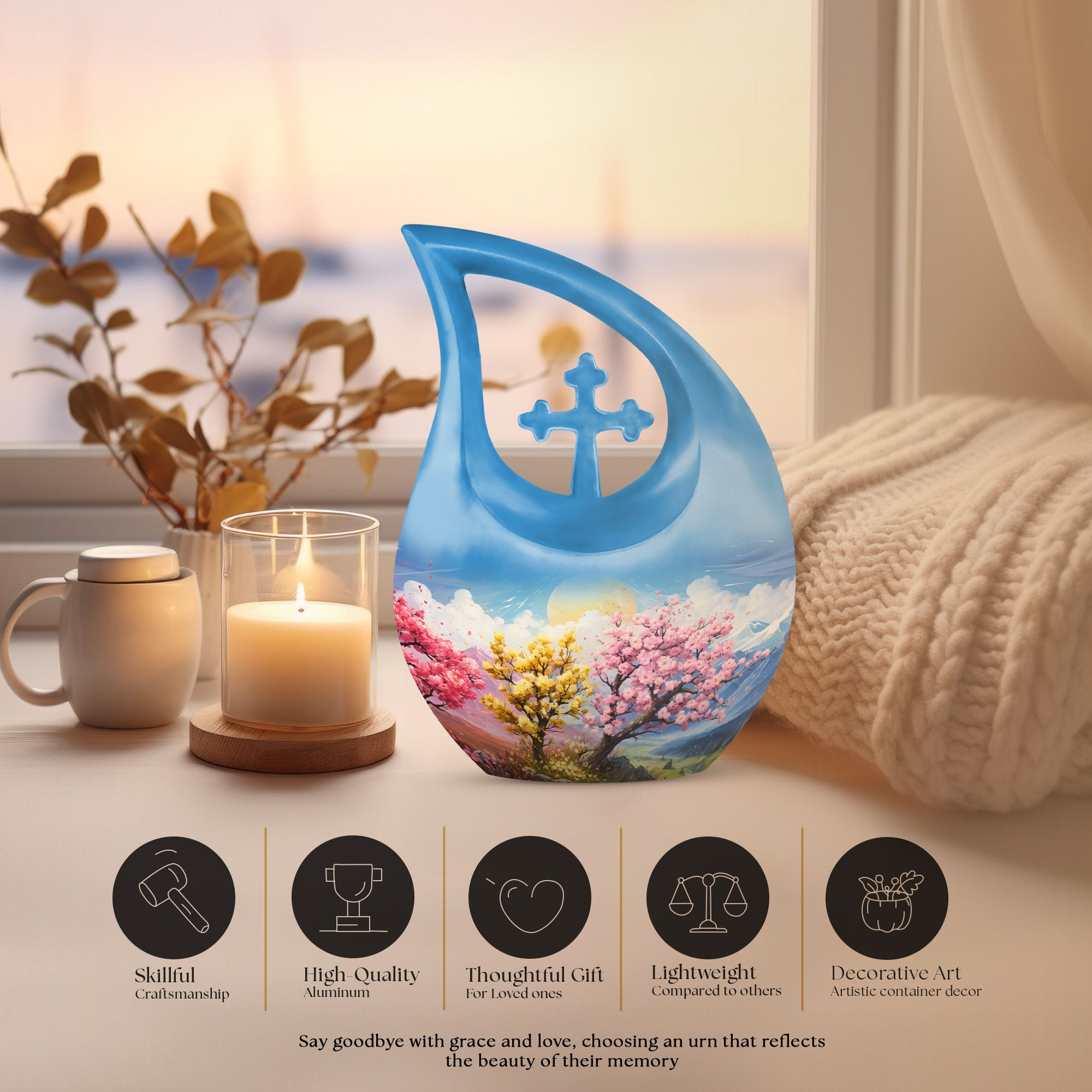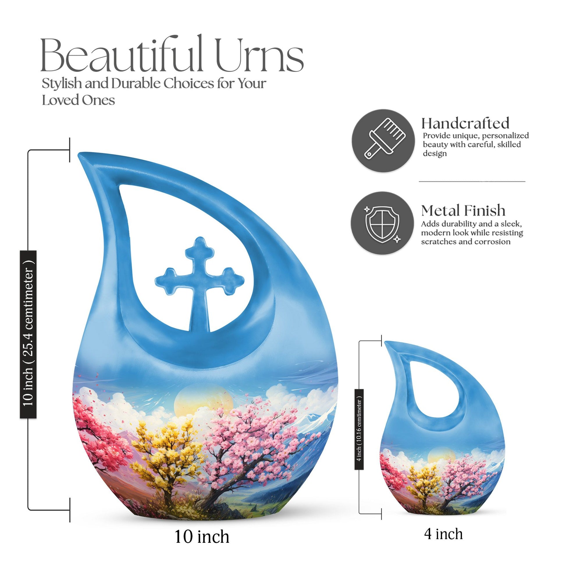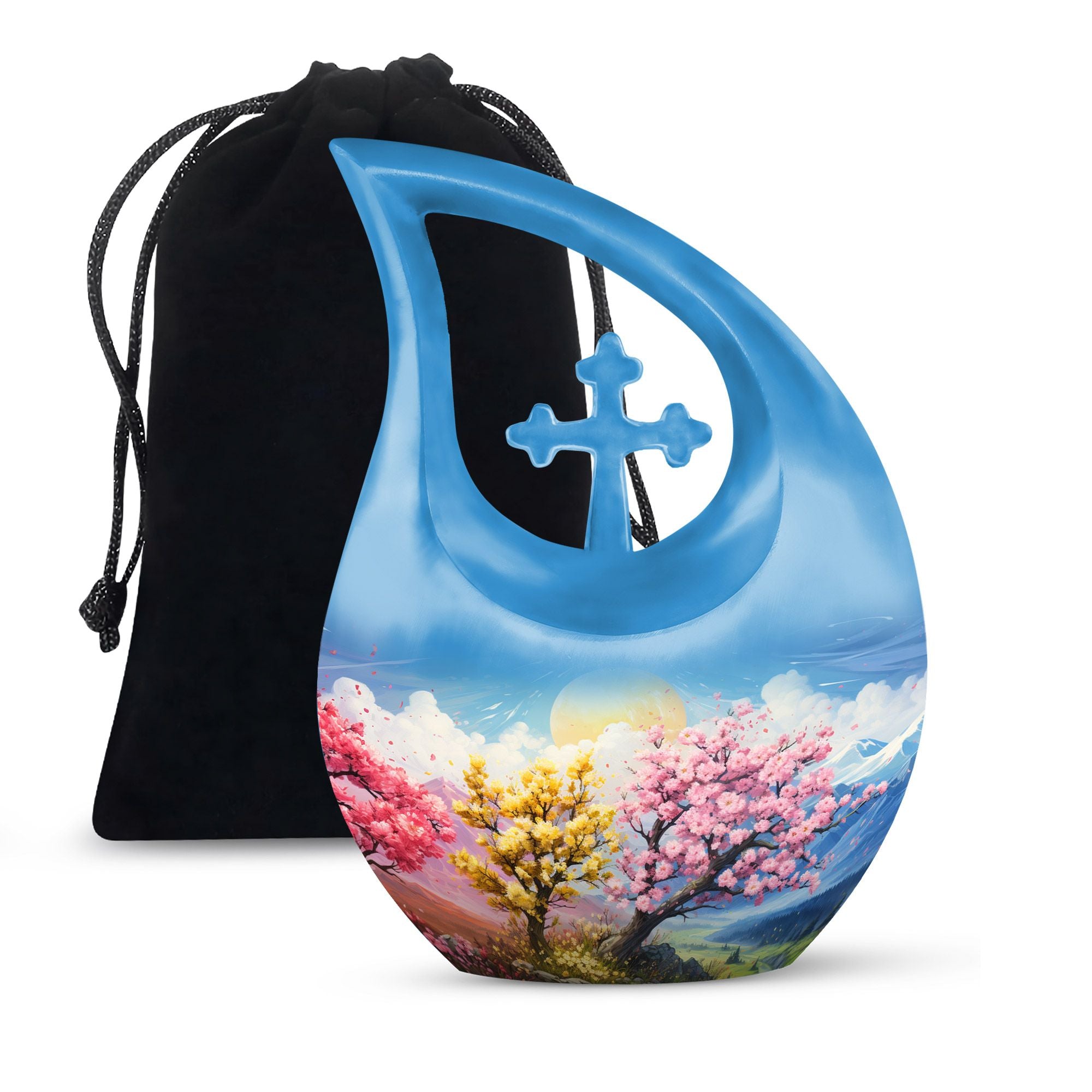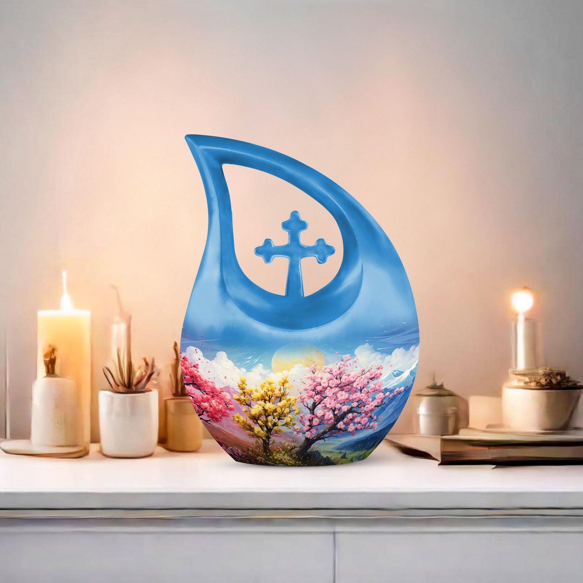 Encapsulate the serenity of the wilderness with our unique 'Cross Drop' Wilderness Urn. Sized at 10 inches, this substantial aluminium urn stands as an elegant tribute to the love you hold. Built to hold 200 cubic inches of ashes, this urn is specifically designed to accommodate the cremation remains of an adult male. The urn's weight of 3.3 pounds adds a tangible feeling of durability and permanence. The Wilderness Urn comes with a velvet pouch, ensuring a respectful containment for your loved ones' remains. You can even personalize this urn with engraved names, adding a touch of intimacy and ownership, enhancing its value as a cherished keepsake. It is a harmonious blend of utility and aesthetics, providing an affordable yet sophisticated alternative to traditional cremation monuments. This urn doesn't look like the everyday urn; it carries a unique wilderness theme, that subtly evokes a feeling of peaceful solitude. So, if you're in search of 'urns with love' or something a little different, our Wilderness Urn makes for a beautiful and fitting choice.