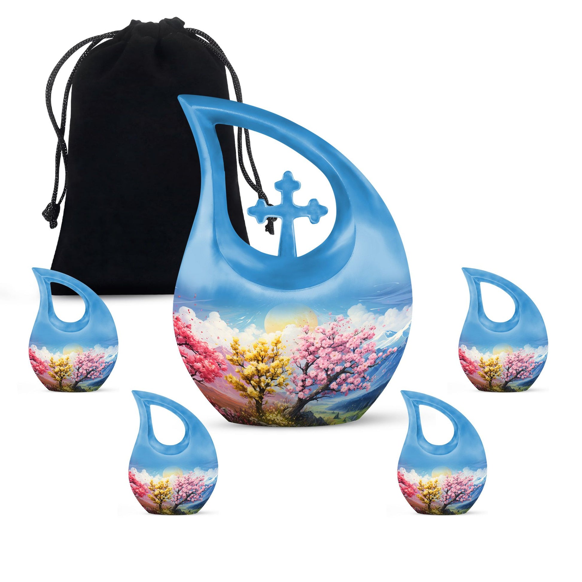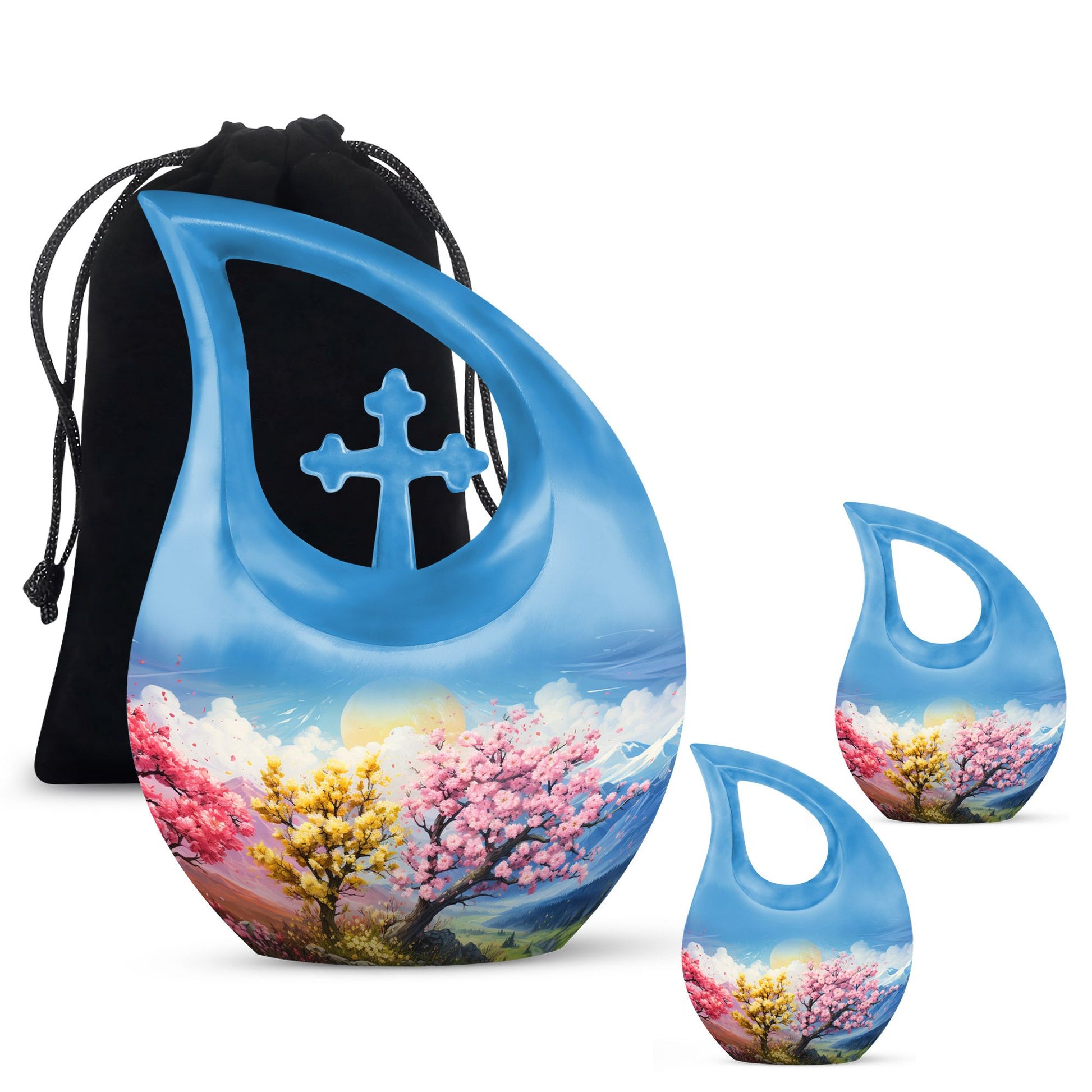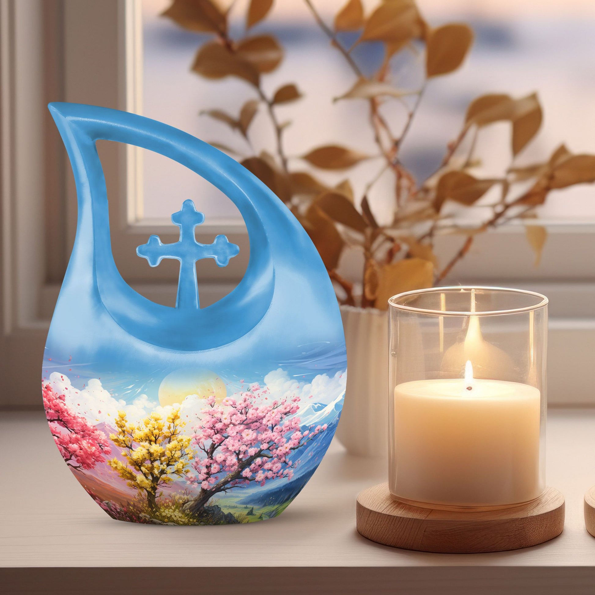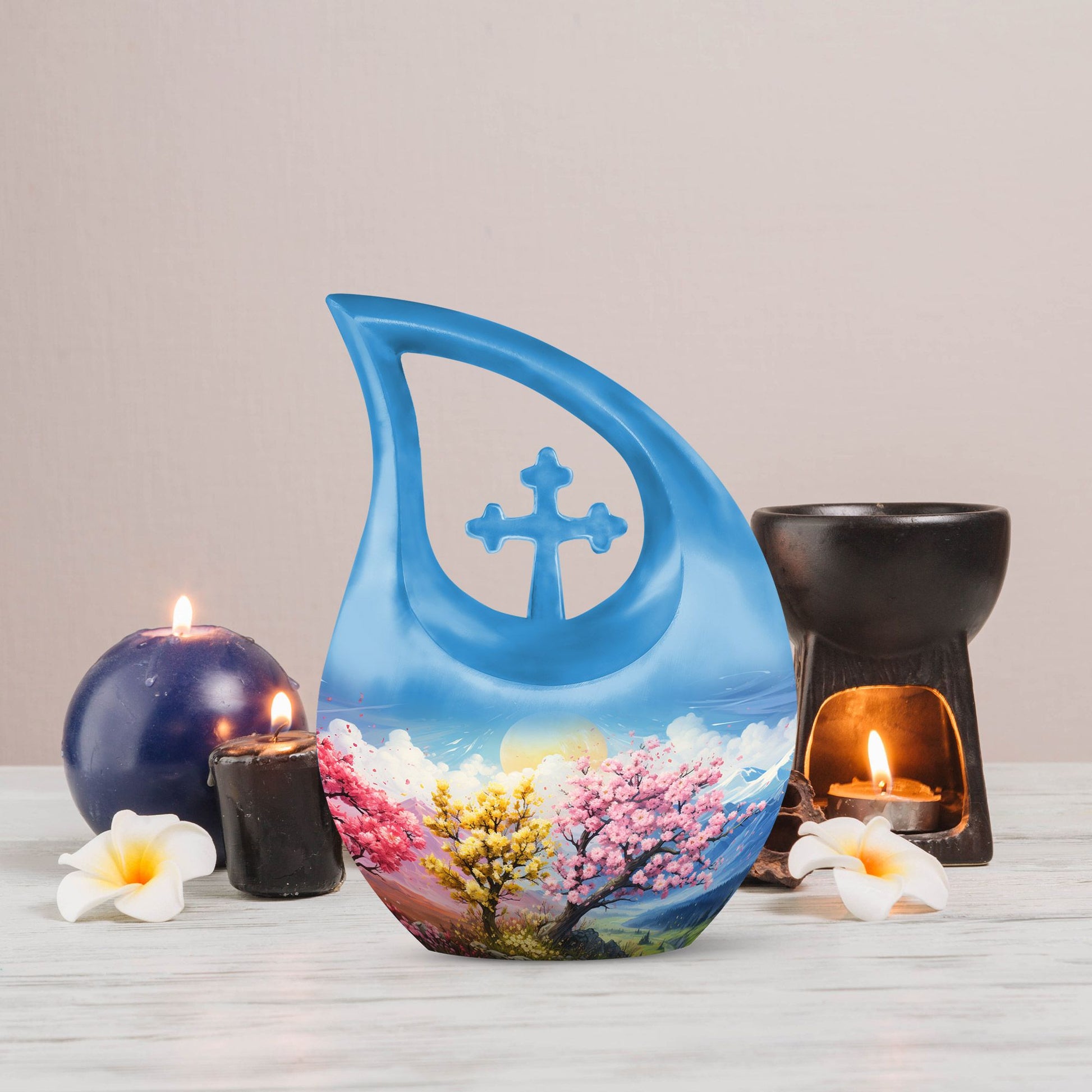 Encapsulate the serenity of the wilderness with our unique 'Cross Drop' Wilderness Urn. Sized at 10 inches, this substantial aluminium urn stands as an elegant tribute to the love you hold. Built to hold 200 cubic inches of ashes, this urn is specifically designed to accommodate the cremation remains of an adult male. The urn's weight of 3.3 pounds adds a tangible feeling of durability and permanence. The Wilderness Urn comes with a velvet pouch, ensuring a respectful containment for your loved ones' remains. You can even personalize this urn with engraved names, adding a touch of intimacy and ownership, enhancing its value as a cherished keepsake. It is a harmonious blend of utility and aesthetics, providing an affordable yet sophisticated alternative to traditional cremation monuments. This urn doesn't look like the everyday urn; it carries a unique wilderness theme, that subtly evokes a feeling of peaceful solitude. So, if you're in search of 'urns with love' or something a little different, our Wilderness Urn makes for a beautiful and fitting choice.