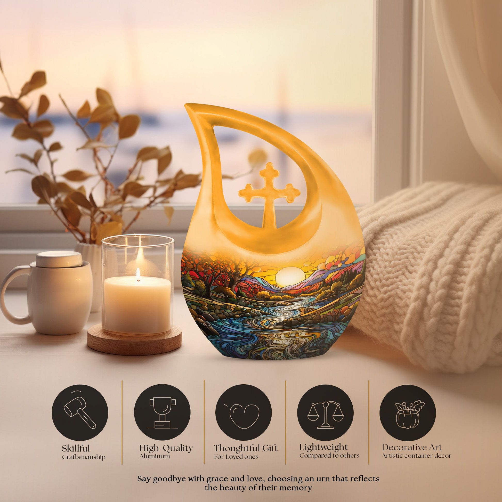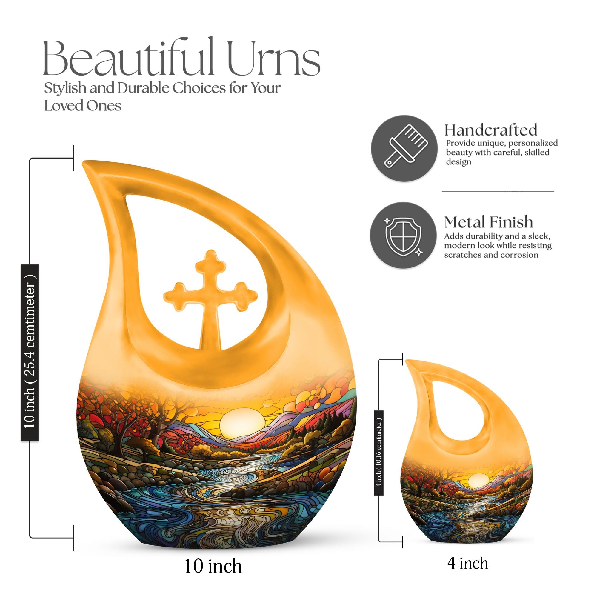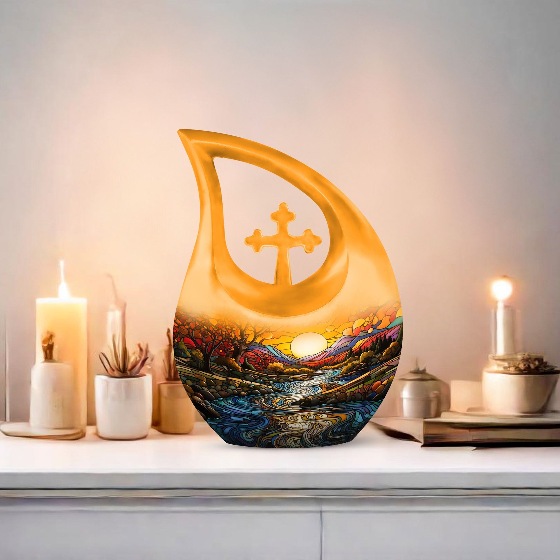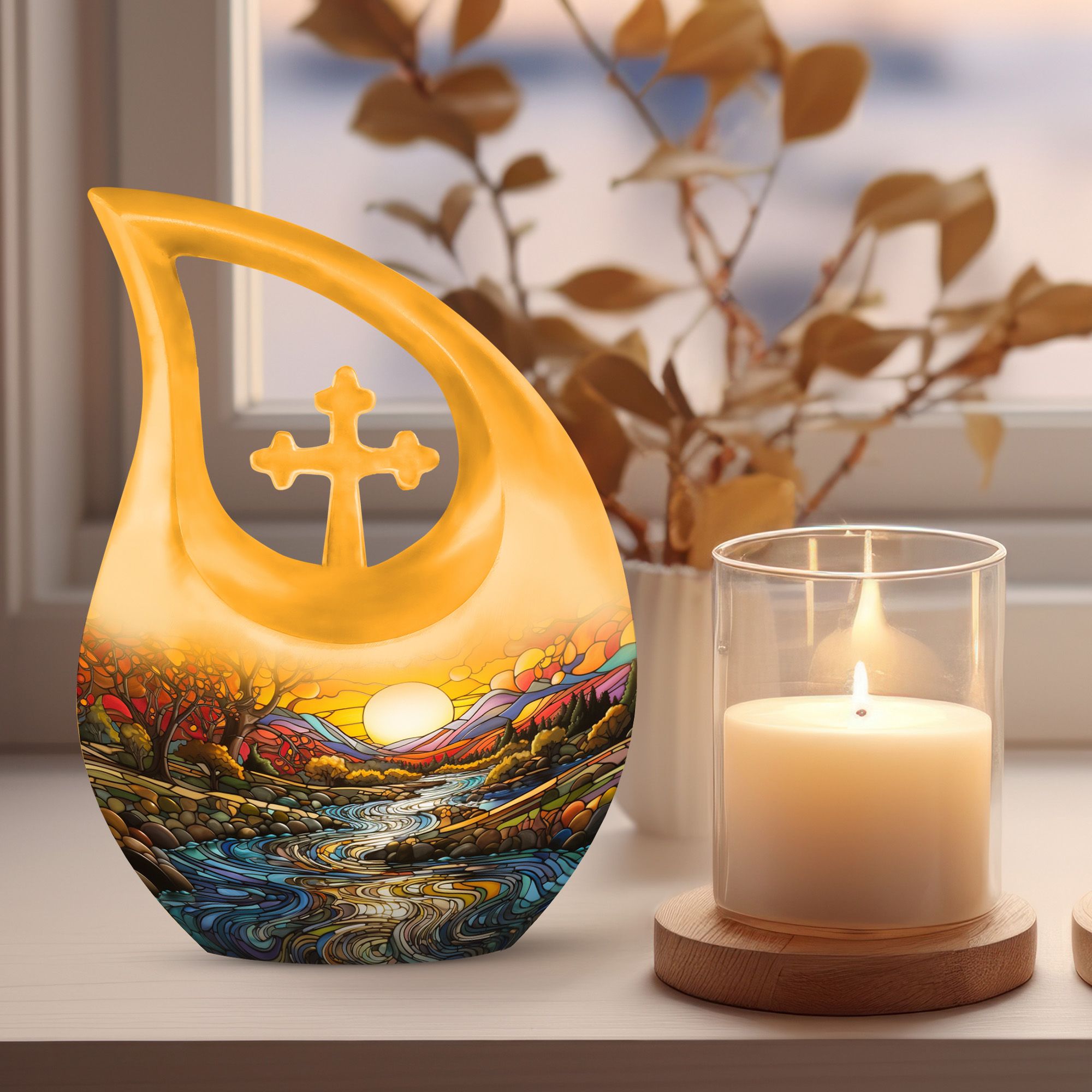 Crafted from durable aluminum, this artistic funeral urn features a stained glass–inspired design that symbolizes hope and eternal connection. Its secure screw-top lid ensures safe handling while the full-size capacity makes it suitable for funeral cremation urns for ashes, funeral cremation needs, or cremation urns large & small combo sets. This piece can be paired with small funeral urns or funeral urns for human ashes small to create a complete memorial grouping. The vibrant finish and craftsmanship make it a timeless option for funeral urn ashes preservation.