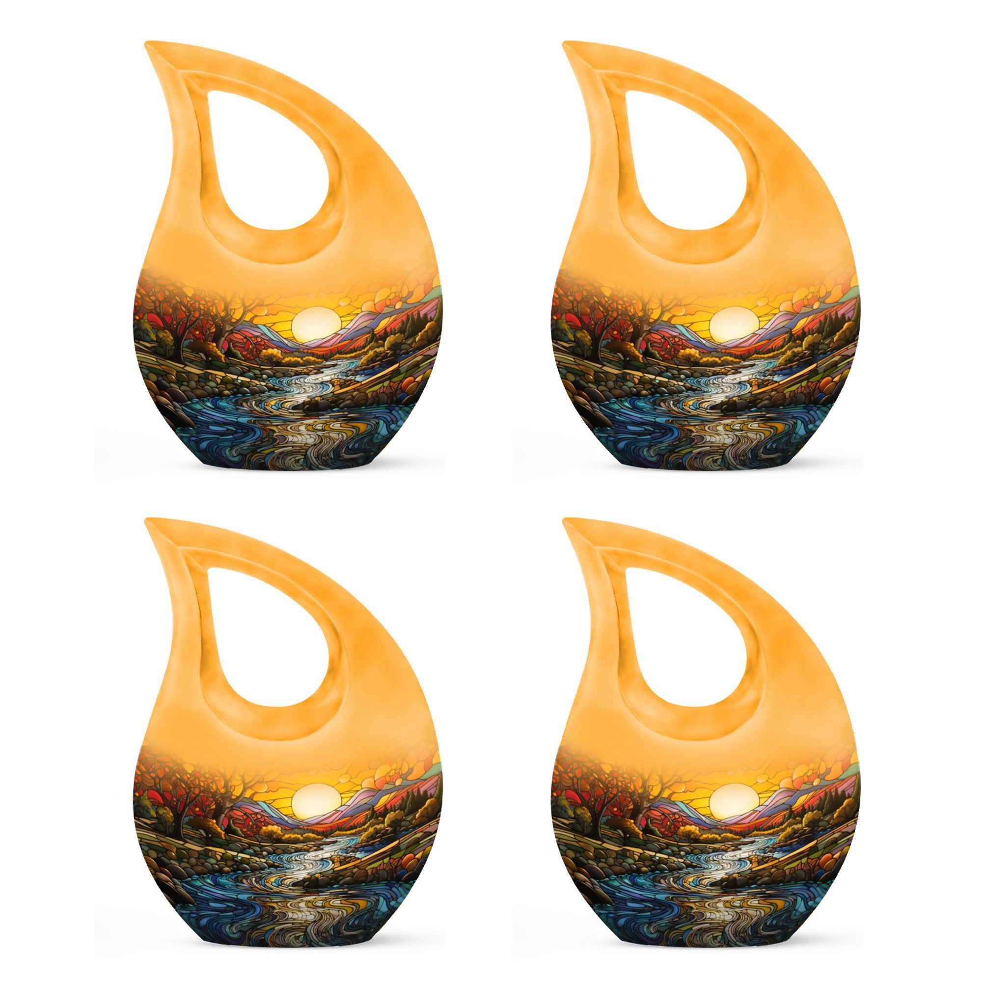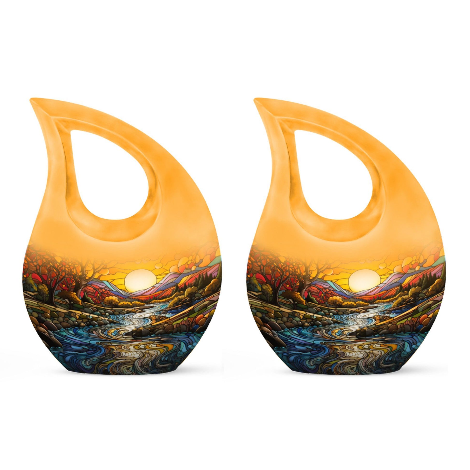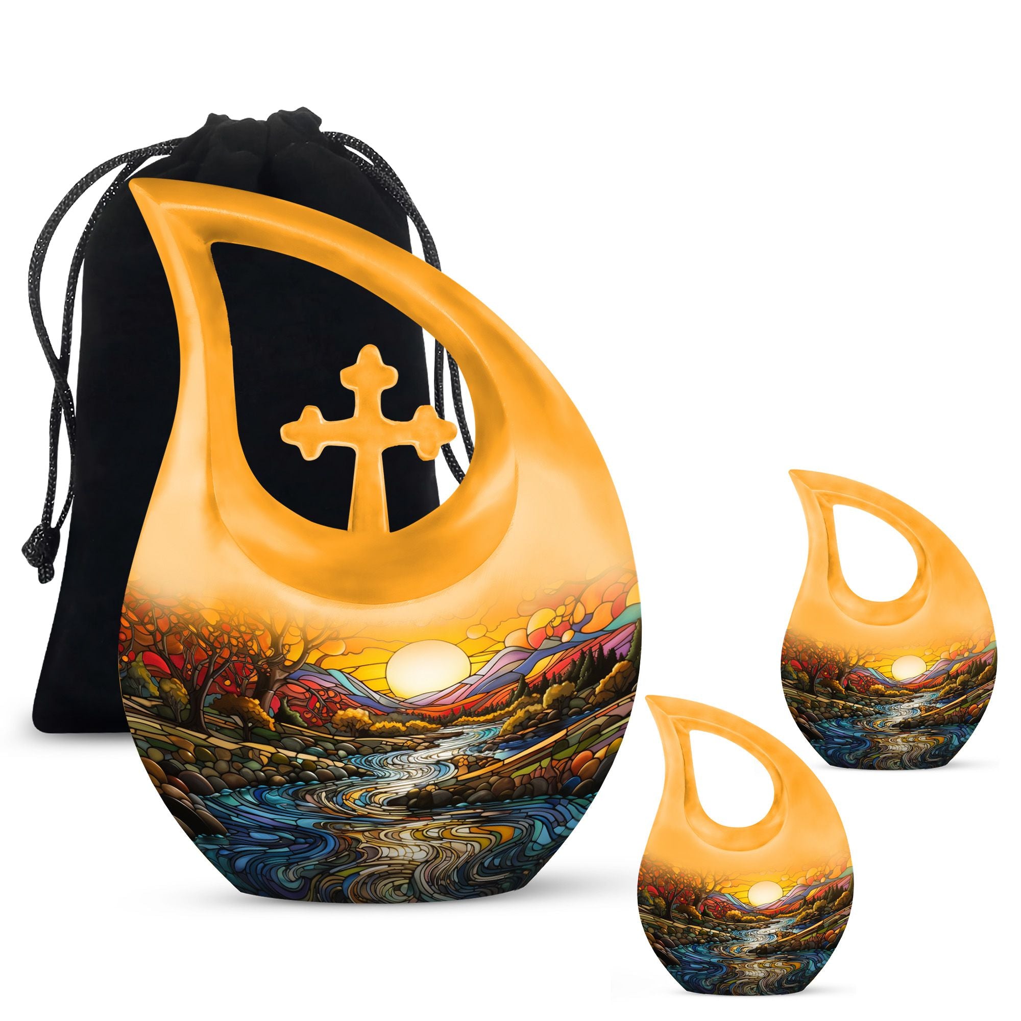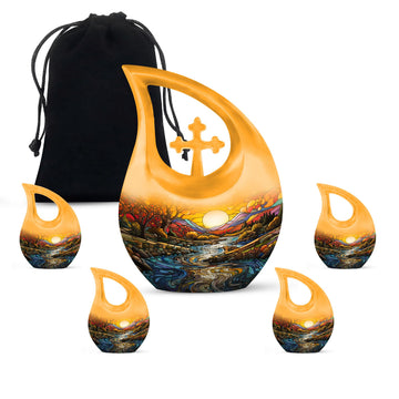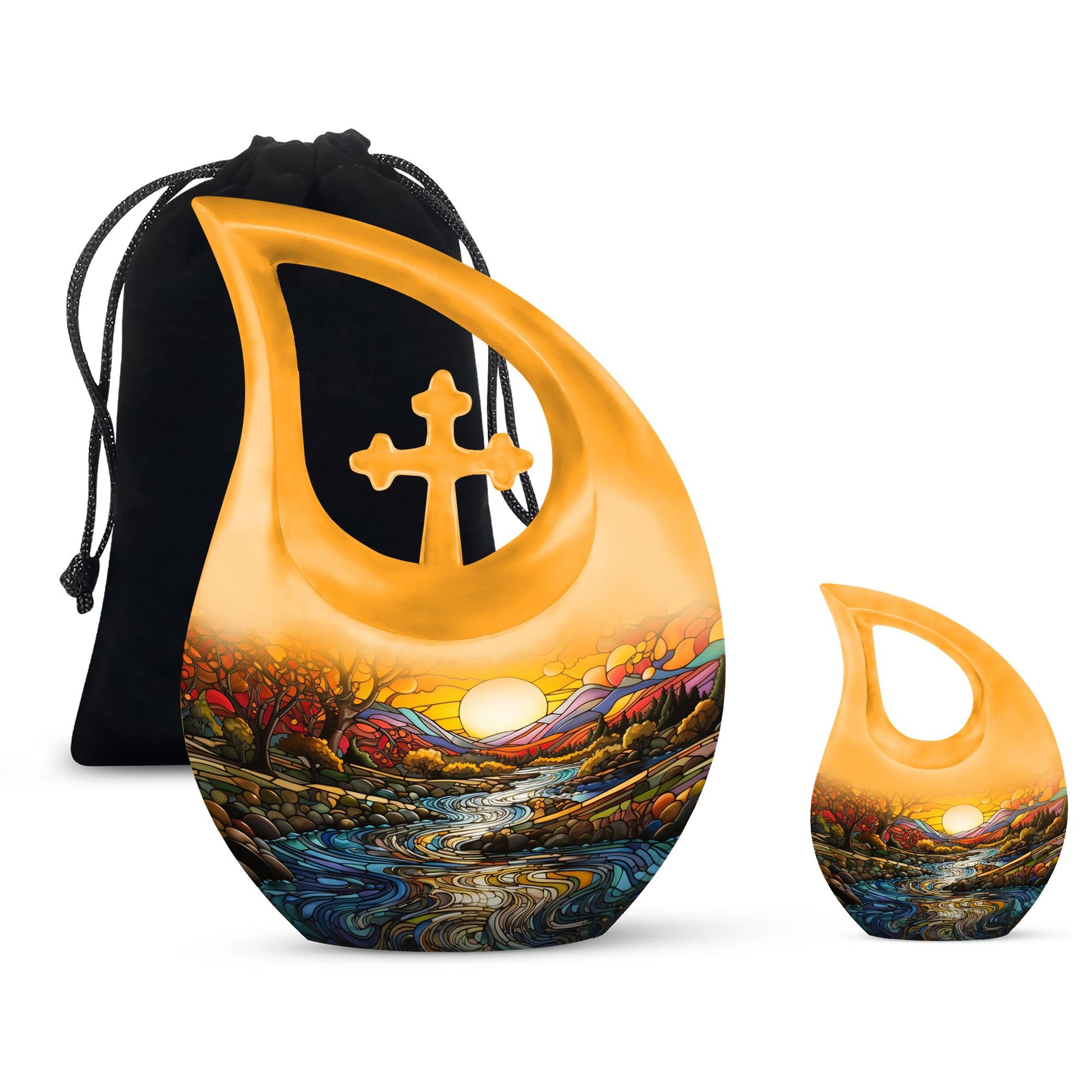 Crafted from durable aluminum, this artistic funeral urn features a stained glass–inspired design that symbolizes hope and eternal connection. Its secure screw-top lid ensures safe handling while the full-size capacity makes it suitable for funeral cremation urns for ashes, funeral cremation needs, or cremation urns large & small combo sets. This piece can be paired with small funeral urns or funeral urns for human ashes small to create a complete memorial grouping. The vibrant finish and craftsmanship make it a timeless option for funeral urn ashes preservation.