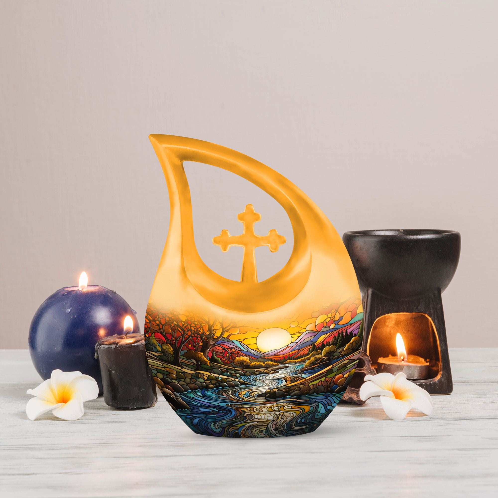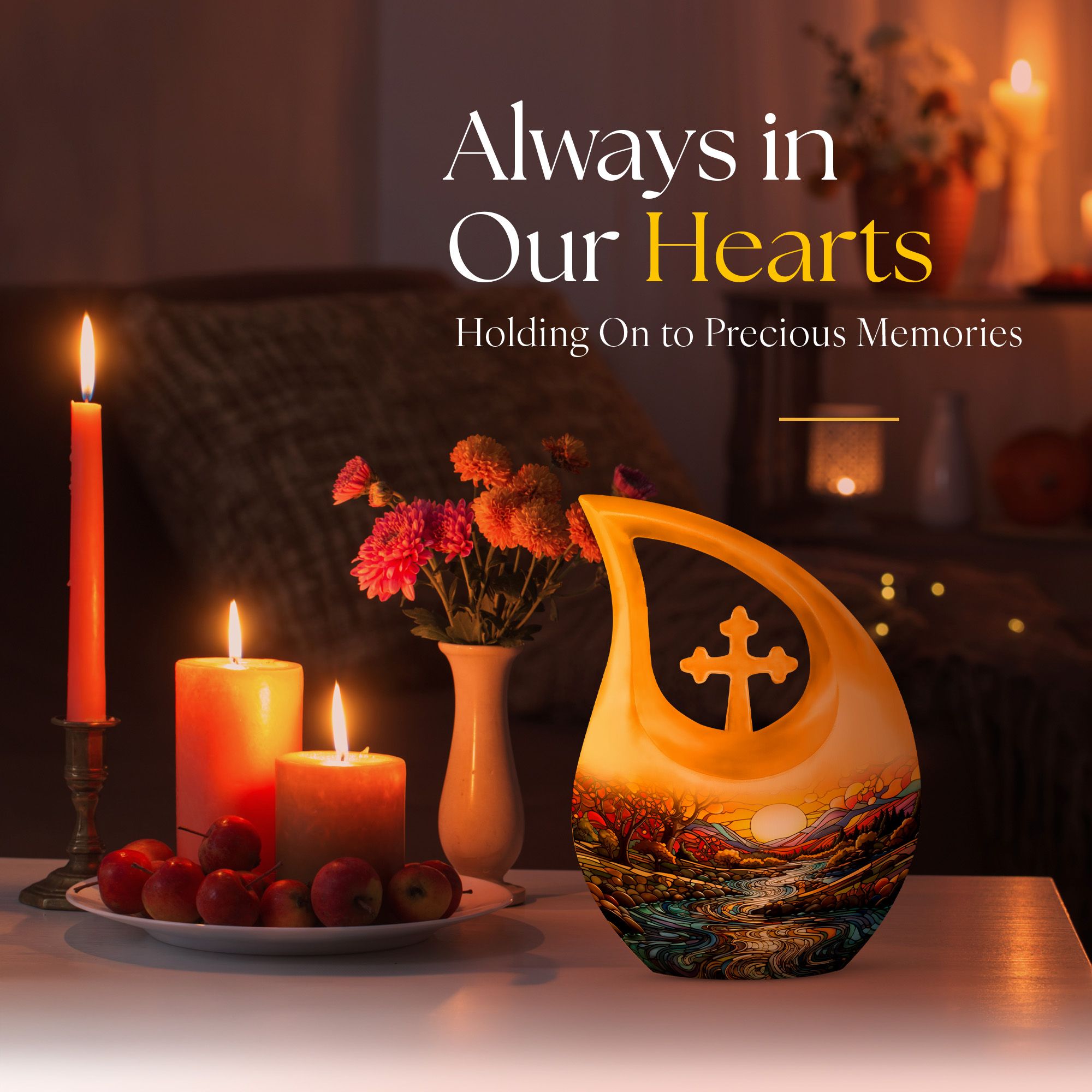 This urn also works beautifully with cremation urns large & small combo sets, allowing families to share ashes across generations with matching artistry. Its glowing stained glass effect brings warmth and symbolism to any memorial space.