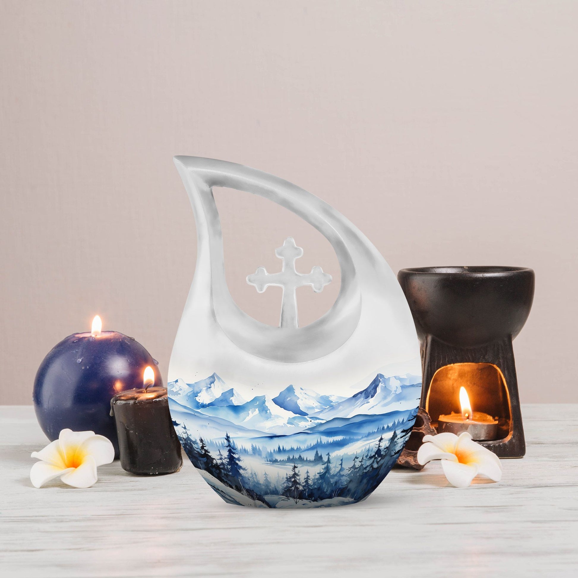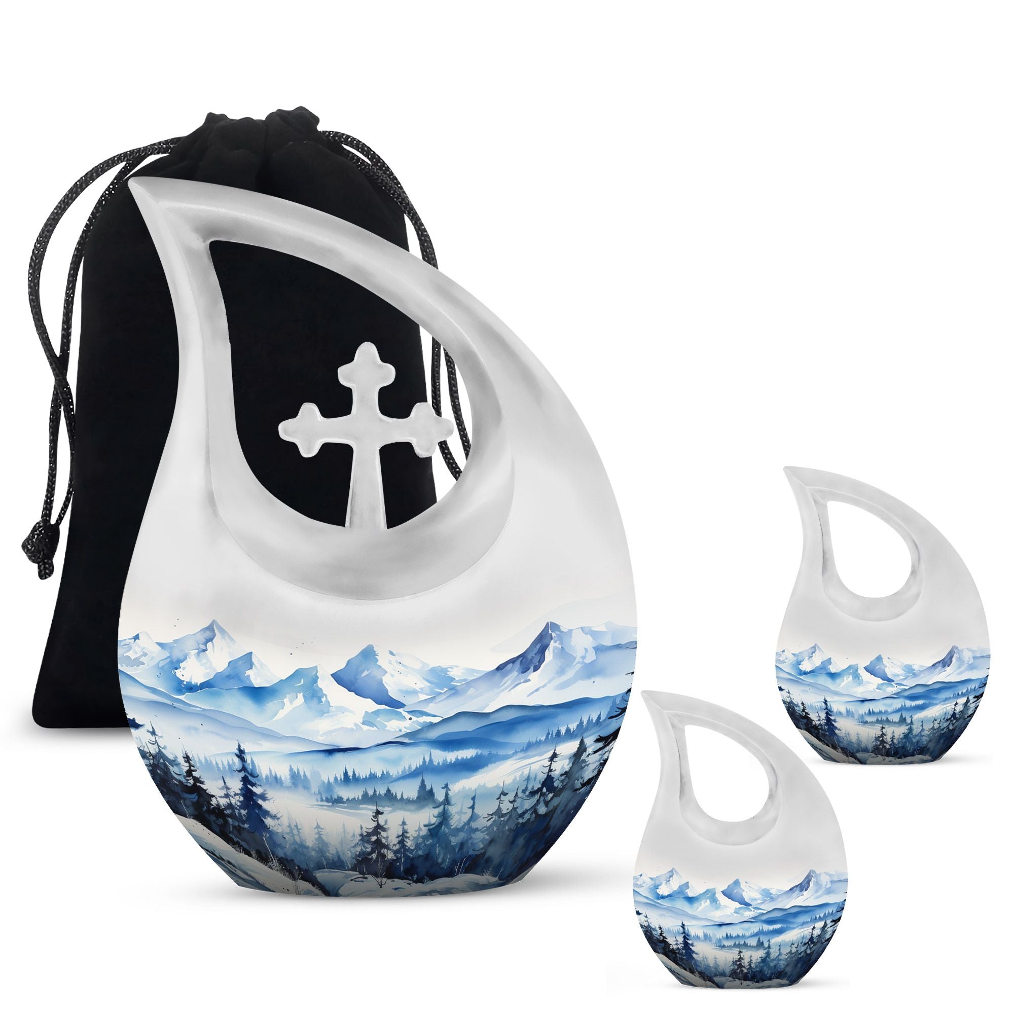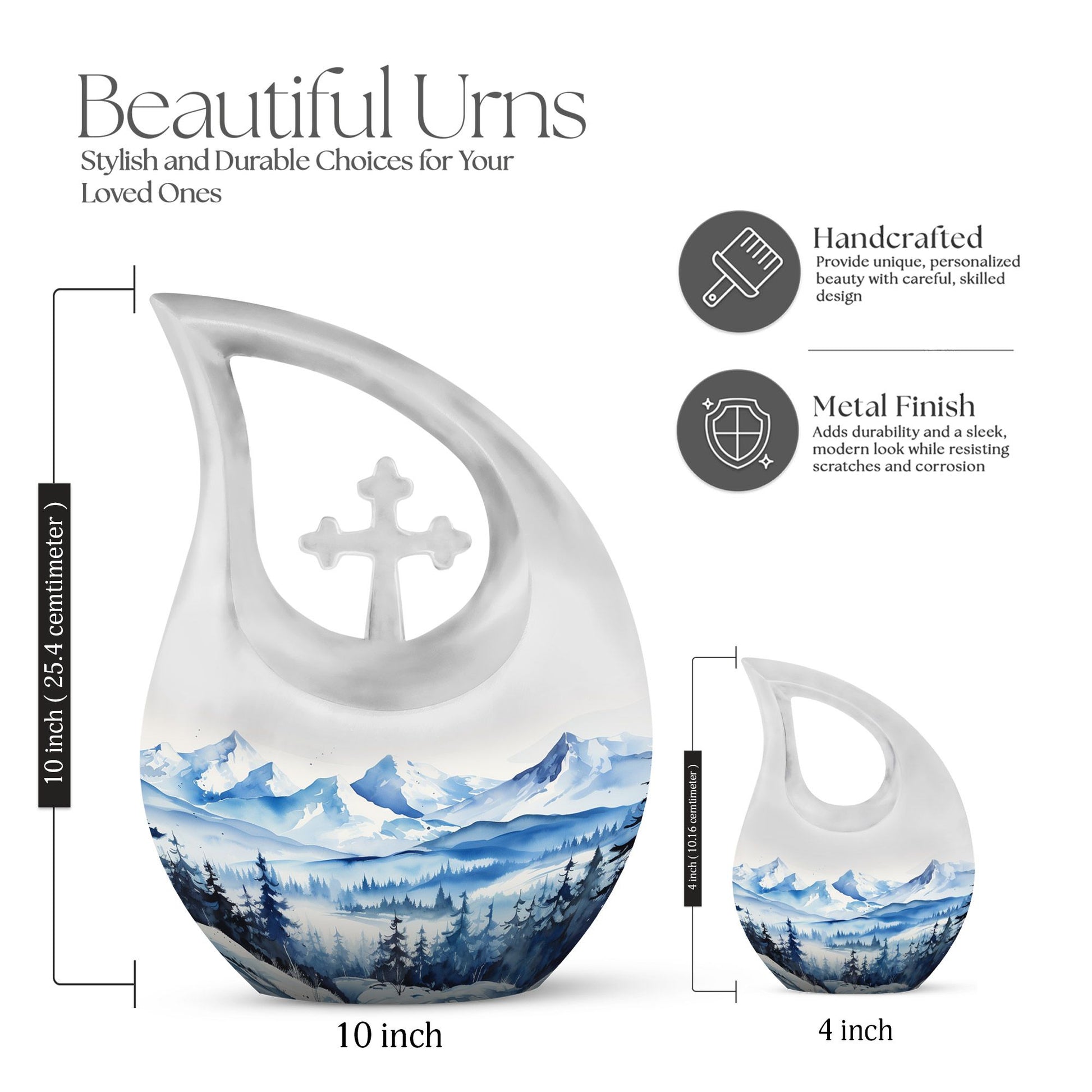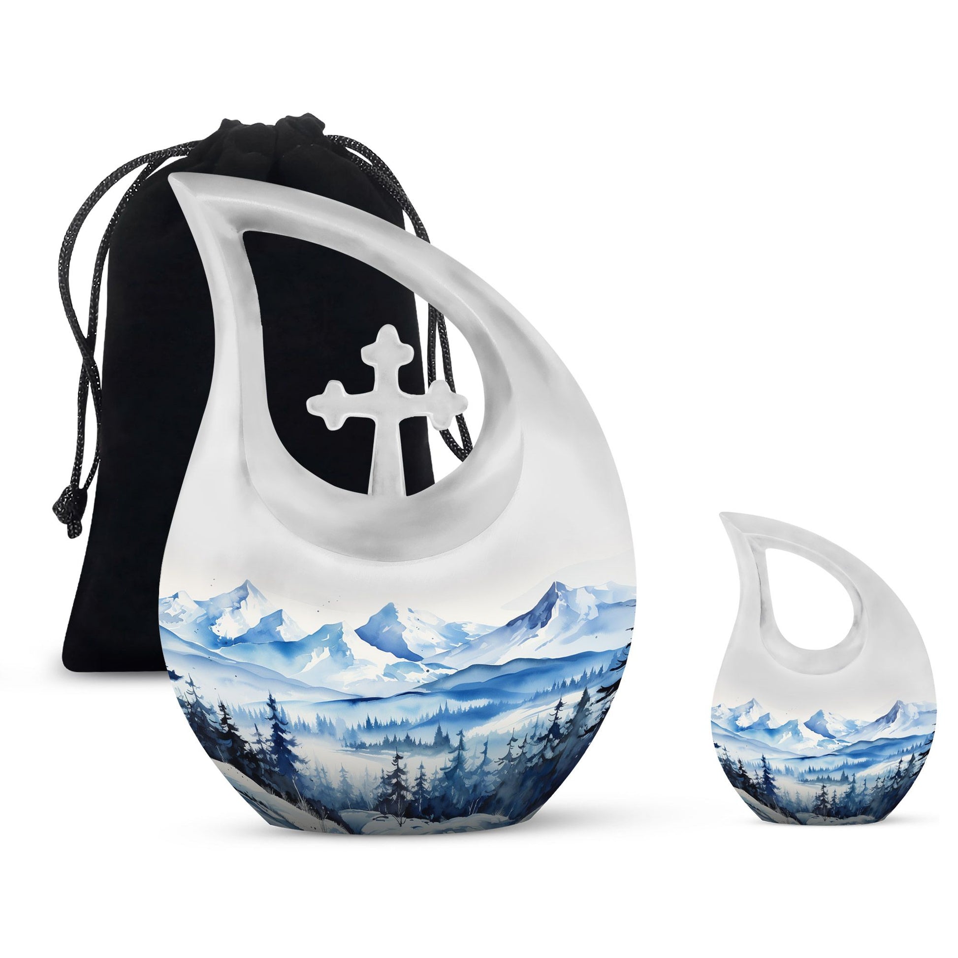 Remember and honor your loved ones with our Wilderness Urn, a compelling and comforting piece befitting of your treasured memories. This custom-engraved urn features an attractive 'Cross Drop' insignia, thoughtfully designed to convey the sense of peace and love. Crafted from durable aluminium, our large urn is resilient and long-lasting, measuring 10 inches in height and a significant capacity of 200 cubic inches, fitting for the containment of ashes of two. The 'Wilderness' theme of the urn creates a poignant, ethereal connection with nature, reminiscent of eternal peace and harmony. Plus, personalize your urn with engraved names to keep the memory alive. This magnificent memorial urn is complemented with a velvet pouch for the respectful containment of ashes. Weighing a substantial 3.3 pounds, this cherished memorial keepsake is an idyllic choice for individuals seeking a unique yet classic keeping place for their cherished ones. The Wilderness Urn; a sublime blend of beauty, strength, and an eternal memory for your loved one.