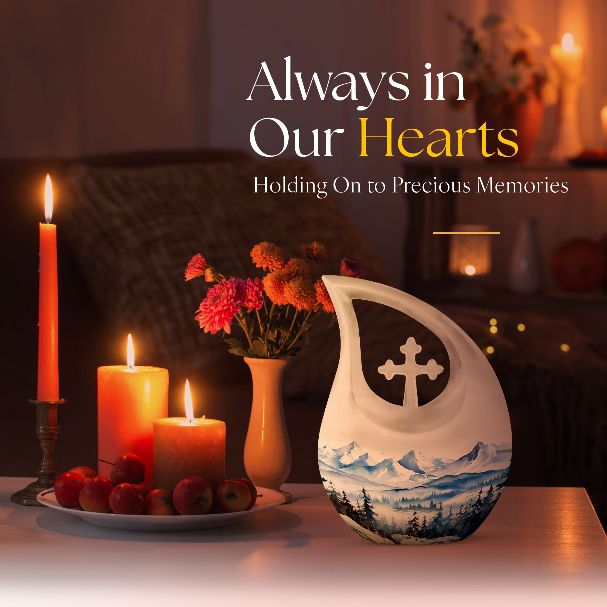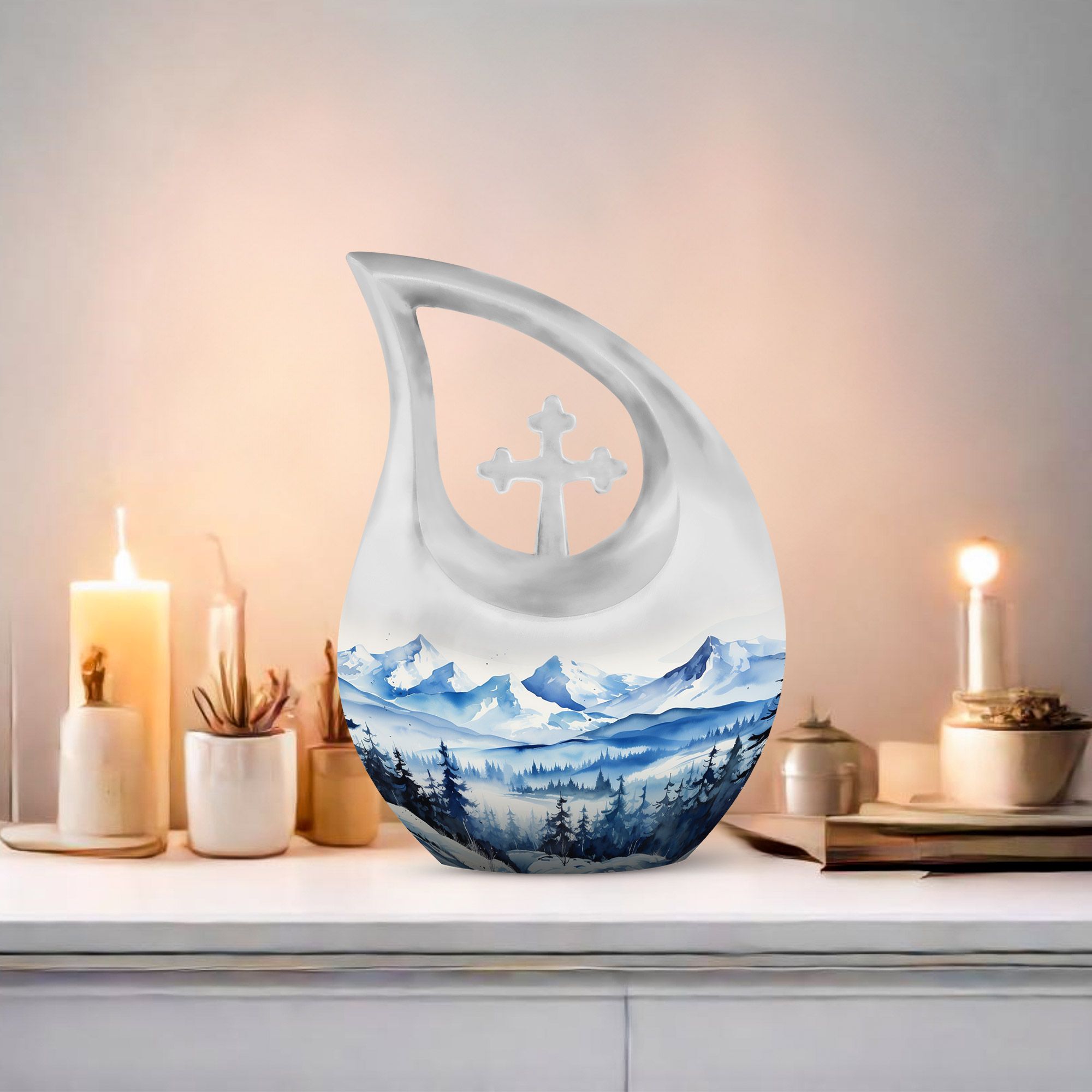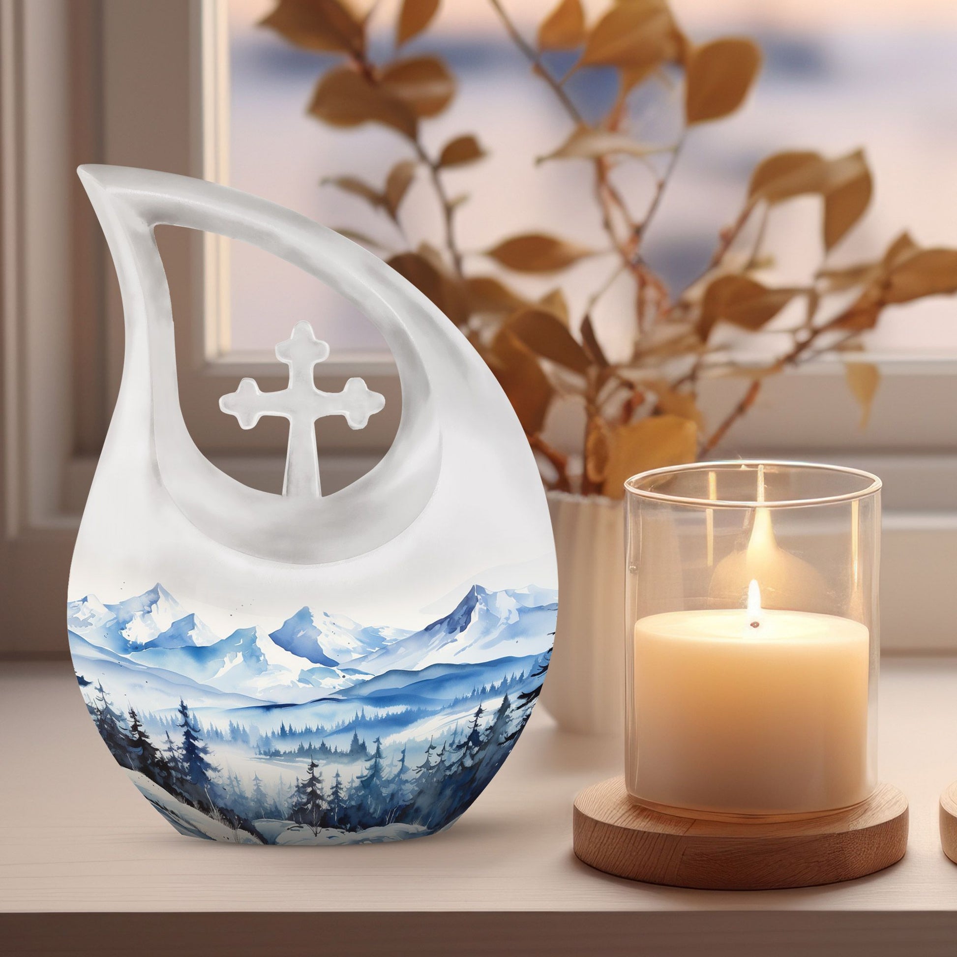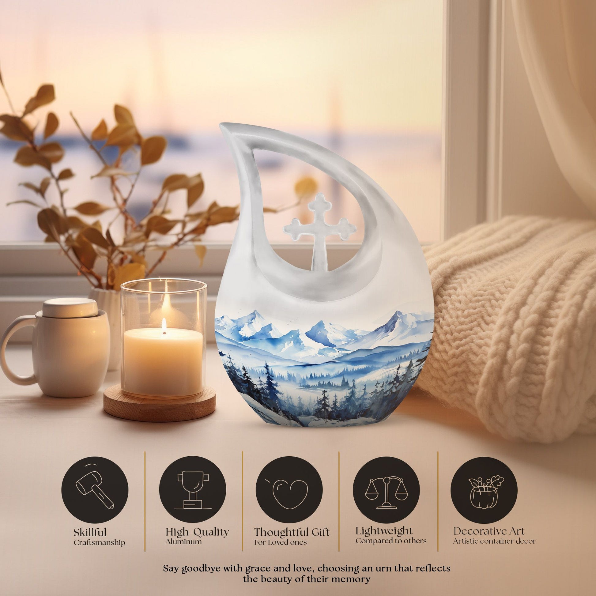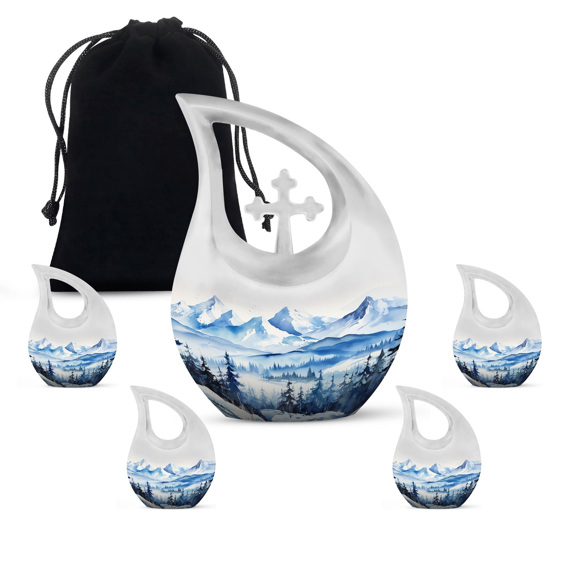 Remember and honor your loved ones with our Wilderness Urn, a compelling and comforting piece befitting of your treasured memories. This custom-engraved urn features an attractive 'Cross Drop' insignia, thoughtfully designed to convey the sense of peace and love. Crafted from durable aluminium, our large urn is resilient and long-lasting, measuring 10 inches in height and a significant capacity of 200 cubic inches, fitting for the containment of ashes of two. The 'Wilderness' theme of the urn creates a poignant, ethereal connection with nature, reminiscent of eternal peace and harmony. Plus, personalize your urn with engraved names to keep the memory alive. This magnificent memorial urn is complemented with a velvet pouch for the respectful containment of ashes. Weighing a substantial 3.3 pounds, this cherished memorial keepsake is an idyllic choice for individuals seeking a unique yet classic keeping place for their cherished ones. The Wilderness Urn; a sublime blend of beauty, strength, and an eternal memory for your loved one.