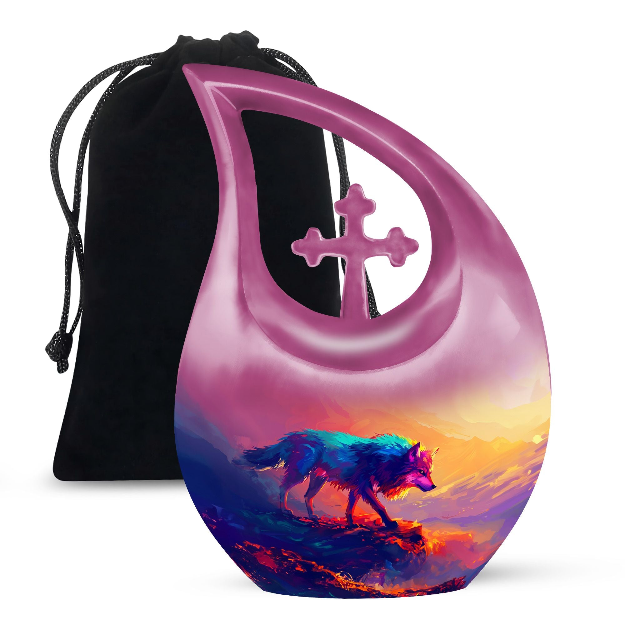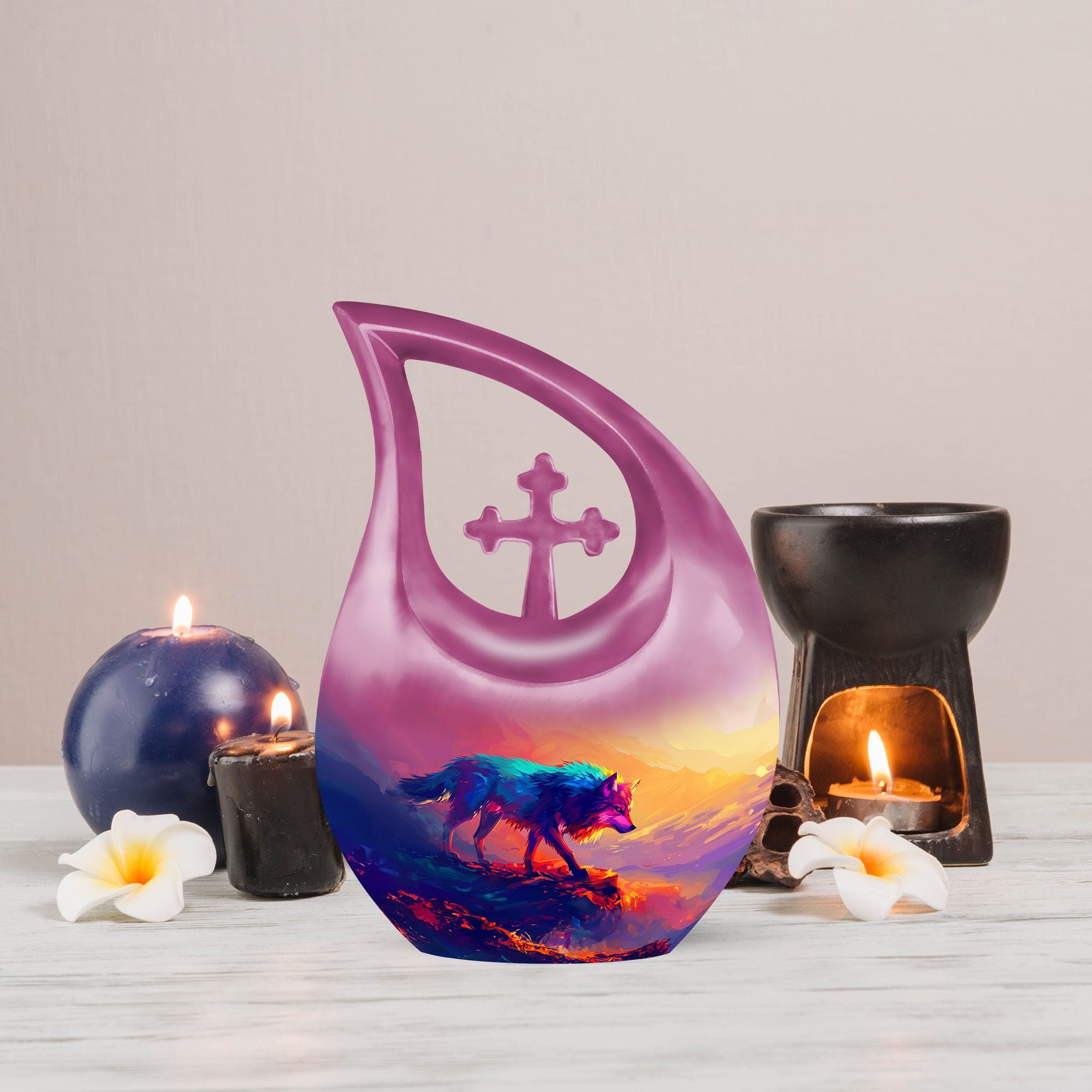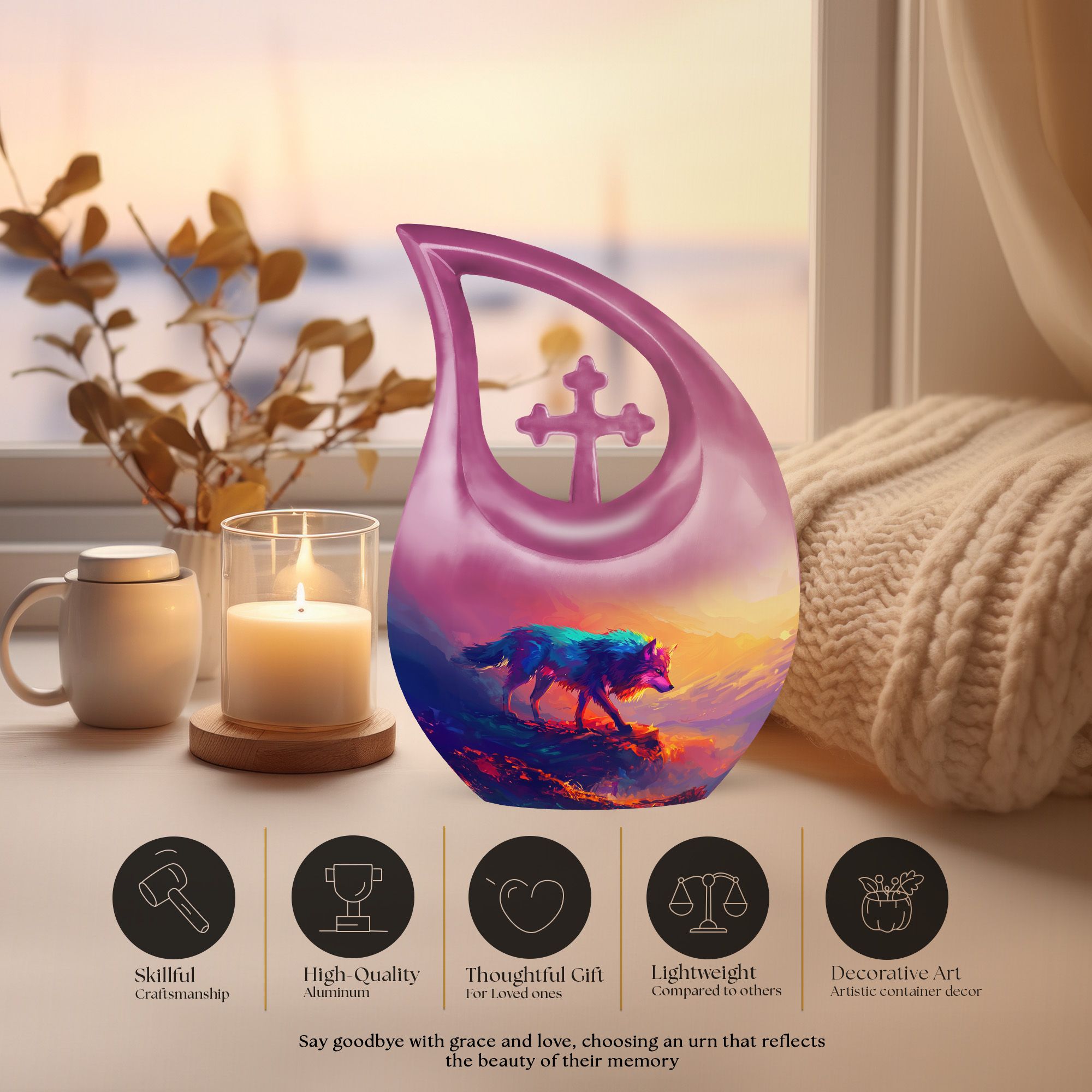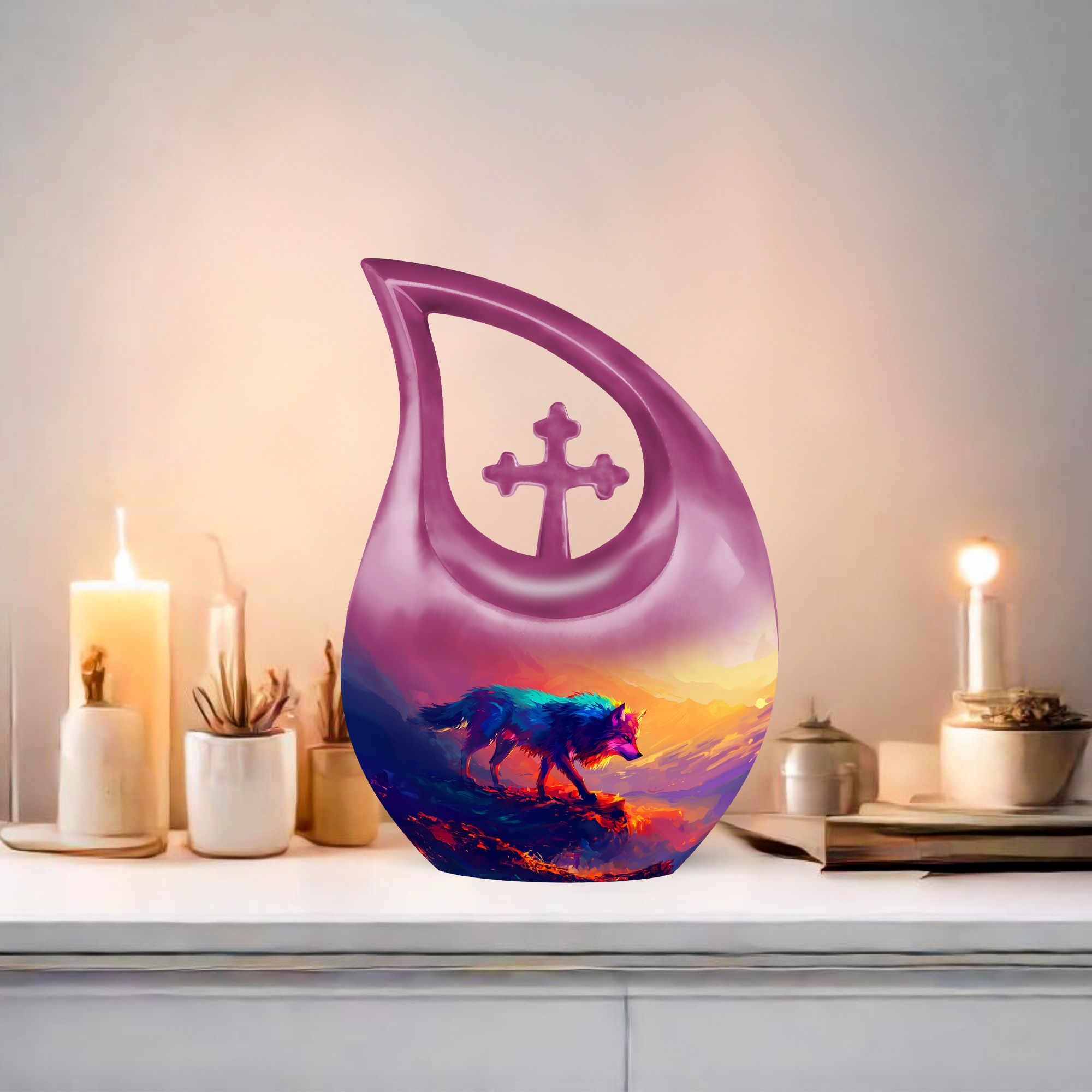 Cherish the memory of your departed loved one with our distinguished Wolf Urn. This notable 10-inch tall memorial urn is a perfect tribute, uniquely blending the Sacred Cross Drop design with a striking Wolf theme. Made from robust and time-resistant aluminium, it weighs a considerate 3.3 pounds, making it not too heavy but sturdy enough to protect its precious contents. With a 200 cubic-inch capacity, this urn provides ample space to securely hold the ashes. Furthermore, we offer you an additional velvet pouch for an extra layer of embracement to the ashes. One specialty of our Wolf Urn lies in its personalization; you can get the names of your loved ones professionally engraved on it, making the urn less of a product and more of a precious keepsake. Versatile and seemingly timeless, these affordable urns remain unaffected both in a garden setting or indoors. They also serve as captivating cremation boxes to display in your home. Our Wolf urn constitutes tasteful respect to your cherished memories, reflecting your affection for your loved ones, thereby, allowing their legacy to thrive.