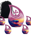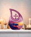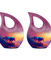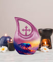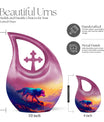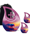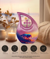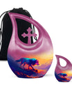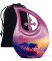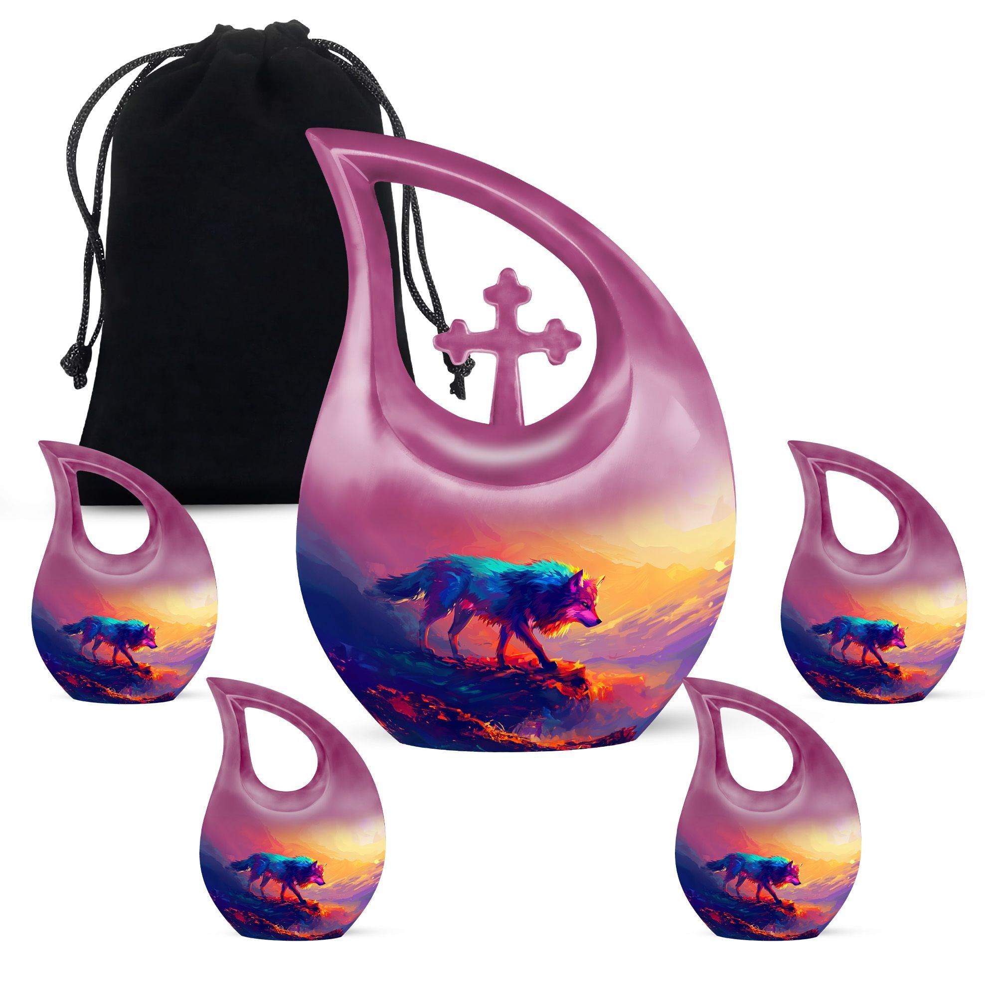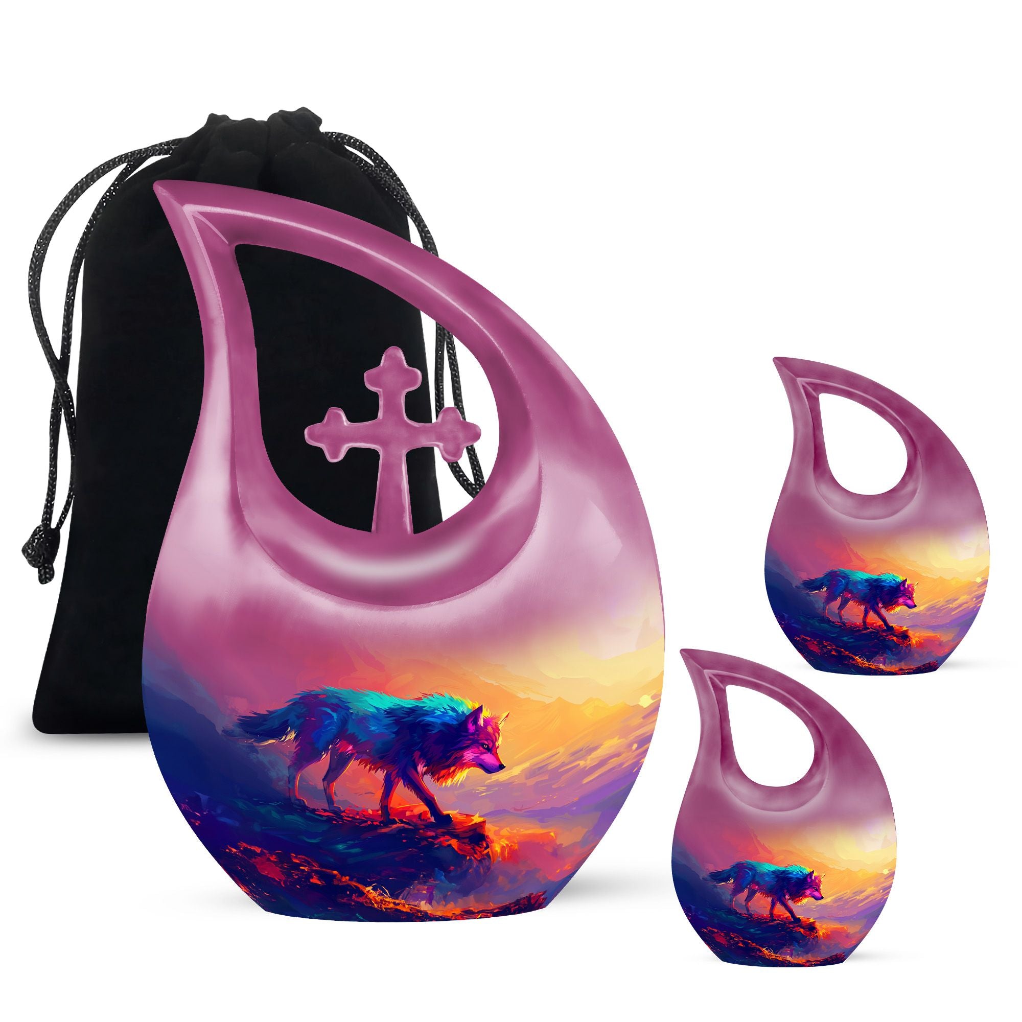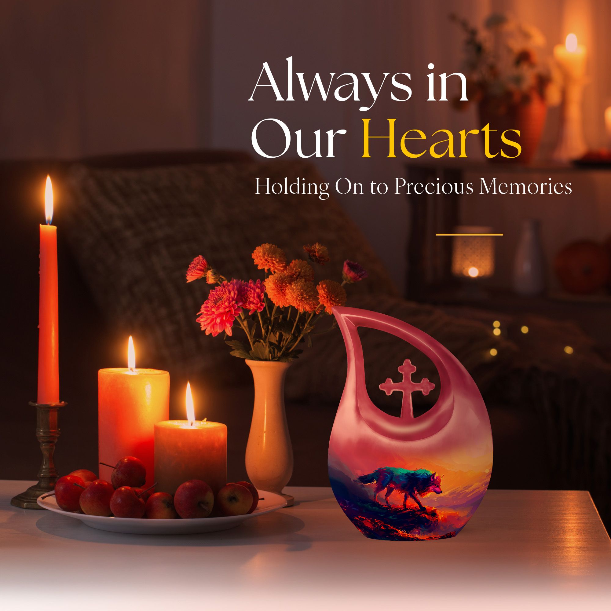 Cherish the memory of your departed loved one with our distinguished Wolf Urn. This notable 10-inch tall memorial urn is a perfect tribute, uniquely blending the Sacred Cross Drop design with a striking Wolf theme. Made from robust and time-resistant aluminium, it weighs a considerate 3.3 pounds, making it not too heavy but sturdy enough to protect its precious contents. With a 200 cubic-inch capacity, this urn provides ample space to securely hold the ashes. Furthermore, we offer you an additional velvet pouch for an extra layer of embracement to the ashes. One specialty of our Wolf Urn lies in its personalization; you can get the names of your loved ones professionally engraved on it, making the urn less of a product and more of a precious keepsake. Versatile and seemingly timeless, these affordable urns remain unaffected both in a garden setting or indoors. They also serve as captivating cremation boxes to display in your home. Our Wolf urn constitutes tasteful respect to your cherished memories, reflecting your affection for your loved ones, thereby, allowing their legacy to thrive.