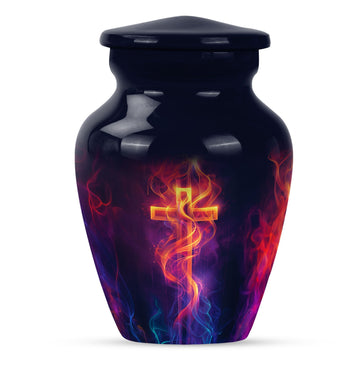 Gaze upon the breathtaking beauty of the 'Aurora Borealis' captured in our 10-inch, aluminium cross urn. Ideal as a remembrance and tribute to your loved ones, this large cremation urn exudes a timeless, classic charm that bridges the gap between tradition and modernity. Crafted to a sophisticated finish, its sturdy weight of 3.3 pounds is representative of its solid construction and durability. At a capacity of 200 cubic inches, it can respectfully hold the ashes of an adult, making it a suitable memorial urn for all genders. The urn package also comes with a velvet pouch for careful containment and respect of the ashes. As a cherished touch, personalize the urn with engraved names, creating a truly special memory of your cherished one. On top of it 'classic urn' design is a noteworthy theme that acquires a new dimension with every look. The perfect urn to honour and remember your departed loved ones.