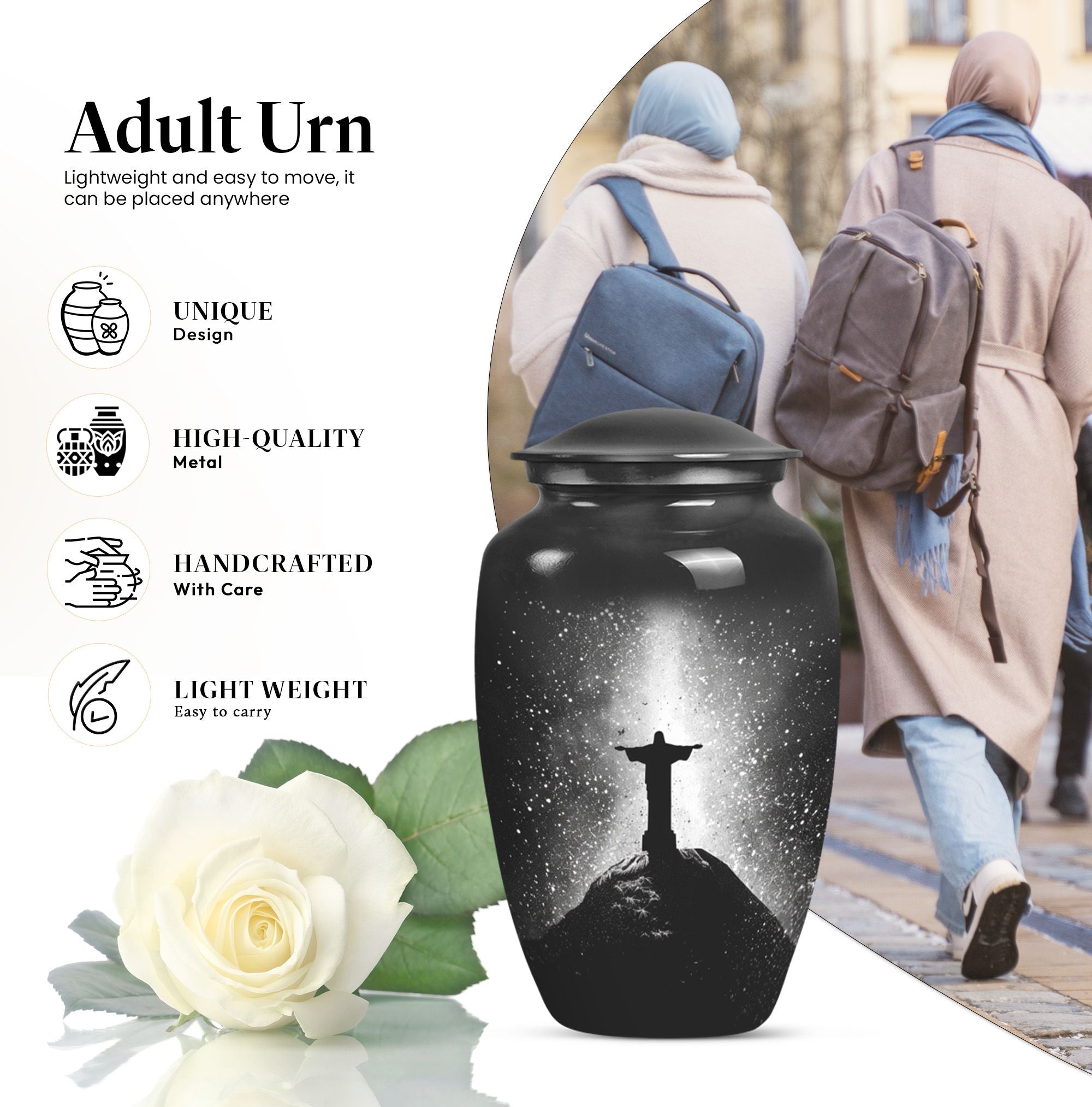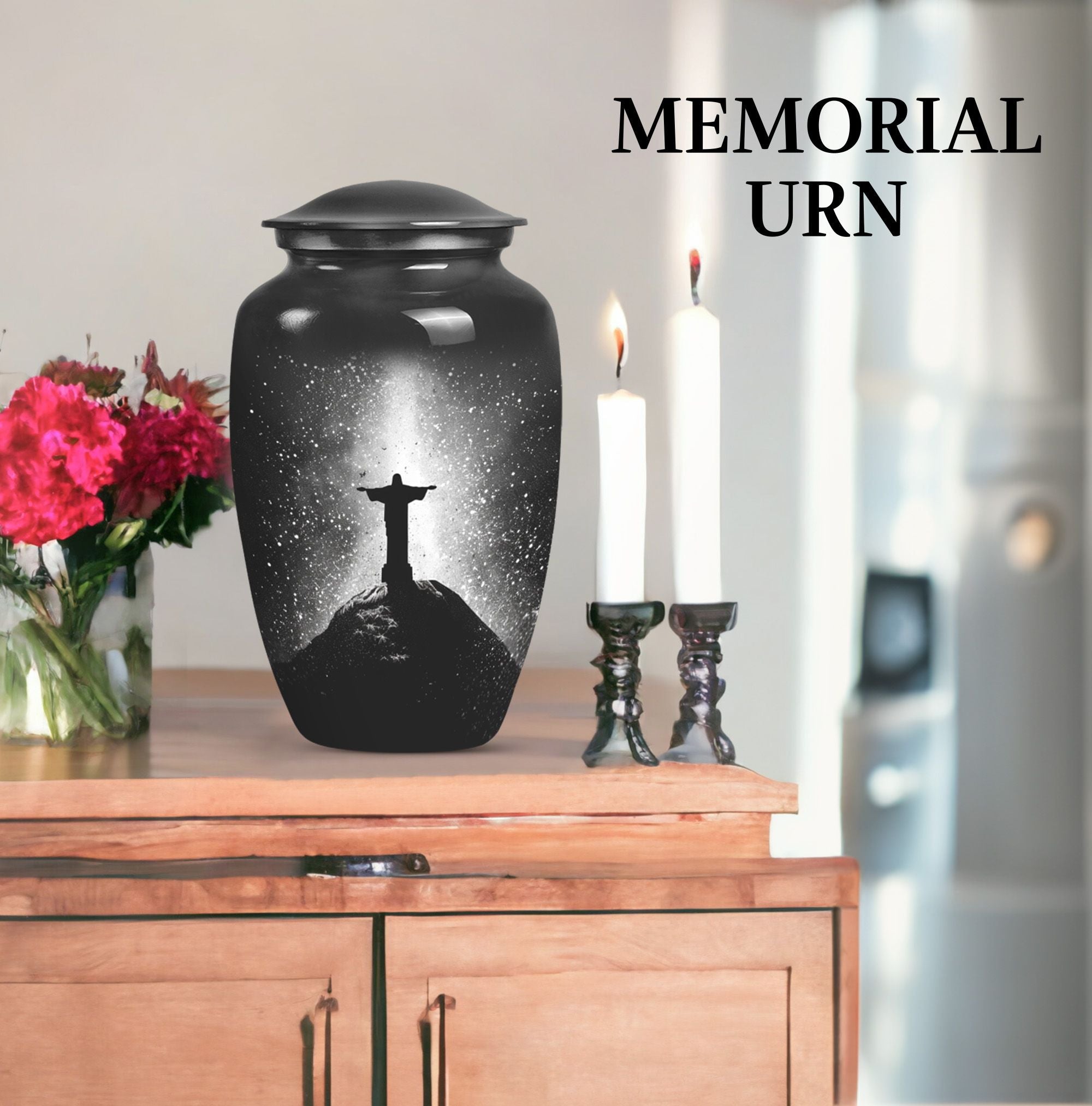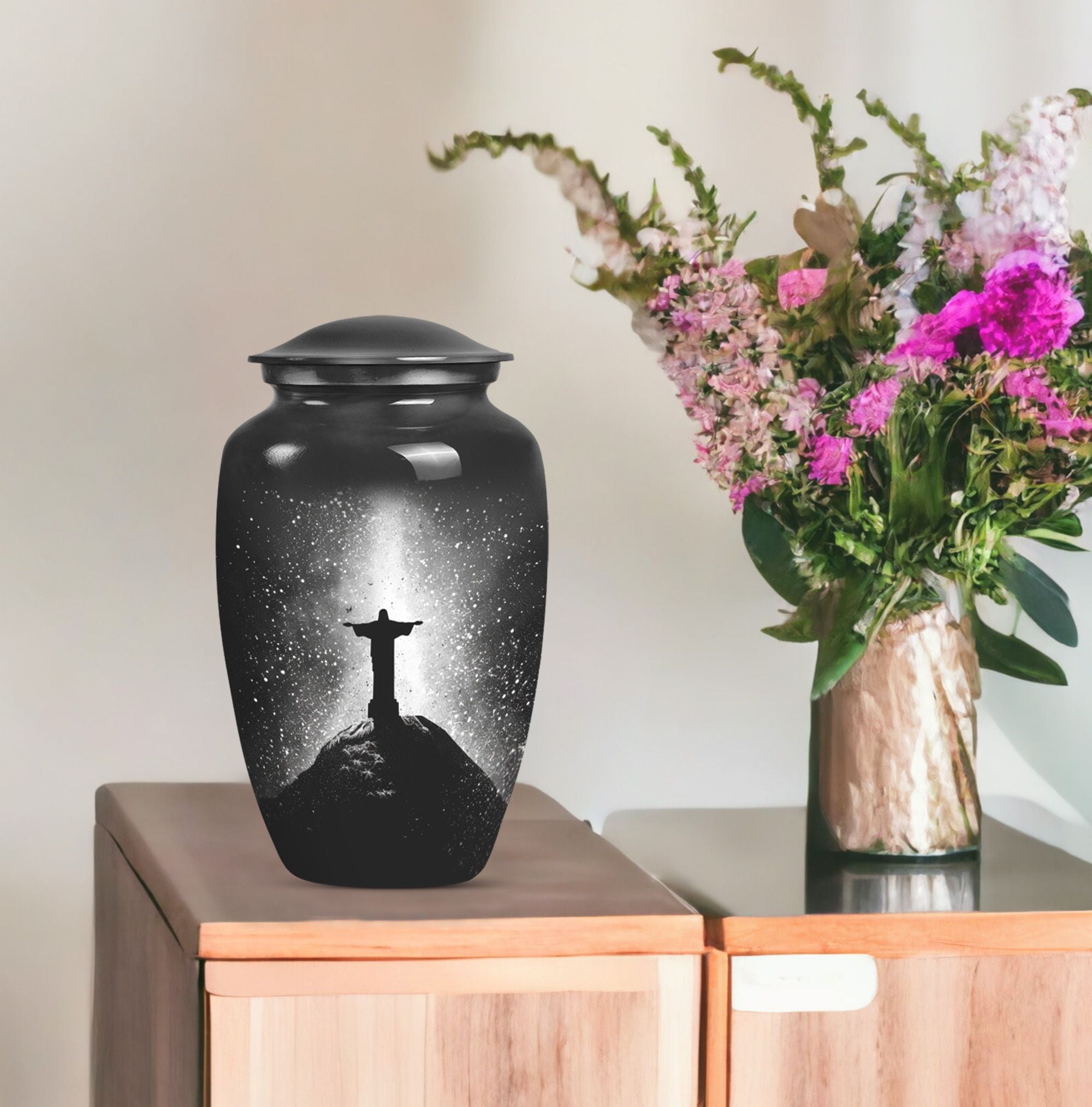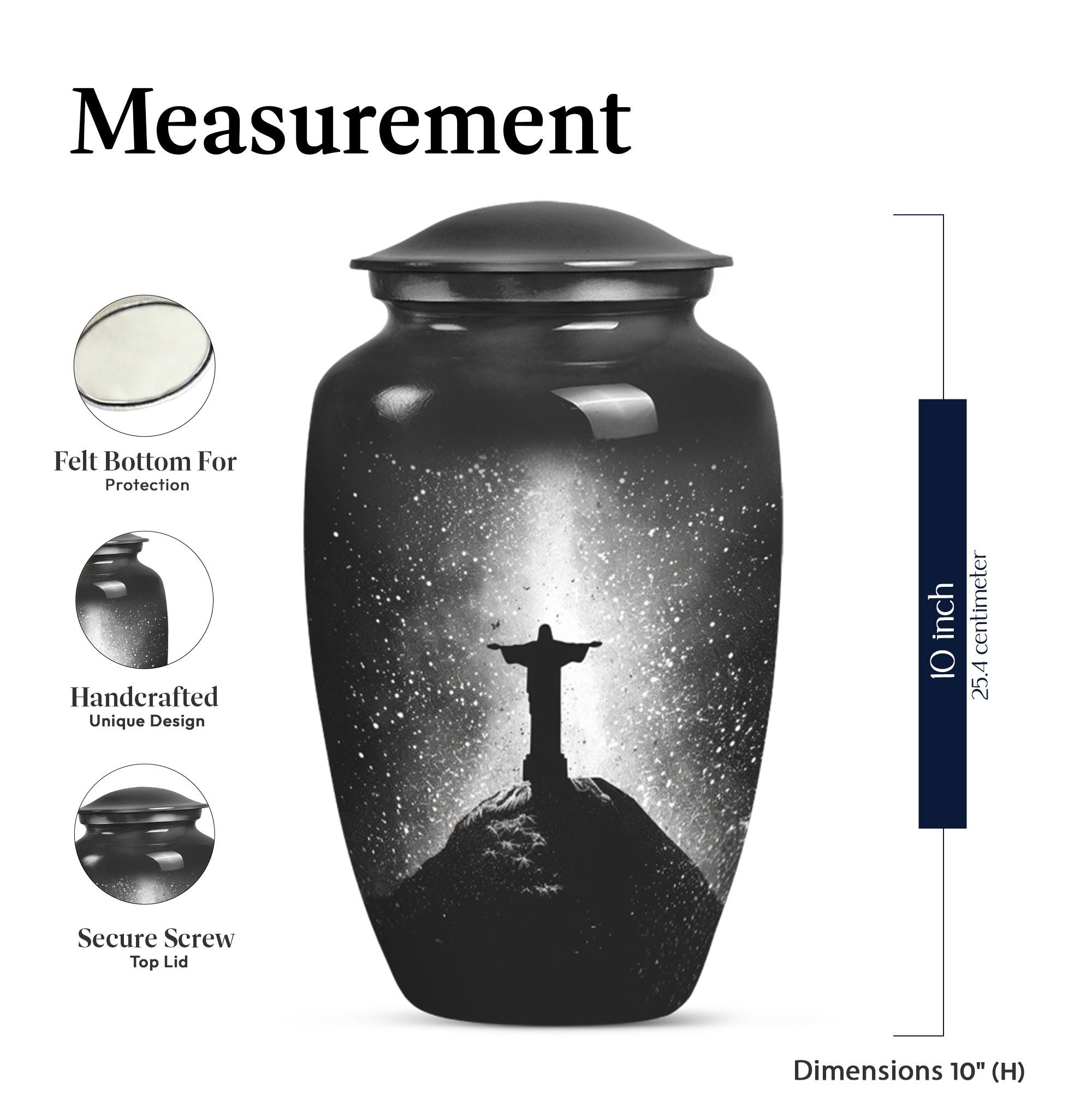 Immerse in a sense of serenity and remembrance with our exquisite Gramophone-themed cross urn, a perfect memorabilia urn for the eternal cherishing of your loved one's memories. It is a cremation urn crafted precisely to house ashes of an adult male weighing around 200 lbs, aligning perfectly with the size of 10 inches that fits in any setting gracefully. Each urn is superbly constructed from robust and lustrously finished aluminium, with a weight of just 3.3 pounds for convenient relocation. Unlike the commonplace, this urn is typecast as 'Large Urns,' inherently amplifying its uniqueness. A standout feature is the possibility of personalizing the piece with engraved names of your choice, adding a meaningful personal touch to this solemn memento. Each urn comes with a plush velvet pouch for containment of ashes, ensuring respectful and austere management of the remains. While the urn's eloquent manifestation speaks volumes, you may effortlessly carry it along your travels, favoring its portable nature. Mark your affectionate tribute with this extraordinary commemoration urn that underlines the perennial echo of memories.