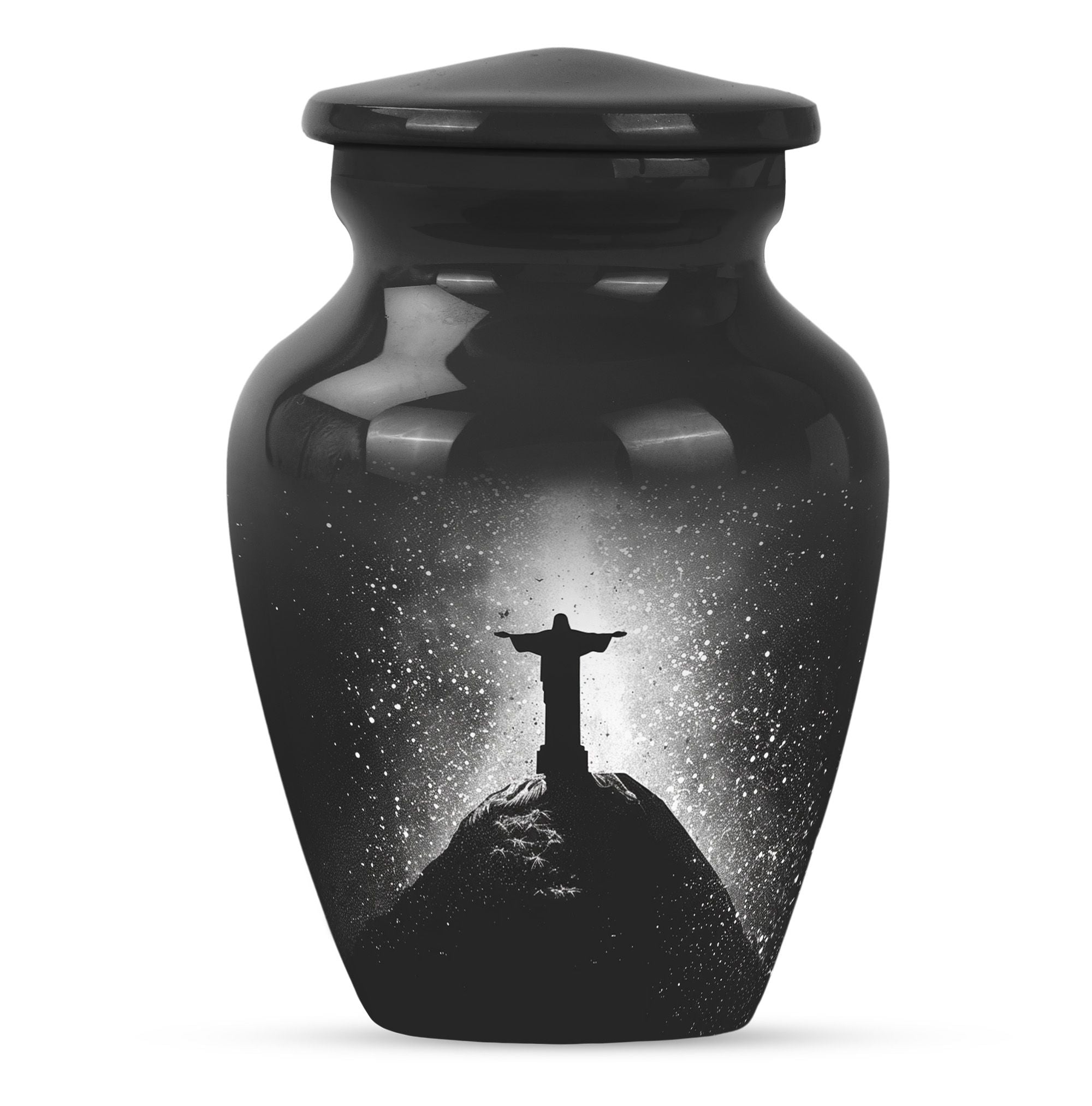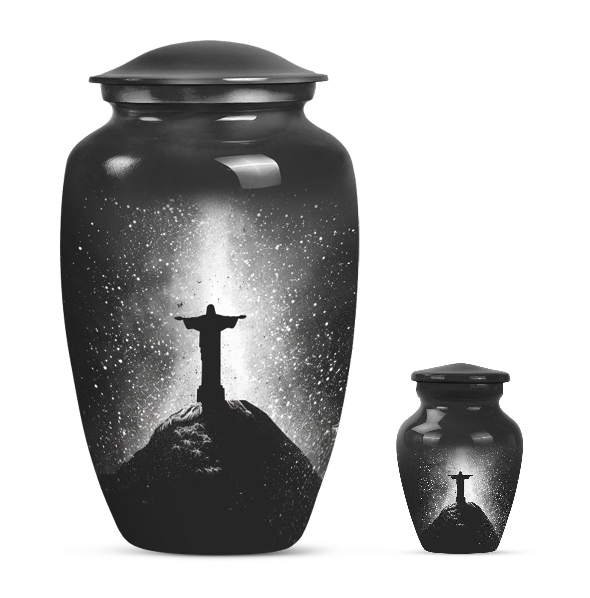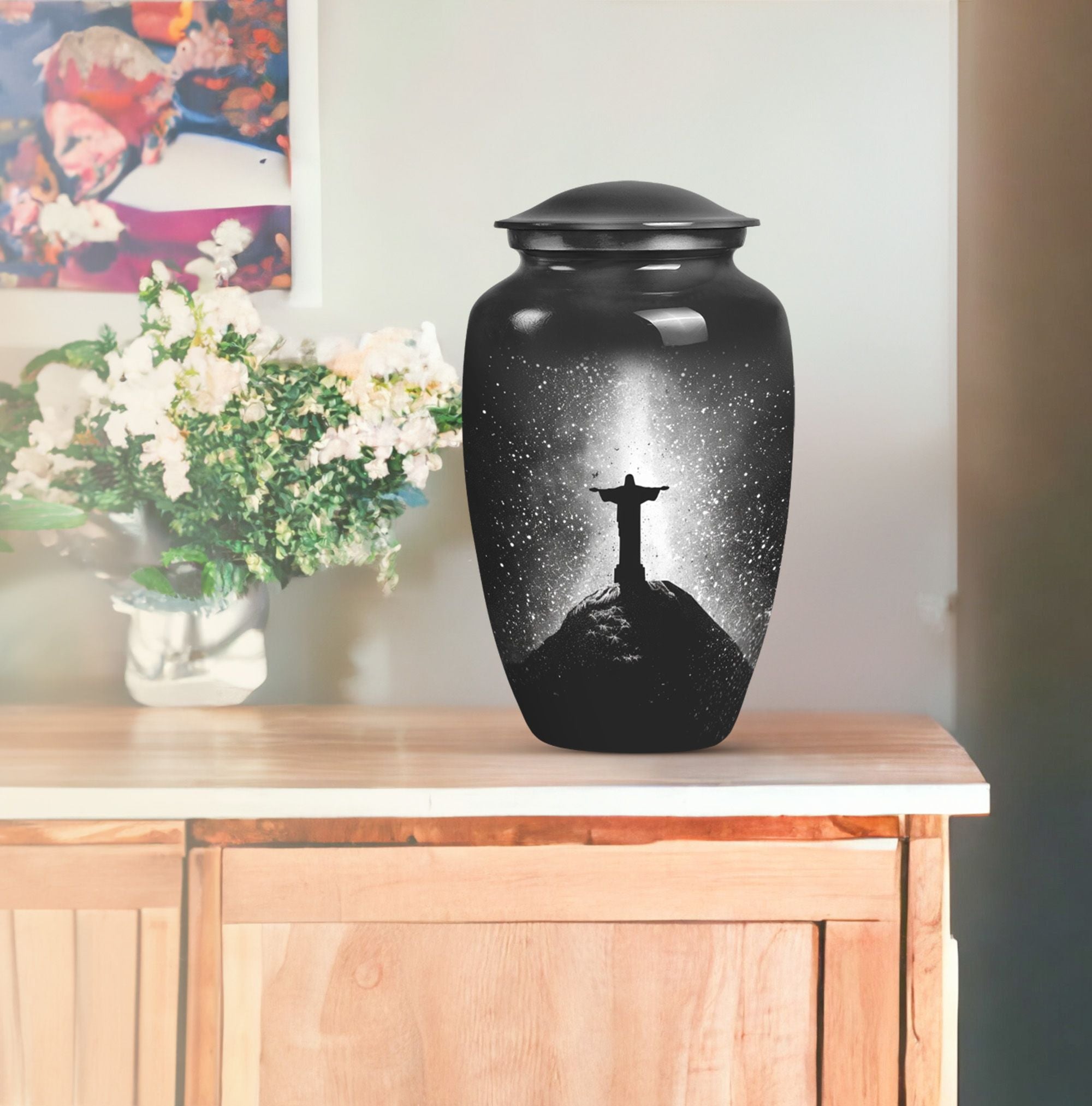 Immerse in a sense of serenity and remembrance with our exquisite Gramophone-themed cross urn, a perfect memorabilia urn for the eternal cherishing of your loved one's memories. It is a cremation urn crafted precisely to house ashes of an adult male weighing around 200 lbs, aligning perfectly with the size of 10 inches that fits in any setting gracefully. Each urn is superbly constructed from robust and lustrously finished aluminium, with a weight of just 3.3 pounds for convenient relocation. Unlike the commonplace, this urn is typecast as 'Large Urns,' inherently amplifying its uniqueness. A standout feature is the possibility of personalizing the piece with engraved names of your choice, adding a meaningful personal touch to this solemn memento. Each urn comes with a plush velvet pouch for containment of ashes, ensuring respectful and austere management of the remains. While the urn's eloquent manifestation speaks volumes, you may effortlessly carry it along your travels, favoring its portable nature. Mark your affectionate tribute with this extraordinary commemoration urn that underlines the perennial echo of memories.