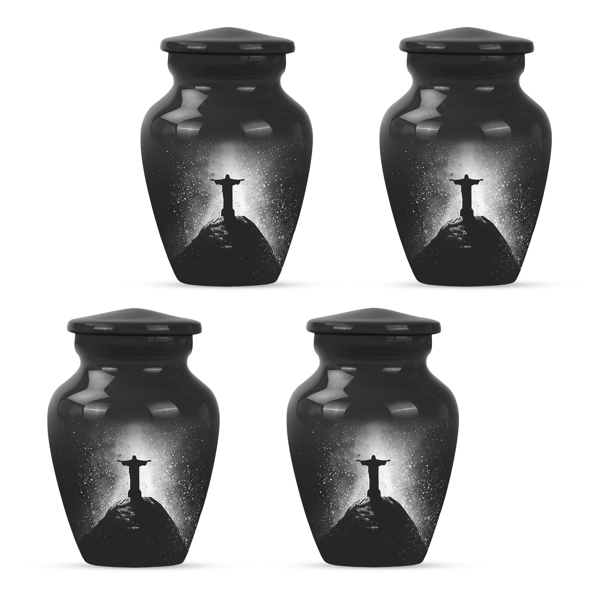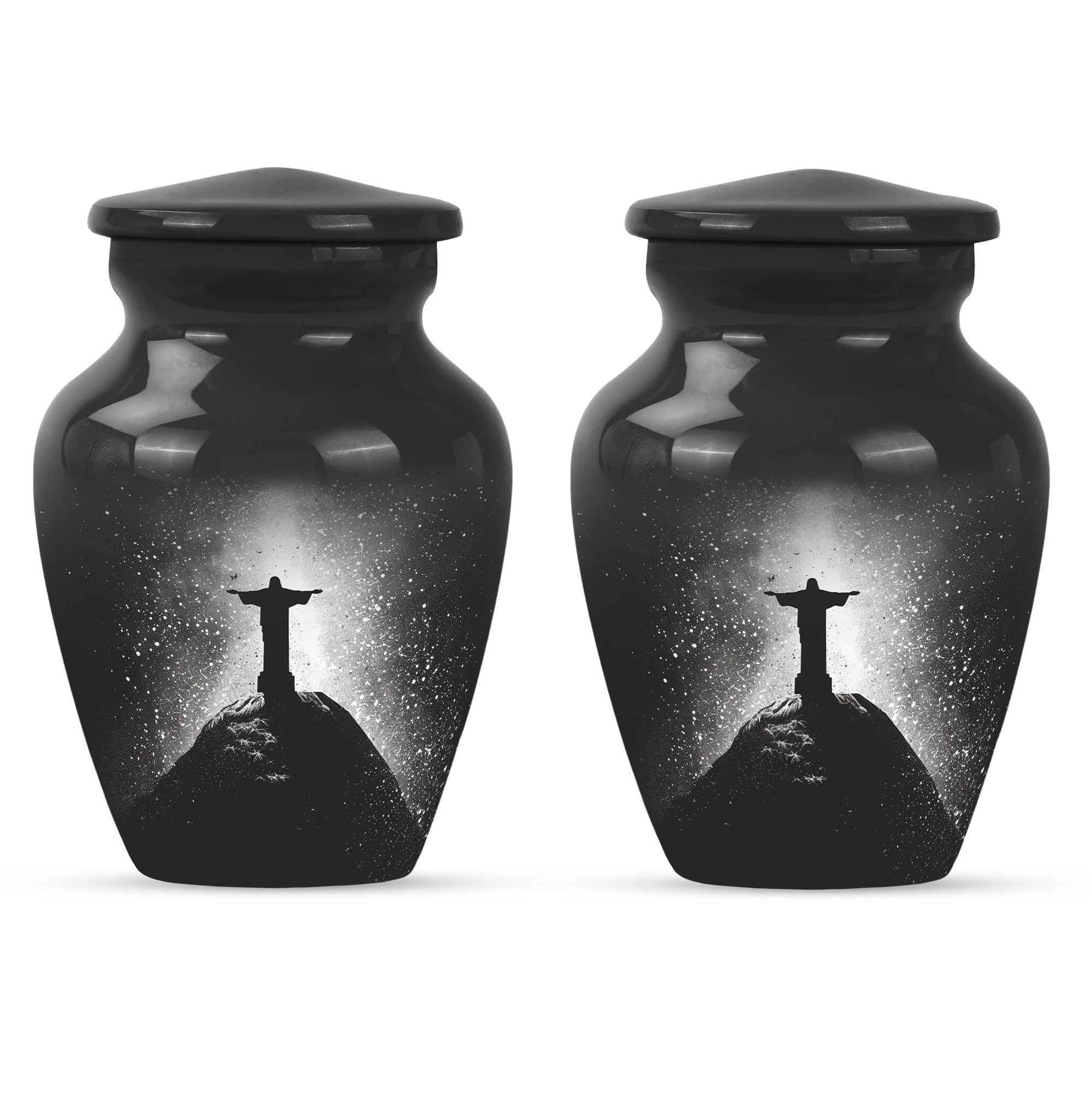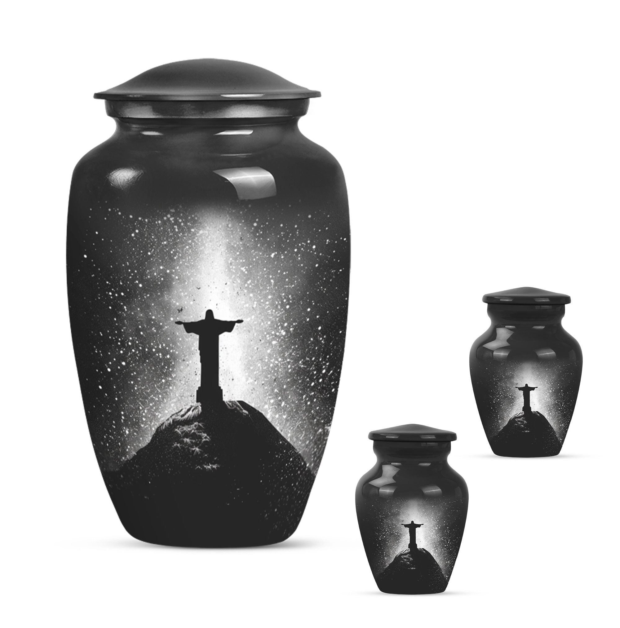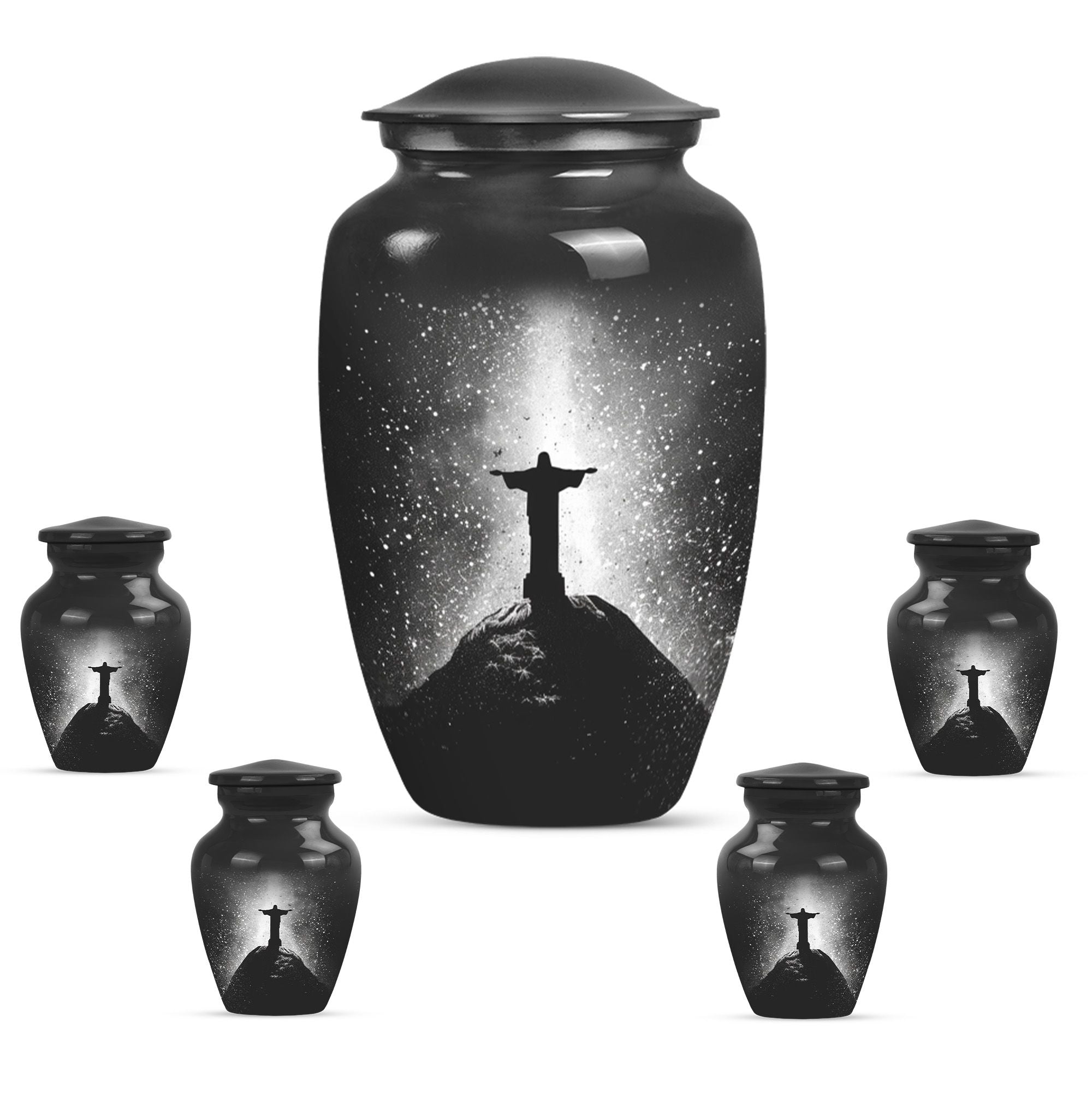 Immerse in a sense of serenity and remembrance with our exquisite Gramophone-themed cross urn, a perfect memorabilia urn for the eternal cherishing of your loved one's memories. It is a cremation urn crafted precisely to house ashes of an adult male weighing around 200 lbs, aligning perfectly with the size of 10 inches that fits in any setting gracefully. Each urn is superbly constructed from robust and lustrously finished aluminium, with a weight of just 3.3 pounds for convenient relocation. Unlike the commonplace, this urn is typecast as 'Large Urns,' inherently amplifying its uniqueness. A standout feature is the possibility of personalizing the piece with engraved names of your choice, adding a meaningful personal touch to this solemn memento. Each urn comes with a plush velvet pouch for containment of ashes, ensuring respectful and austere management of the remains. While the urn's eloquent manifestation speaks volumes, you may effortlessly carry it along your travels, favoring its portable nature. Mark your affectionate tribute with this extraordinary commemoration urn that underlines the perennial echo of memories.