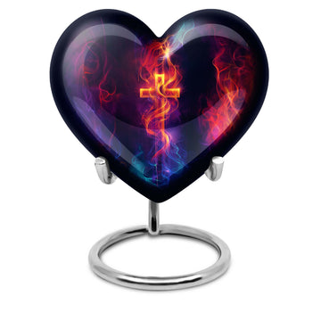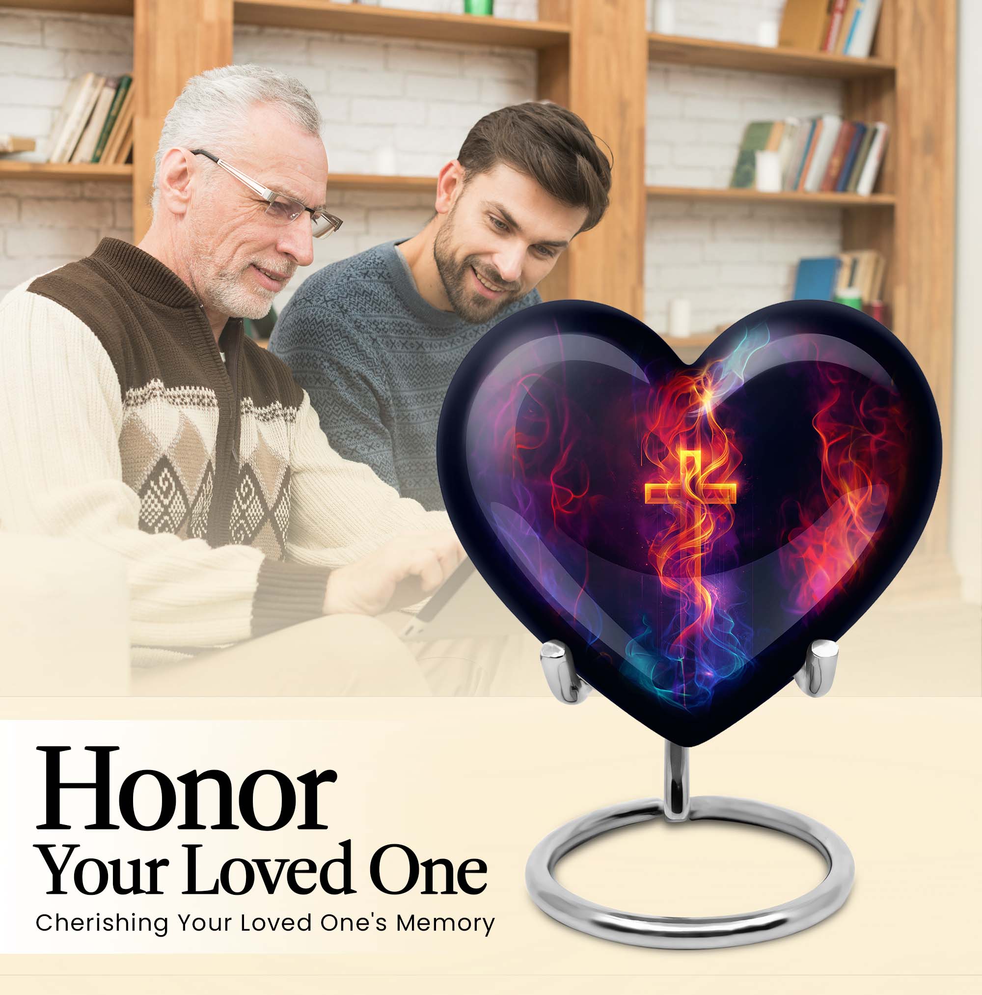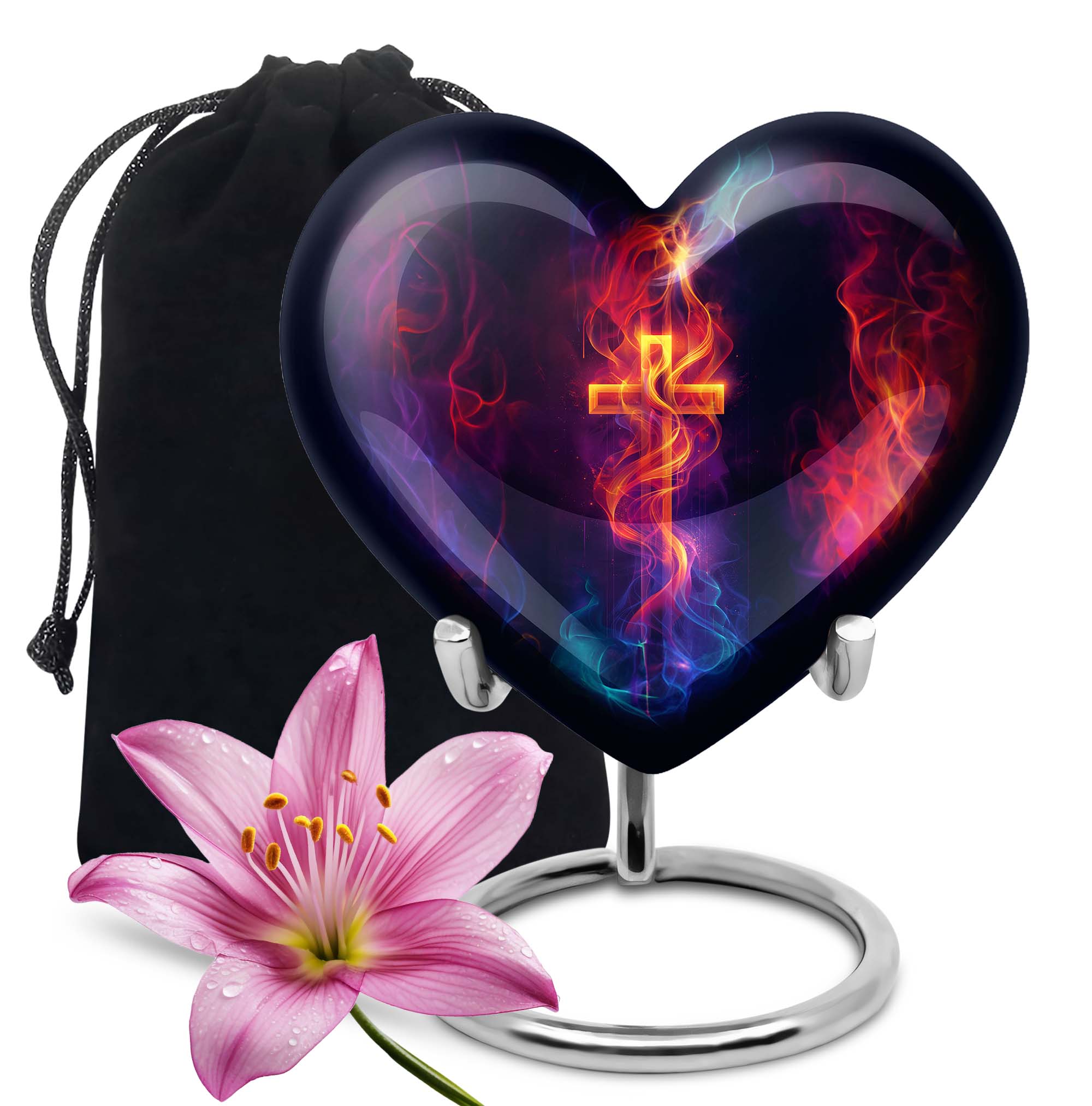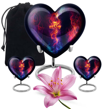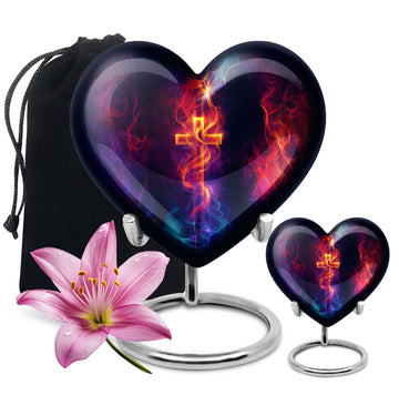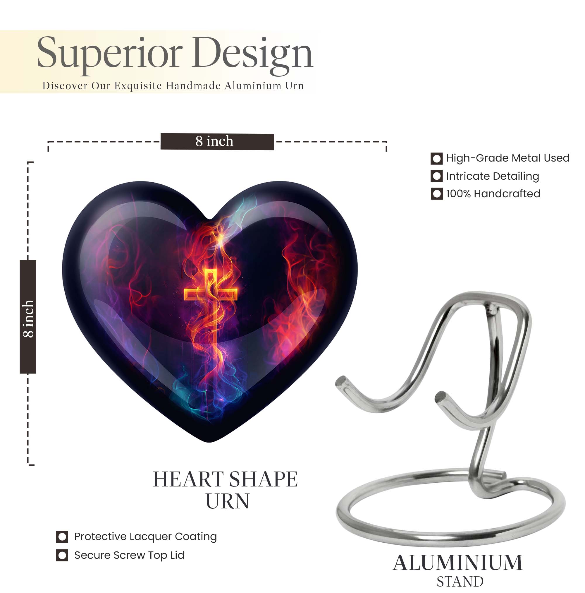Pay a heartfelt tribute to your departed loved ones with our distinguished cross urn. This sizeable cremation urn stands 10 inches tall and weighs 3.3 pounds, with a substantial capacity to contain up to 200 cubic inches. The urn is meticulously crafted from high-quality aluminium, ensuring it stands the test of time. The captivating 'Aurora Borealis' theme lends an air of divine serenity, making it a fitting memorial urn for both men and women. With a unique heart-shaped design, the urn is more than just a final resting place: it's a symbol of everlasting love and respect. It comes accompanied by a velvet pouch for secure containment of ashes. Moreover, this large urn offers customization options - personalize it with engraved names to create a lasting memory of your loved ones. Whether you're seeking urns for adult human ashes or specifically designed metal urns for human ashes, this product is an exceptional choice. Note: The urn design and size may not account for the entire design feature.