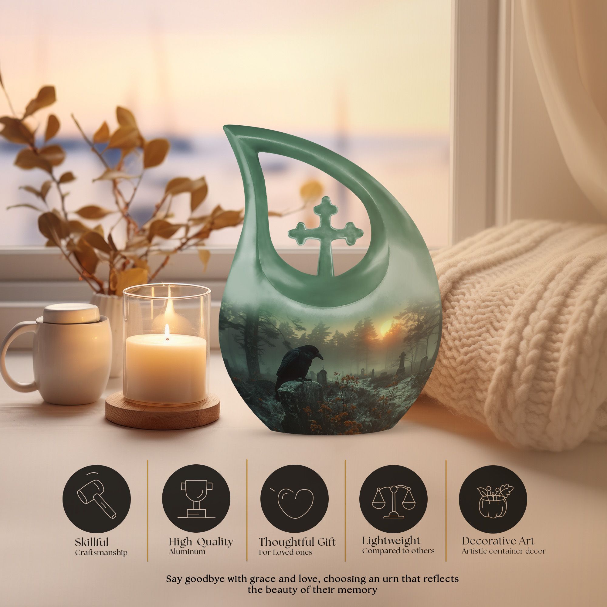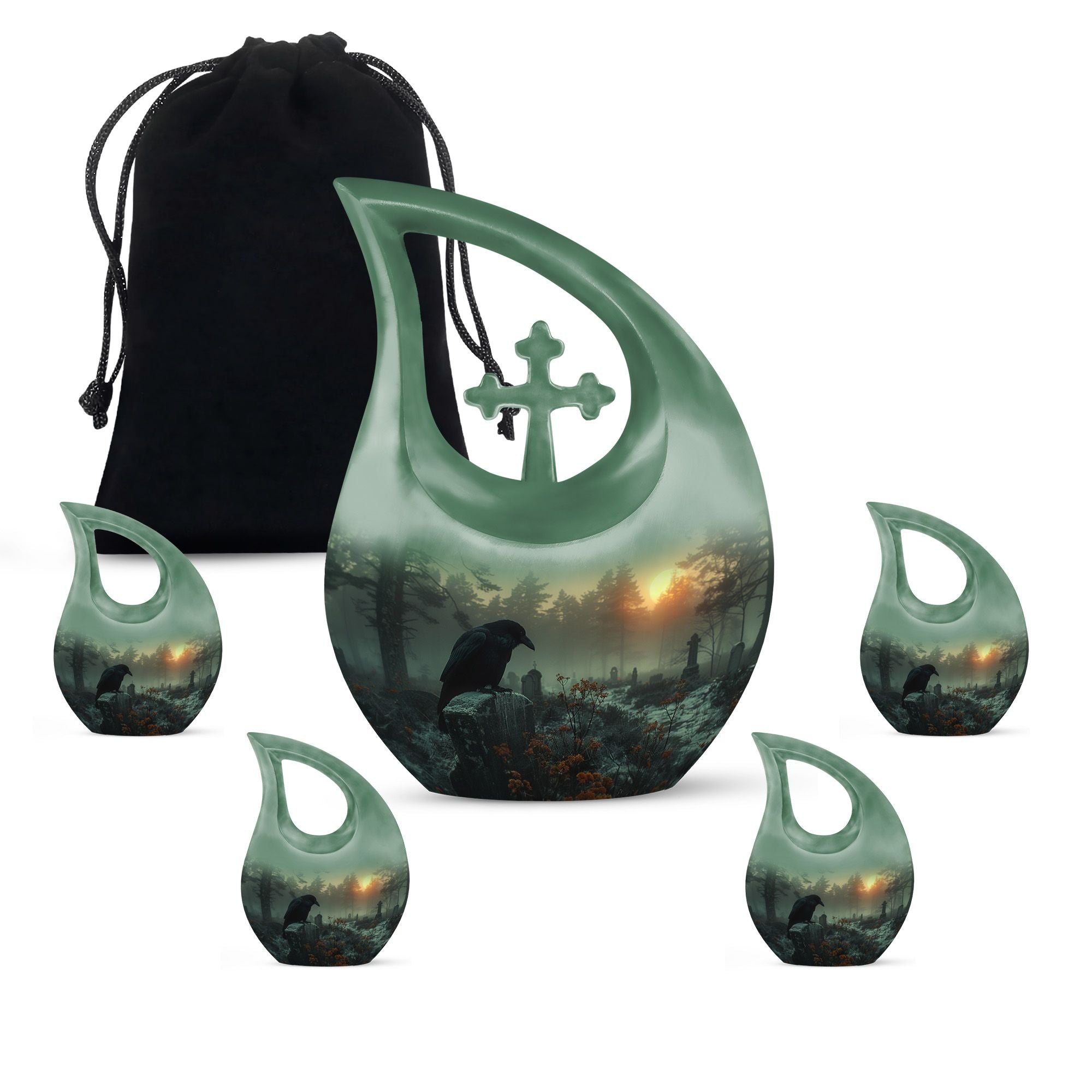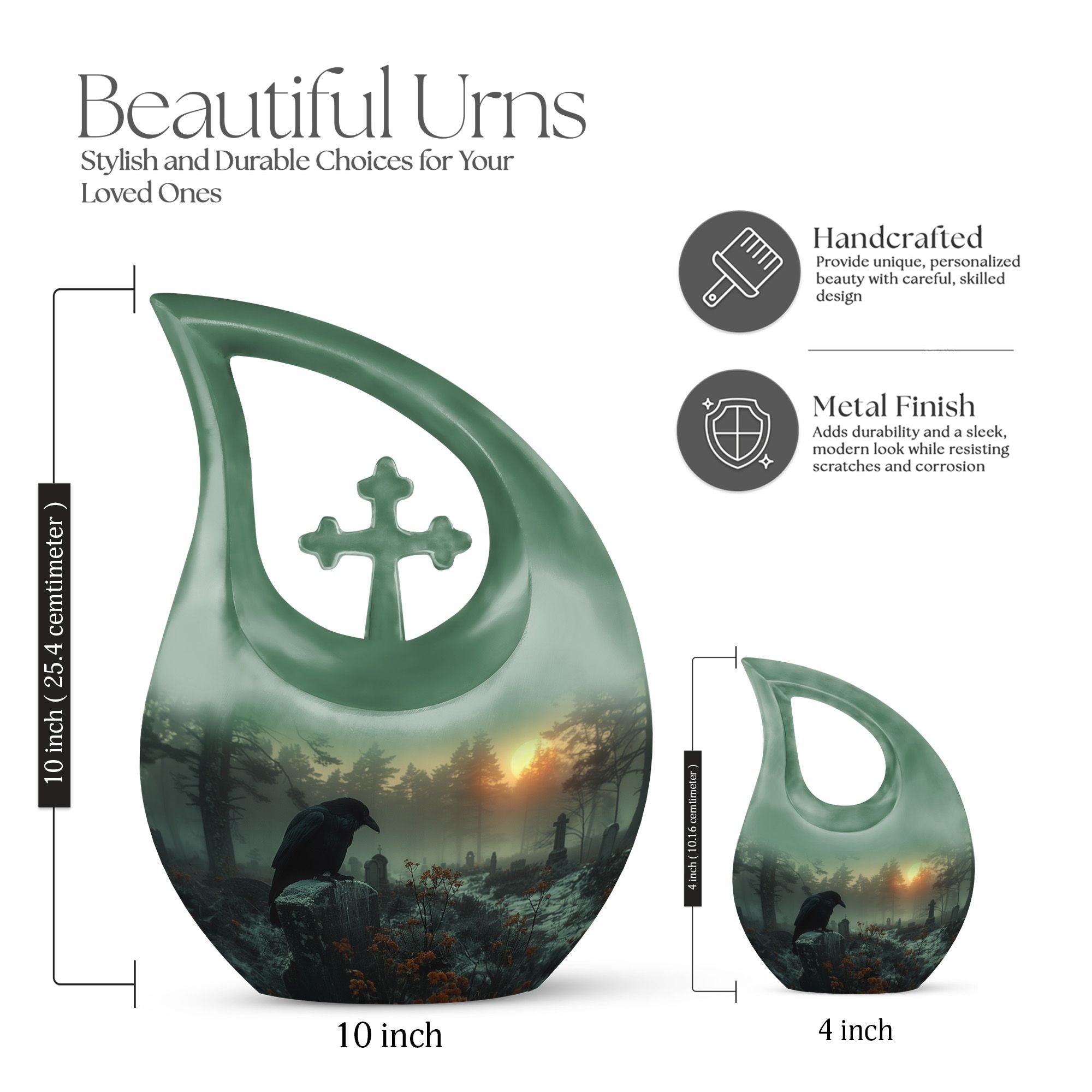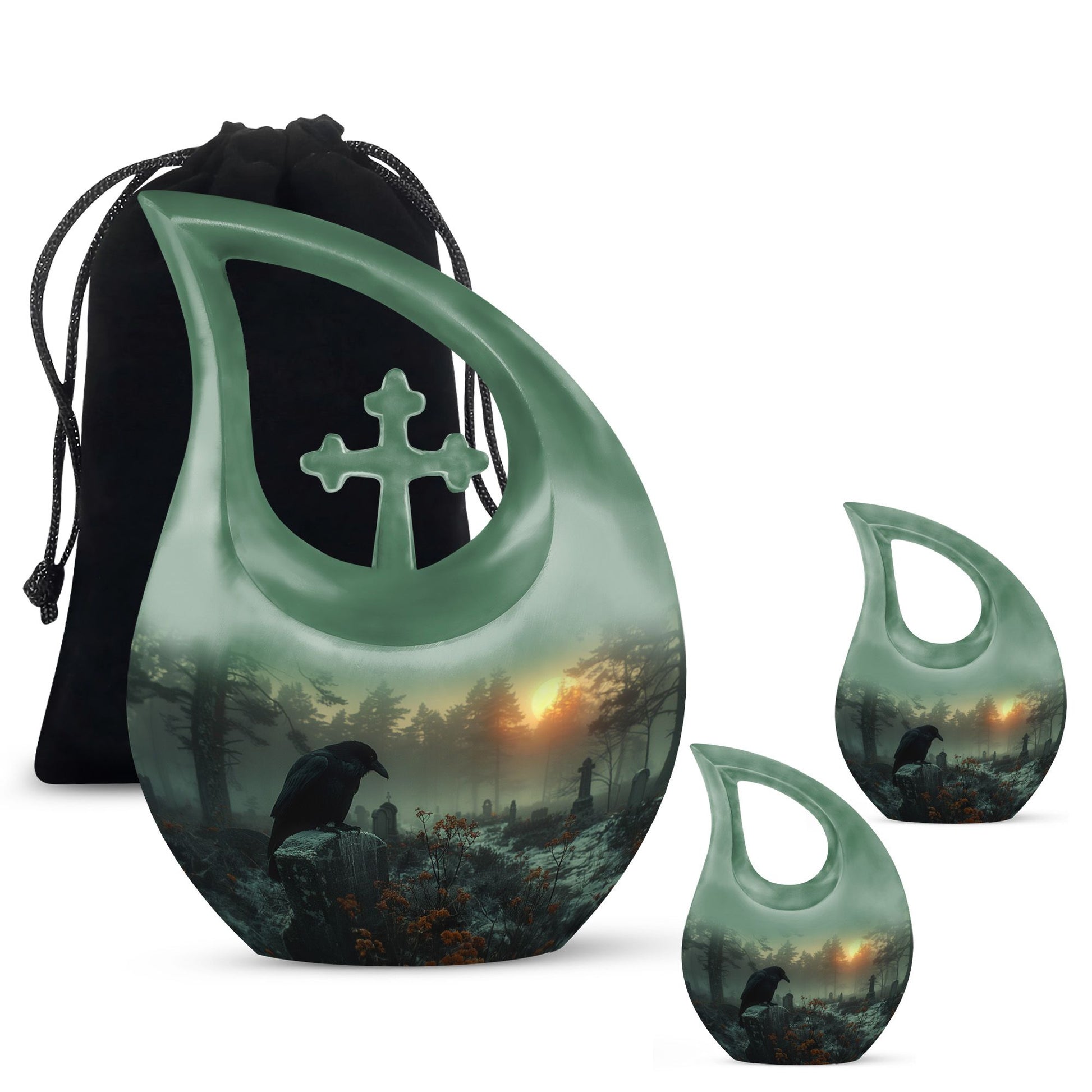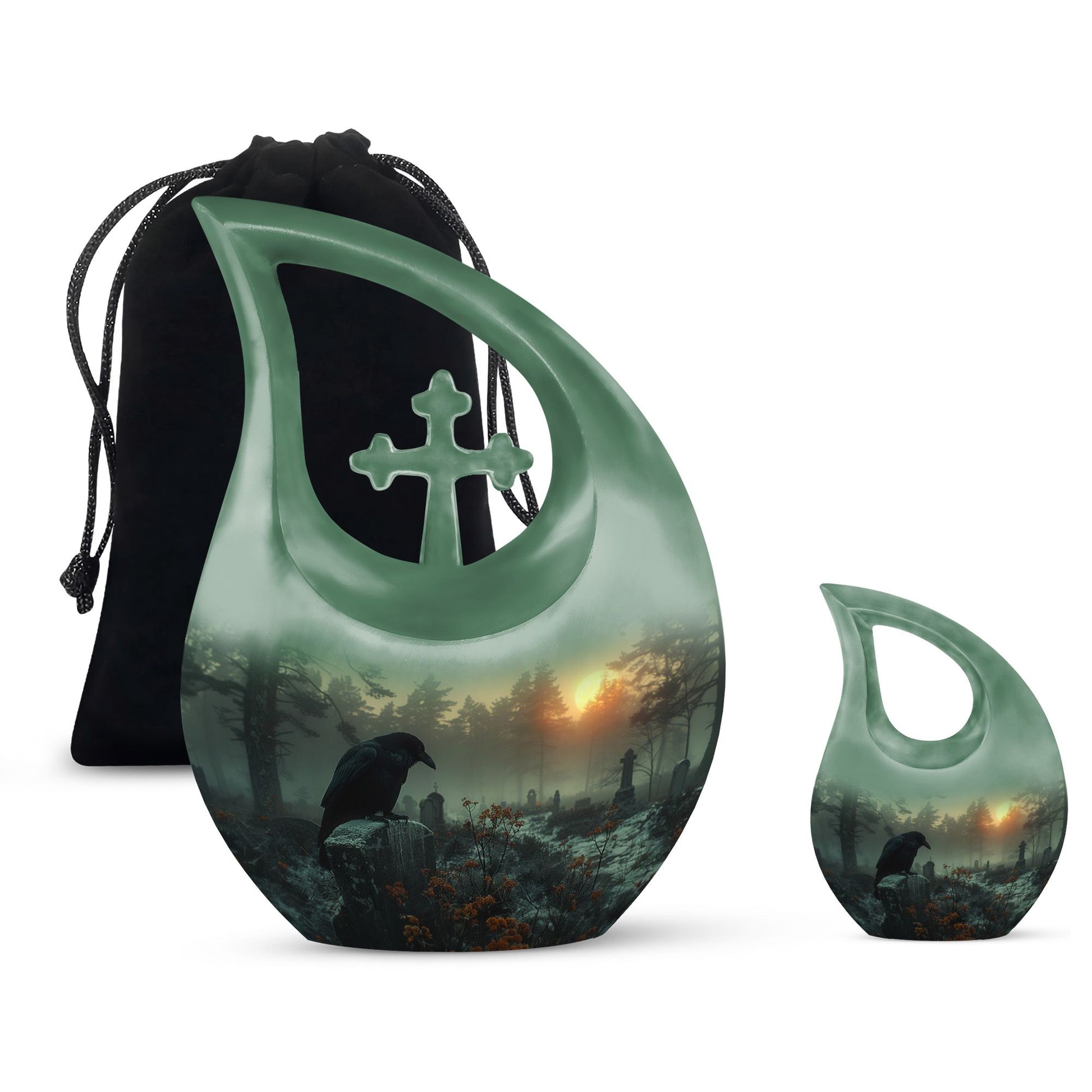Expertly crafted from durable aluminum, this 10 inch memorial urn features a dramatic crow silhouette perched within a quiet graveyard scene—an artistic symbol of memory and transition. The secure screw-top lid ensures dependable protection, making it suitable for cremation urns for humans, cremation urn adult human memorials, or cremation urns for human ashes adult black designs. Matching keepsake options support cremation keepsake urns for ashes, cremation urns with keepsake sets, or cremation urns for human ashes adult small, providing a complete arrangement for shared remembrance.