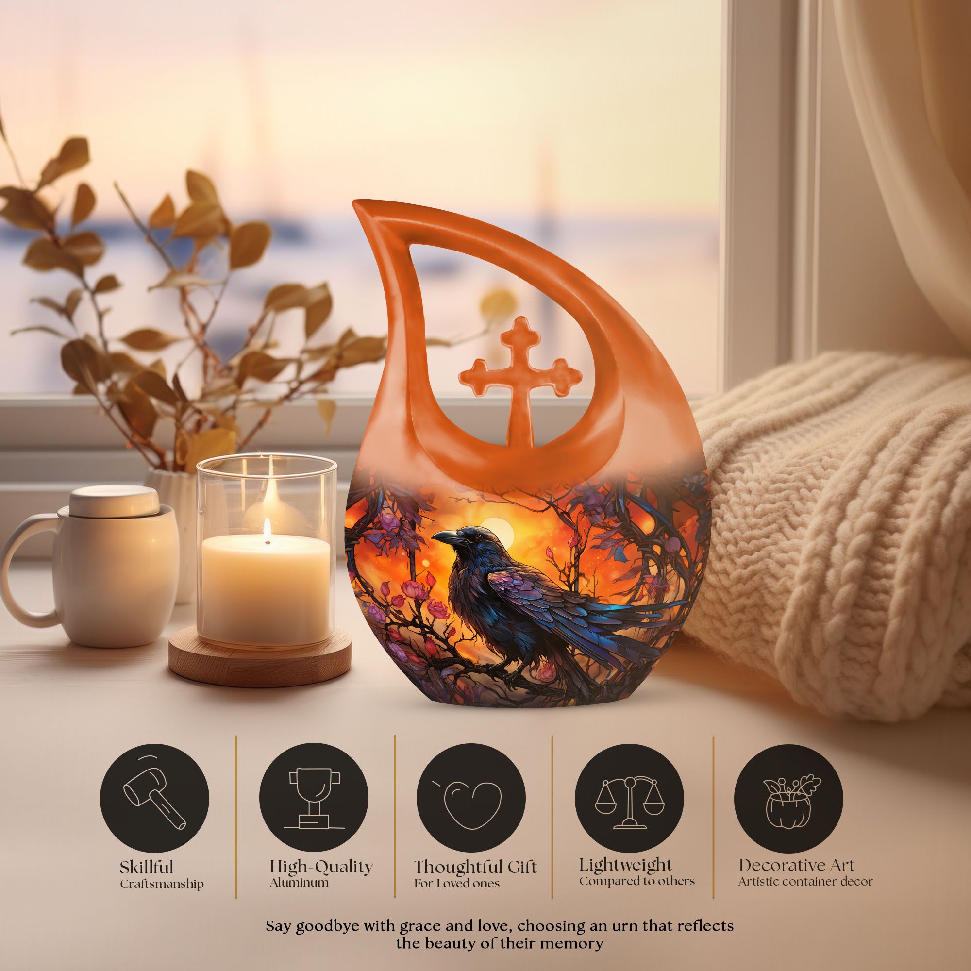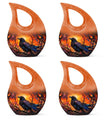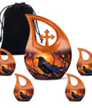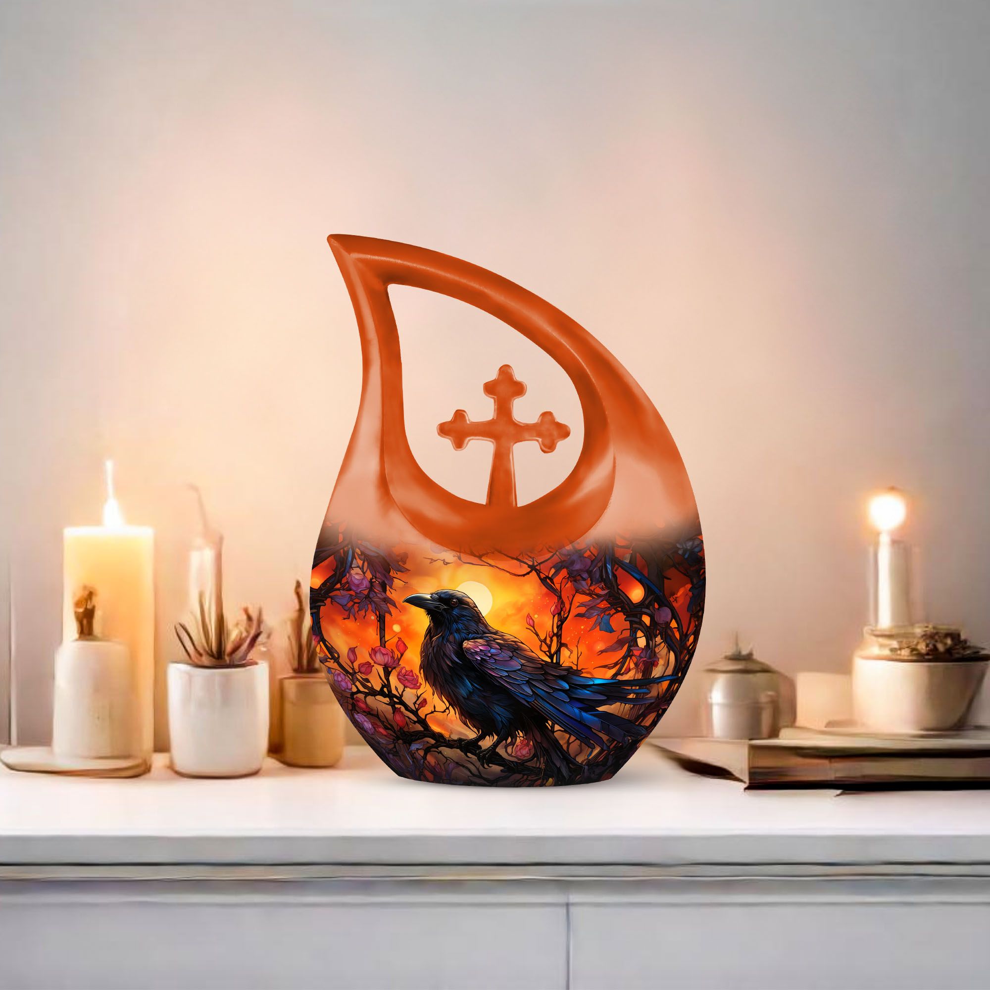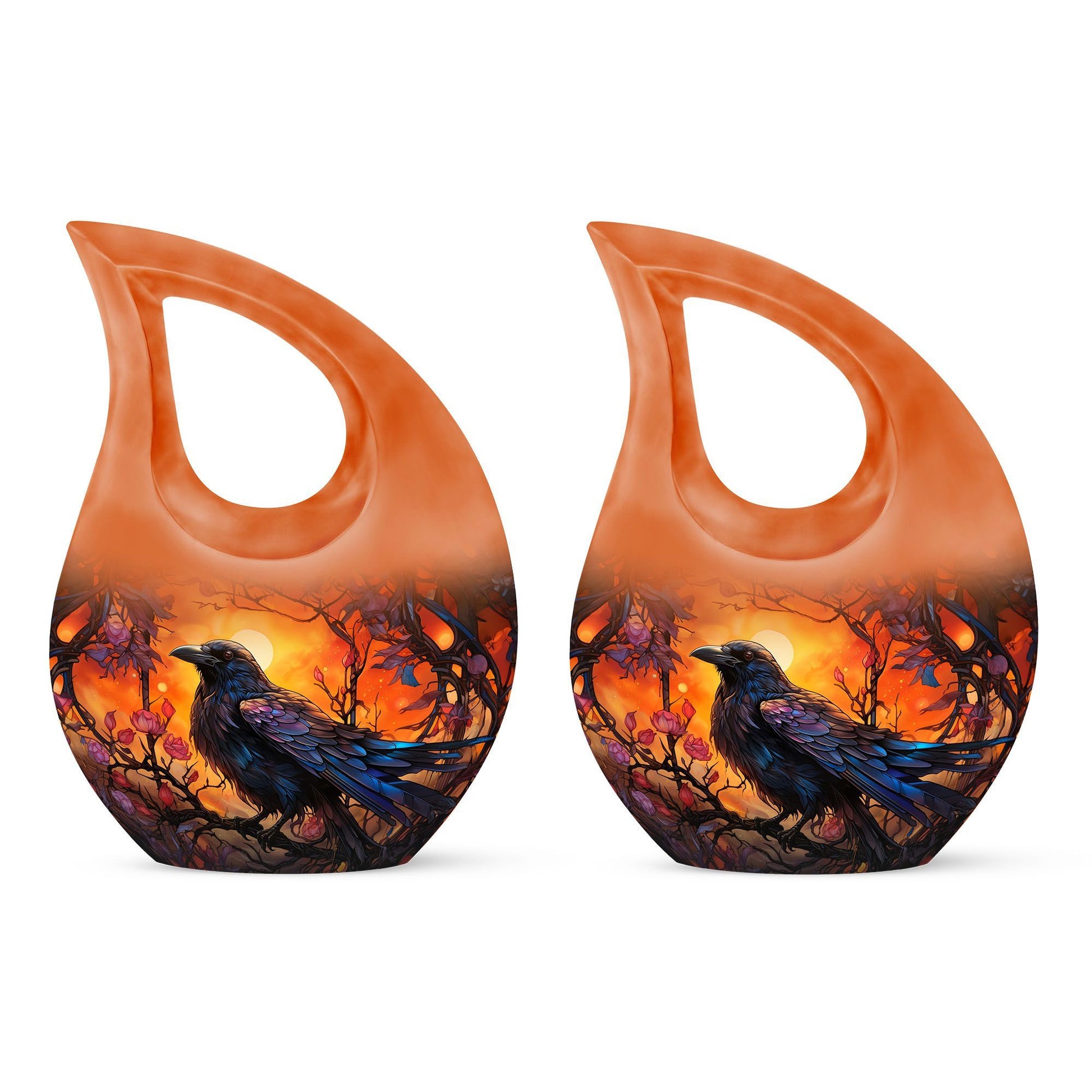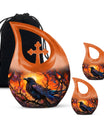Expertly handcrafted from premium aluminum, this memorial ashes keepsake features a vivid orange tone complemented by the silhouette of a crow against a twilight sky. The durable material and secure screw-top lid ensure ashes remain safe and preserved. Ideal for home memorials or burial, this urn also pairs beautifully with matching keepsake urns for ashes, allowing families to share cherished memories through smaller pieces like a mini urn for mom ashes or keepsake urns for human ashes dad.