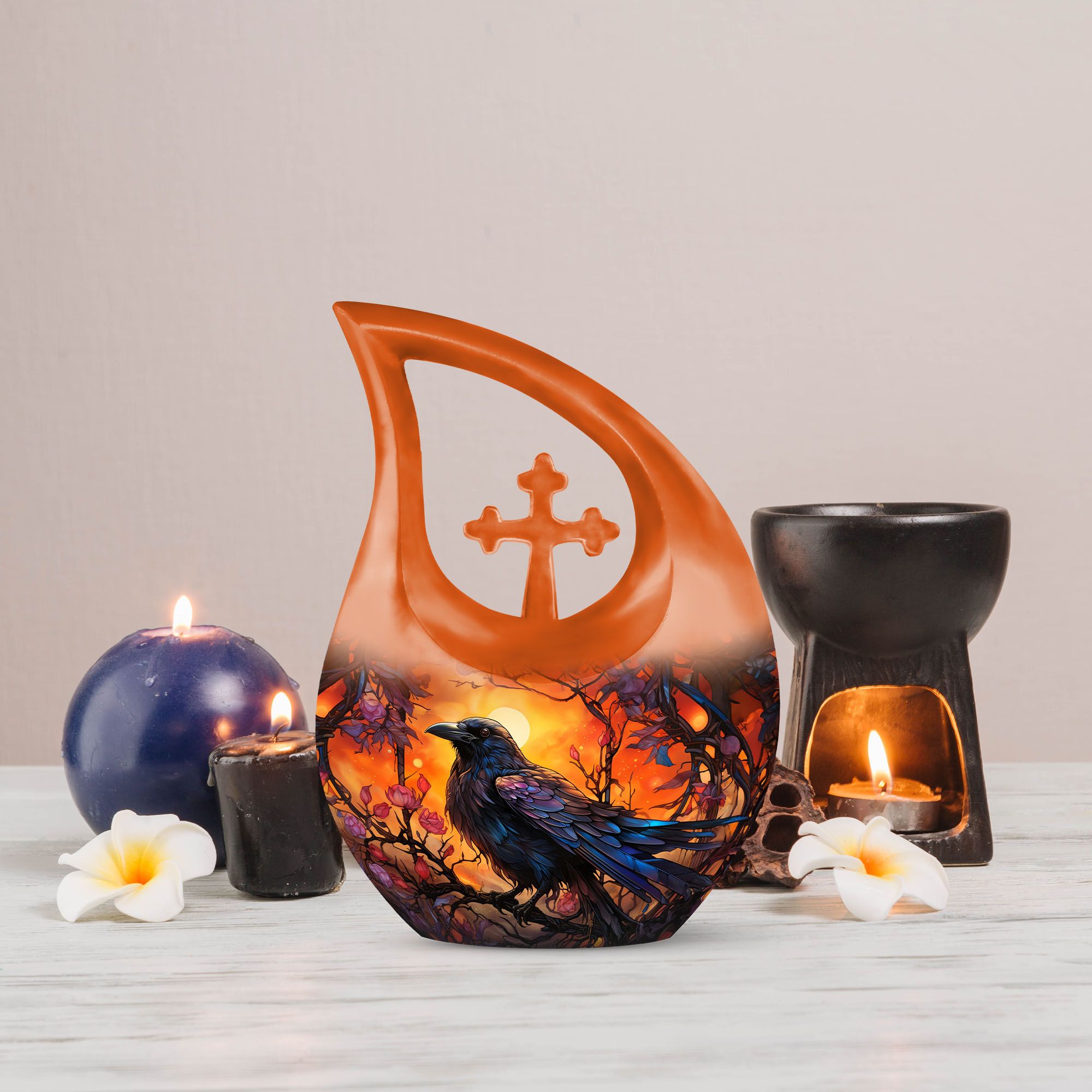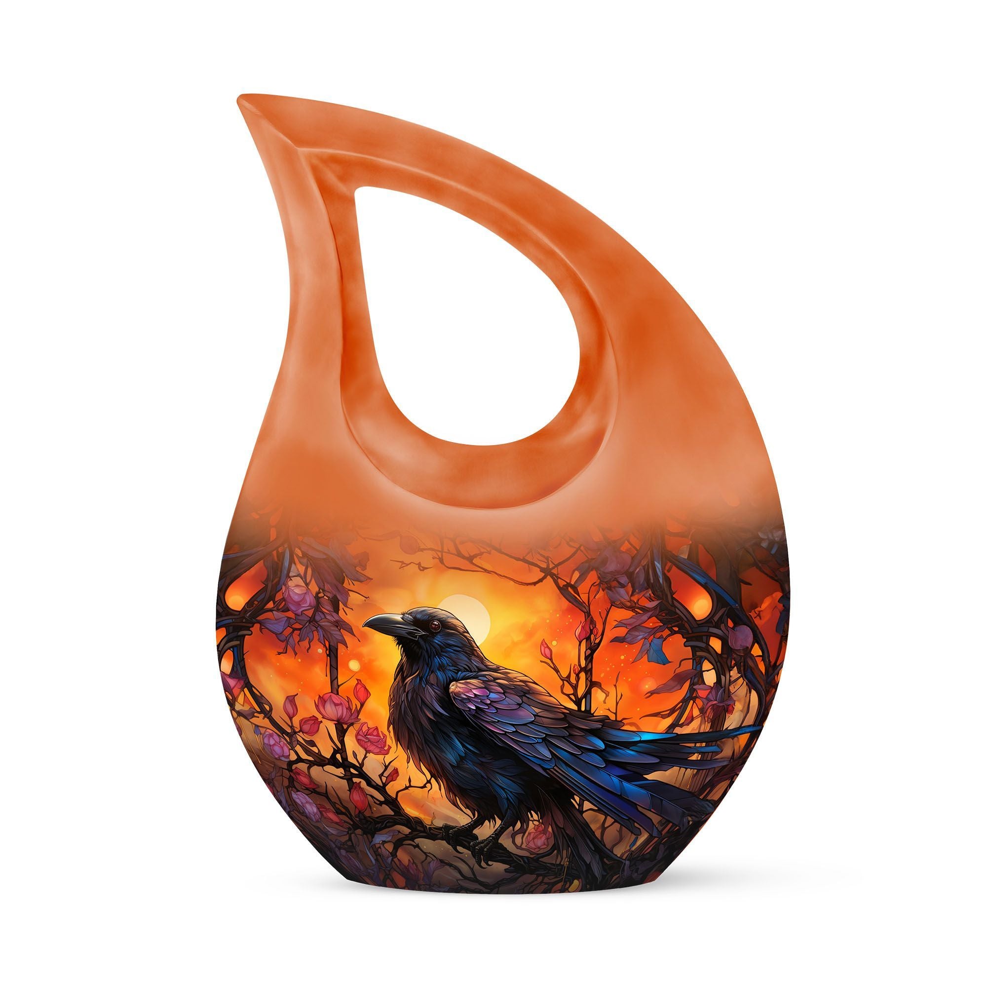 The Crow Themed Urn for Human Ashes is a striking tribute crafted for those who admired the symbolism of the crow — a messenger of transformation, protection, and eternal connection. Designed with deep orange hues and bold artistry, this urn for ashes keepsake embodies strength and wisdom, making it a meaningful choice for honoring a beloved father, husband, or friend.