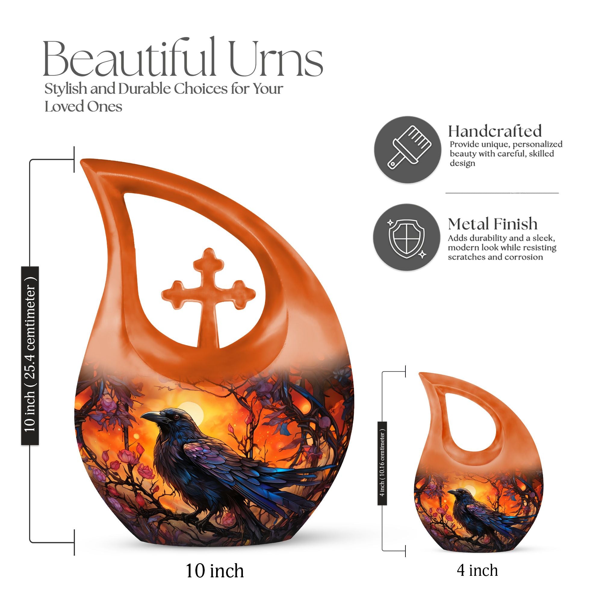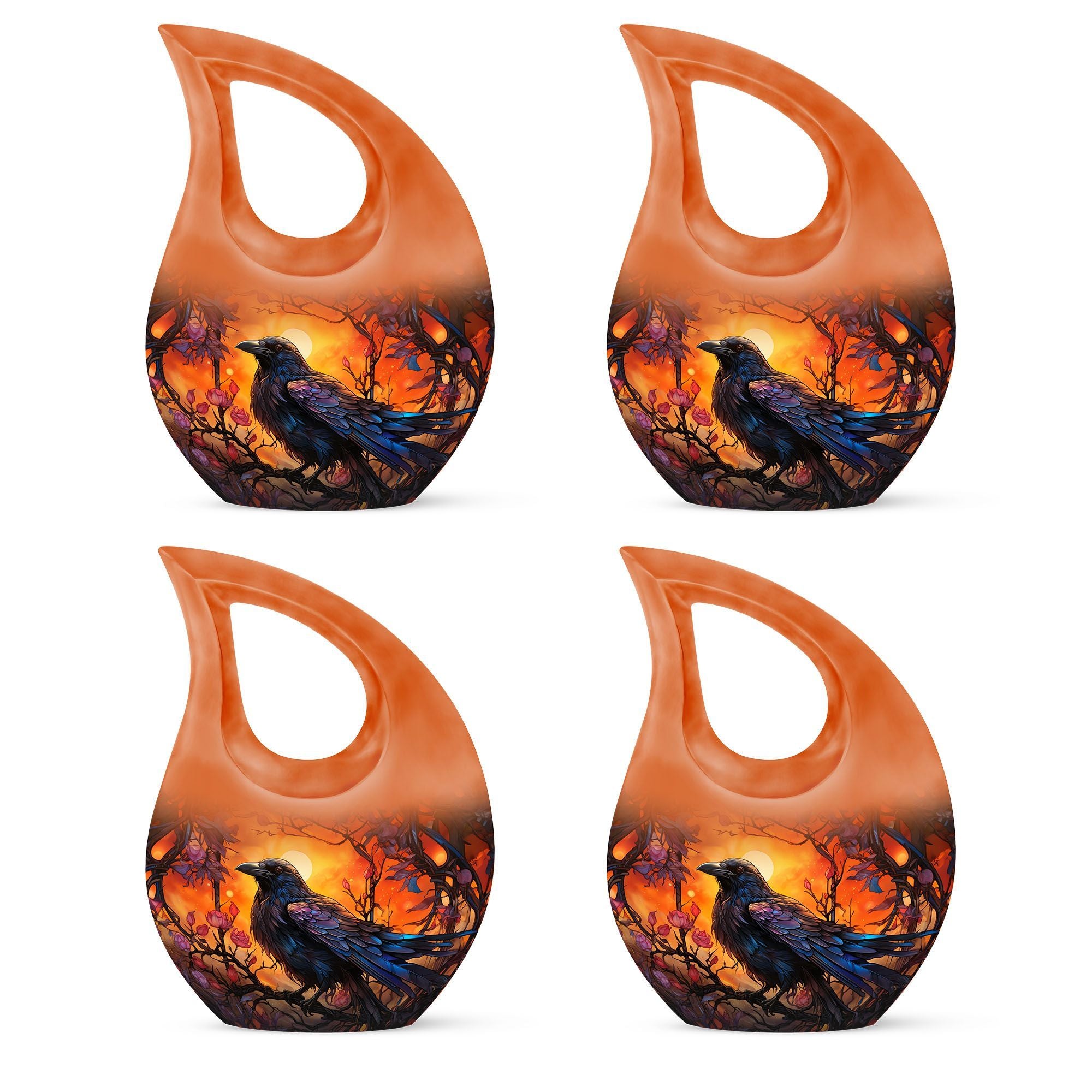 Expertly handcrafted from premium aluminum, this memorial ashes keepsake features a vivid orange tone complemented by the silhouette of a crow against a twilight sky. The durable material and secure screw-top lid ensure ashes remain safe and preserved. Ideal for home memorials or burial, this urn also pairs beautifully with matching keepsake urns for ashes, allowing families to share cherished memories through smaller pieces like a mini urn for mom ashes or keepsake urns for human ashes dad.