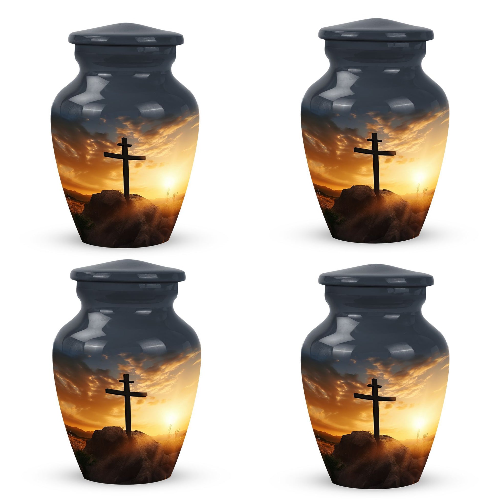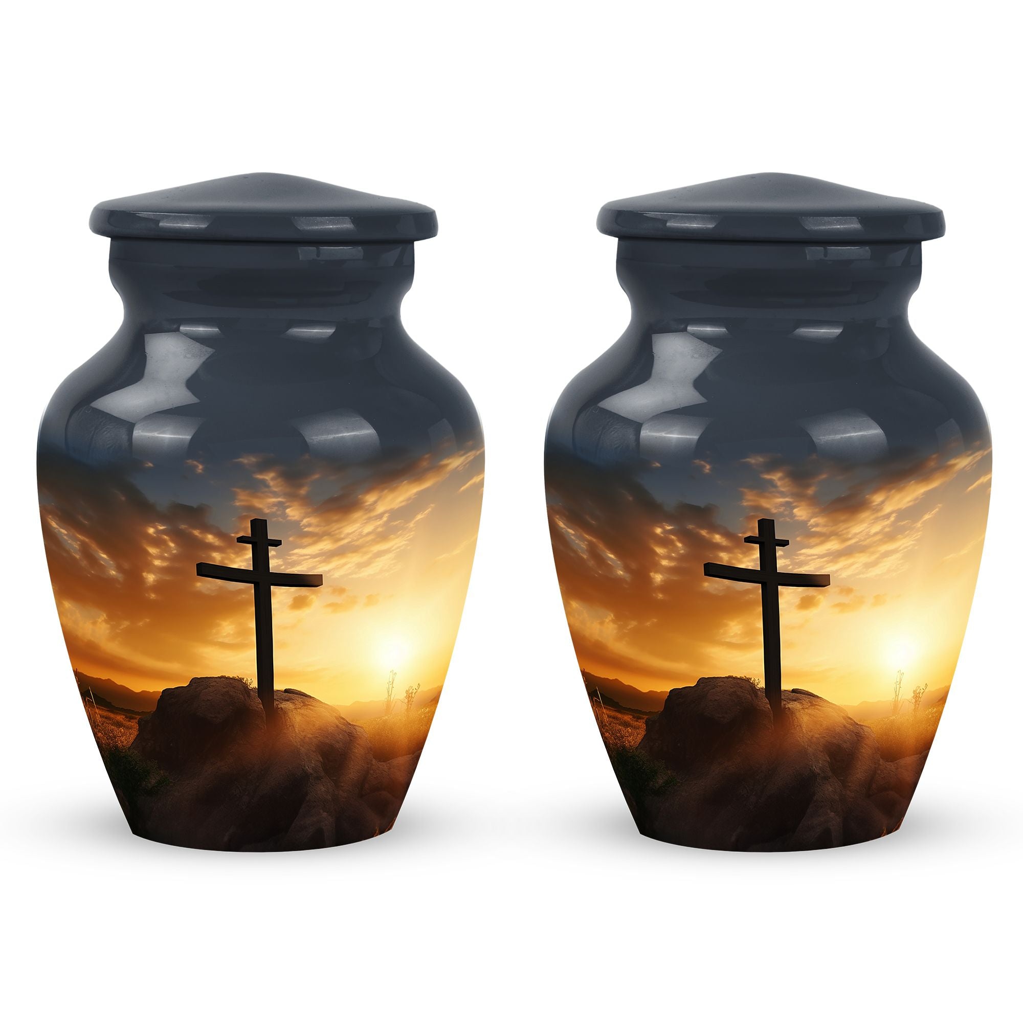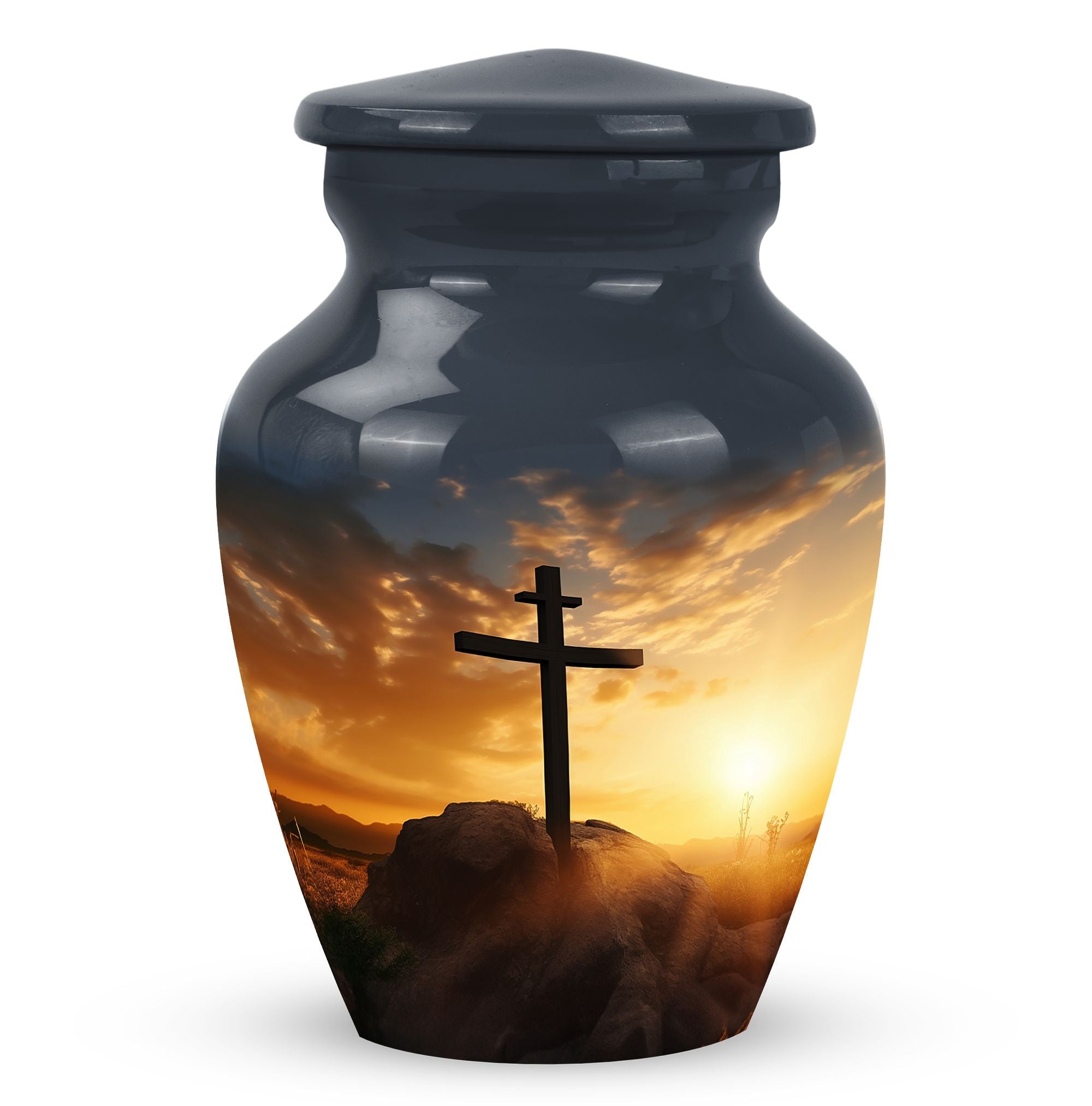 Experience the sanctity of remembering your loved one with our 3-inch Crucifixion of Jesus Christ Urn meant for storing human ashes. This keepsake urn, weighing a considerable 3.3 pounds and standing tall with dimensions of 10 inches in height, is designed to hold up to 200 cubic inches of cremated remains. Crafted from durable aluminium, the classic urn design offers both elegance and longevity. Each of our memorial urns comes with a companion velvet pouch, providing a secure containment for the sacred ashes. The highlight of our urn is the doorstep customization offer, where you can personalize it with engraved names, celebrating the moments cherished with the departed. An important member of our 'large urns' collection, this urn is the perfect choice not just for moms but for anyone precious who has moved on to the heavenly abode. Our urns for cremated remains seamlessly blend practicality with an emotional touch. Get ready to preserve your memories with our tangible tribute to your loved ones.