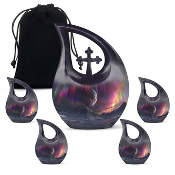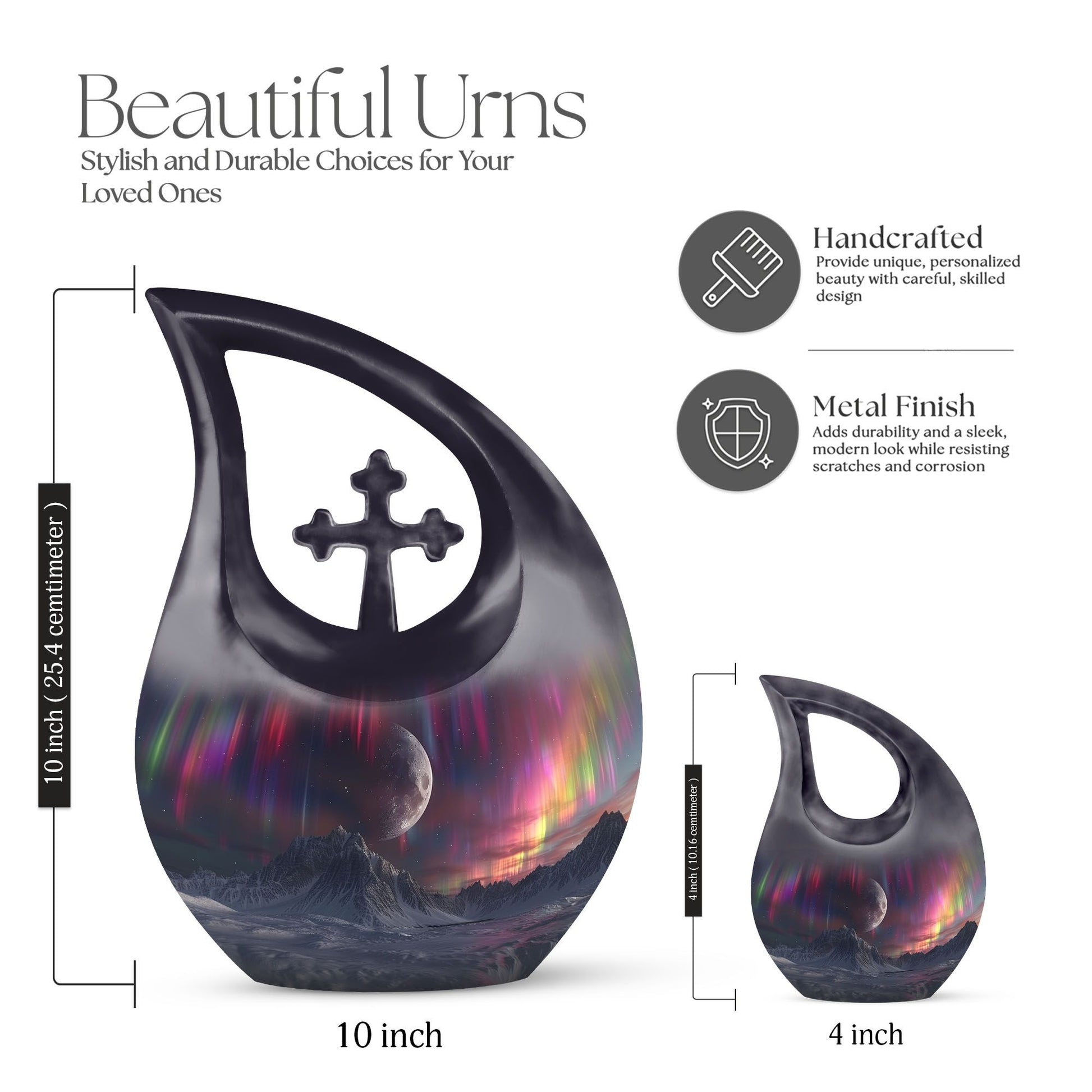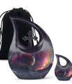Expertly handcrafted from high-quality aluminum, this funeral adult urn reflects exceptional artistry and durability. The lustrous Northern Lights pattern swirls across a deep celestial background, representing the cosmic journey of the soul. Both the large and small funeral urns in this set feature a secure screw-top lid, ensuring your loved one’s ashes are protected with care. Ideal for home display, burial, or sharing ashes among family members, these keepsake funeral urns combine elegance and functionality.