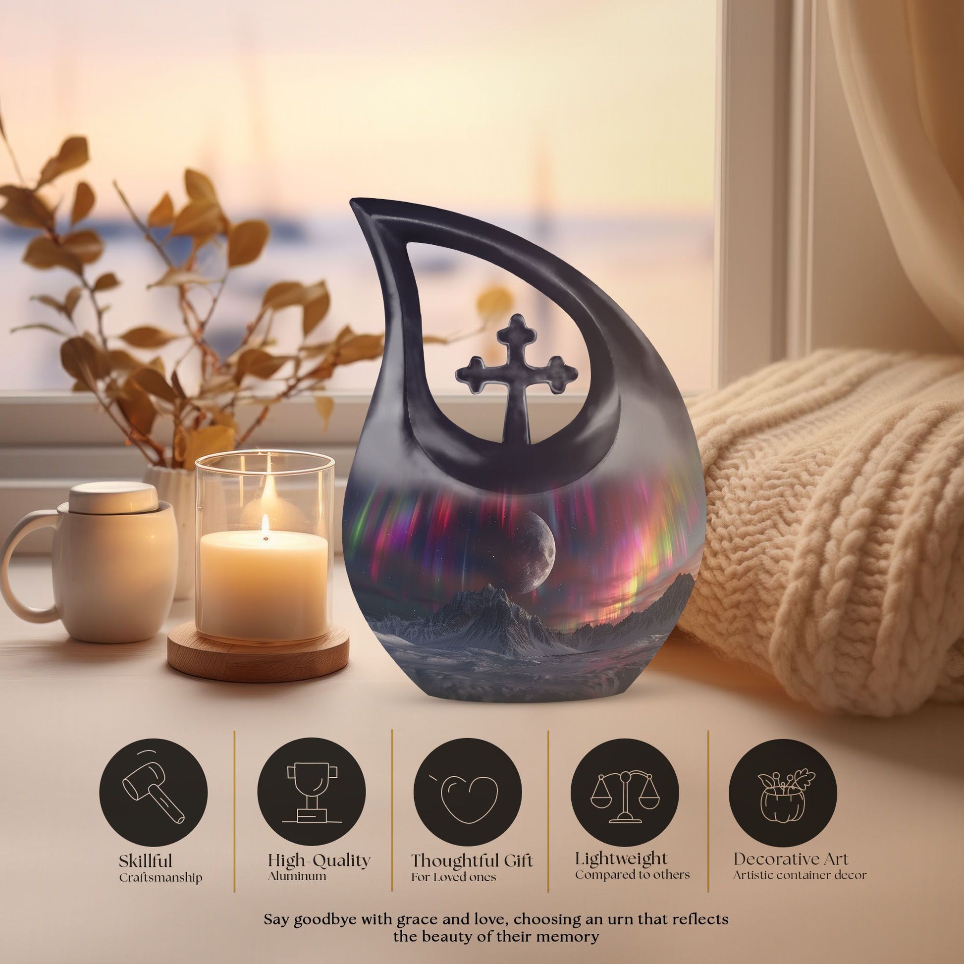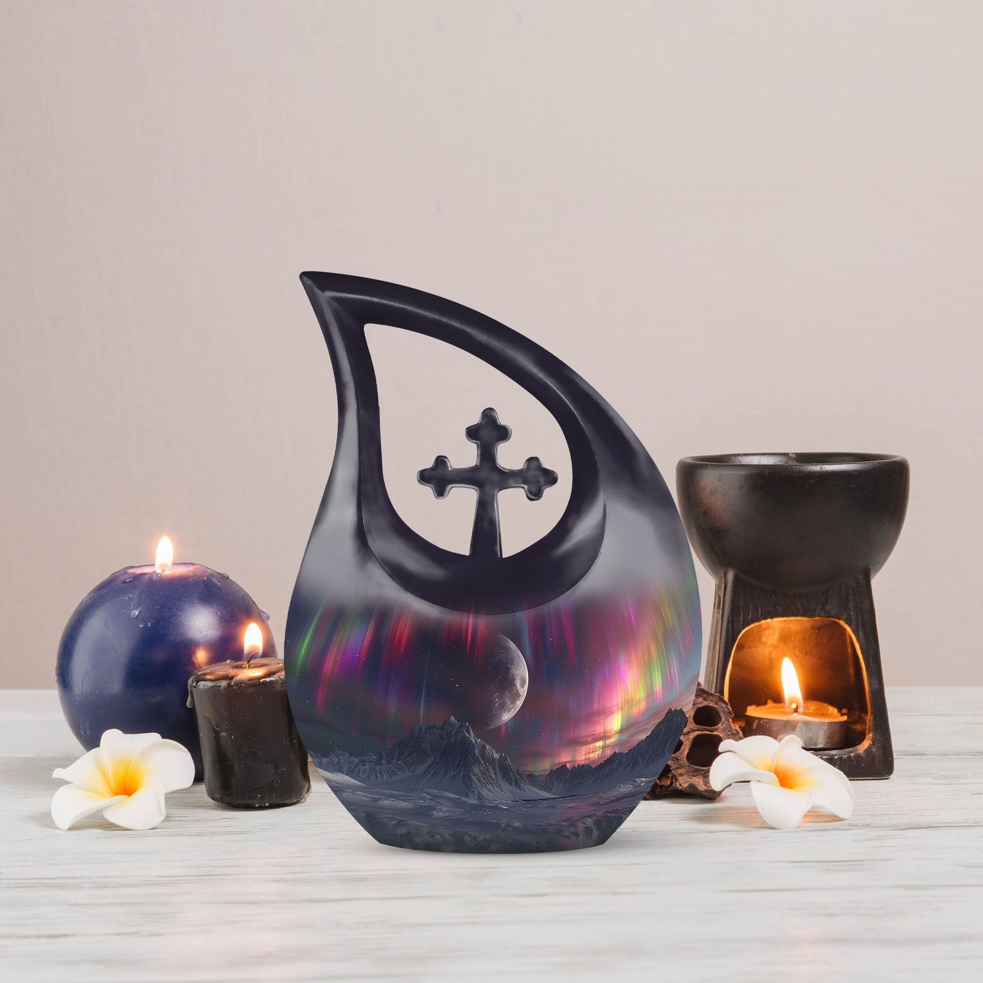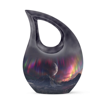 The Northern Lights Half Moon Urn is a radiant tribute that captures the breathtaking beauty of the aurora night sky. Designed to symbolize eternal peace and everlasting love, this exquisite piece provides a dignified resting place for your loved one. Whether chosen as funeral urns for ashes adult or as a cherished funeral urn ashes keepsake, it embodies compassion, serenity, and remembrance.