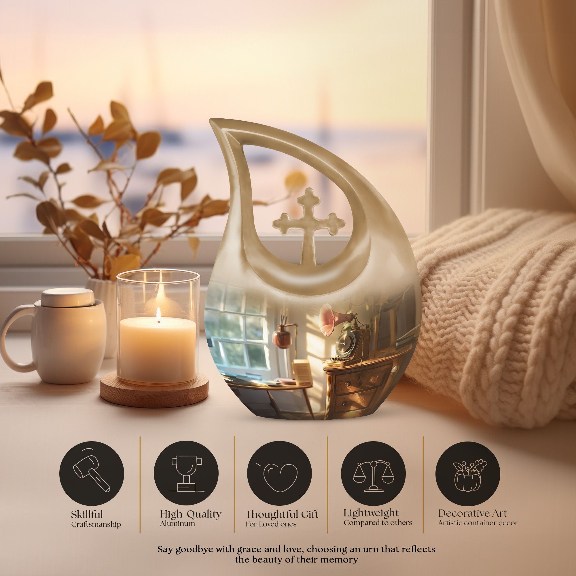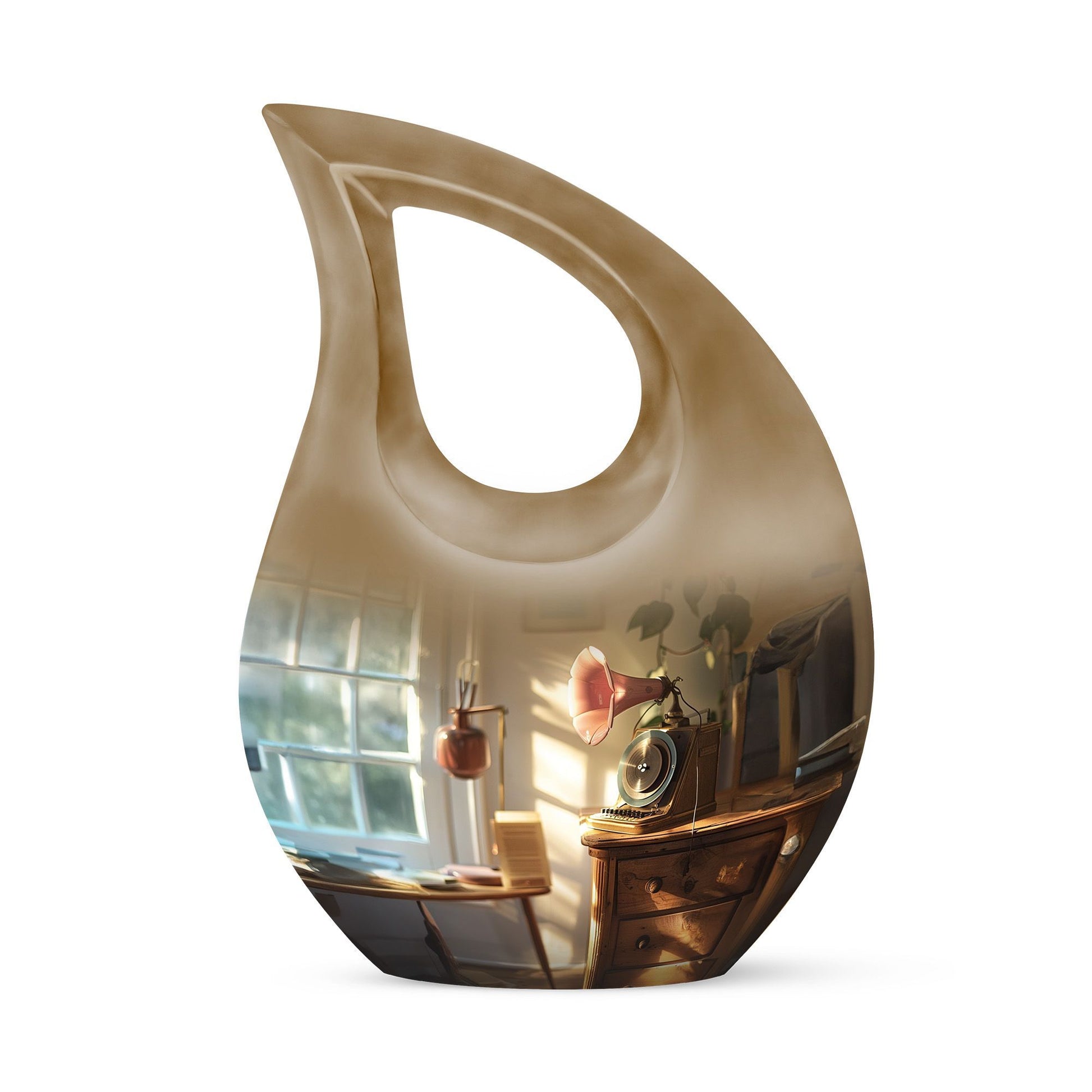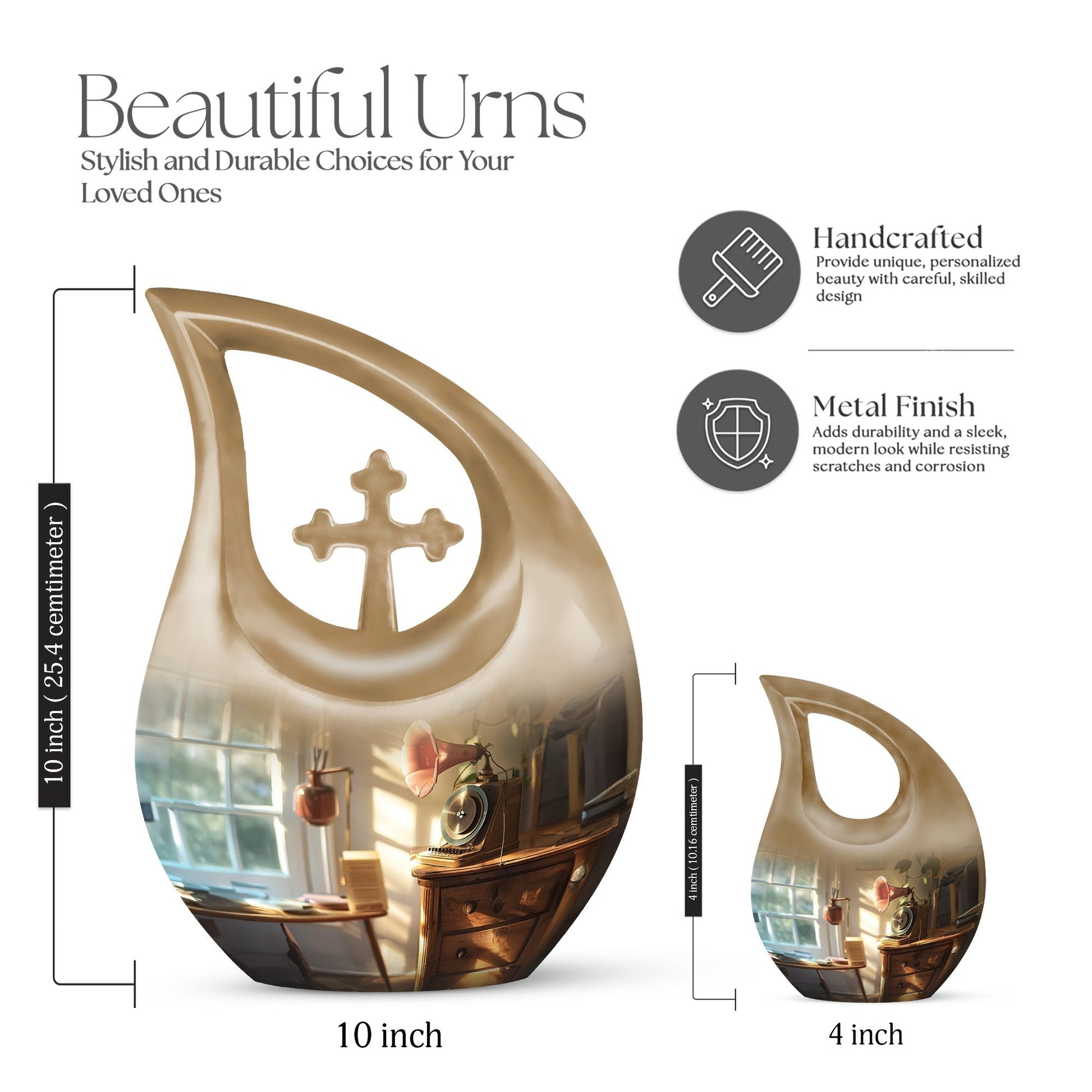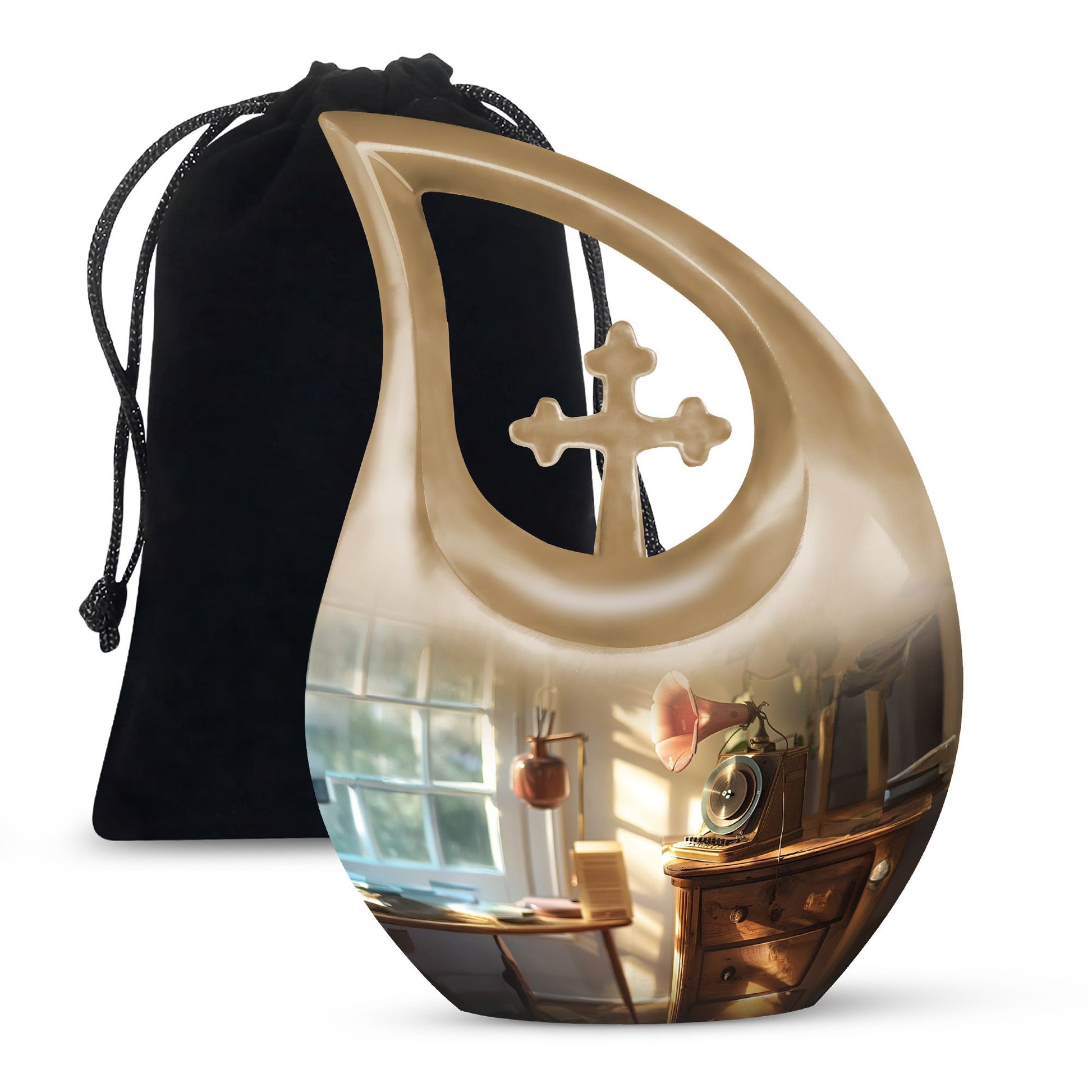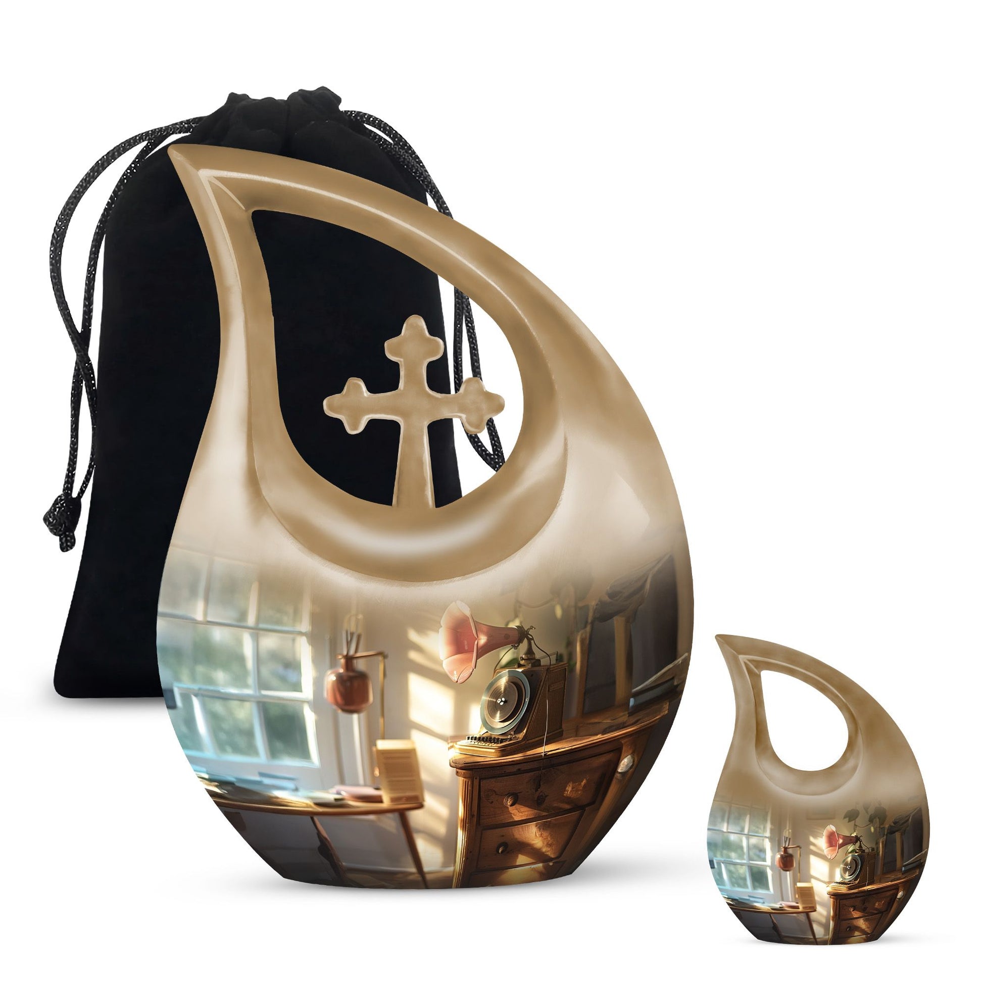 Embrace the beautiful craftsmanship embodied in this astounding 10-inch Gramophone Urn, offering reverence and remembrance through an exceptional design. Constructed using premium quality aluminium, the large urn ensures lasting durability while conveying an exquisite cross drop theme that beautifully synergizes classic and contemporary sensibilities. With a weight of 3.3 pounds, the urn features an ample capacity of 200 cubic inches, perfectly accommodating ashes with honor and respect. Further enhancing the value of this bespoke urn is the customizable aspect - allowing for the engraving of names on its surface to honor the departed soul more personally. This remarkable urn comes with a luxurious velvet pouch that aids in the containment of ashes while preserving their sanctity. Distinguished and affordable, this urn contributes to memorial ceremonies with its unique aesthetic appeal. Ideal for those searching for 'Custom Urn' or 'Small Urn', this piece stands as a artful epitome of love, loss and memory. Note: Design of this urn will not be highlighted in the description.