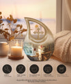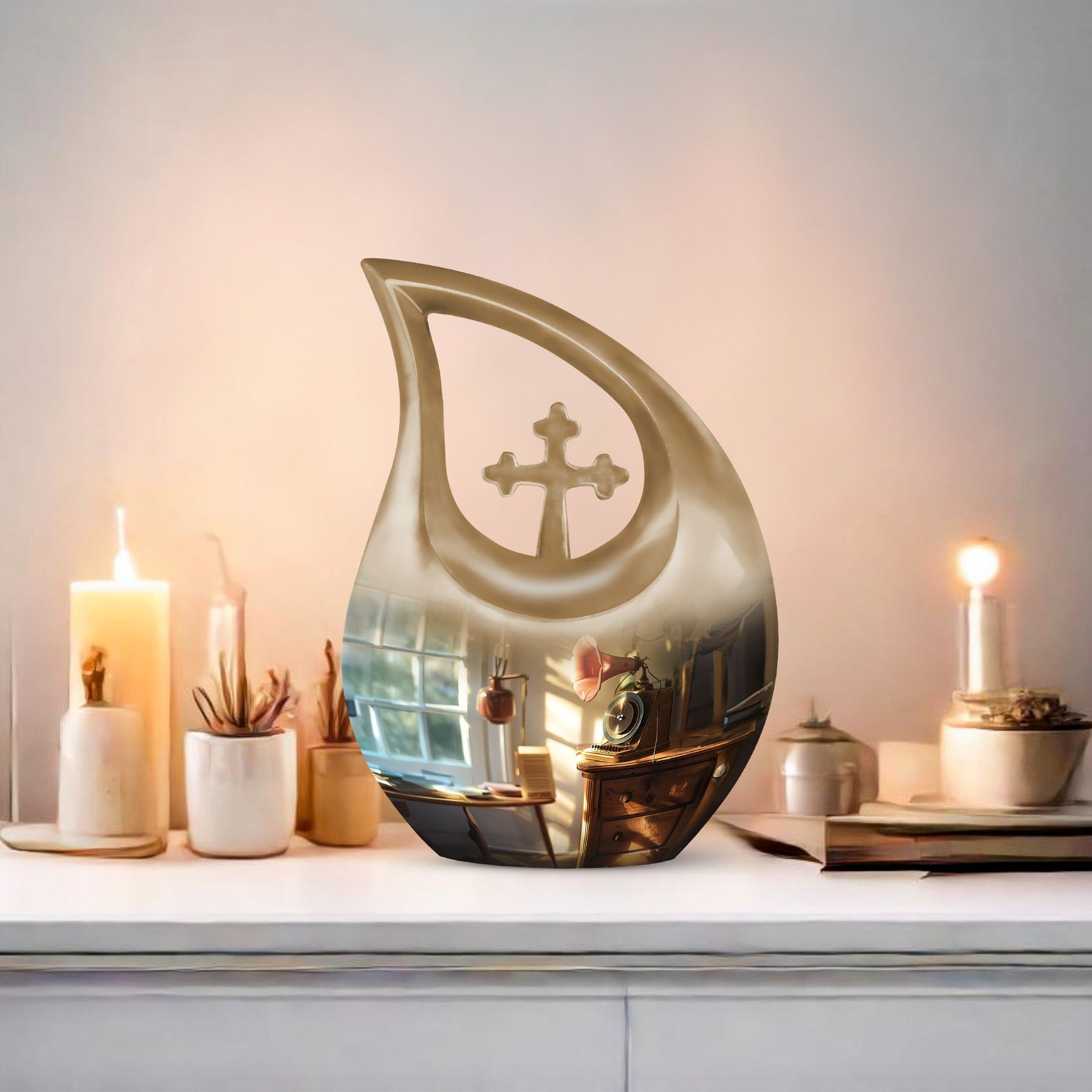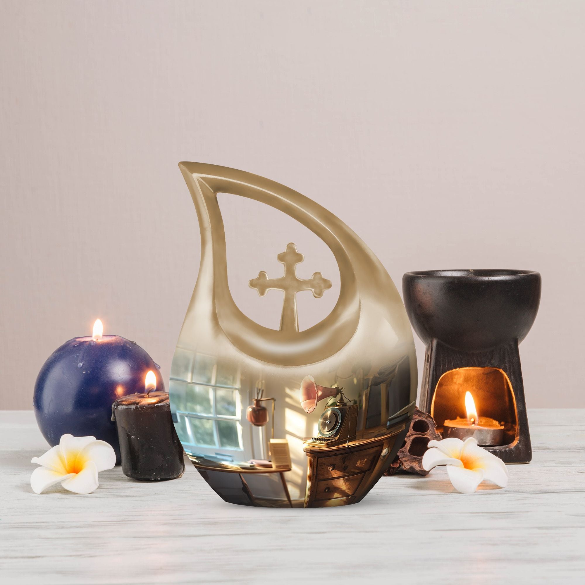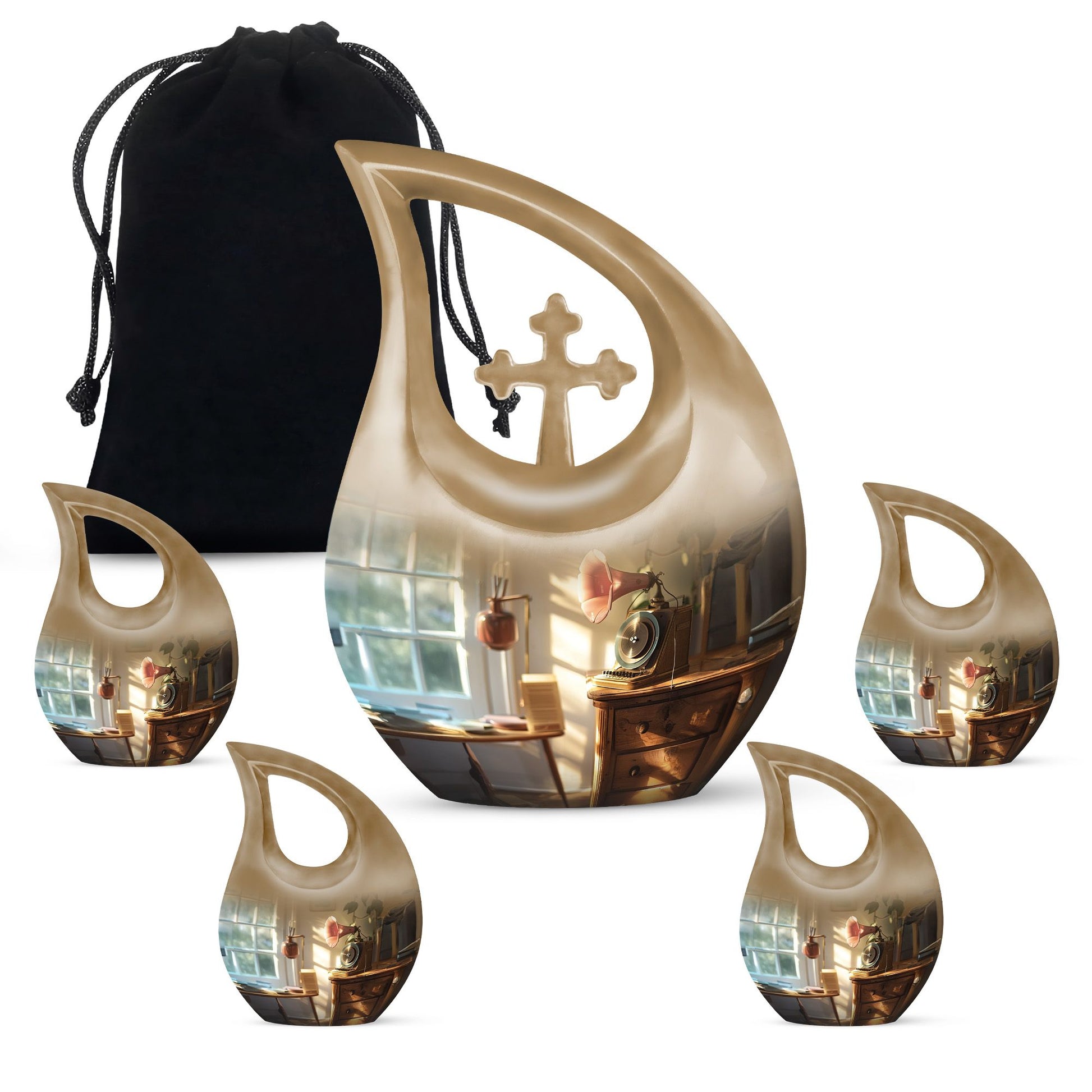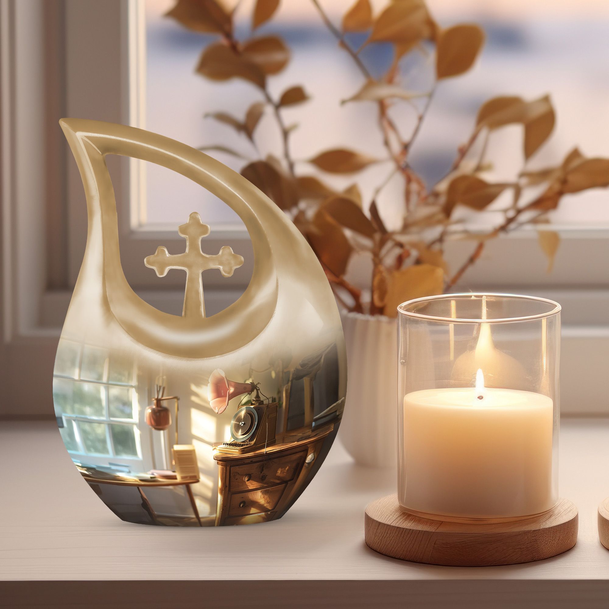 Embrace the beautiful craftsmanship embodied in this astounding 10-inch Gramophone Urn, offering reverence and remembrance through an exceptional design. Constructed using premium quality aluminium, the large urn ensures lasting durability while conveying an exquisite cross drop theme that beautifully synergizes classic and contemporary sensibilities. With a weight of 3.3 pounds, the urn features an ample capacity of 200 cubic inches, perfectly accommodating ashes with honor and respect. Further enhancing the value of this bespoke urn is the customizable aspect - allowing for the engraving of names on its surface to honor the departed soul more personally. This remarkable urn comes with a luxurious velvet pouch that aids in the containment of ashes while preserving their sanctity. Distinguished and affordable, this urn contributes to memorial ceremonies with its unique aesthetic appeal. Ideal for those searching for 'Custom Urn' or 'Small Urn', this piece stands as a artful epitome of love, loss and memory. Note: Design of this urn will not be highlighted in the description.