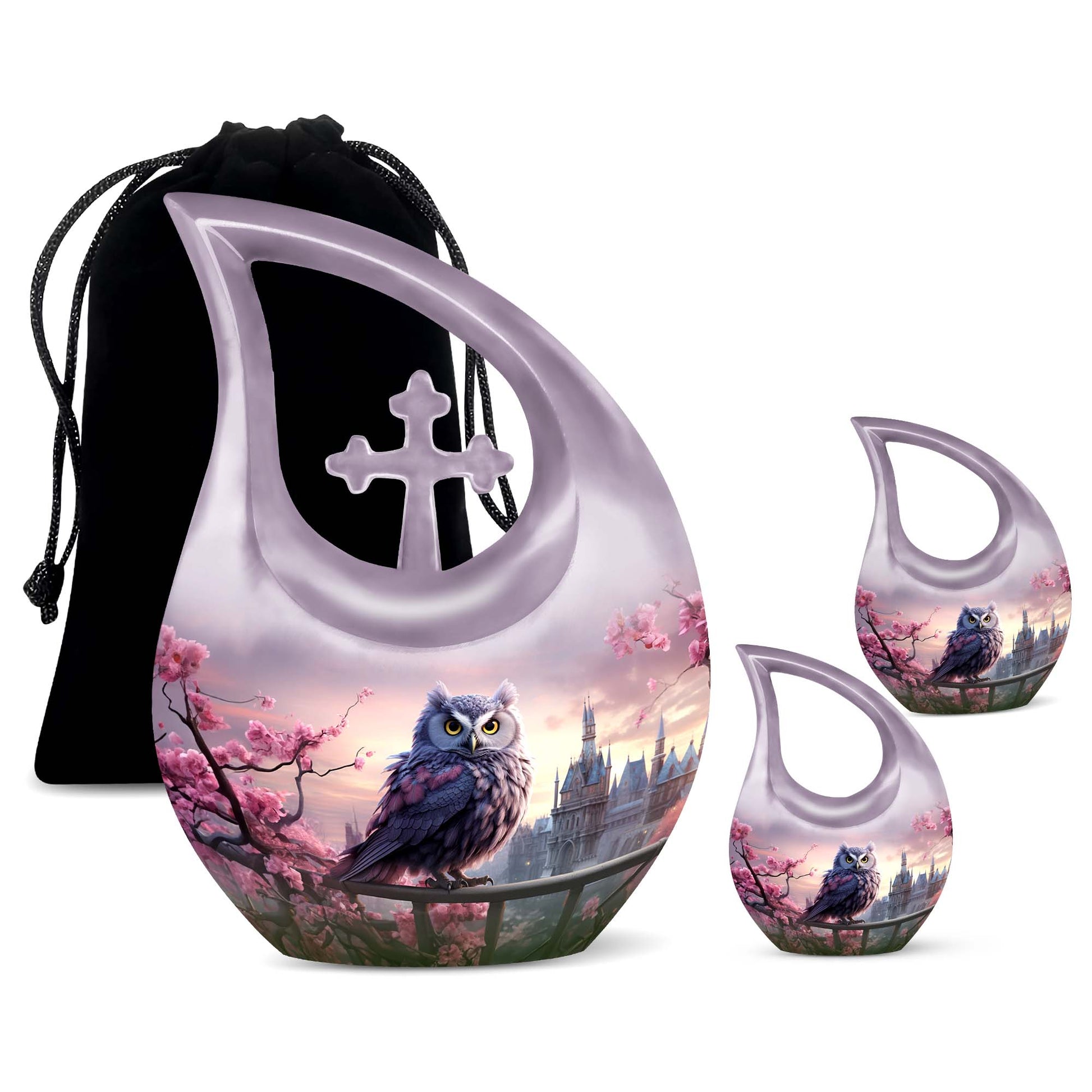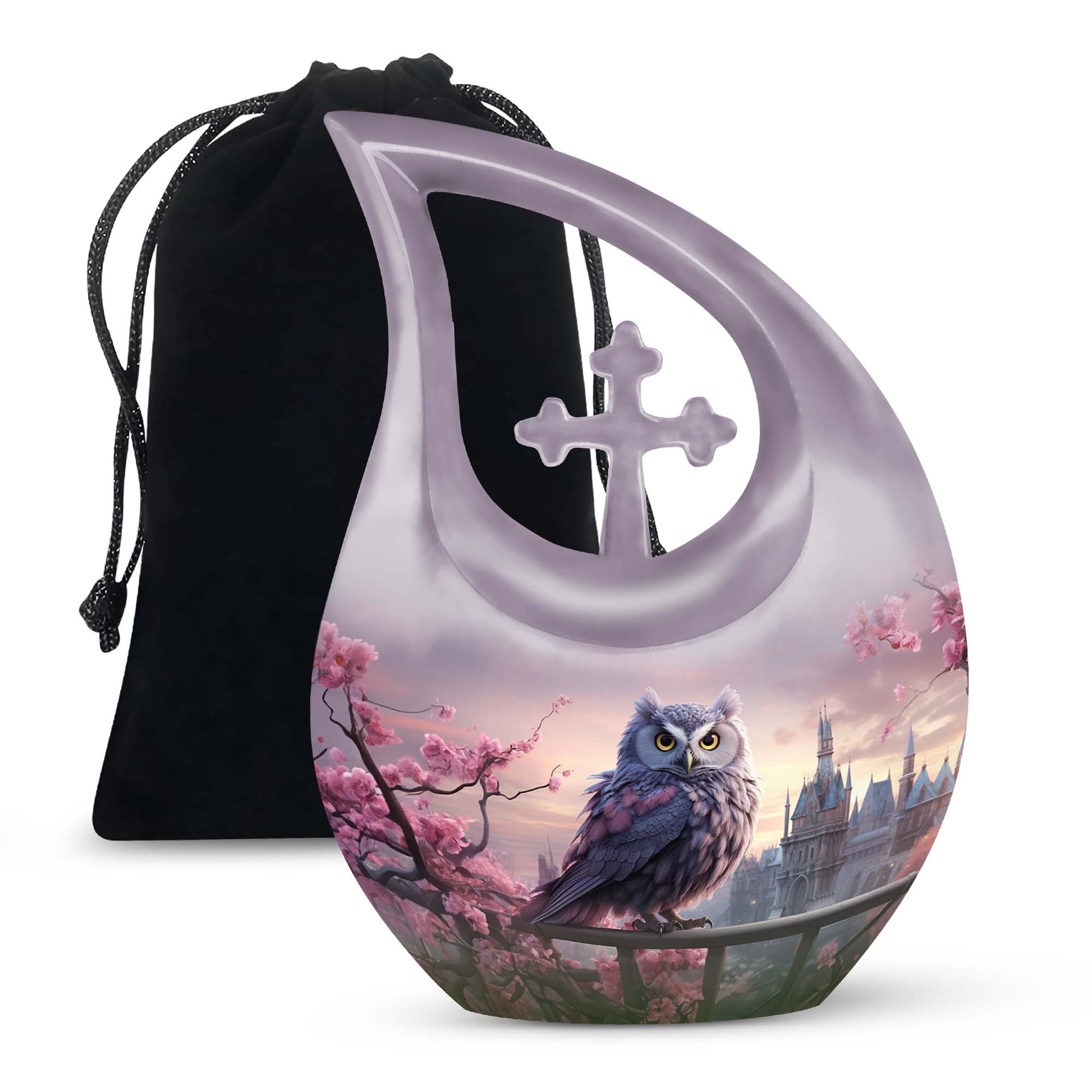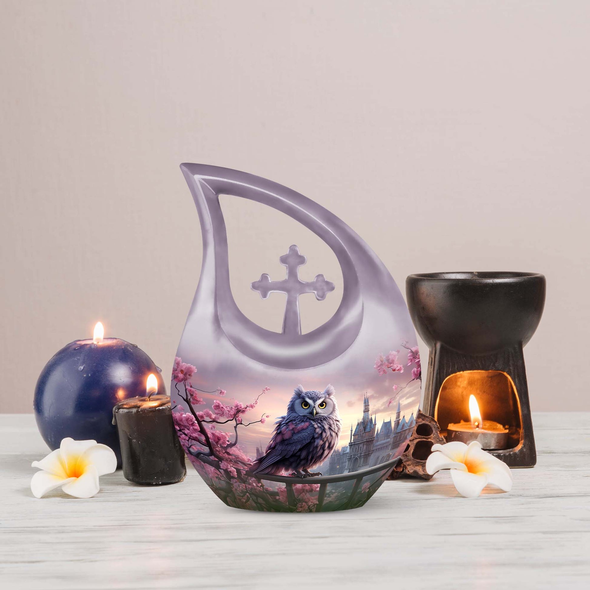Crafted from durable, high-quality aluminum, this urn showcases intricate owl detailing surrounded by delicate cherry blossoms—representing purity, hope, and remembrance. Ideal as a human urn for ashes adult female or ash urn for humans male, it serves as a dignified and elegant resting place for home or burial use. Families may also choose smaller versions such as the urns for human ashes adult female small size or urns for ashes adult male small keepsakes for shared remembrance.