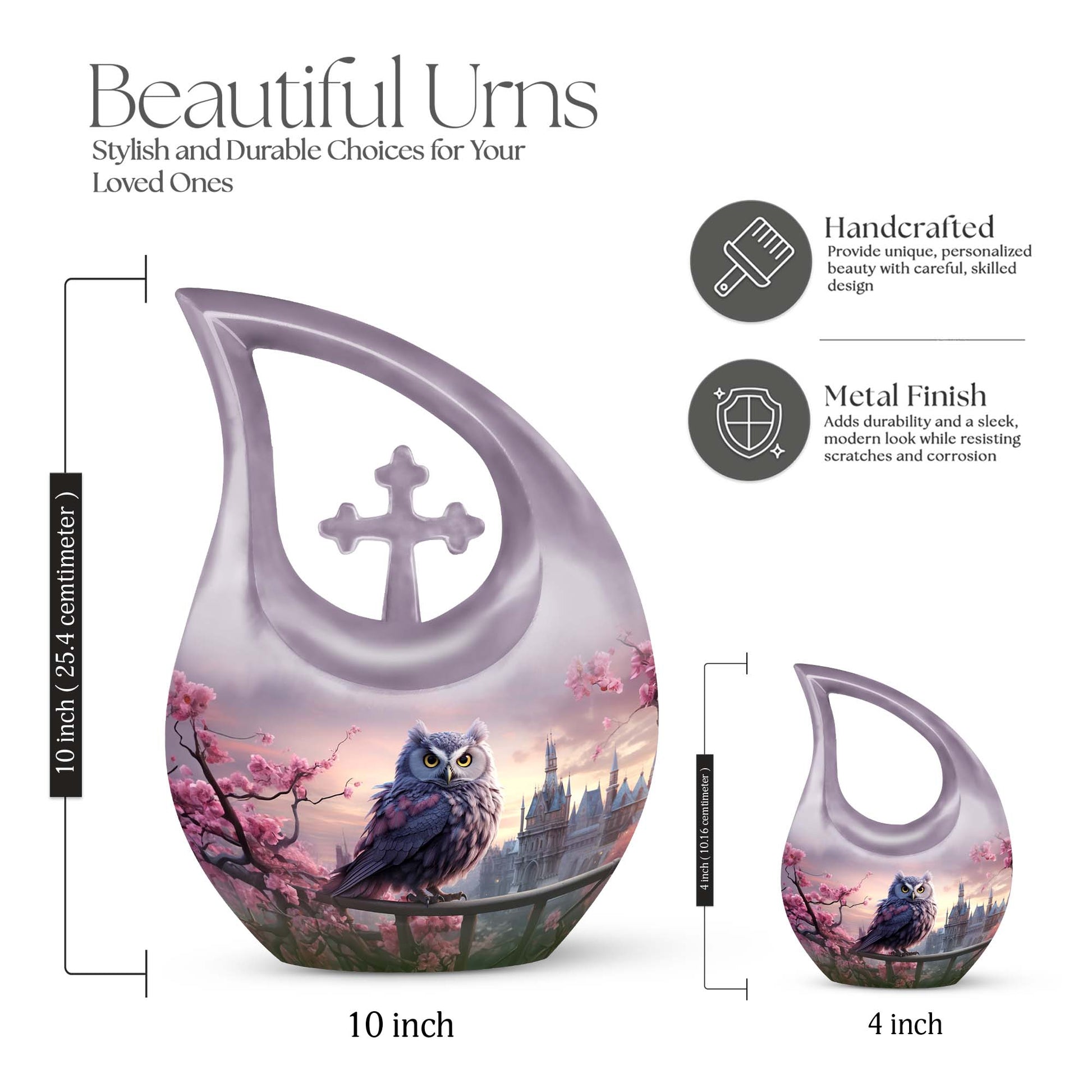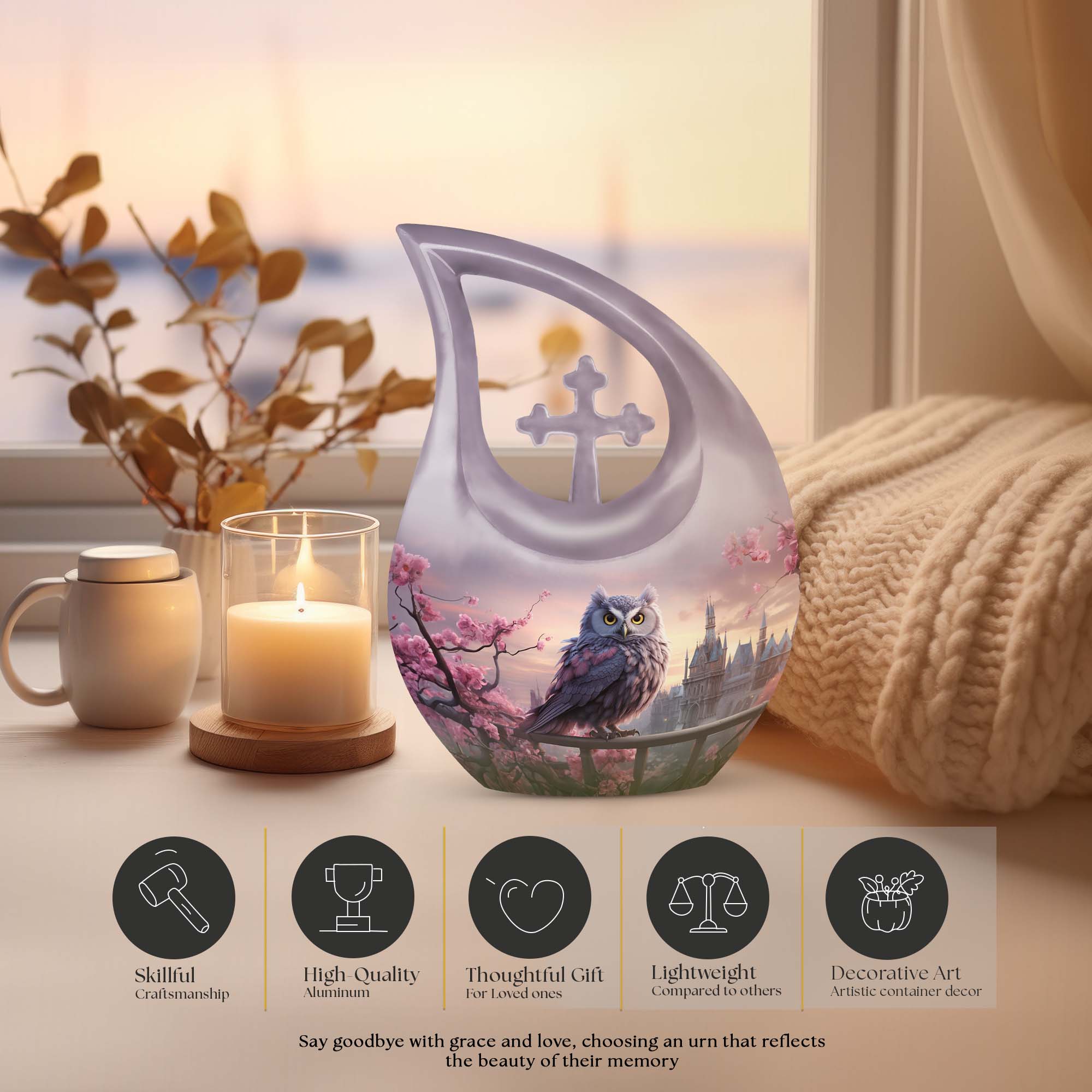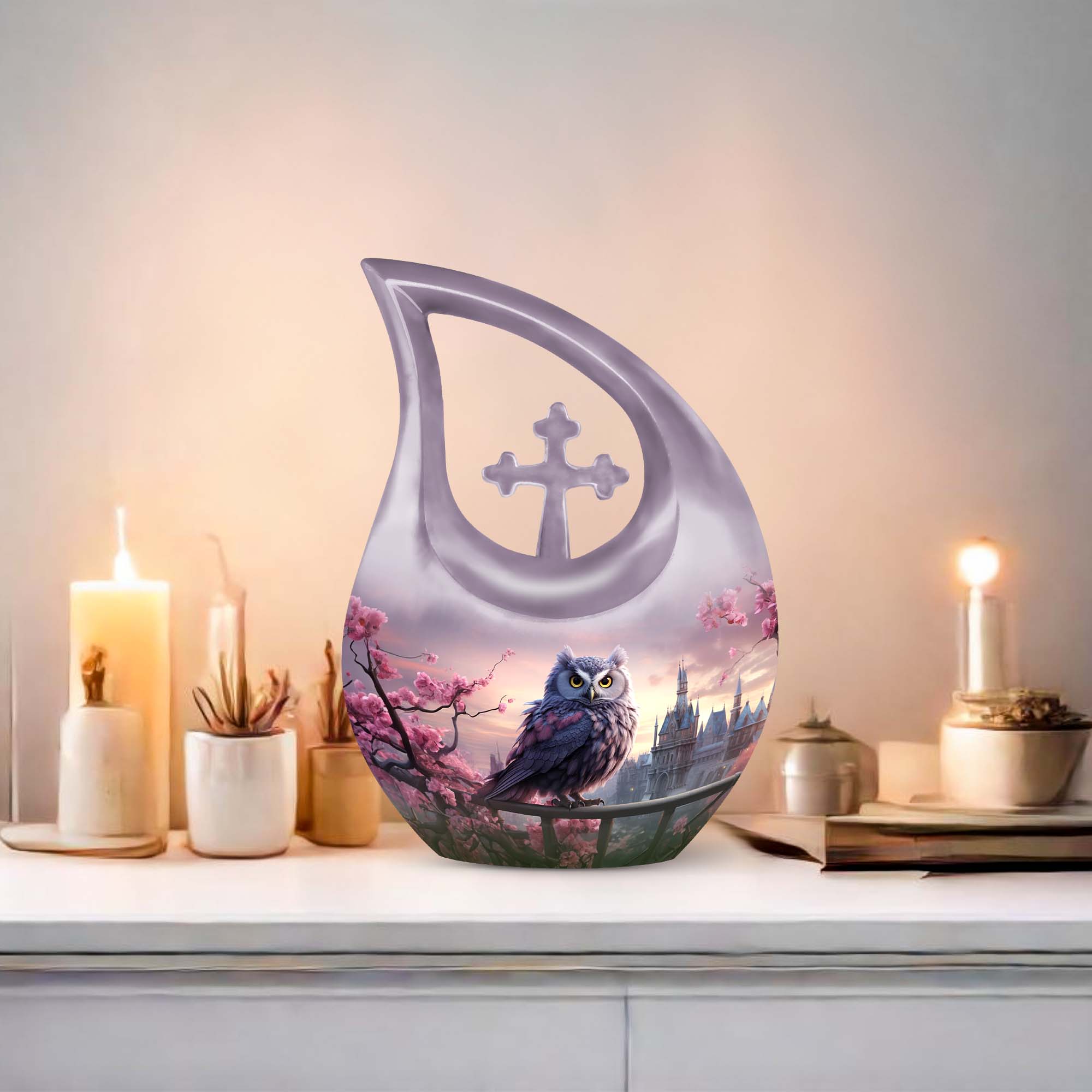 Crafted from durable, high-quality aluminum, this urn showcases intricate owl detailing surrounded by delicate cherry blossoms—representing purity, hope, and remembrance. Ideal as a human urn for ashes adult female or ash urn for humans male, it serves as a dignified and elegant resting place for home or burial use. Families may also choose smaller versions such as the urns for human ashes adult female small size or urns for ashes adult male small keepsakes for shared remembrance.
