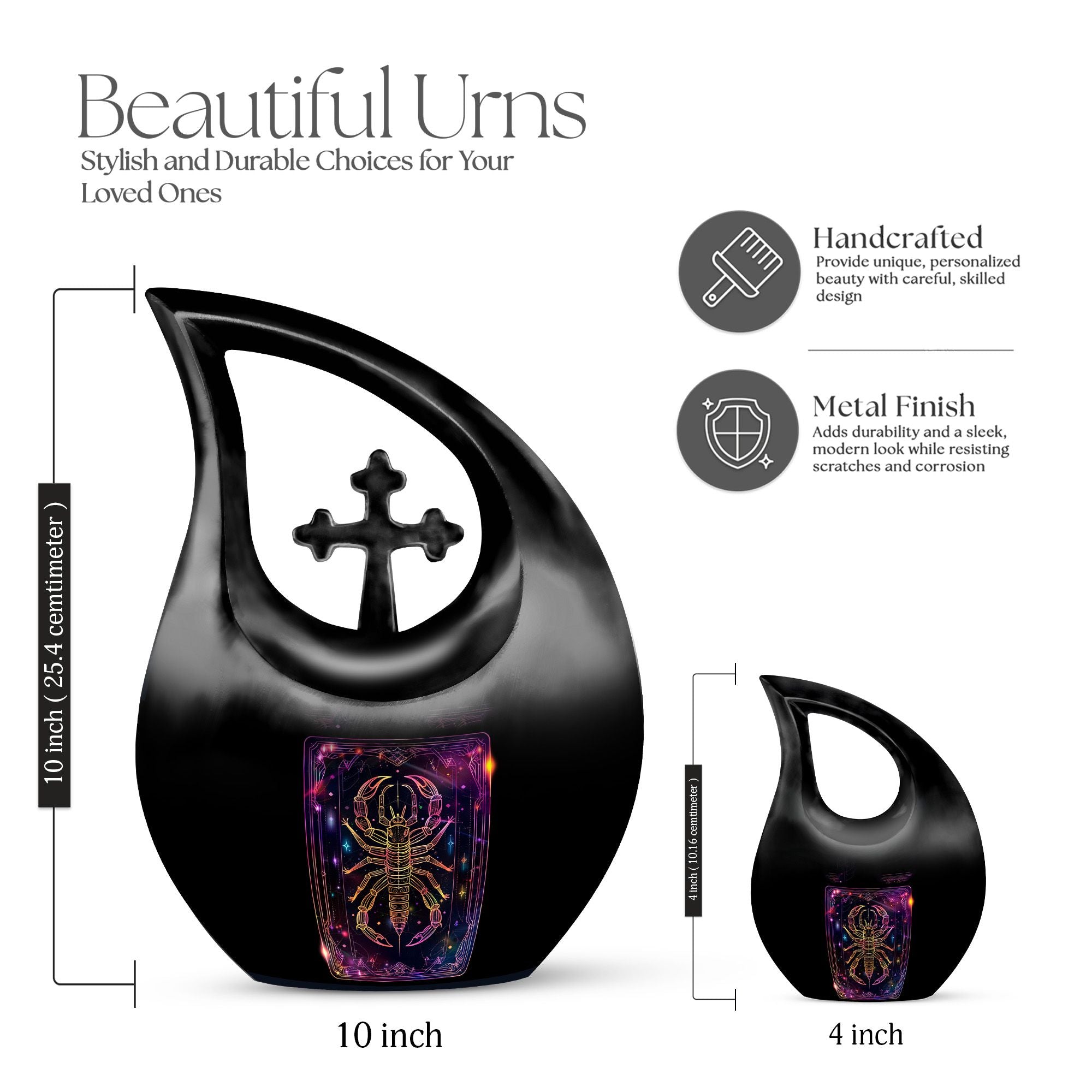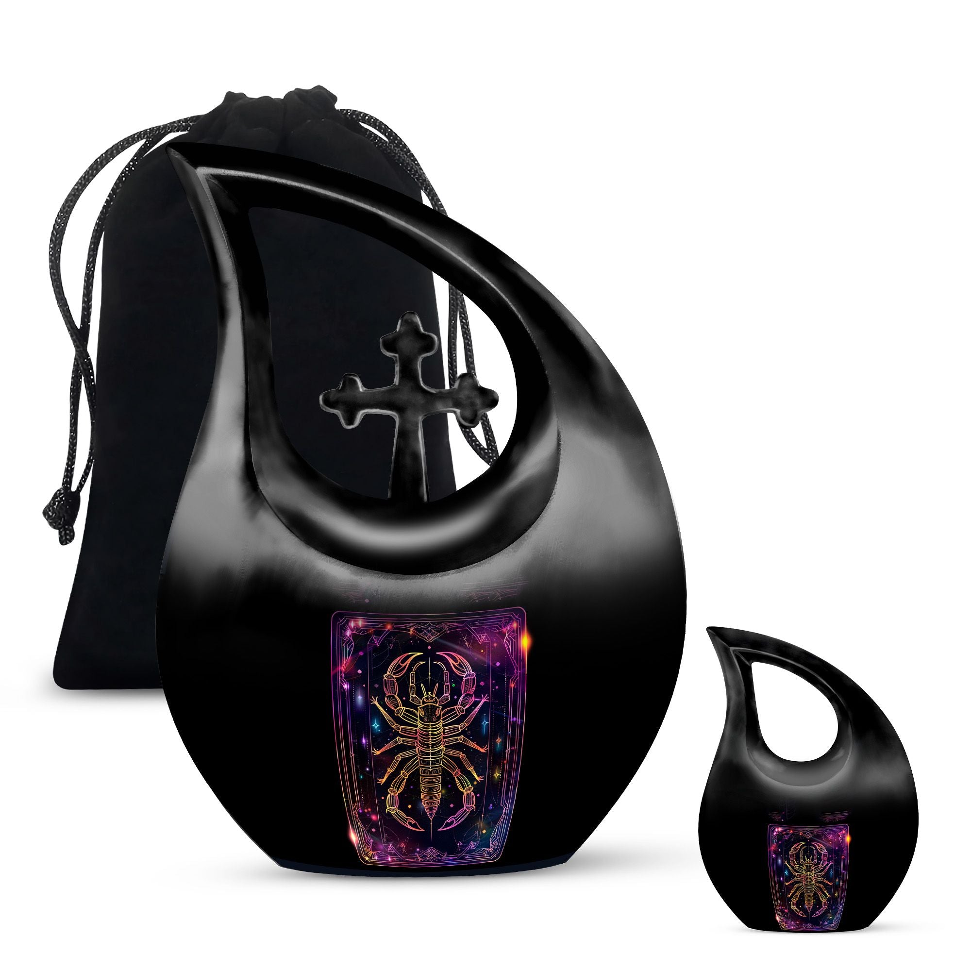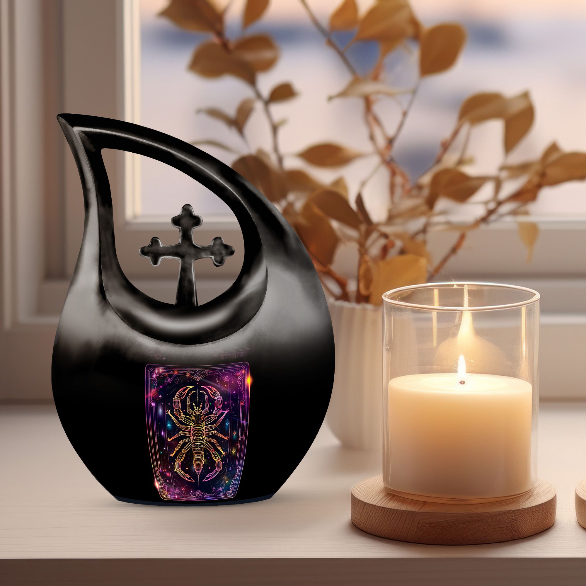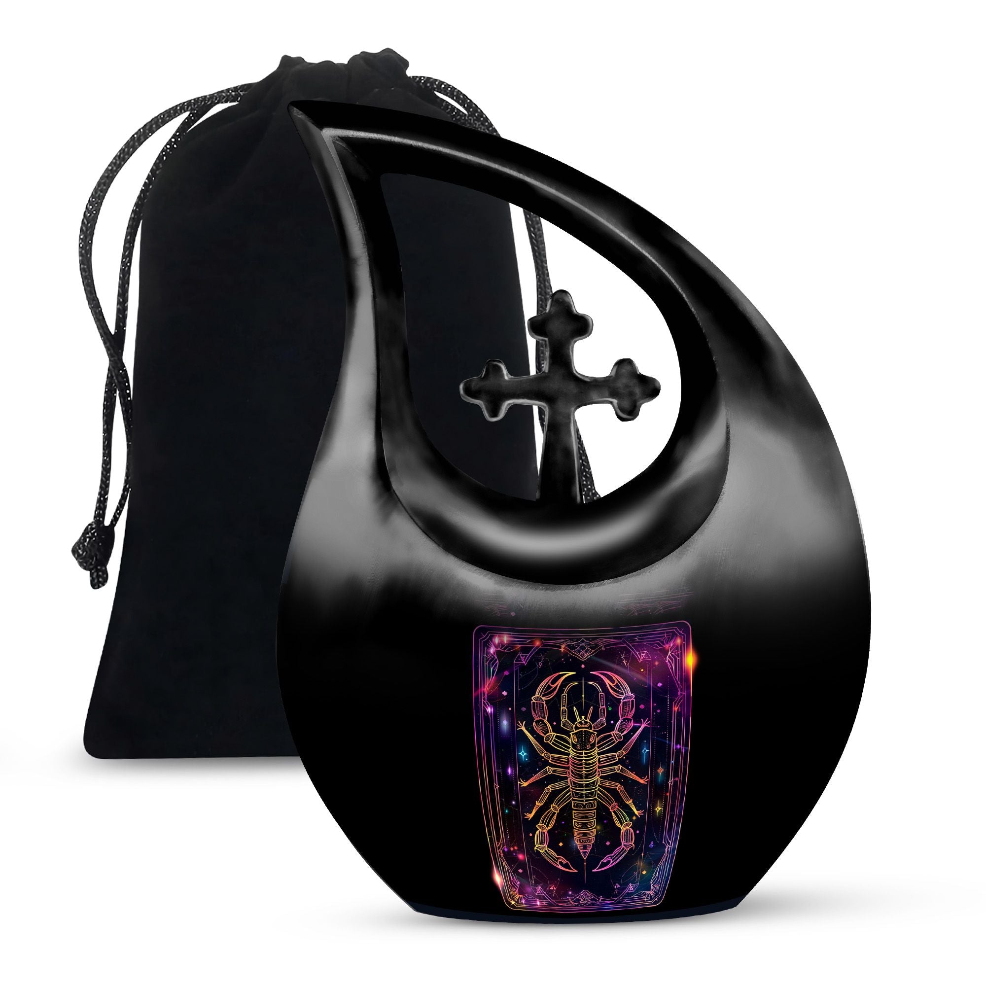Embrace your loved one's spiritual journey with our Zodiac Cross Drop Custom Urn. This 10-inch tall remembrance piece displays a unique fusion of celestial inspiration and religious symbolism. Perfect for adults and seniors looking to invest in memorial ceremony supplies, this large urn boasts an aluminium construction for lasting durability. It measures at 3.3 pounds and has the capacity to hold up to 200 cubic inches of ashes. The striking Cross-Drop Zodiac theme lends a calming representation of heavenly bodies. This urn offers a personalized touch as it can be customized with engraved names, giving you a sense of connection and intimacy when honoring their memory. The package comes with a plush velvet pouch, assuring the containment and protection of the ashes. From our selection, explore the wide variety of affordable burial urns, from custom to companion urns, catering to your specific needs. Not your average memorial urns, our Zodiac Urn provides a sensitive and thoughtful approach to the memory of your loved ones.