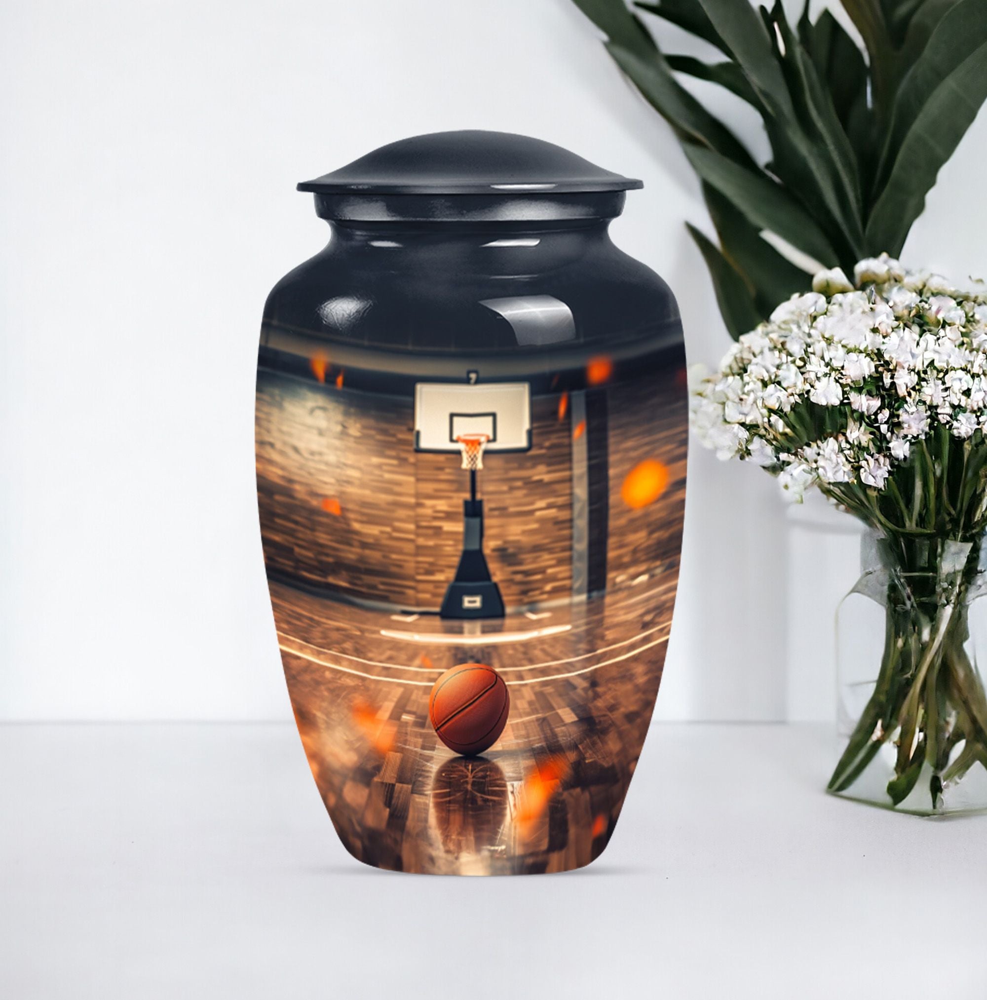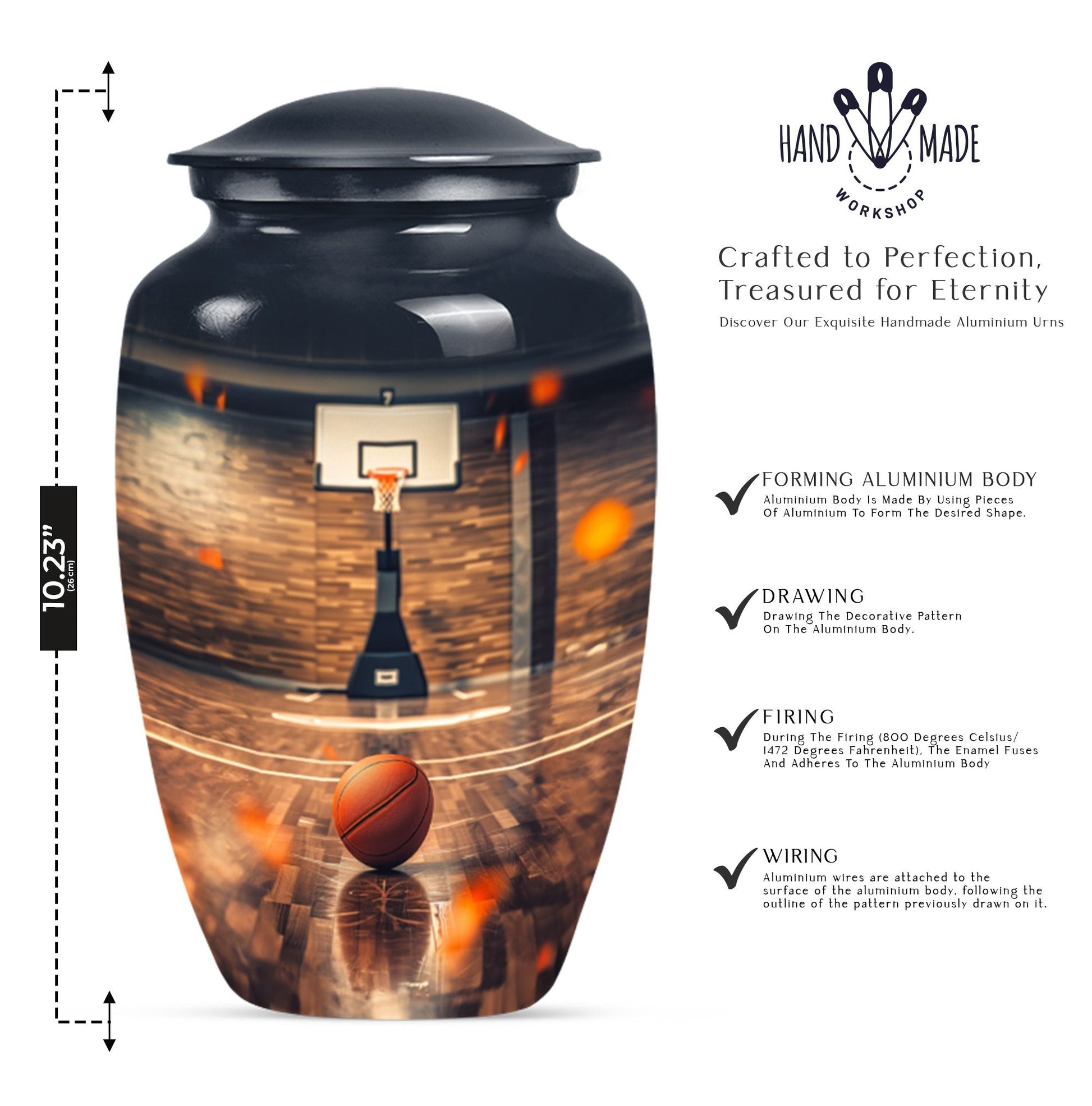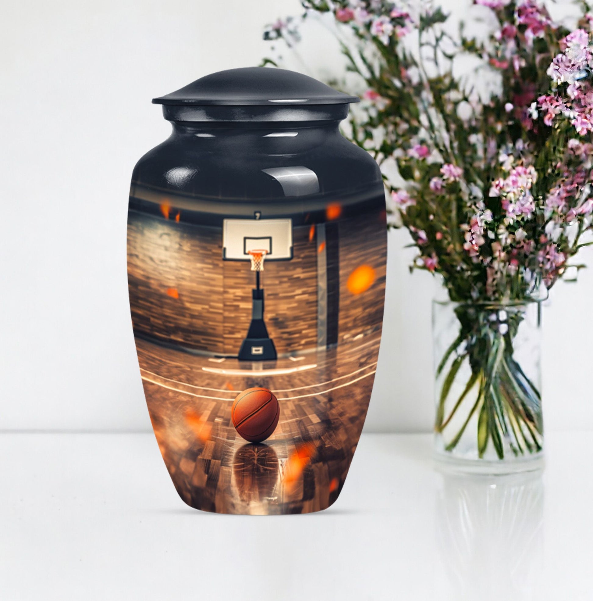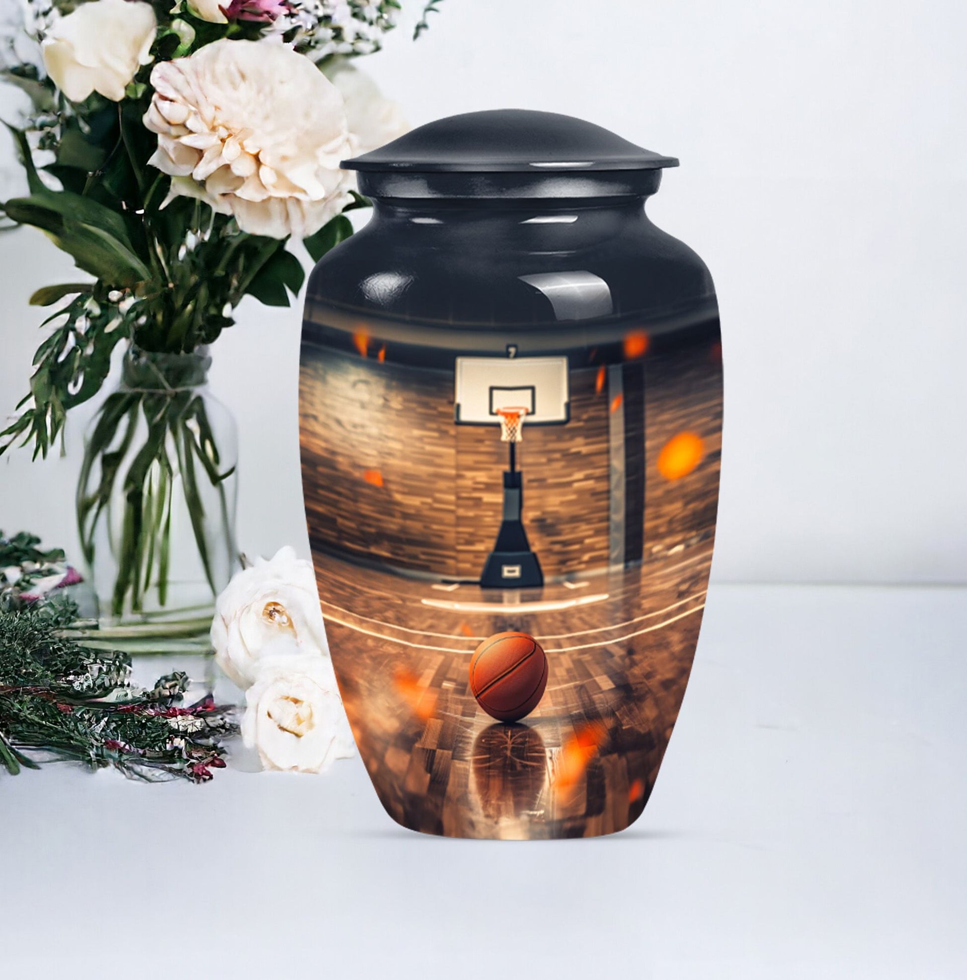 Embrace beloved memories while showcasing a sublime tribute with our 10-inch cremation urn. This large urn, carved from robust aluminium, projects a sense of resilience we associate with our cherished ones, well-concealing its light weight of 3.3 pounds. Its abstract theme adds an artsy aura, inviting a rich variety of interpretations from individual viewers. With a generous capacity of 200 cubic inches, this basketball urn can carry the ashes of a loved one safely. We also include a velvet pouch, ensuring secure containment of the ashes. Elevate the personal touch by customizing this urn with engraved names to commemorate your loved ones. The classic urn design inspires thoughts of tradition and timeless values. Perfect for a dad, mom, or any family member, this urn serves well as a fitting tribute. Also known as a Human ashes urn with a cross design, this piece is an excellent choice to mark an unbroken faith, even as it serves as a cremation urn for dad or an urn for mom.