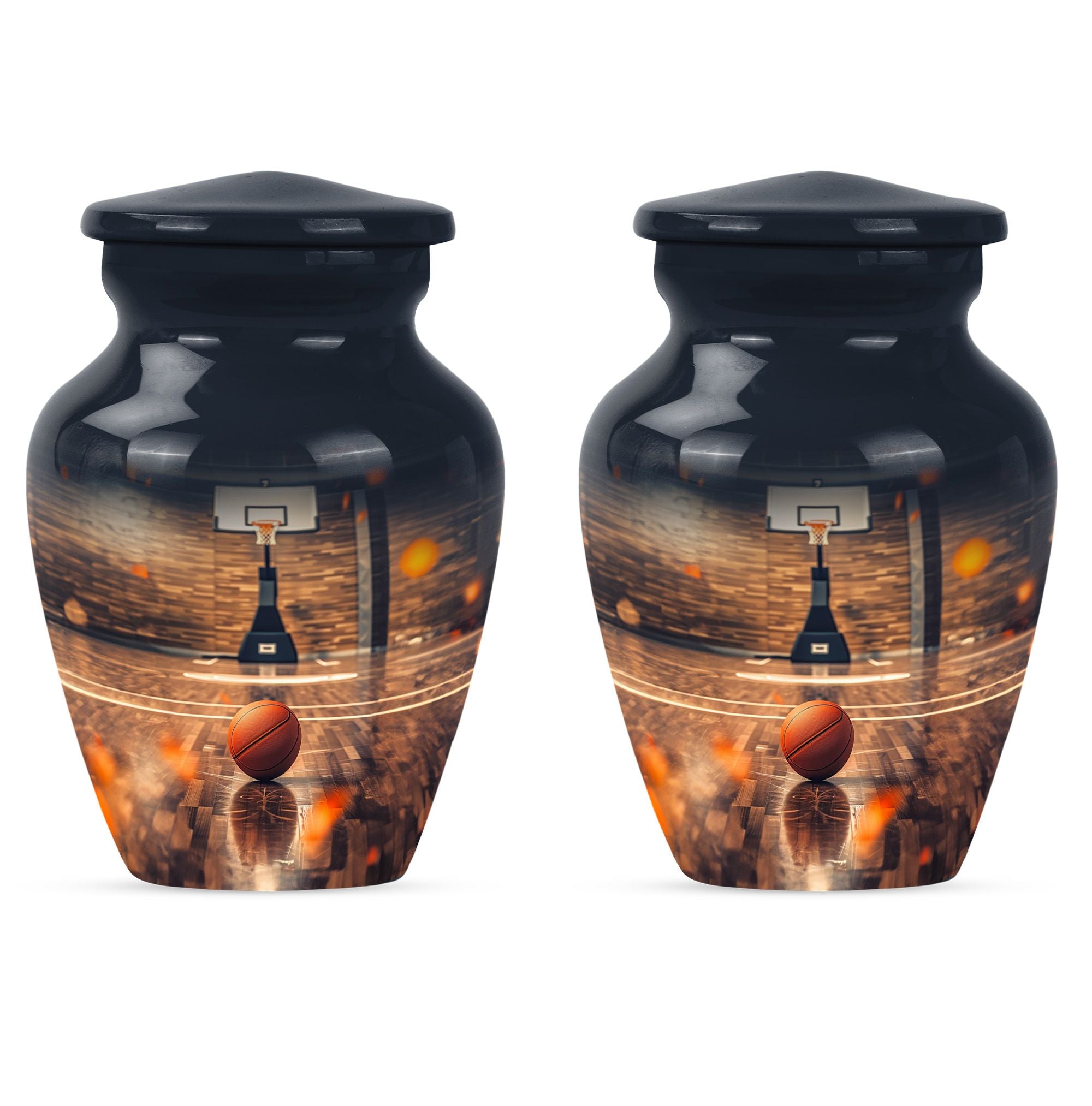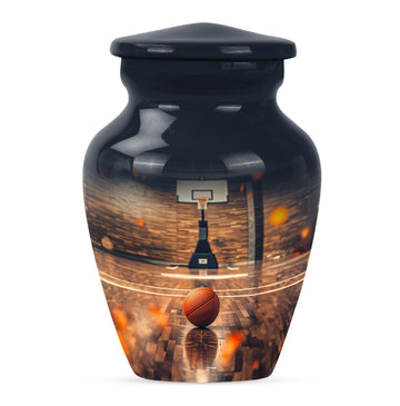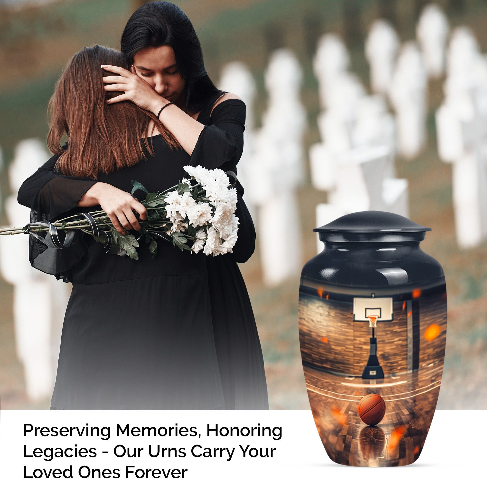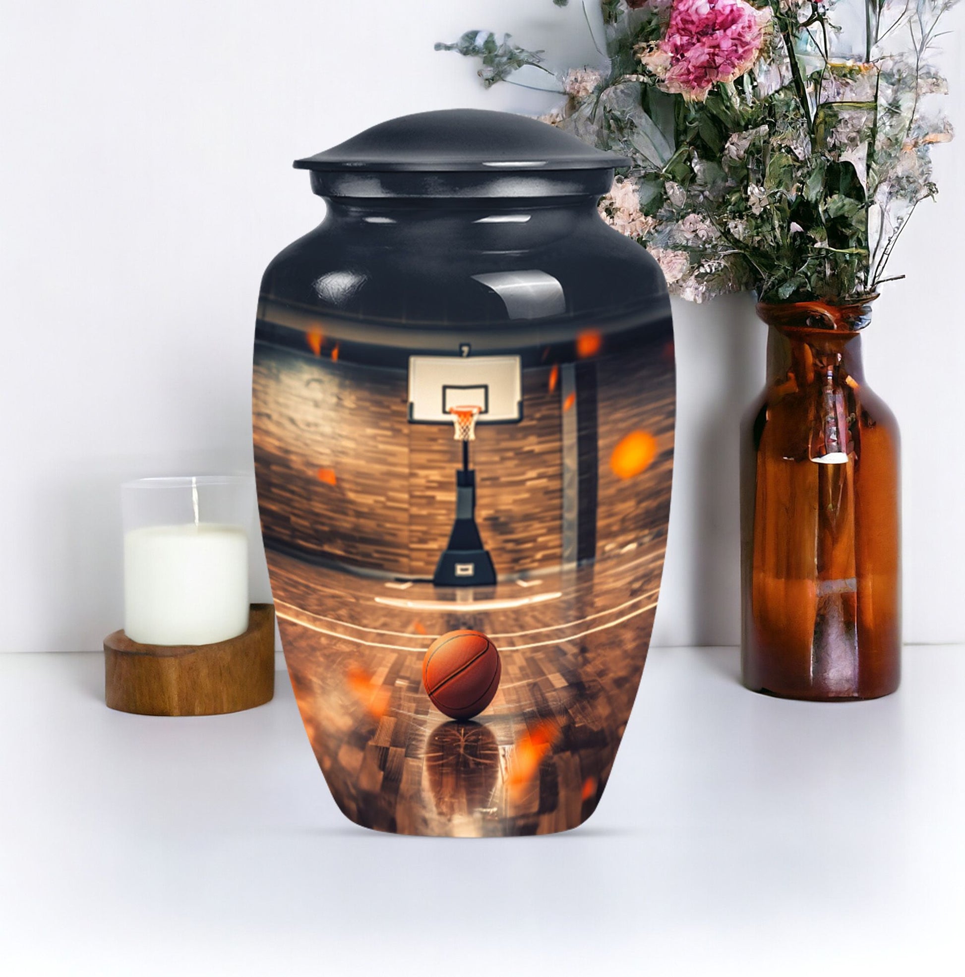 Embrace beloved memories while showcasing a sublime tribute with our 10-inch cremation urn. This large urn, carved from robust aluminium, projects a sense of resilience we associate with our cherished ones, well-concealing its light weight of 3.3 pounds. Its abstract theme adds an artsy aura, inviting a rich variety of interpretations from individual viewers. With a generous capacity of 200 cubic inches, this basketball urn can carry the ashes of a loved one safely. We also include a velvet pouch, ensuring secure containment of the ashes. Elevate the personal touch by customizing this urn with engraved names to commemorate your loved ones. The classic urn design inspires thoughts of tradition and timeless values. Perfect for a dad, mom, or any family member, this urn serves well as a fitting tribute. Also known as a Human ashes urn with a cross design, this piece is an excellent choice to mark an unbroken faith, even as it serves as a cremation urn for dad or an urn for mom.