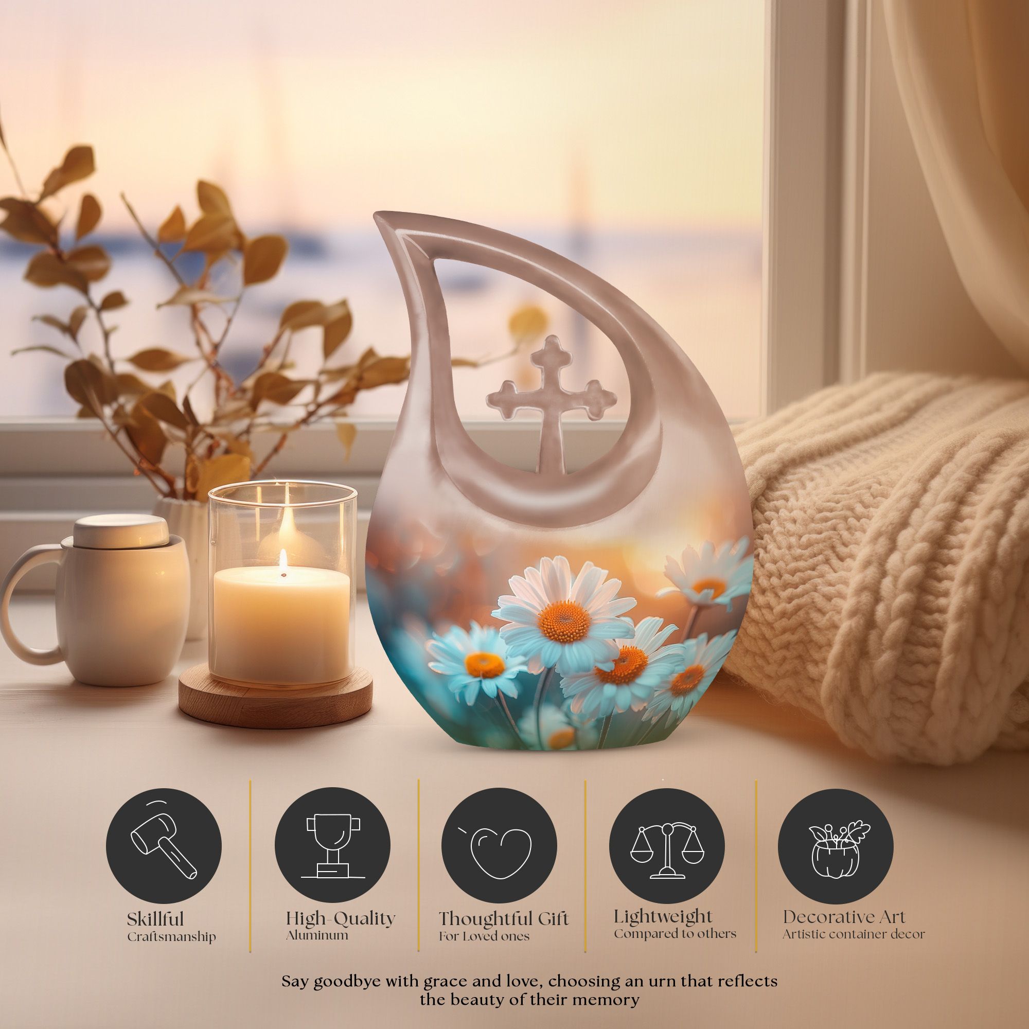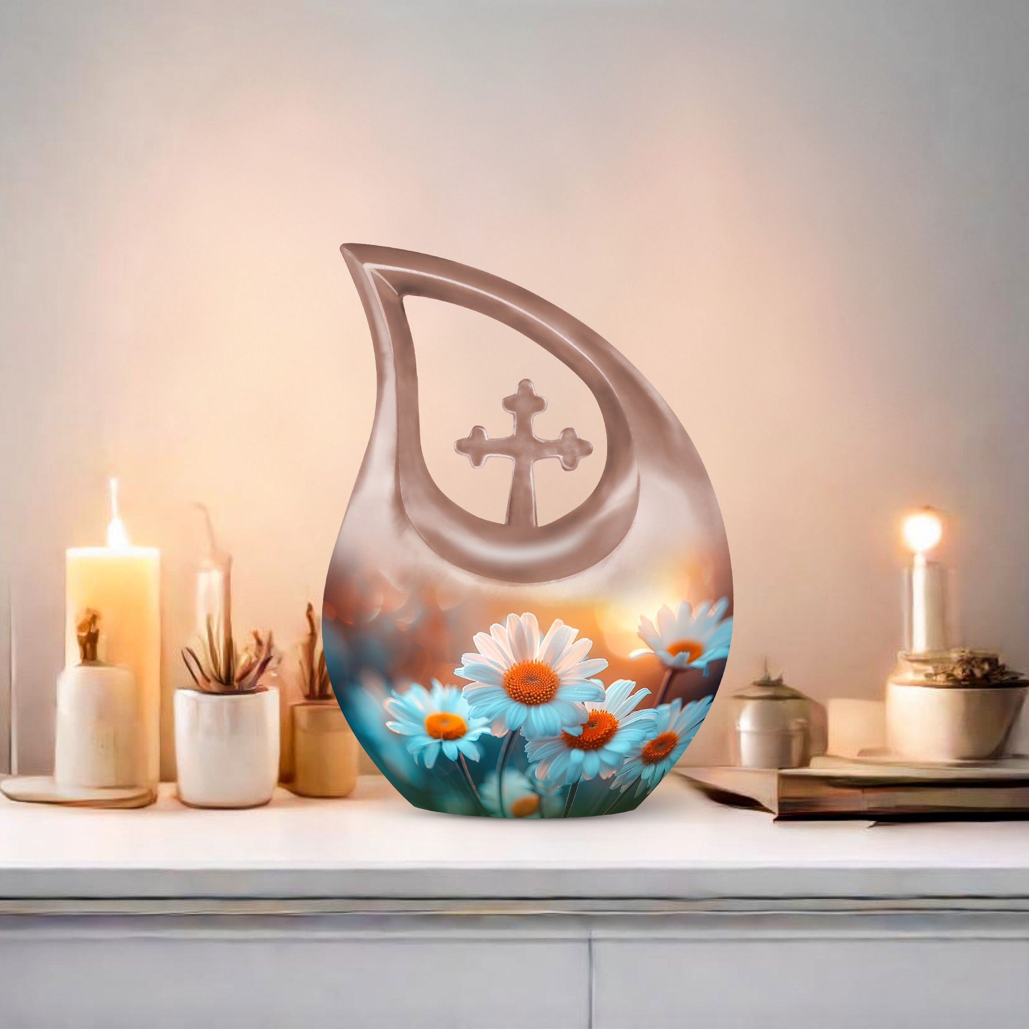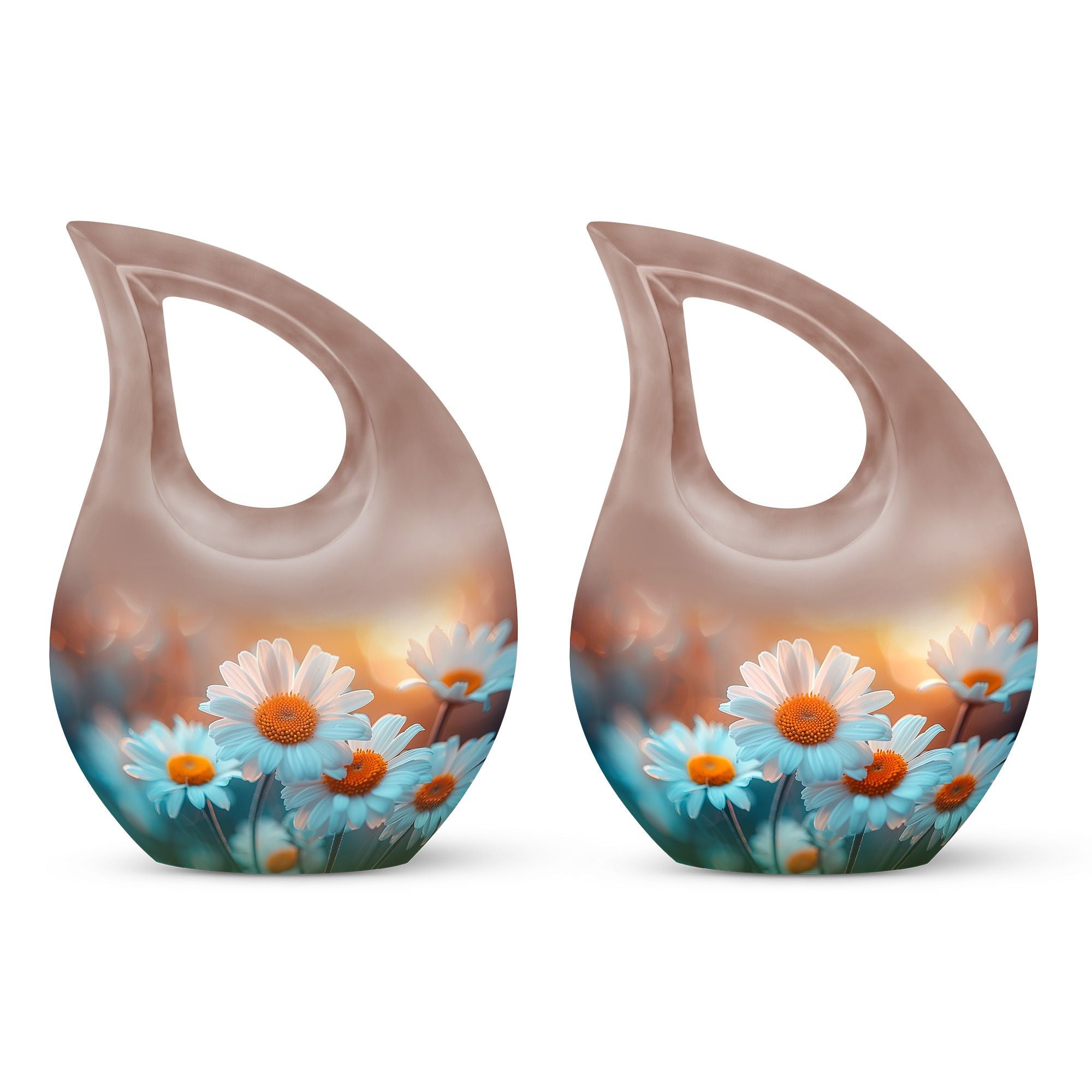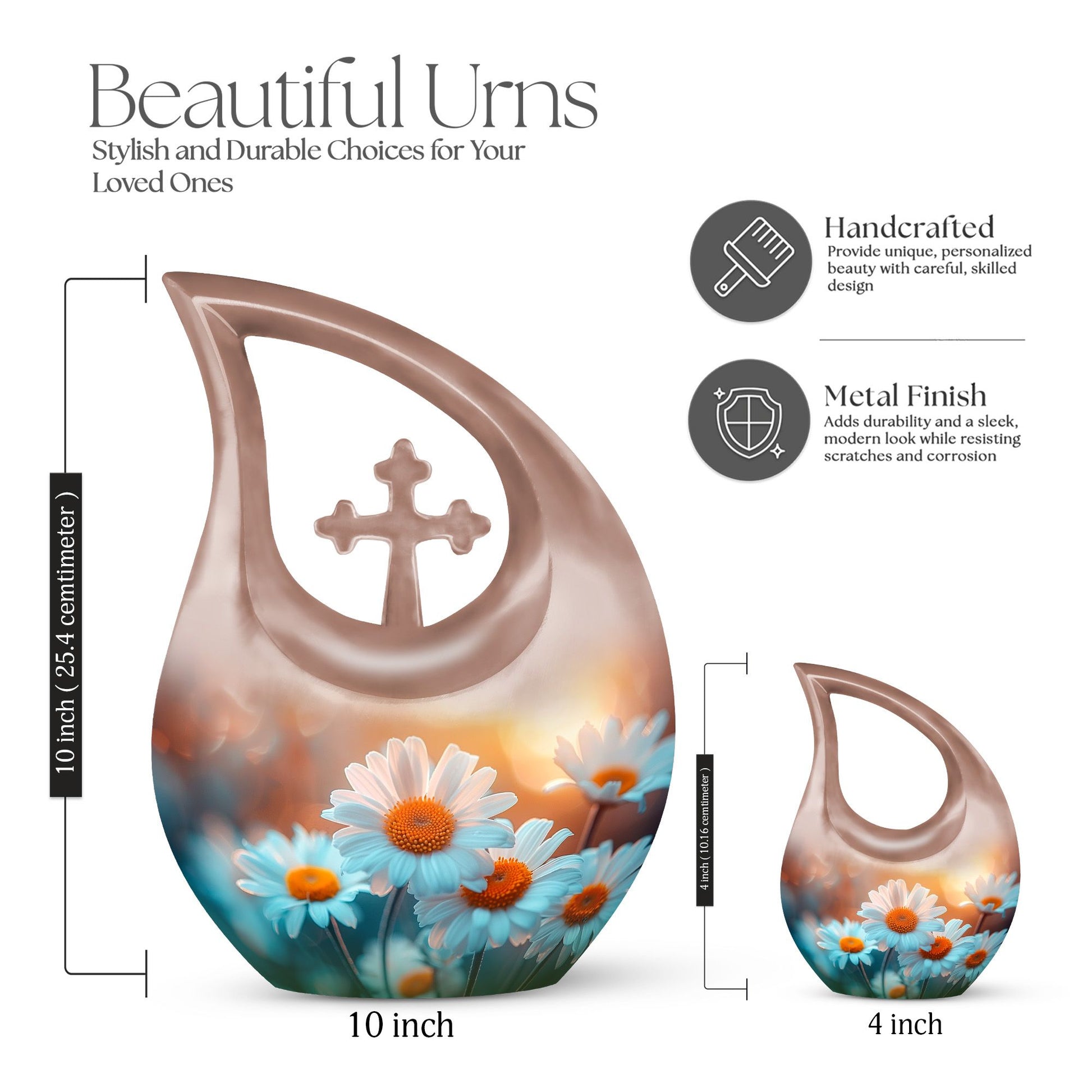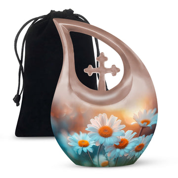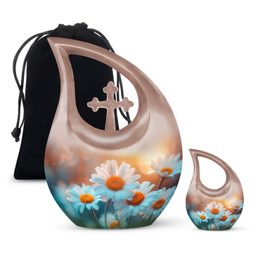 Experience a peaceful and comforting remembrance with Daisies In The Urn. Our large, 10-inch urns are not only beautiful commemorative pieces, but they also serve a significant purpose. These double urns for ashes have a unique Cross Drop design and are crafted with high-quality aluminium, ensuring strength and longevity. They come complete with a soft velvet pouch, suitable for securely holding and containing the sacred ashes of your loved ones. With a generous capacity of 200 cubic inches, this urn comfortably accommodates ashes for two adults. We also provide an option to personalize these urns with engraved names, making them more special and meaningful. Our urns are heavy, weighing at 3.3 pounds, signifying the substantiality and gravity of your emotions and memories. This elegant yet sober memorial urns act as a beautiful ashes keepsake which holds not just ashes, but countless memories and an eternal connection.