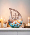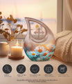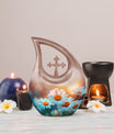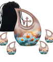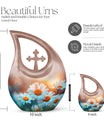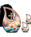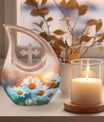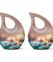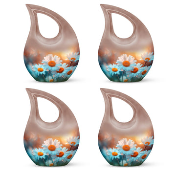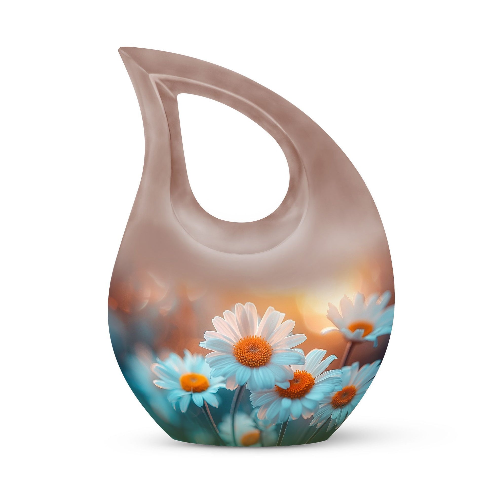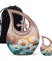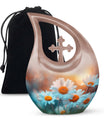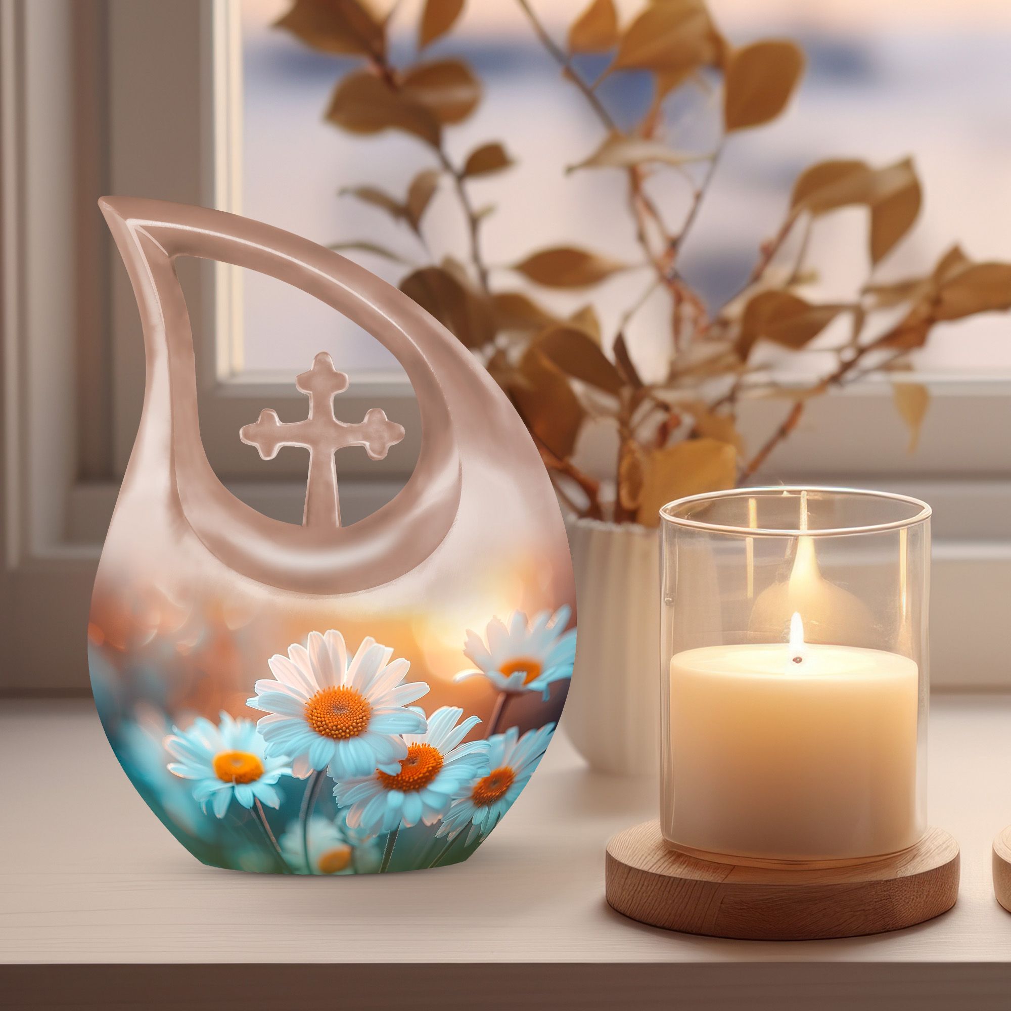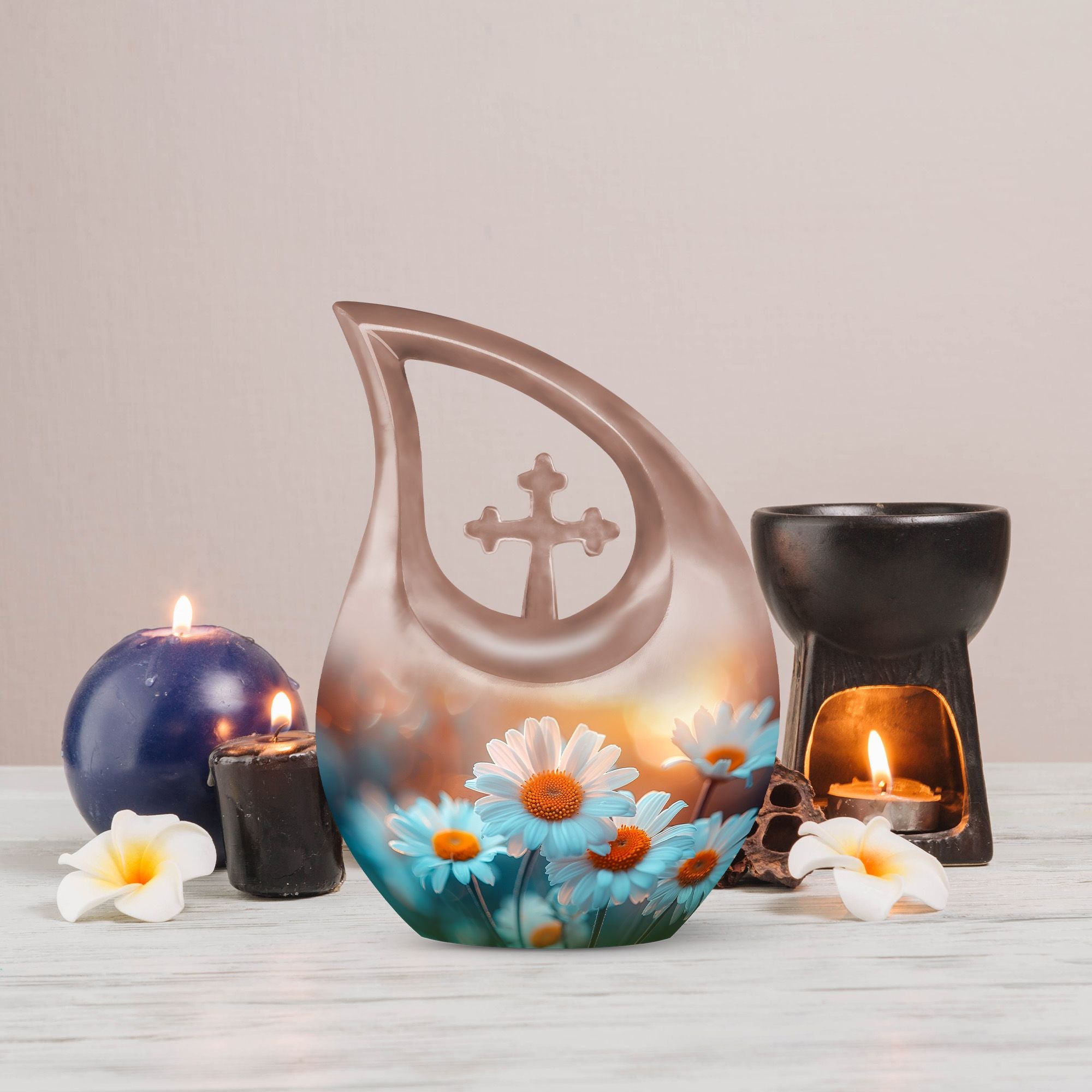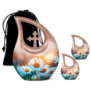Experience a peaceful and comforting remembrance with Daisies In The Urn. Our large, 10-inch urns are not only beautiful commemorative pieces, but they also serve a significant purpose. These double urns for ashes have a unique Cross Drop design and are crafted with high-quality aluminium, ensuring strength and longevity. They come complete with a soft velvet pouch, suitable for securely holding and containing the sacred ashes of your loved ones. With a generous capacity of 200 cubic inches, this urn comfortably accommodates ashes for two adults. We also provide an option to personalize these urns with engraved names, making them more special and meaningful. Our urns are heavy, weighing at 3.3 pounds, signifying the substantiality and gravity of your emotions and memories. This elegant yet sober memorial urns act as a beautiful ashes keepsake which holds not just ashes, but countless memories and an eternal connection.