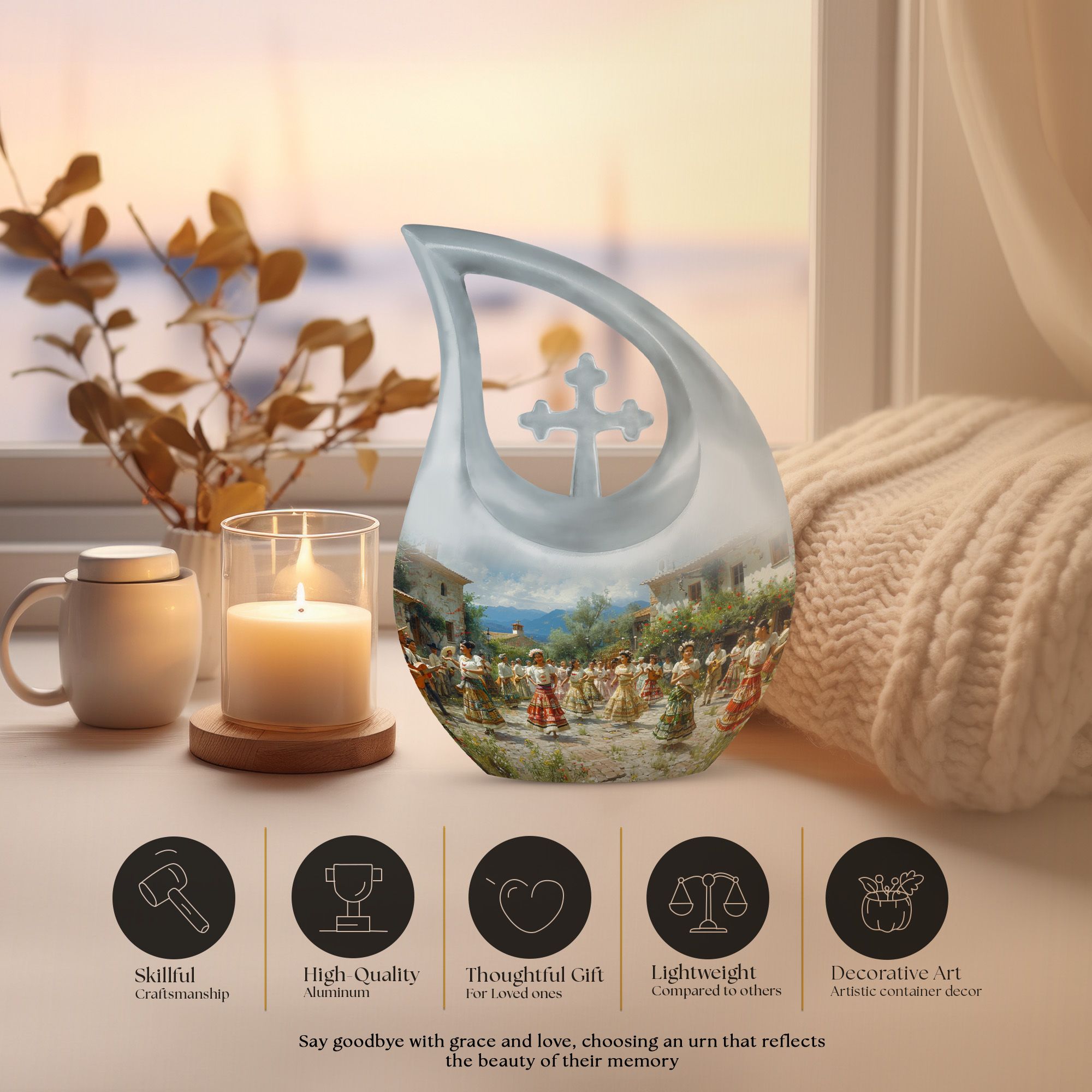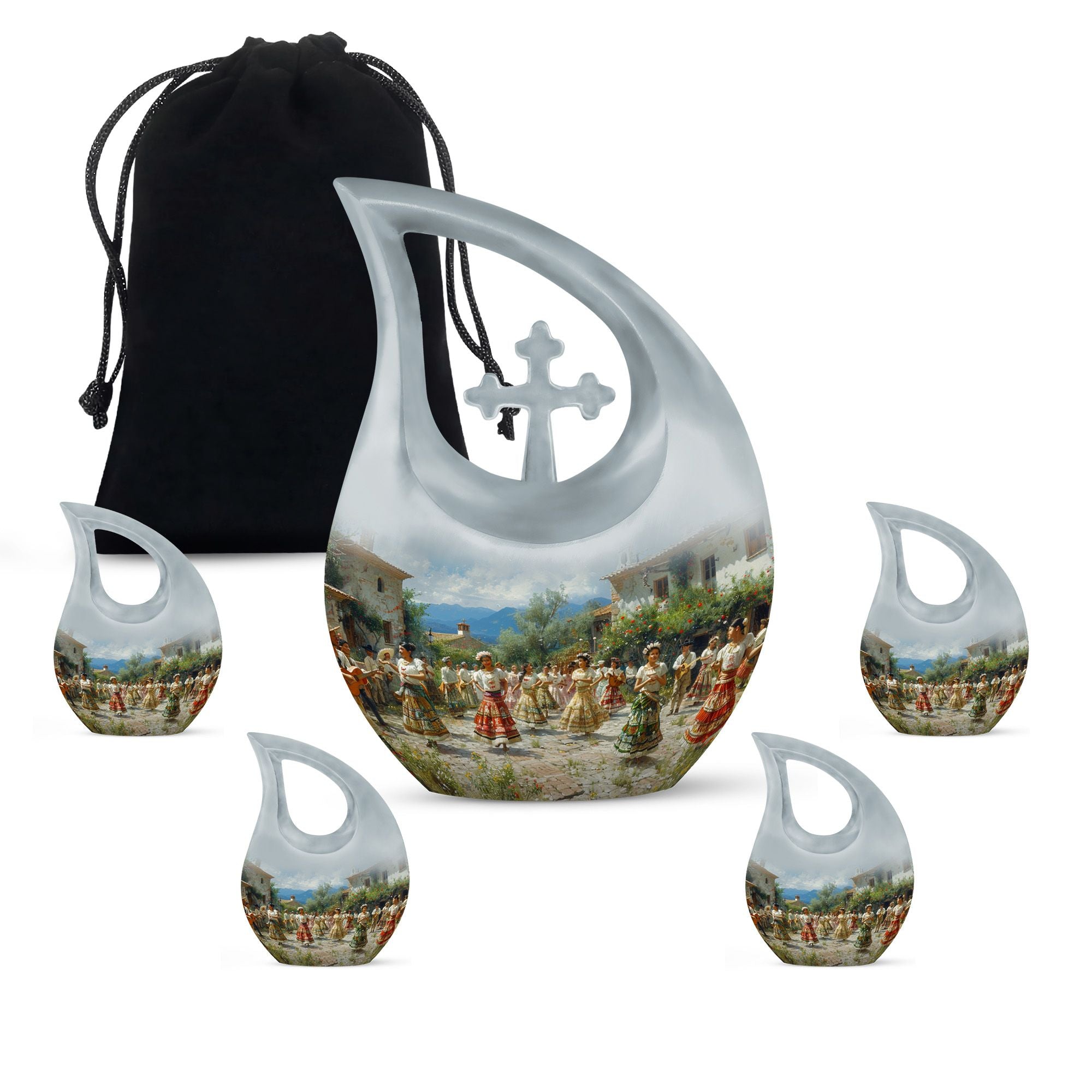 Made from durable aluminum, this memorial urn features an elegant dance-inspired design that reflects love, connection, and remembrance. The secure screw-top lid ensures long-term protection, making it suitable for those needing an urn for ashes adult male dad, urns for ashes adult female mom, or smaller companion pieces. Its vibrant artistic motif makes it a meaningful choice for families wanting urns for cremation ashes female or small urns for human ashes adult male to share among relatives.